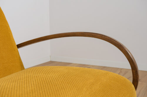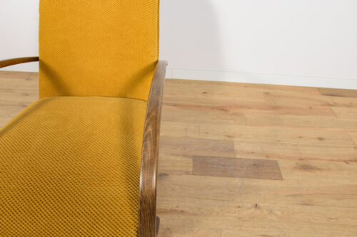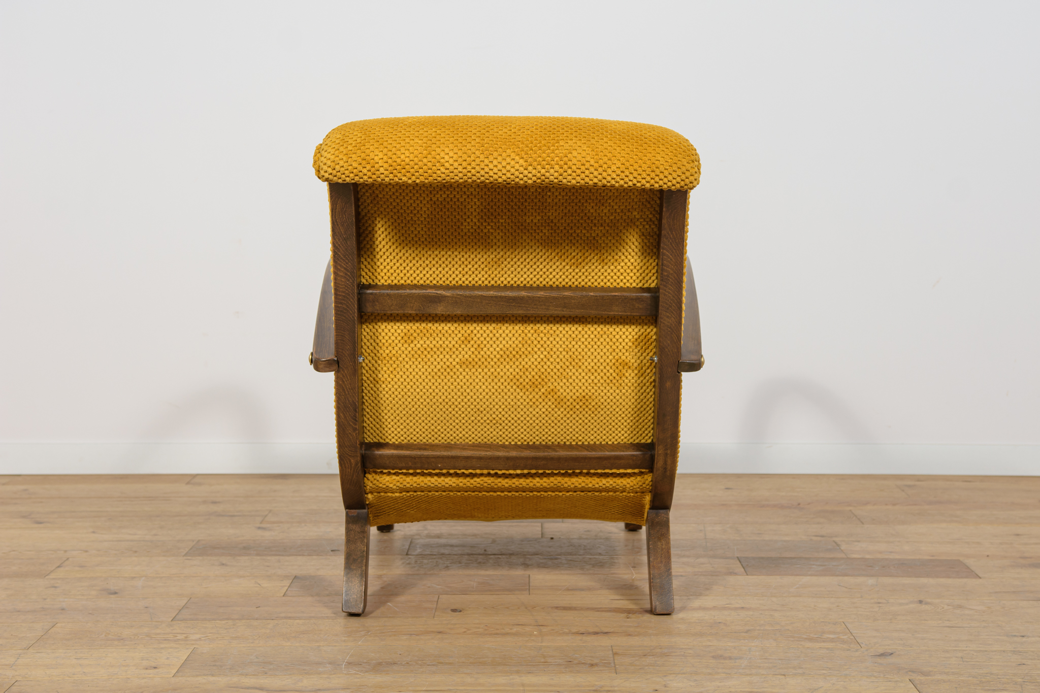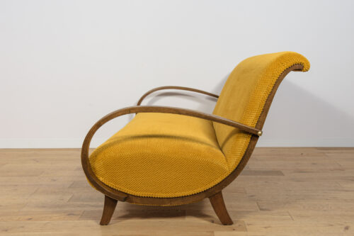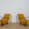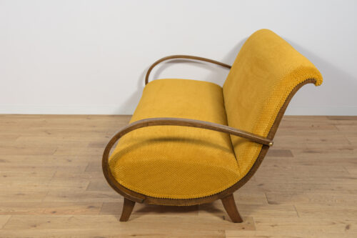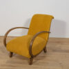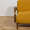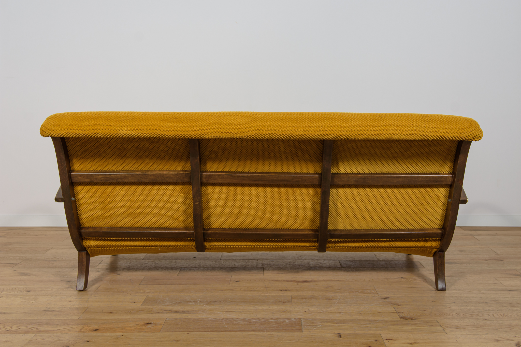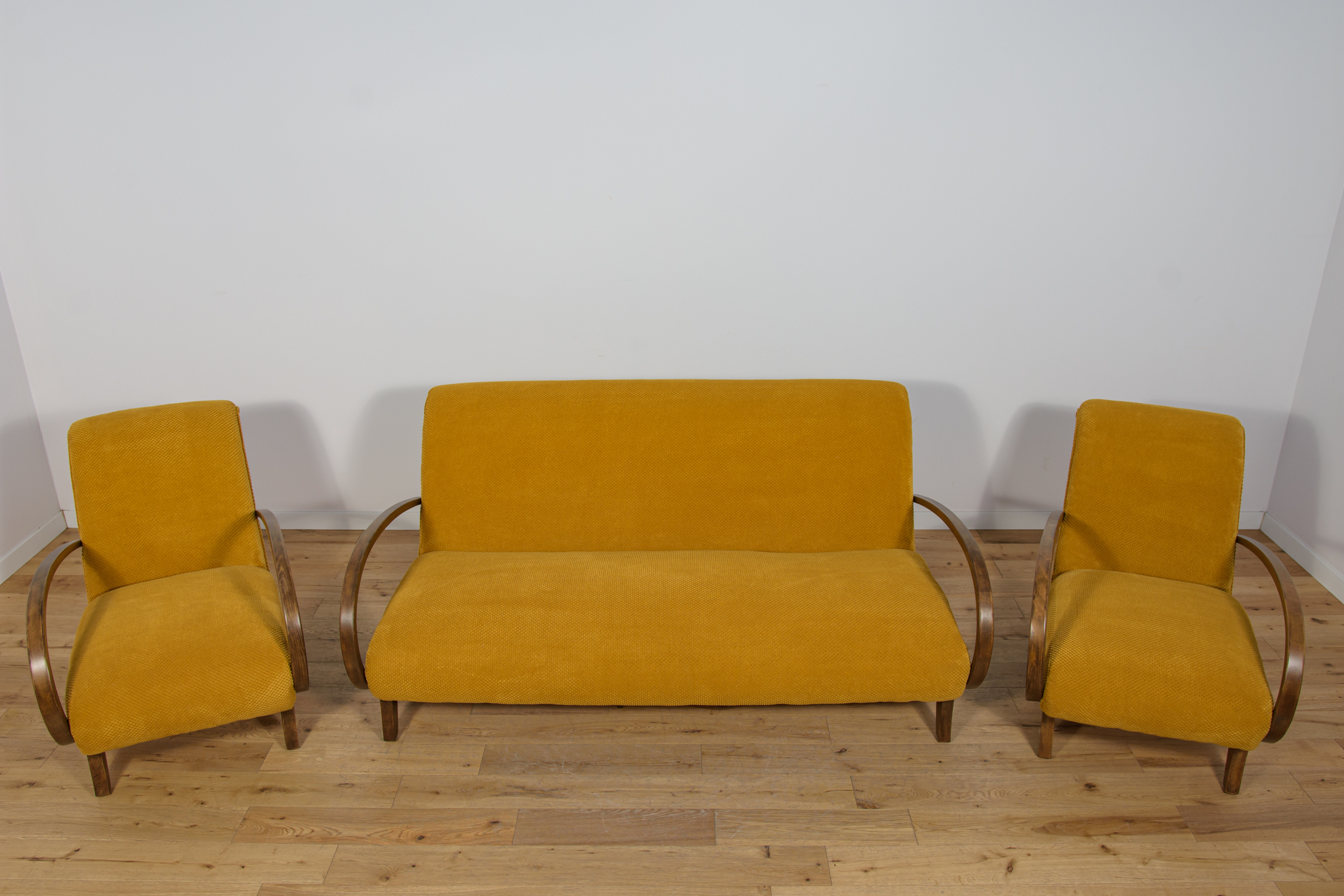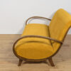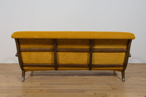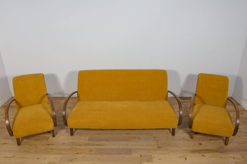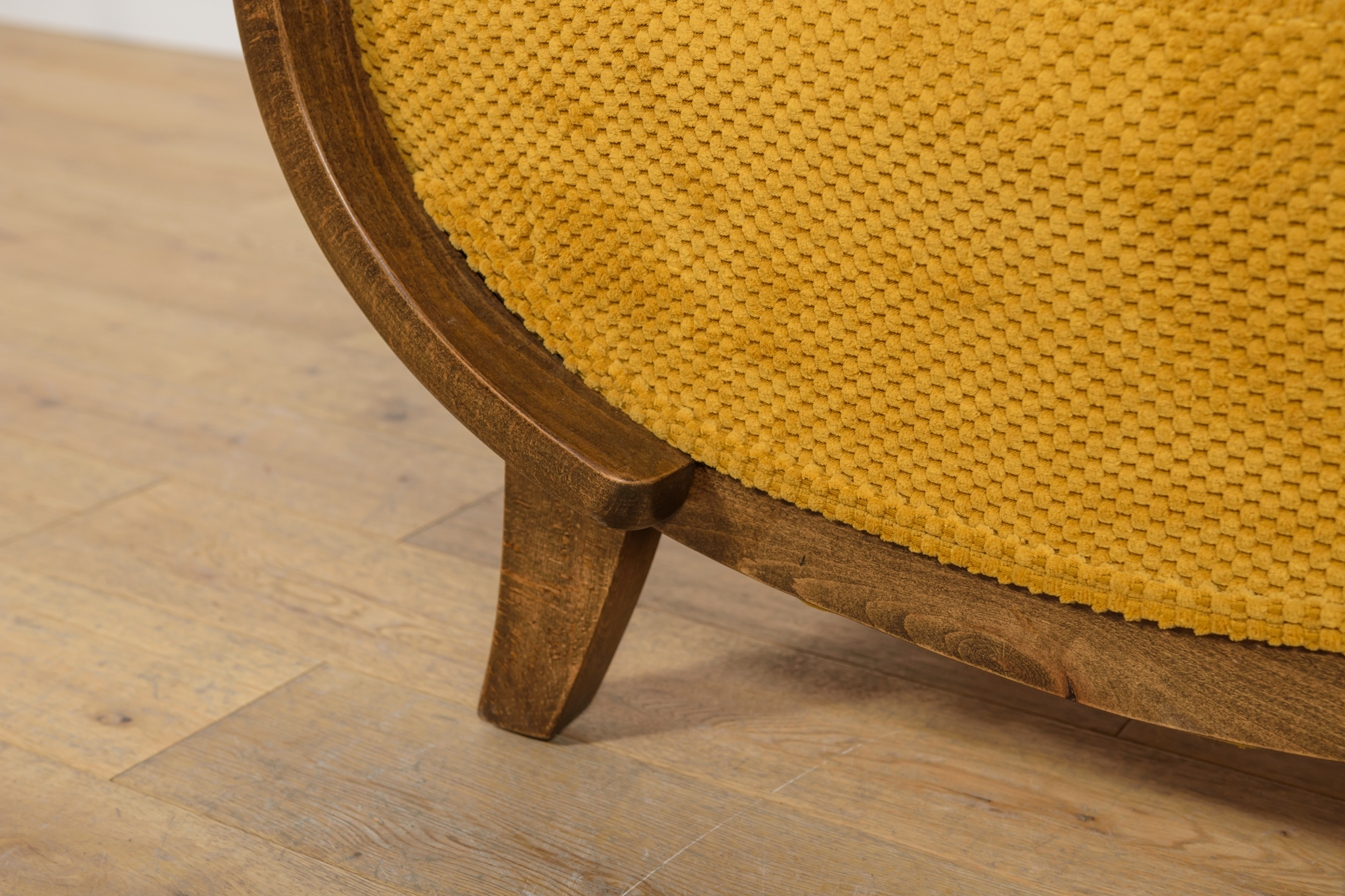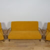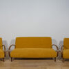 Three-seater sofa and two armchairs in the Art Deco style, manufactured in Poland in the 1930s. Set after comprehensive renovation. Beech wood elements were cleaned of the old surface, stained with oak stain, finished with a strong semi-matt varnish. Upholstery interiors replaced, upholstered with high-quality yellow fabric.