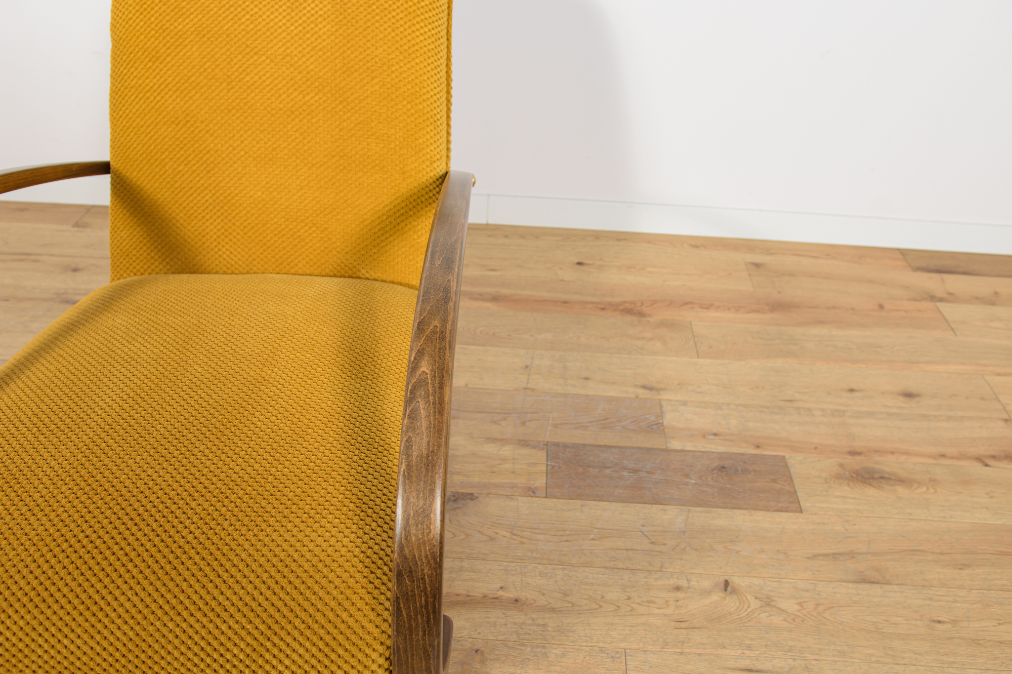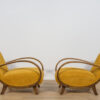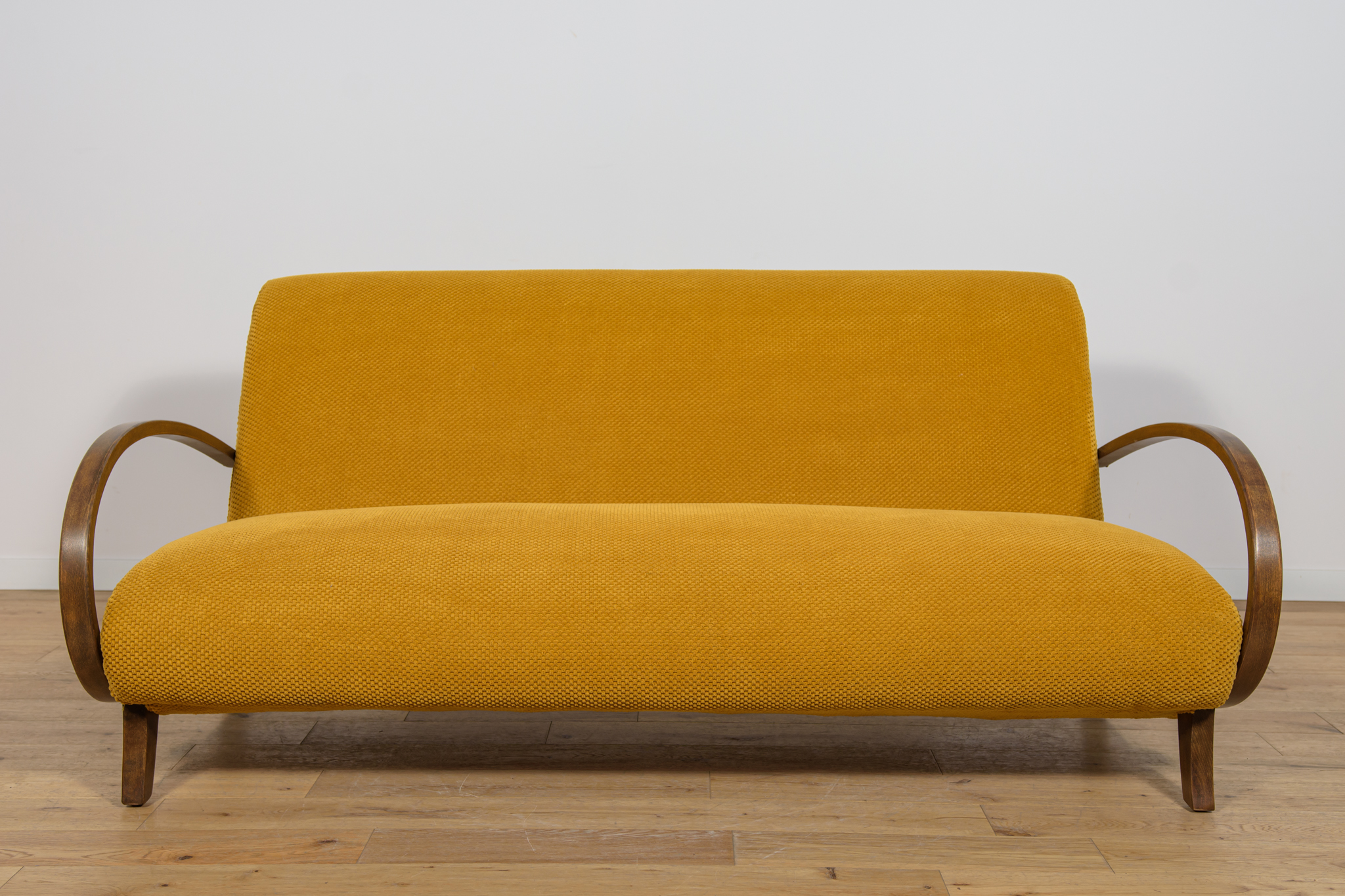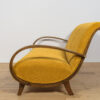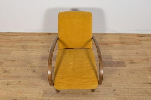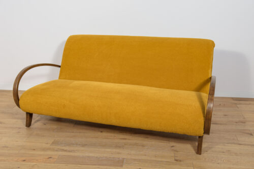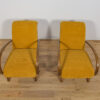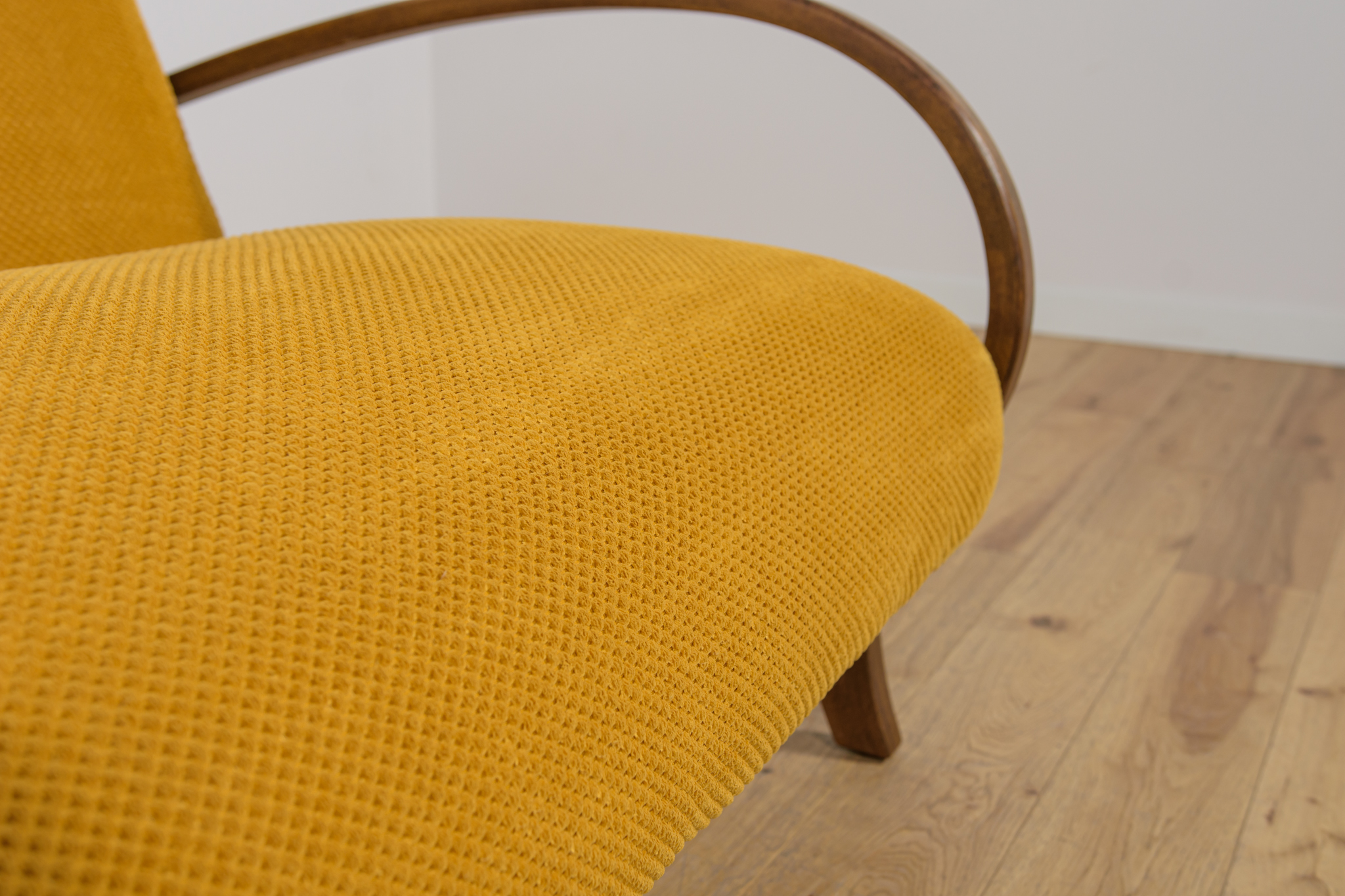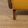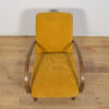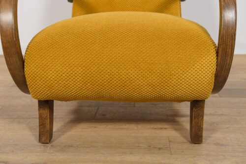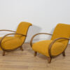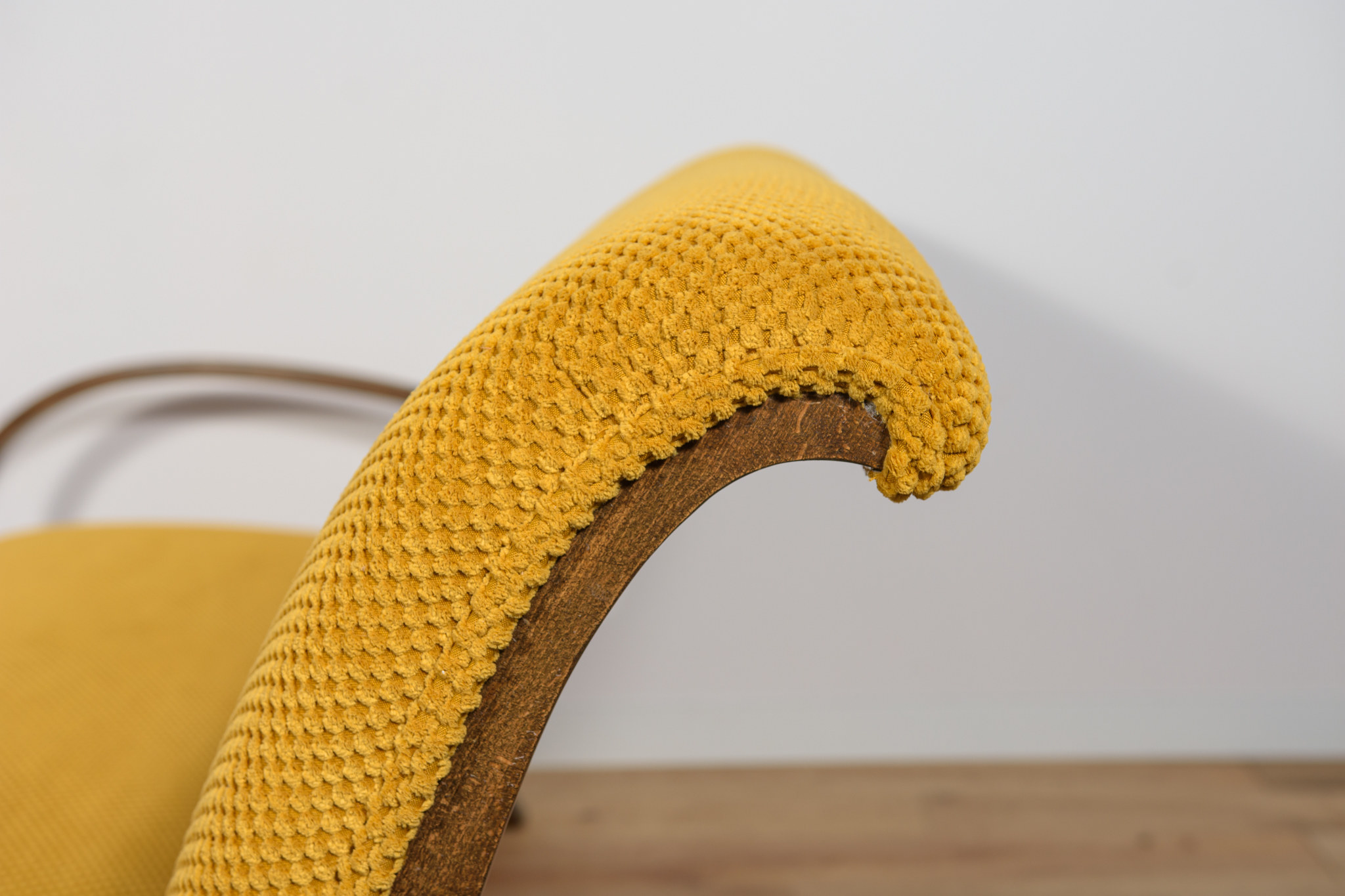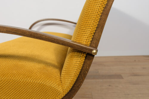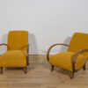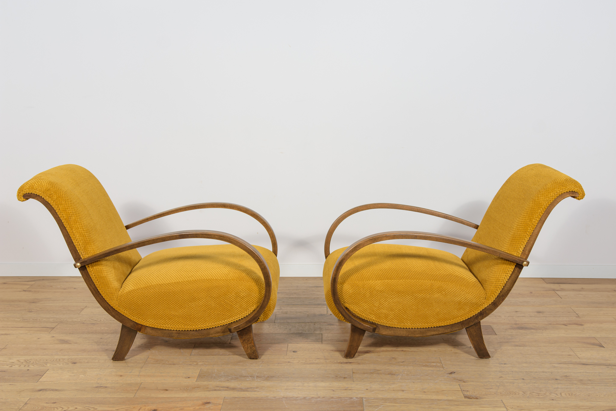 Three-seater sofa and two armchairs in the Art Deco style, manufactured in Poland in the 1930s. Set after comprehensive renovation. Beech wood elements were cleaned of the old surface, stained with oak stain, finished with a strong semi-matt varnish. Upholstery interiors replaced, upholstered with high-quality yellow fabric.