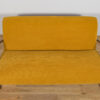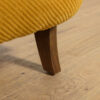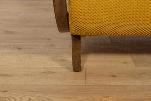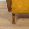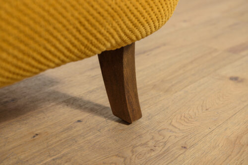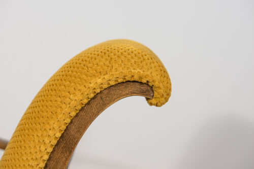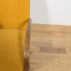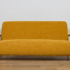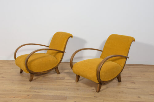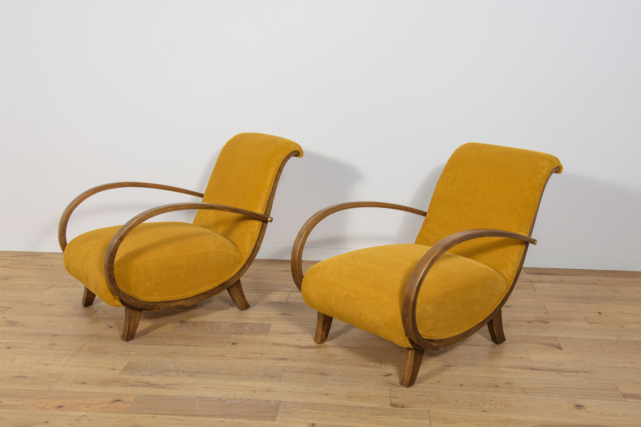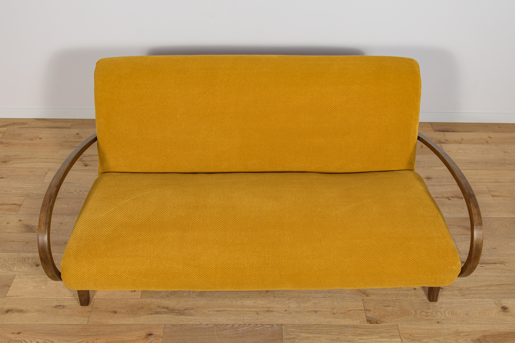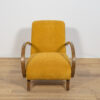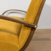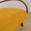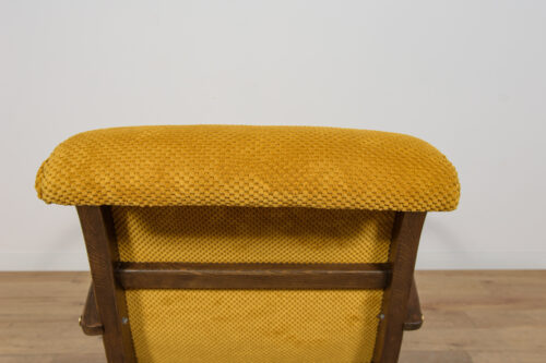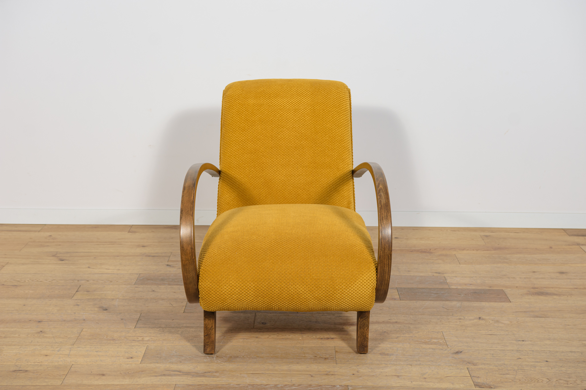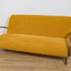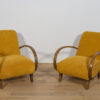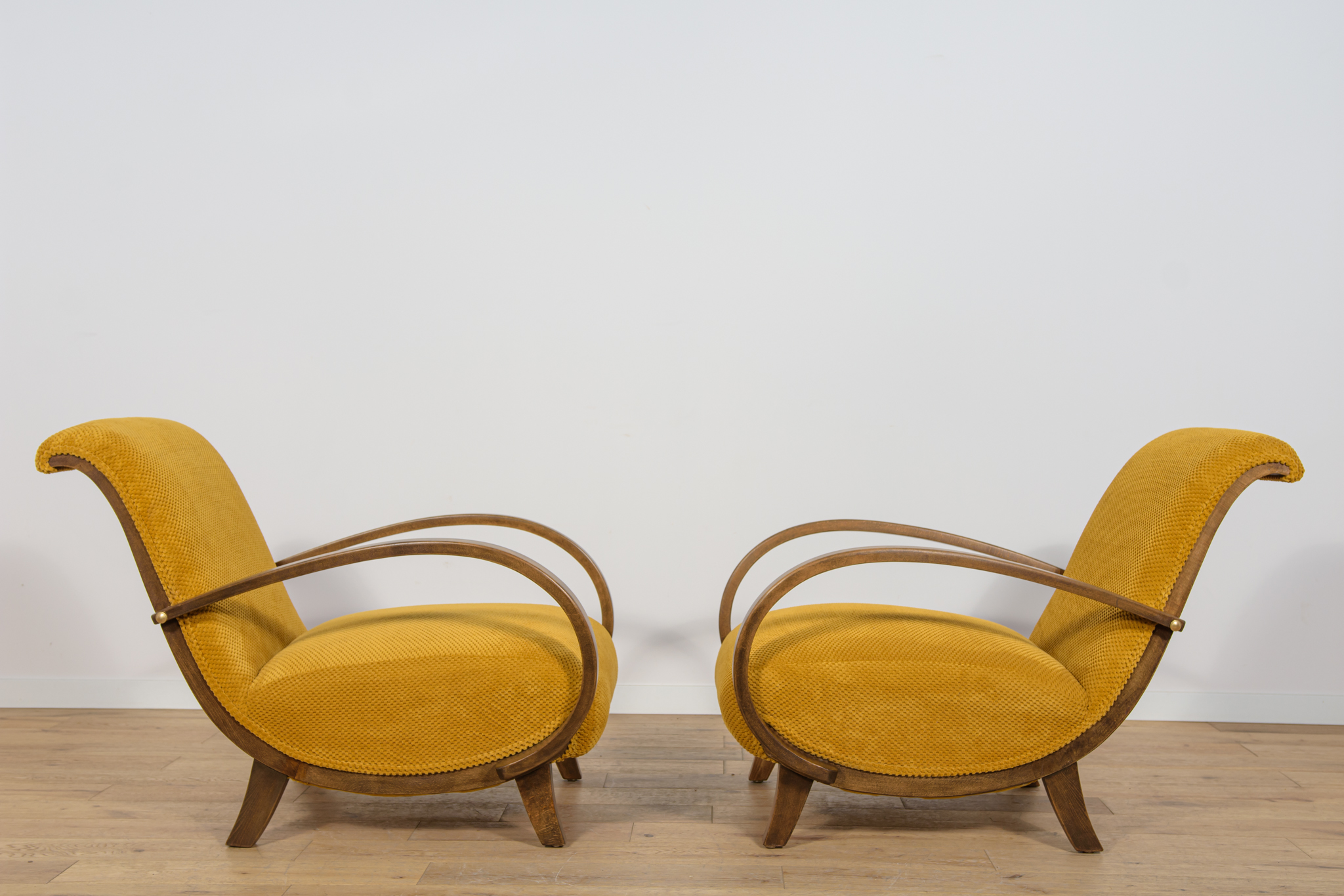 Three-seater sofa and two armchairs in the Art Deco style, manufactured in Poland in the 1930s. Set after comprehensive renovation. Beech wood elements were cleaned of the old surface, stained with oak stain, finished with a strong semi-matt varnish. Upholstery interiors replaced, upholstered with high-quality yellow fabric.