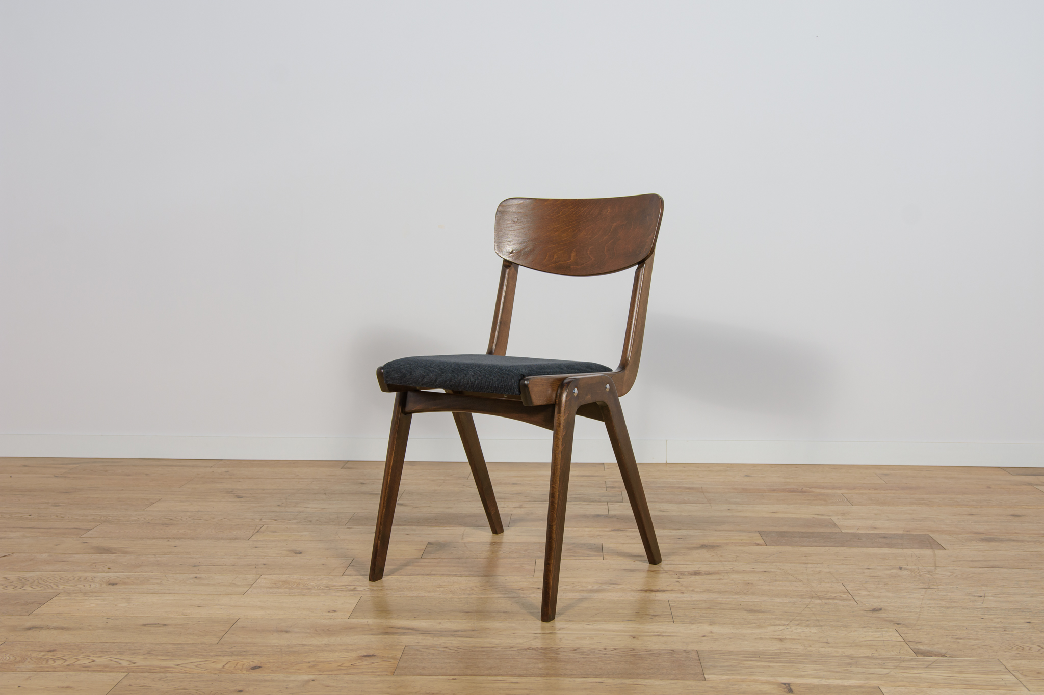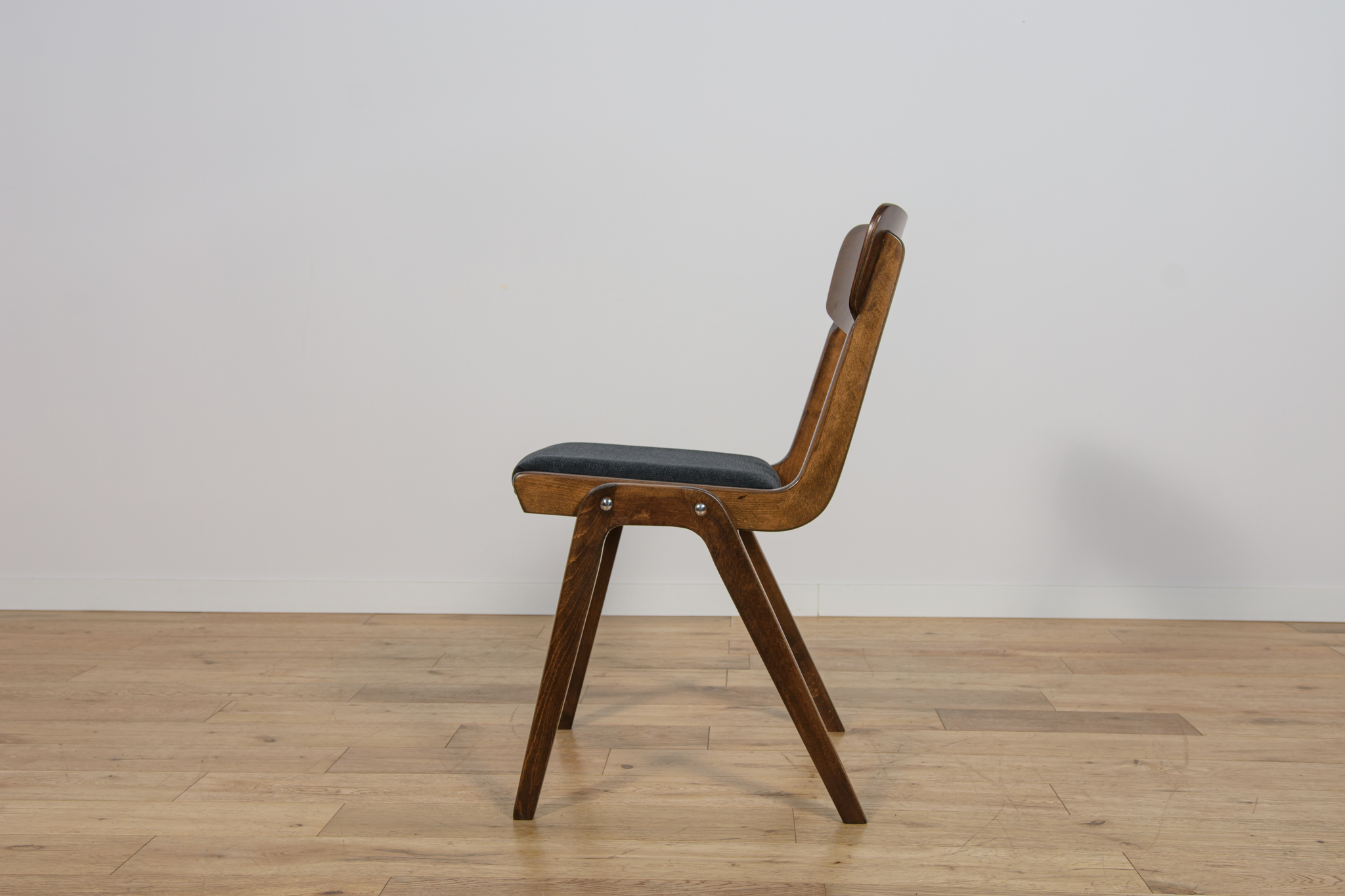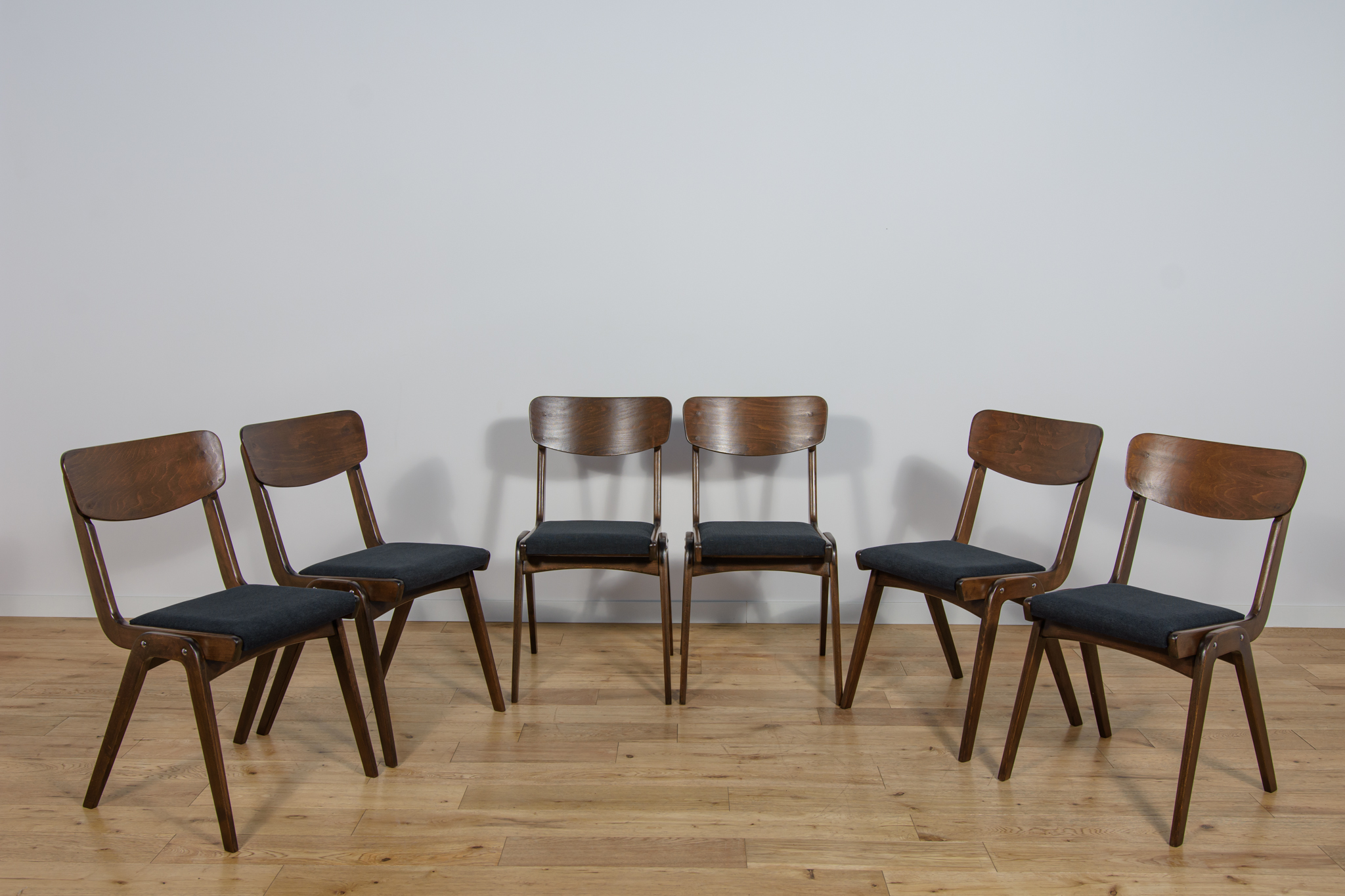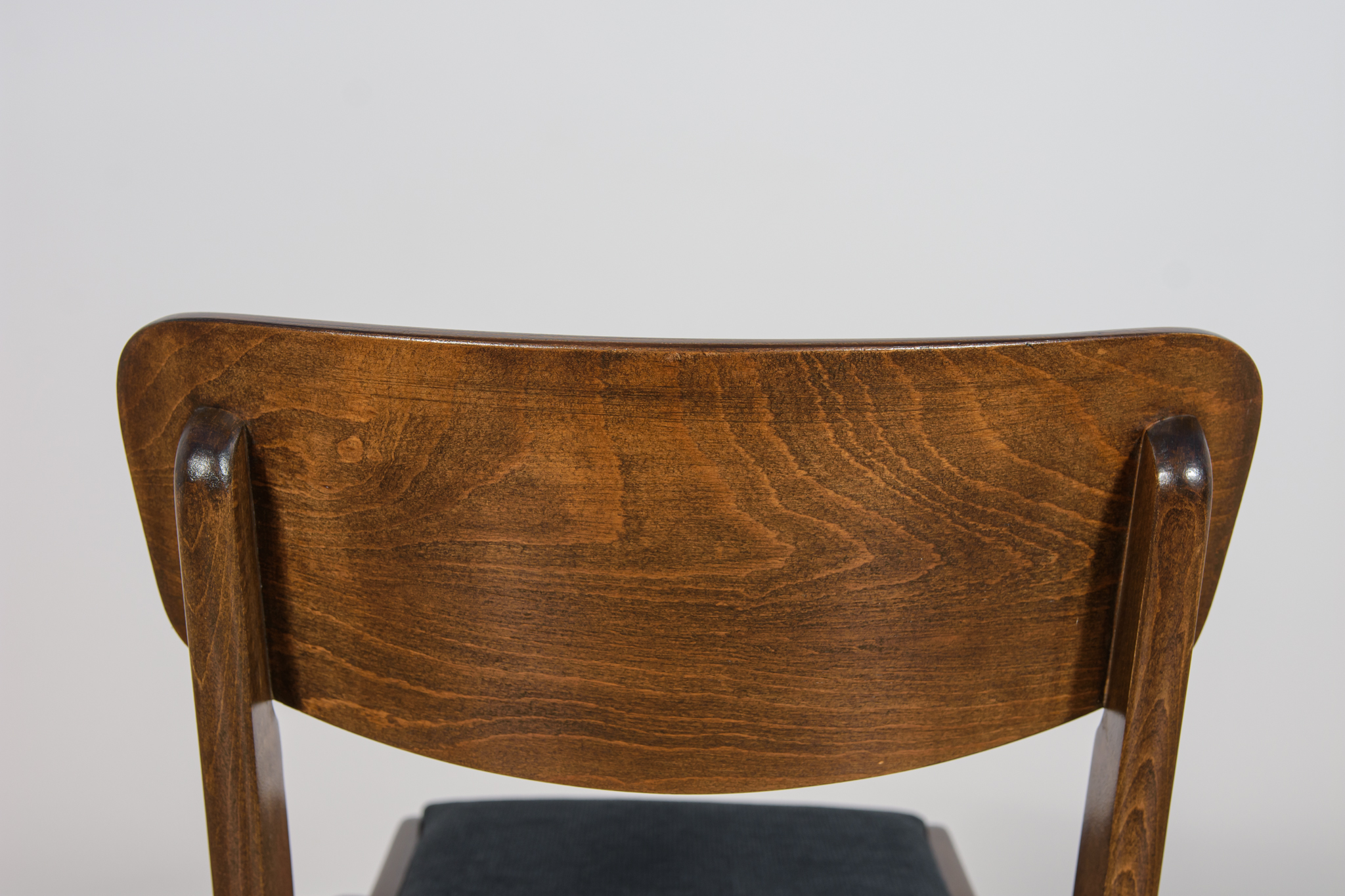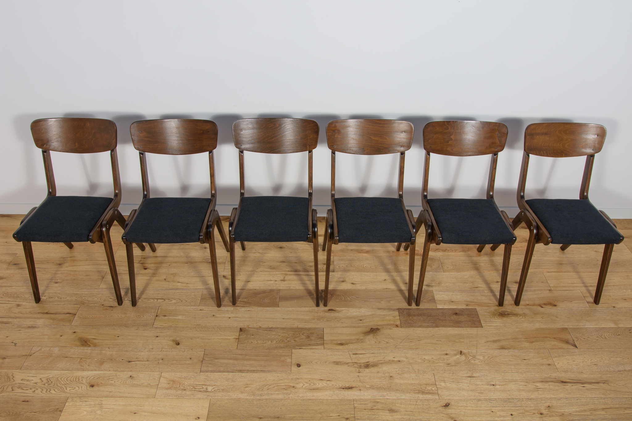 Set of 6 Polish dining chairs model Boomerang 229XB from Gościcińskie Furniture Factory in the 1960s. The frame of the chairs is made of beech wood. Wooden elements cleaned from the old surface painted with rosewood-colored stain and finished with a stronq semi-gloss lacquer. Sponges has been changed on new and covered very quality black fabric.