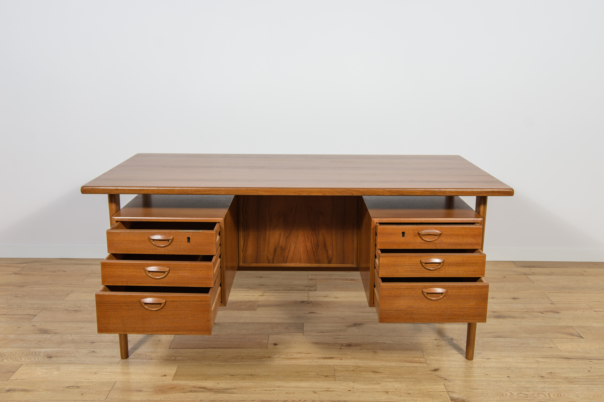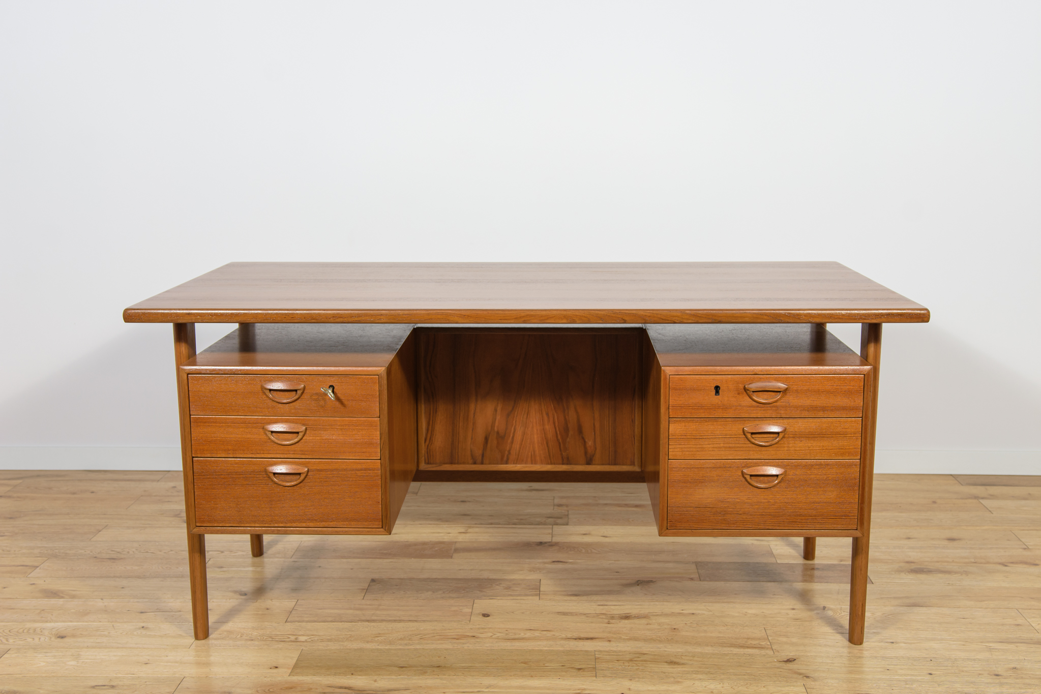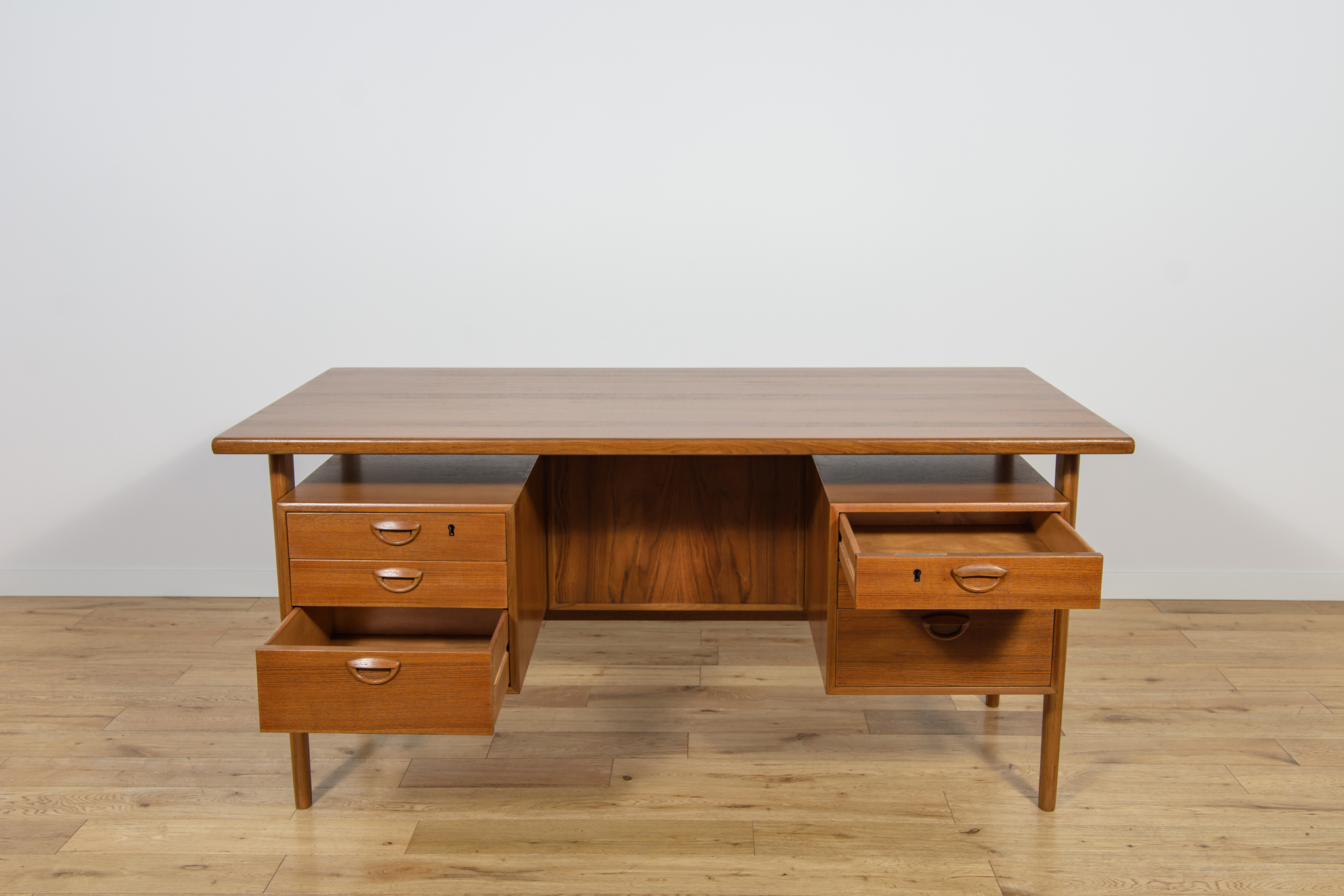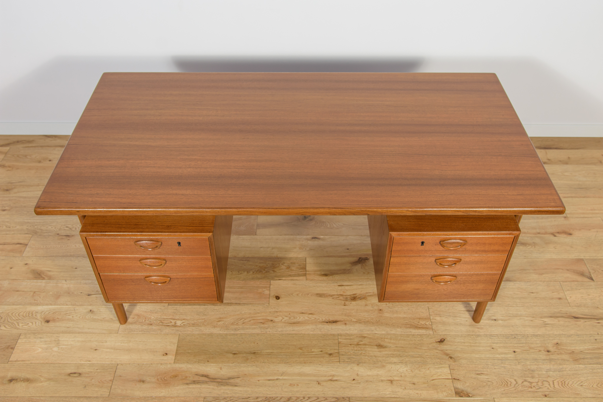 This desk is designed to Kai Kristiansen and manufactured by Feldballes Møbelfabrik in Denmark in the 1960s. It is a good example of high quality materials and manufacturing. This desk is made out of teak and is freestanding thanks to the finished backside with an open storage area. The front features two drawer modules with three drawers each. The teak elements have been cleaned from the old surface and painted in an oak mordant and finished with a stronq semi-matt lacquer.