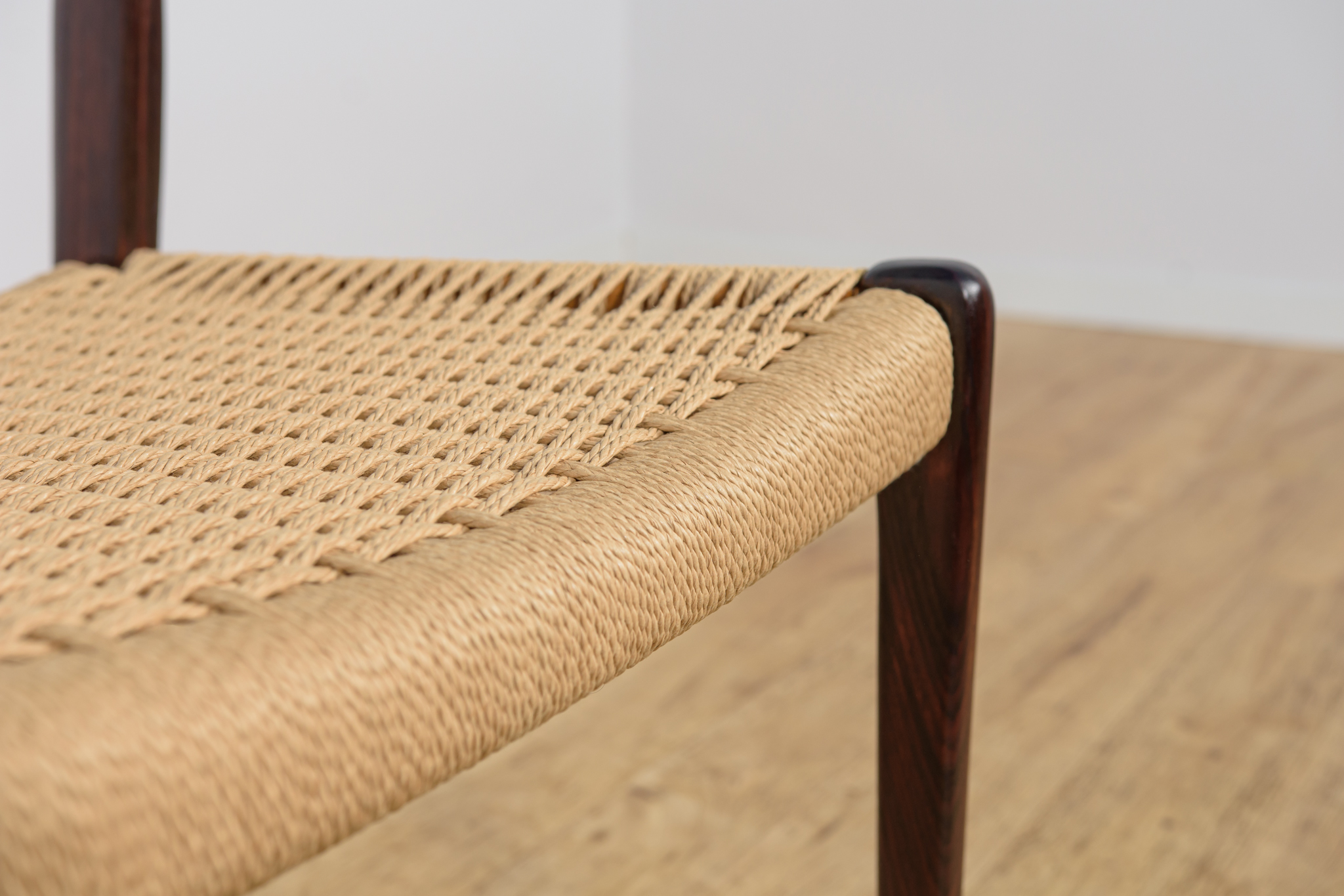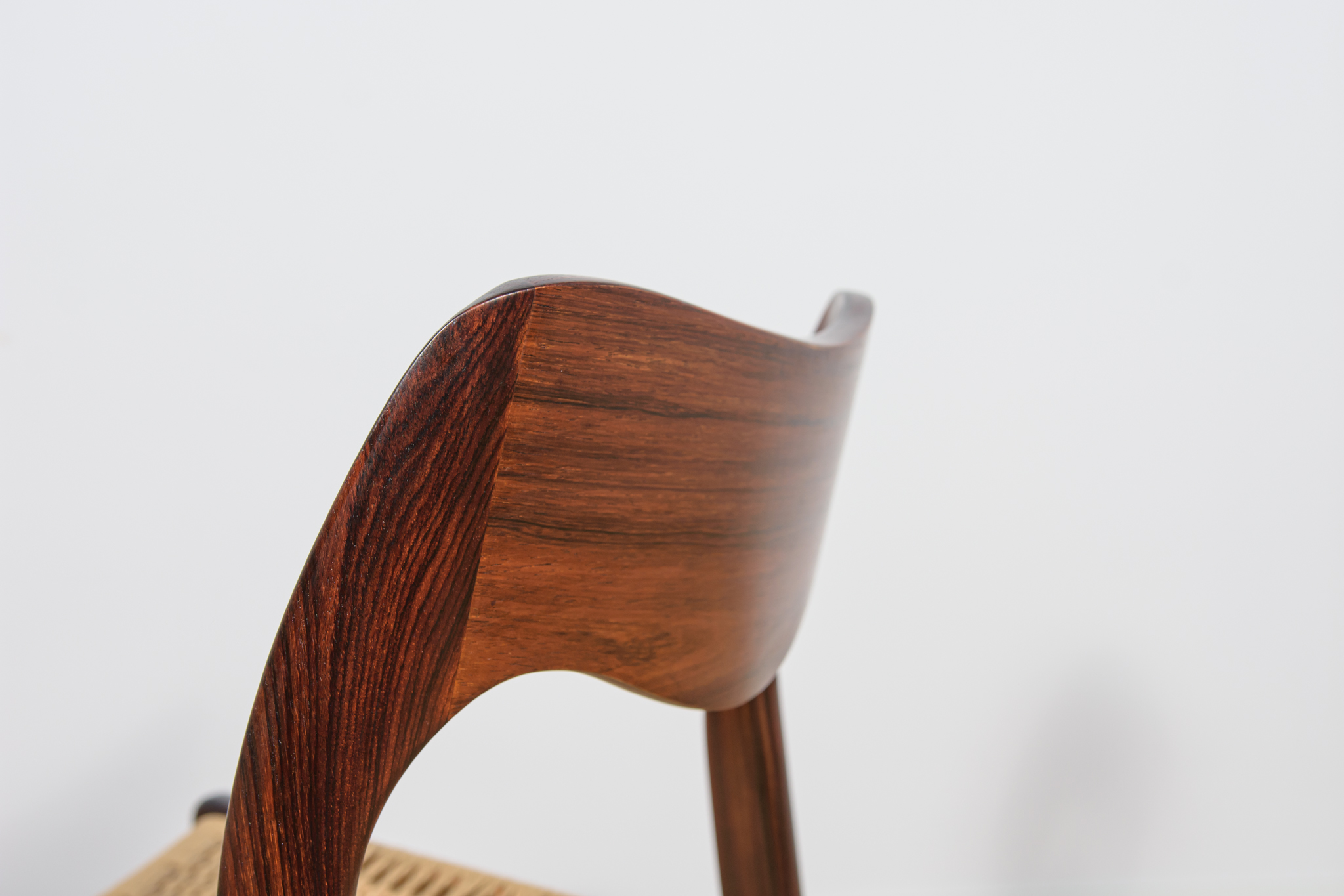 This set of four dining chairs was designed by Niels O. Møller and produced by J.L. Moller Mobelfabrik in Denmark during in the 1950s. The pieces are made from rosewood with original paper cord seating (Excellent condition – original). The teak elements have been cleaned from the old surface and finished with Danish oil.