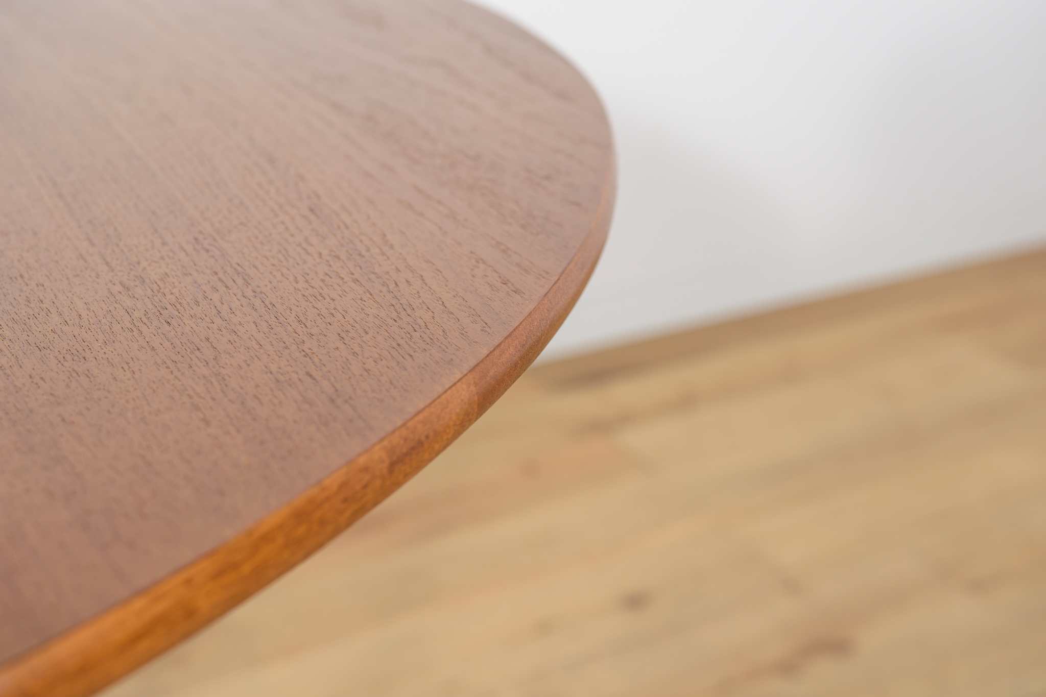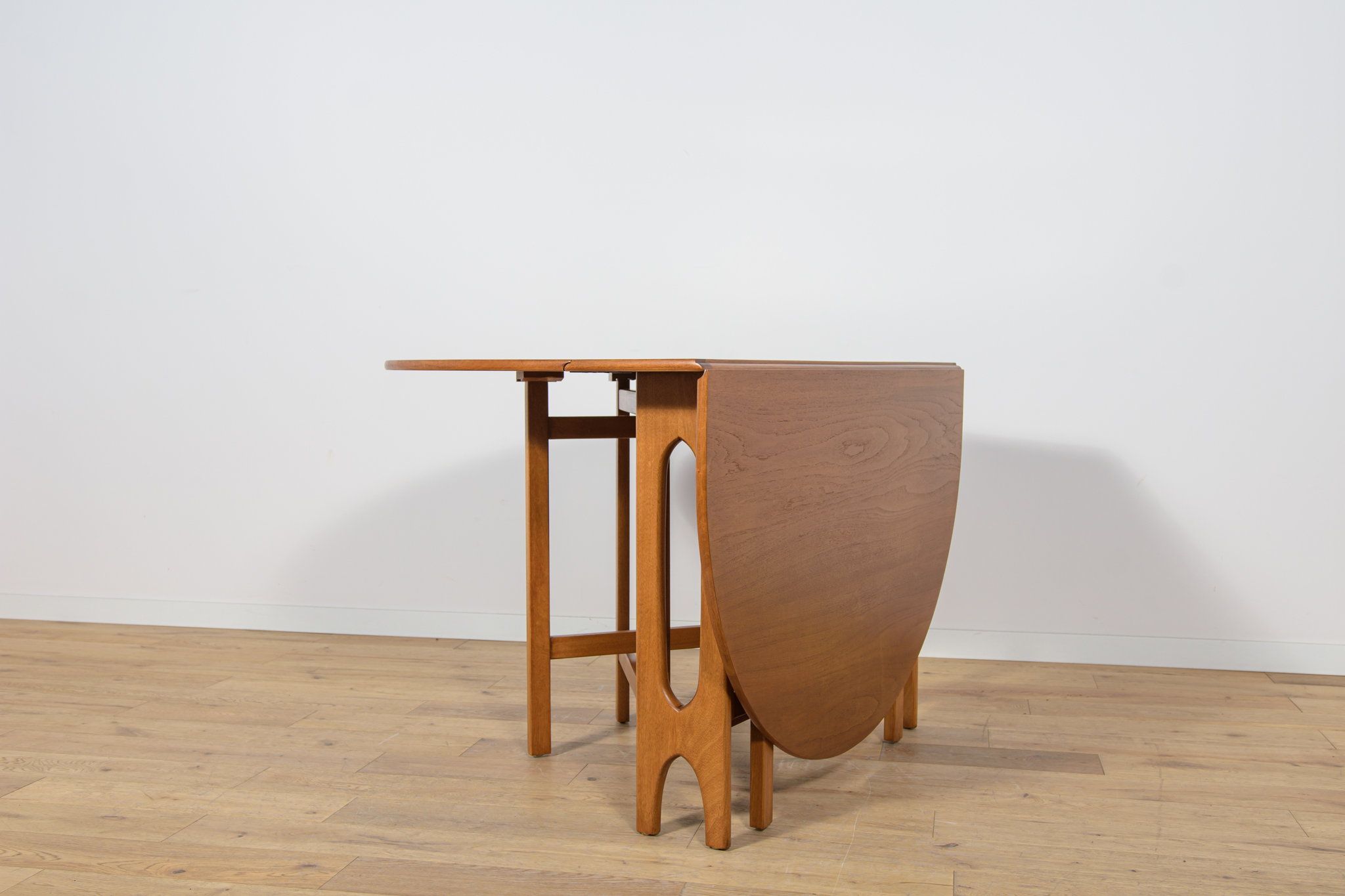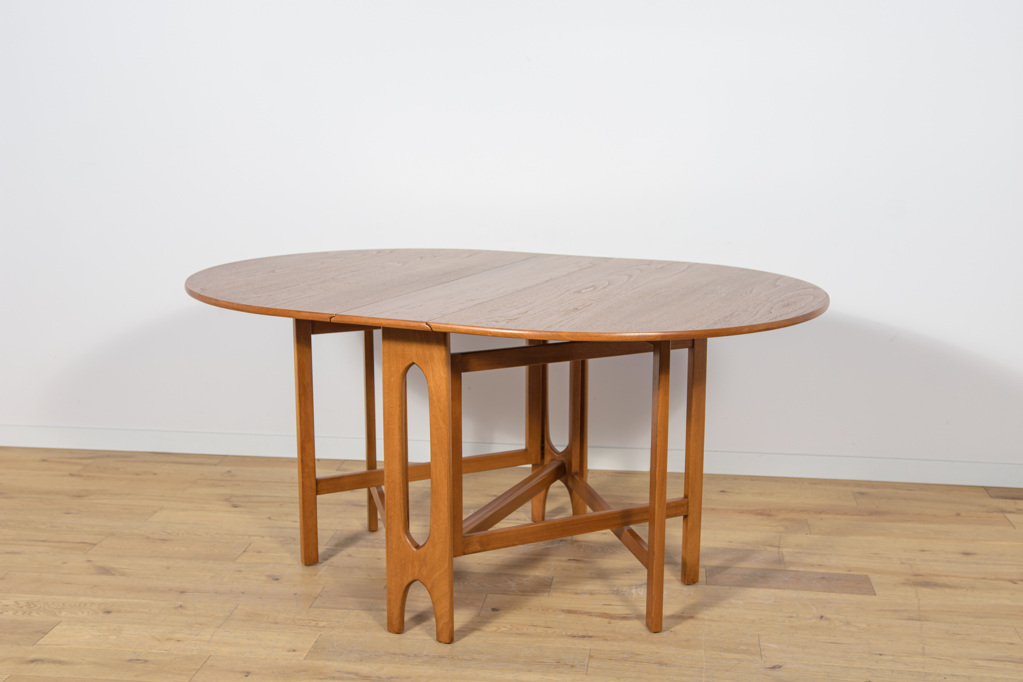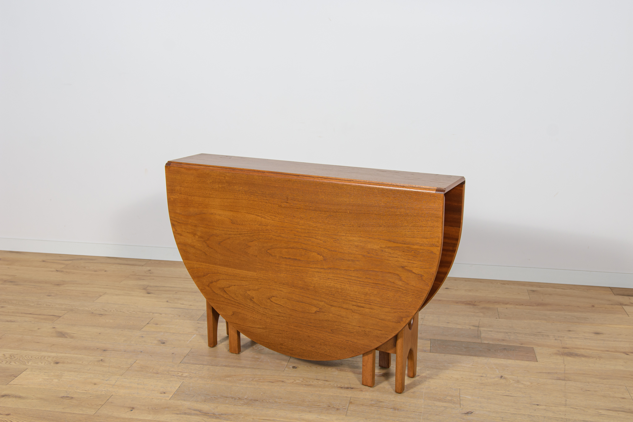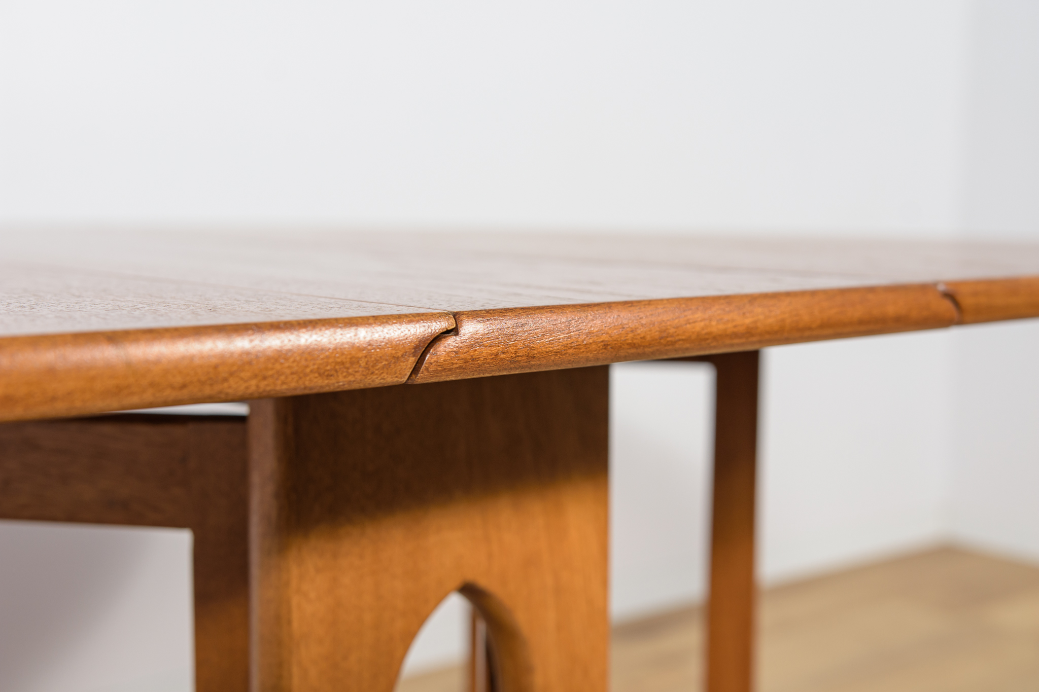 The extendable table made of teak wood was produced in the 1960s in the British factory Jentique. A table with an elegant form and profiled edges. Table after professional carpentry renovation. It was cleaned of the old surface, painted with oak stain, and finished with a strong semi-matt varnish. Before unfolding, the table takes up little space – 26 cm, after unfolding two extra beds, its length increases to 154 cm.