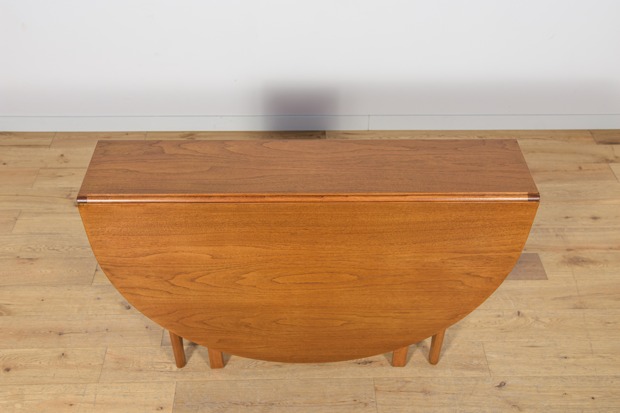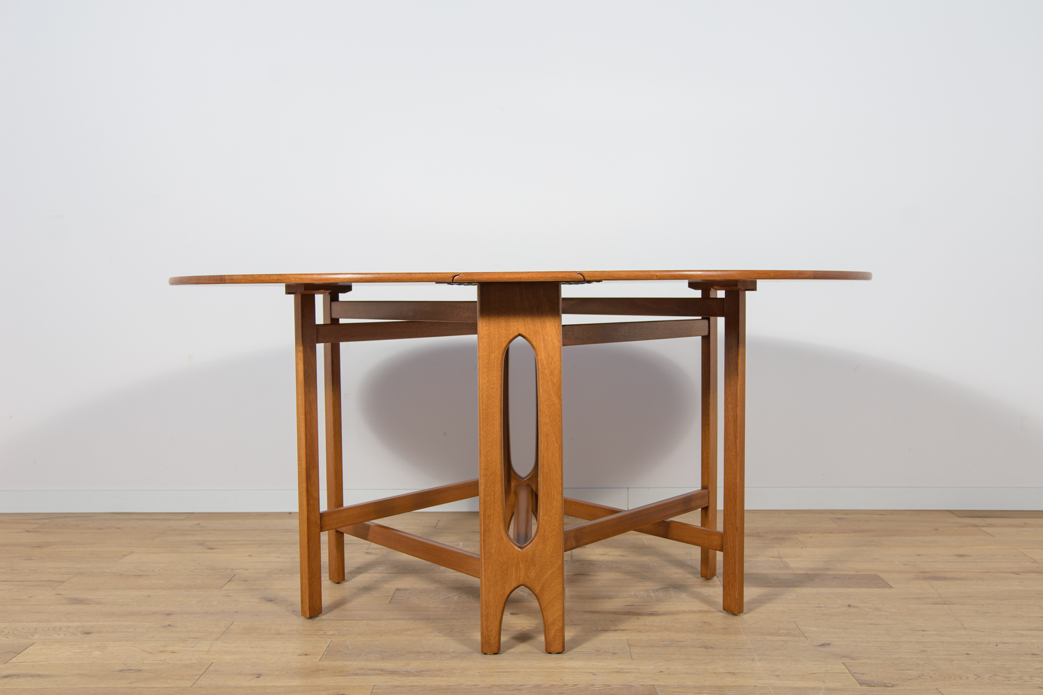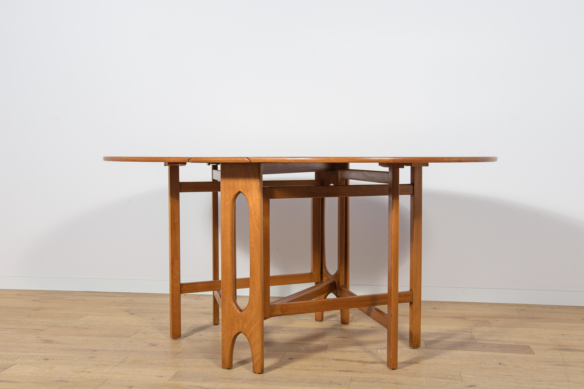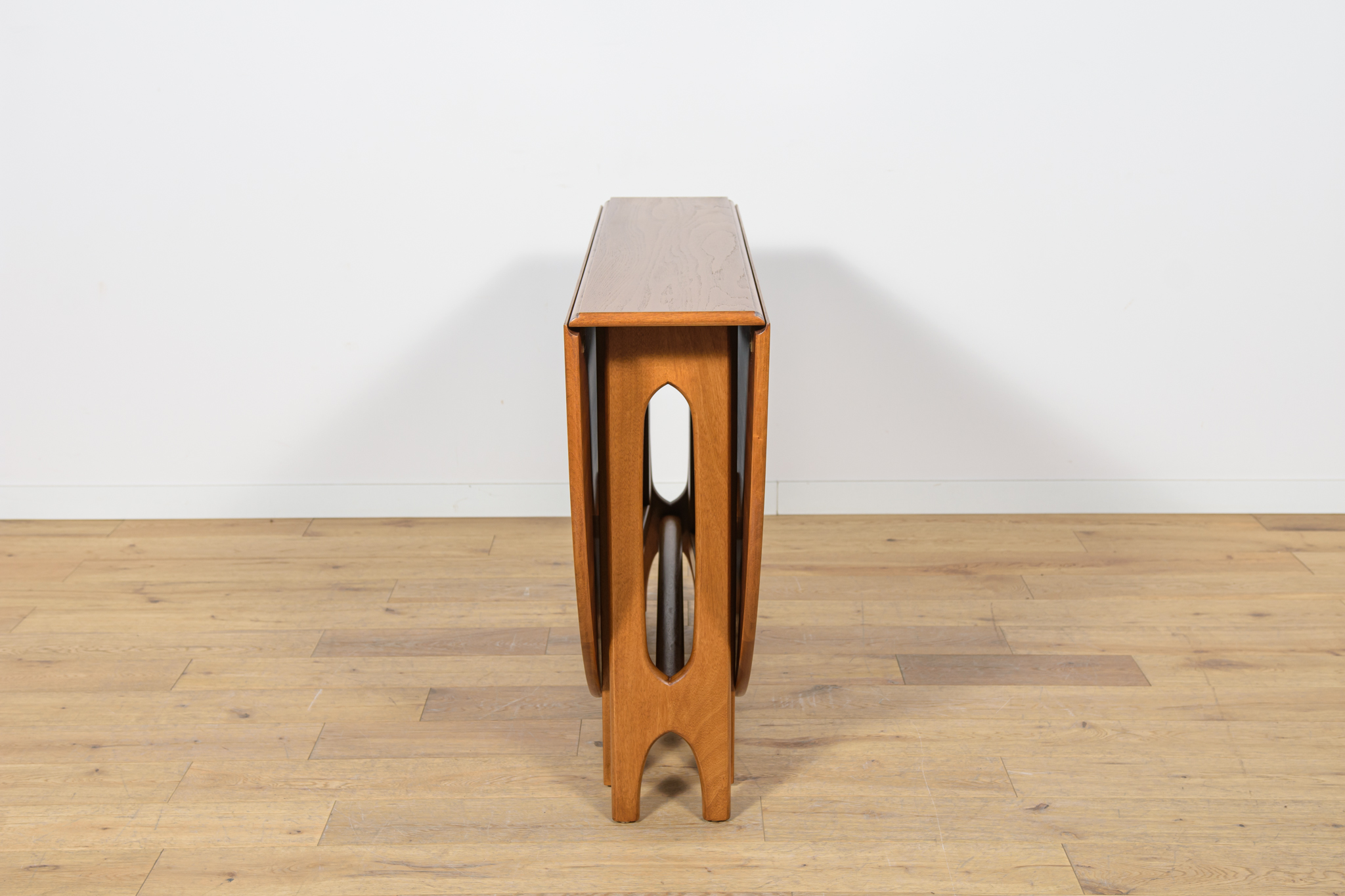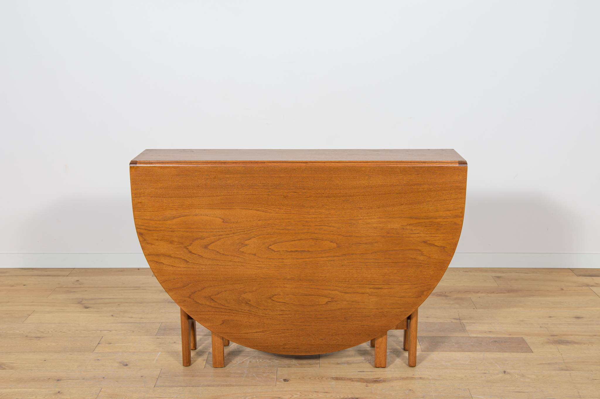The extendable table made of teak wood was produced in the 1960s in the British factory Jentique. A table with an elegant form and profiled edges. Table after professional carpentry renovation. It was cleaned of the old surface, painted with oak stain, and finished with a strong semi-matt varnish. Before unfolding, the table takes up little space – 26 cm, after unfolding two extra beds, its length increases to 154 cm.