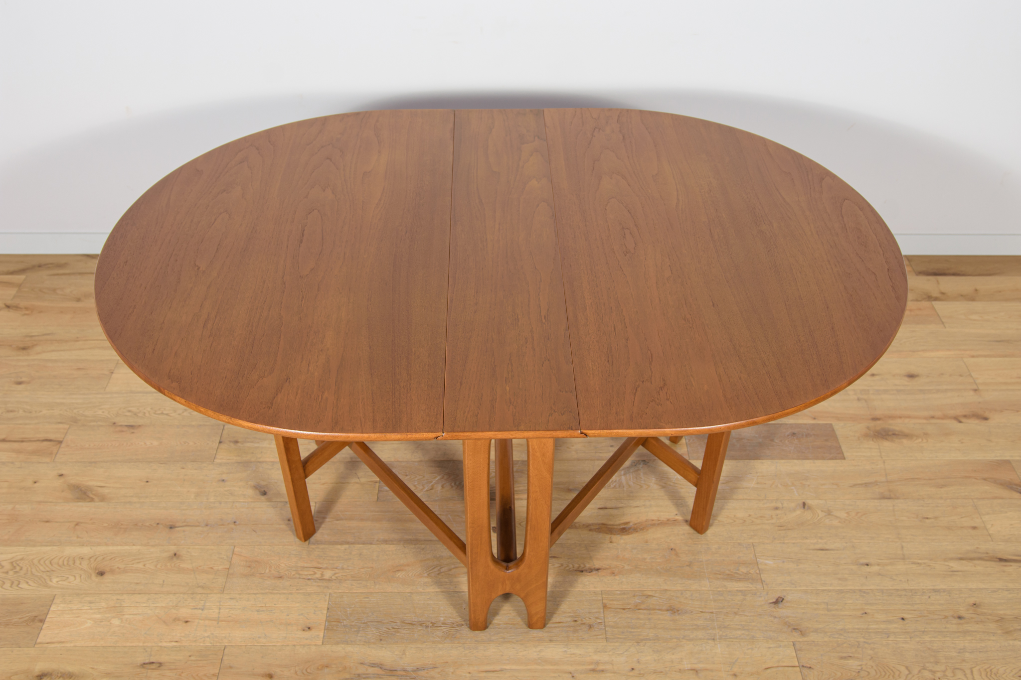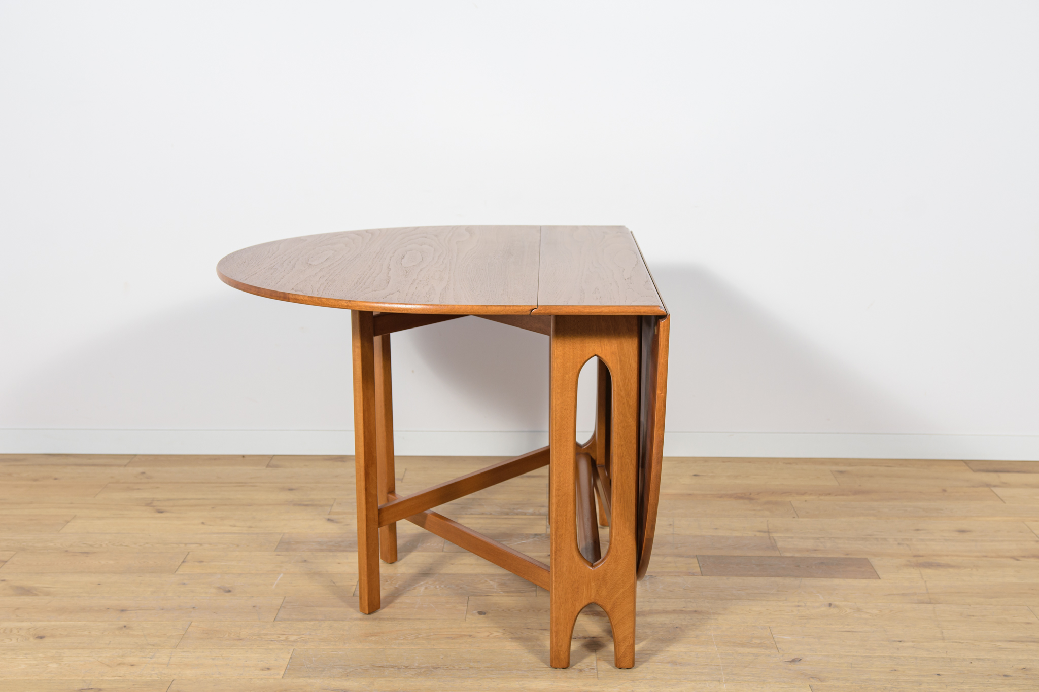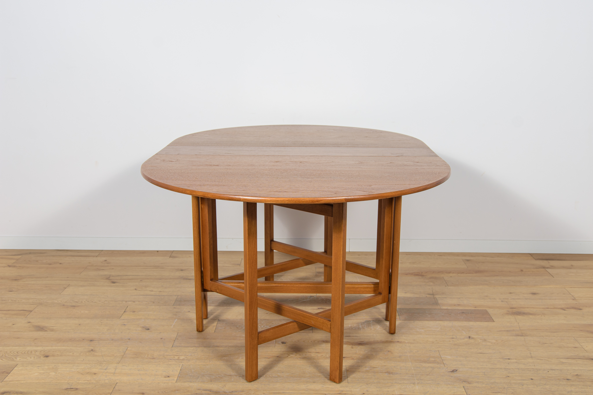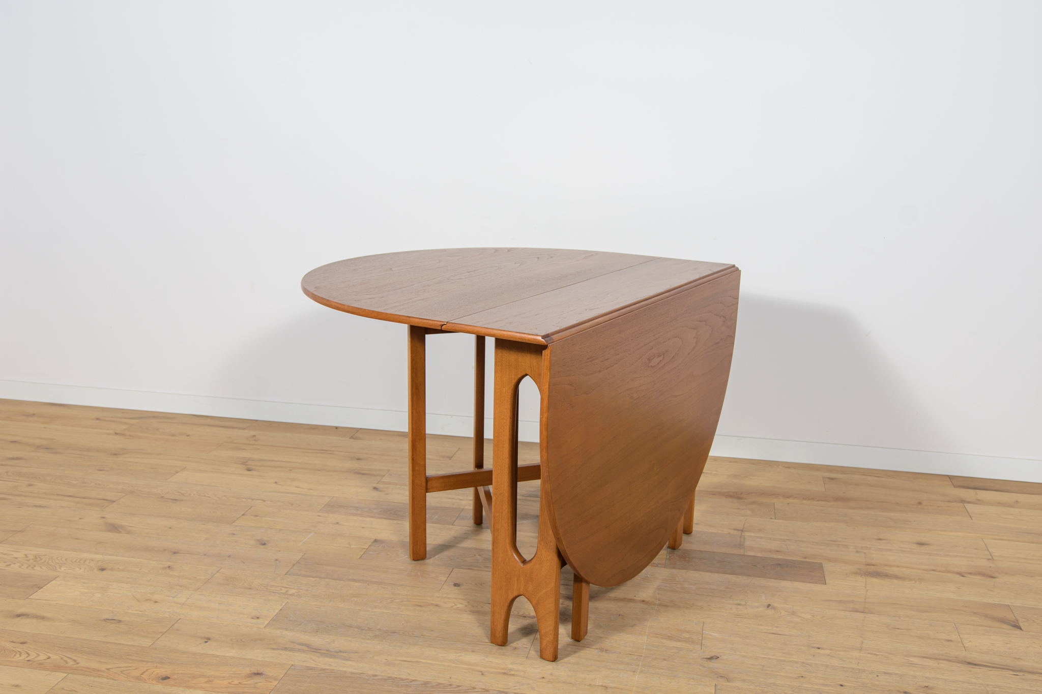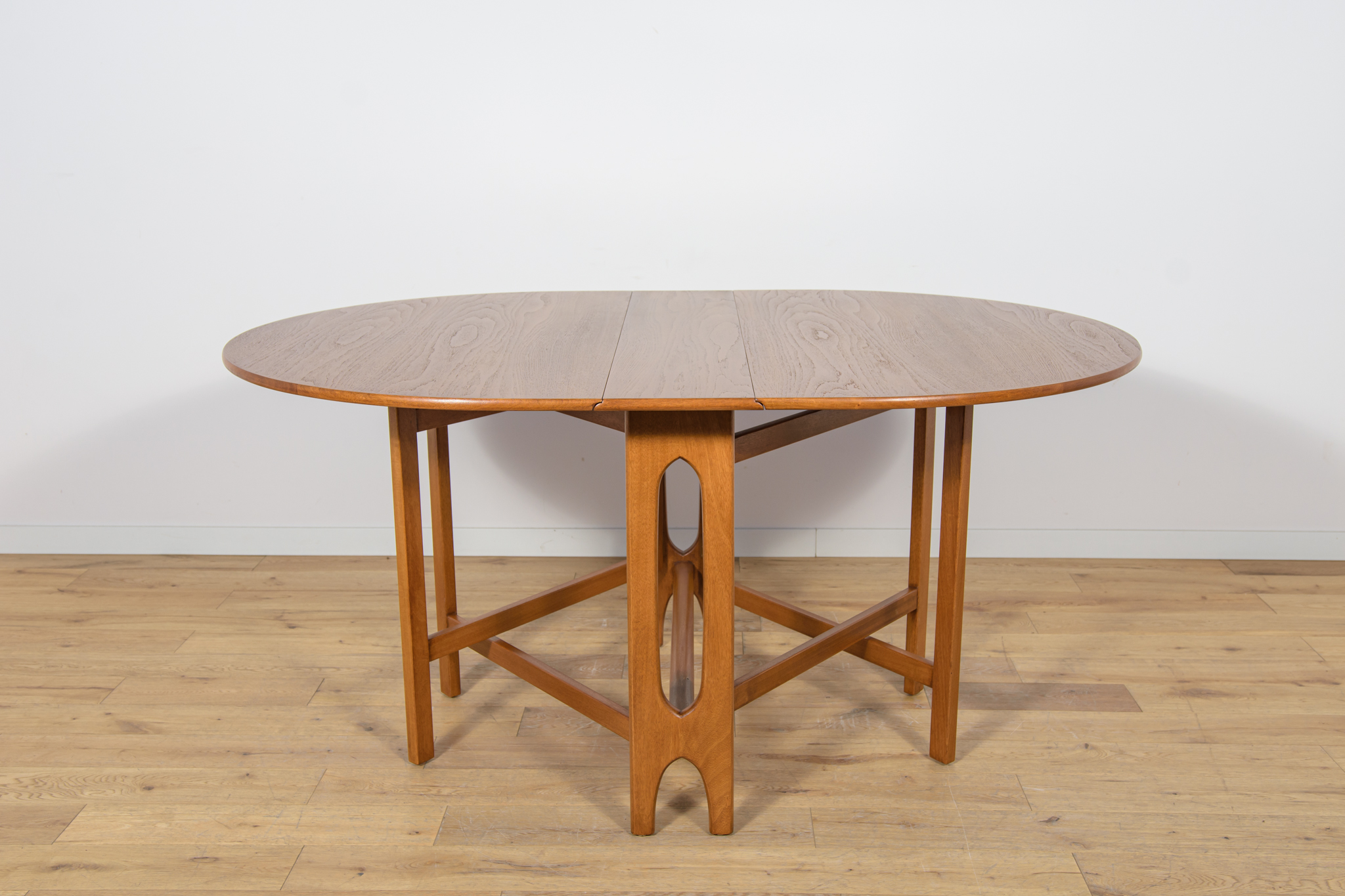 The extendable table made of teak wood was produced in the 1960s in the British factory Jentique. A table with an elegant form and profiled edges. Table after professional carpentry renovation. It was cleaned of the old surface, painted with oak stain, and finished with a strong semi-matt varnish. Before unfolding, the table takes up little space – 26 cm, after unfolding two extra beds, its length increases to 154 cm.