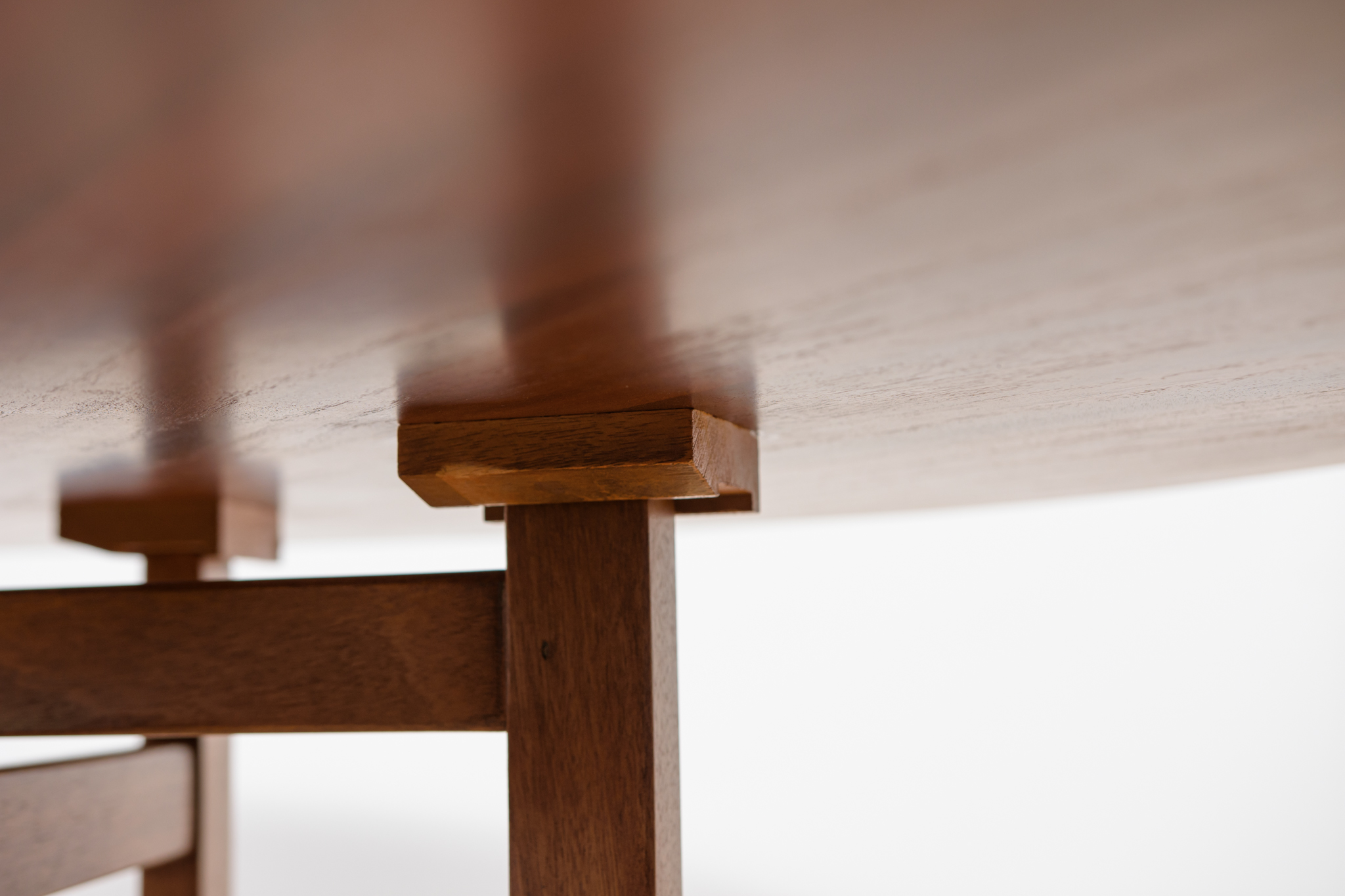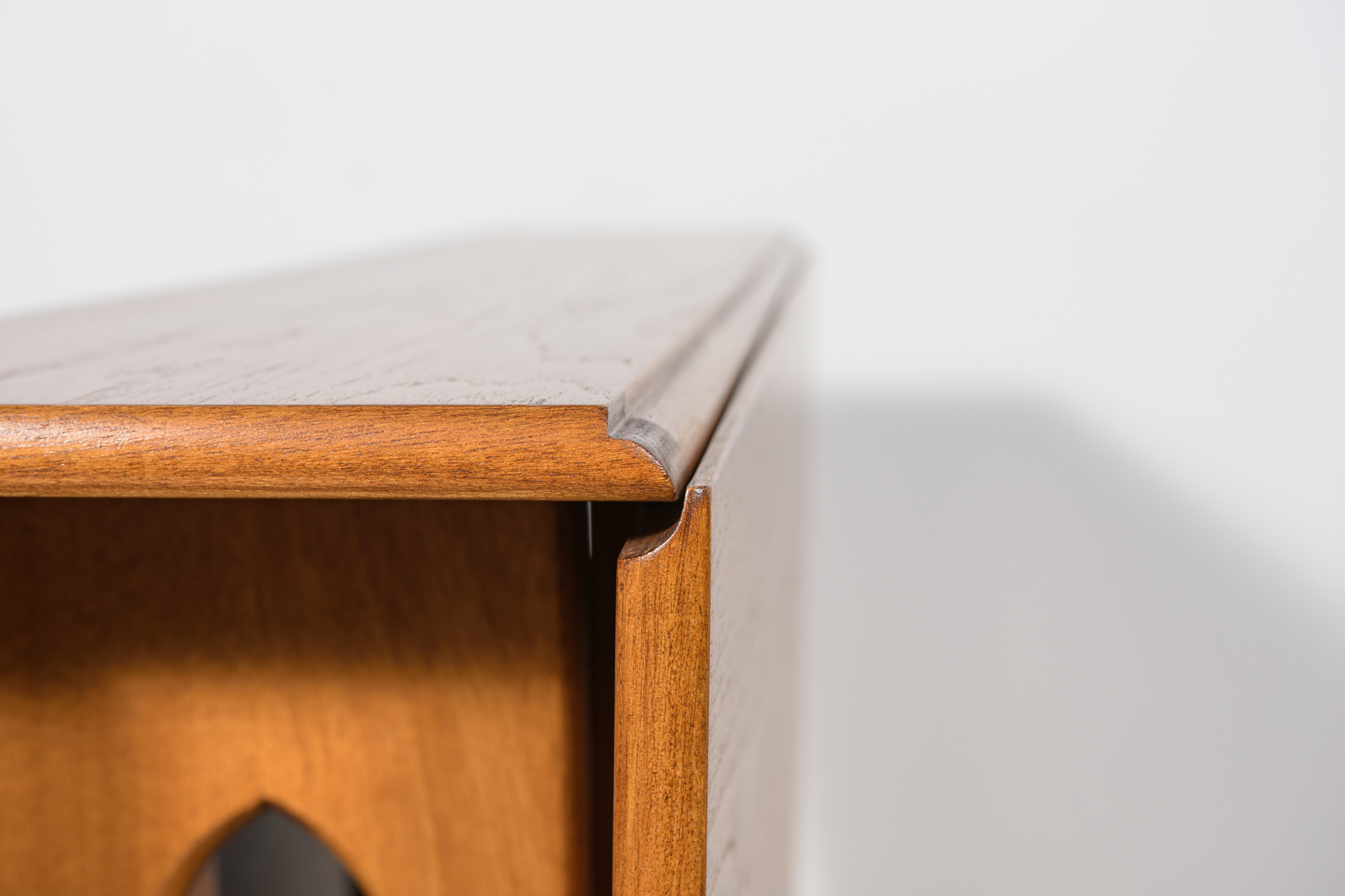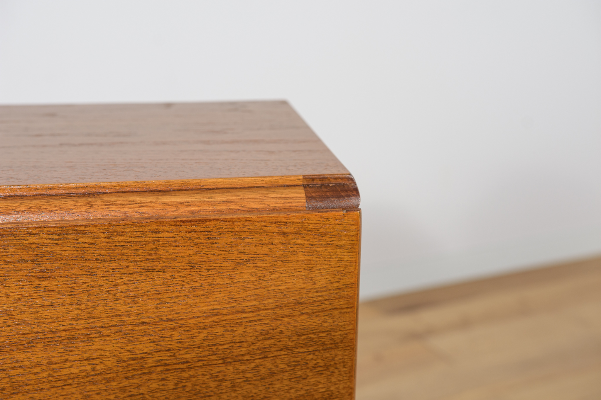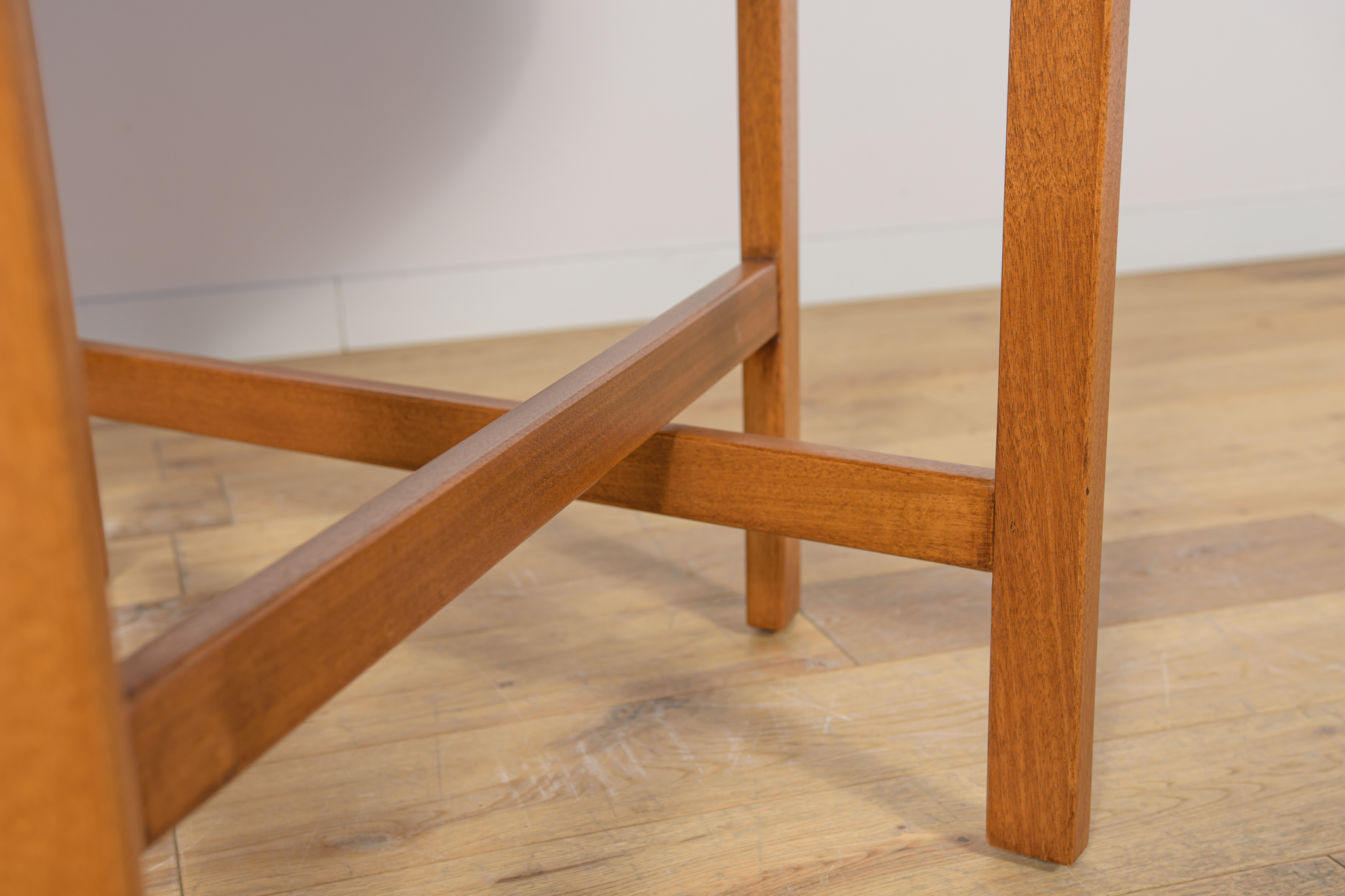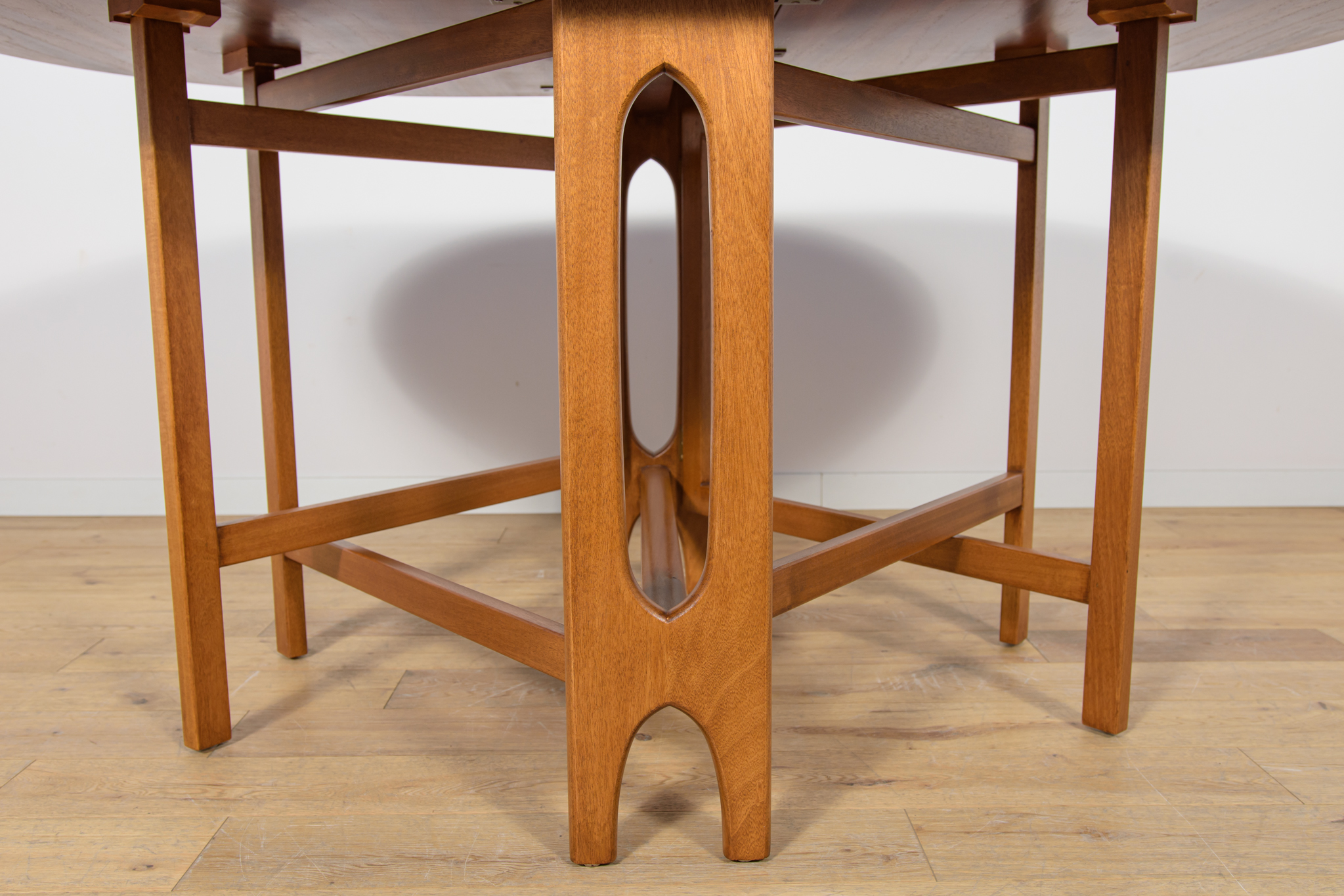 The extendable table made of teak wood was produced in the 1960s in the British factory Jentique. A table with an elegant form and profiled edges. Table after professional carpentry renovation. It was cleaned of the old surface, painted with oak stain, and finished with a strong semi-matt varnish. Before unfolding, the table takes up little space – 26 cm, after unfolding two extra beds, its length increases to 154 cm.
