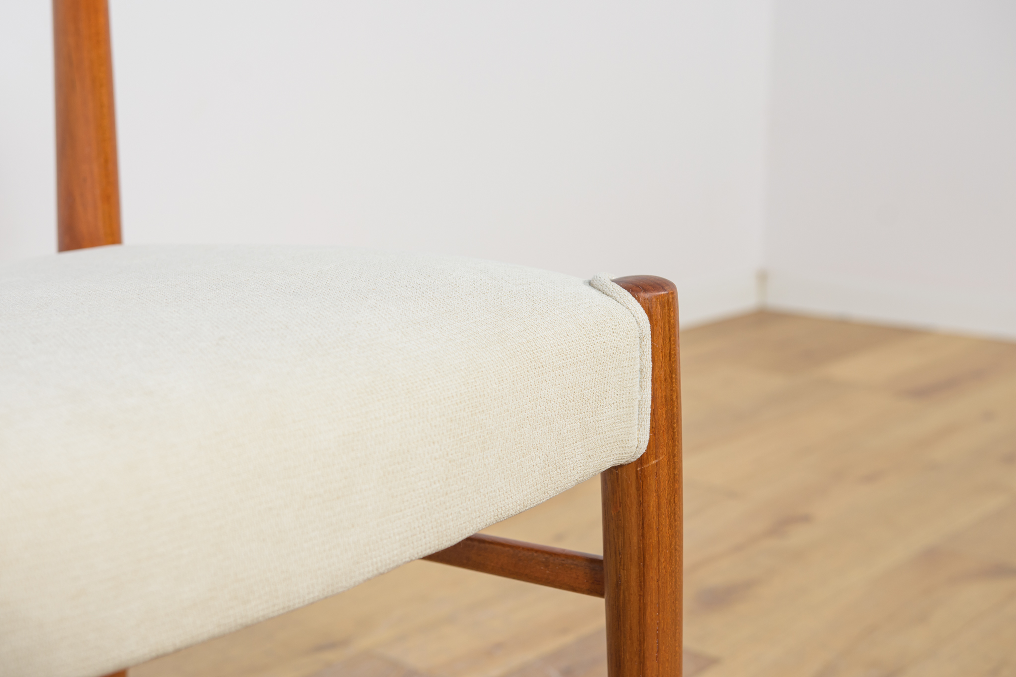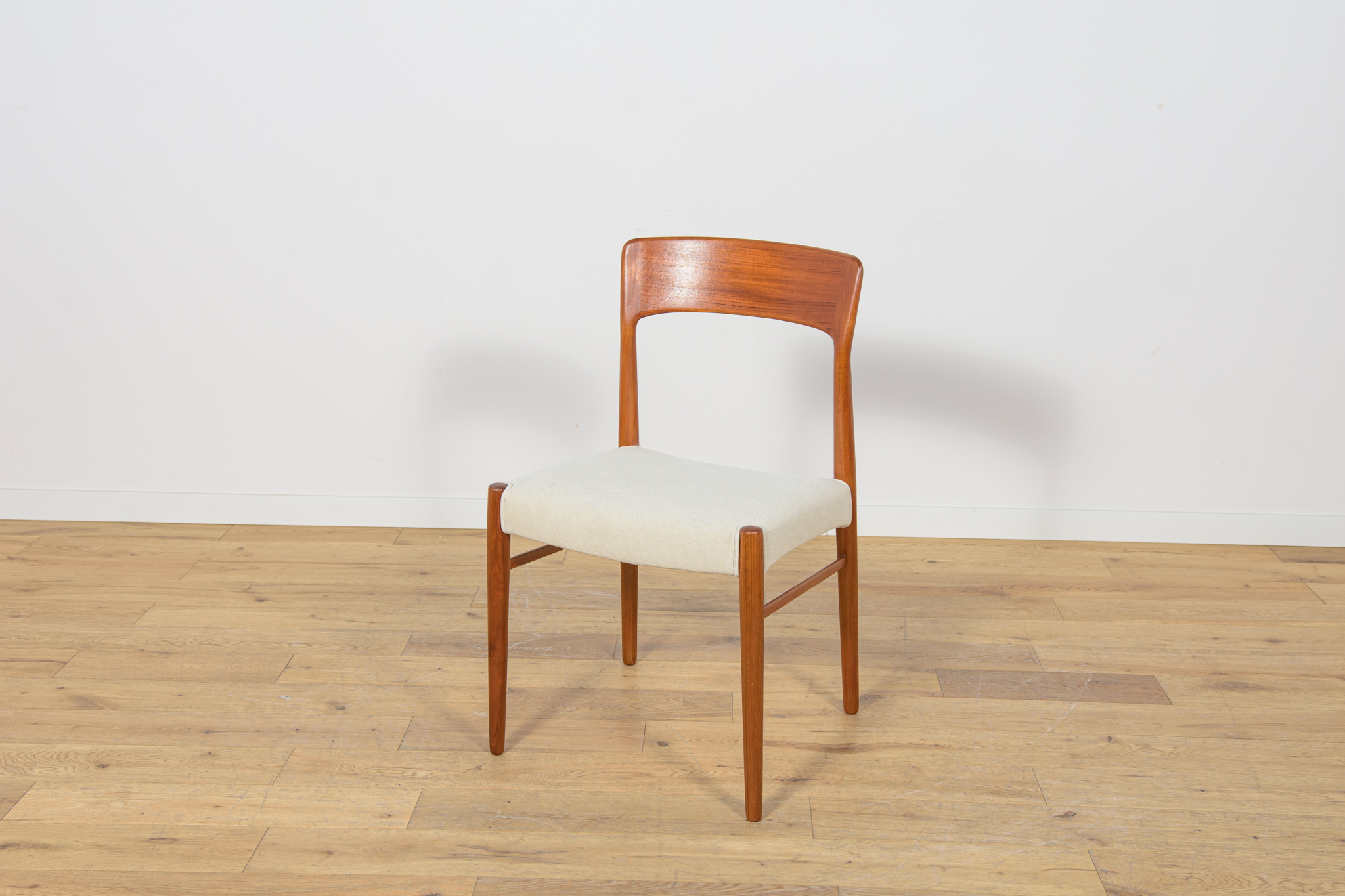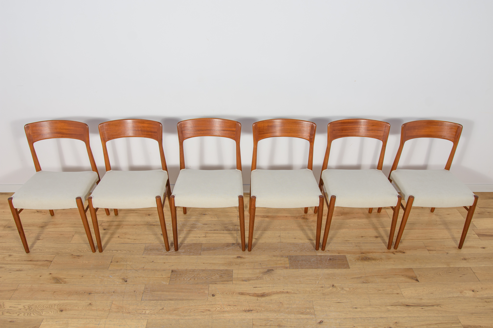 A set of six chairs designed by Henry Kjærnulf for the Danish manufacturer Korup Stolefabrik. The contoured frame combines Danish design with the highest craftsmanship. The frame is made of teak, cleaned from the old surface and finished with high-quality Danish oil. The interior upholstery has been replaced and upholstered in a high-quality cream fabric.
