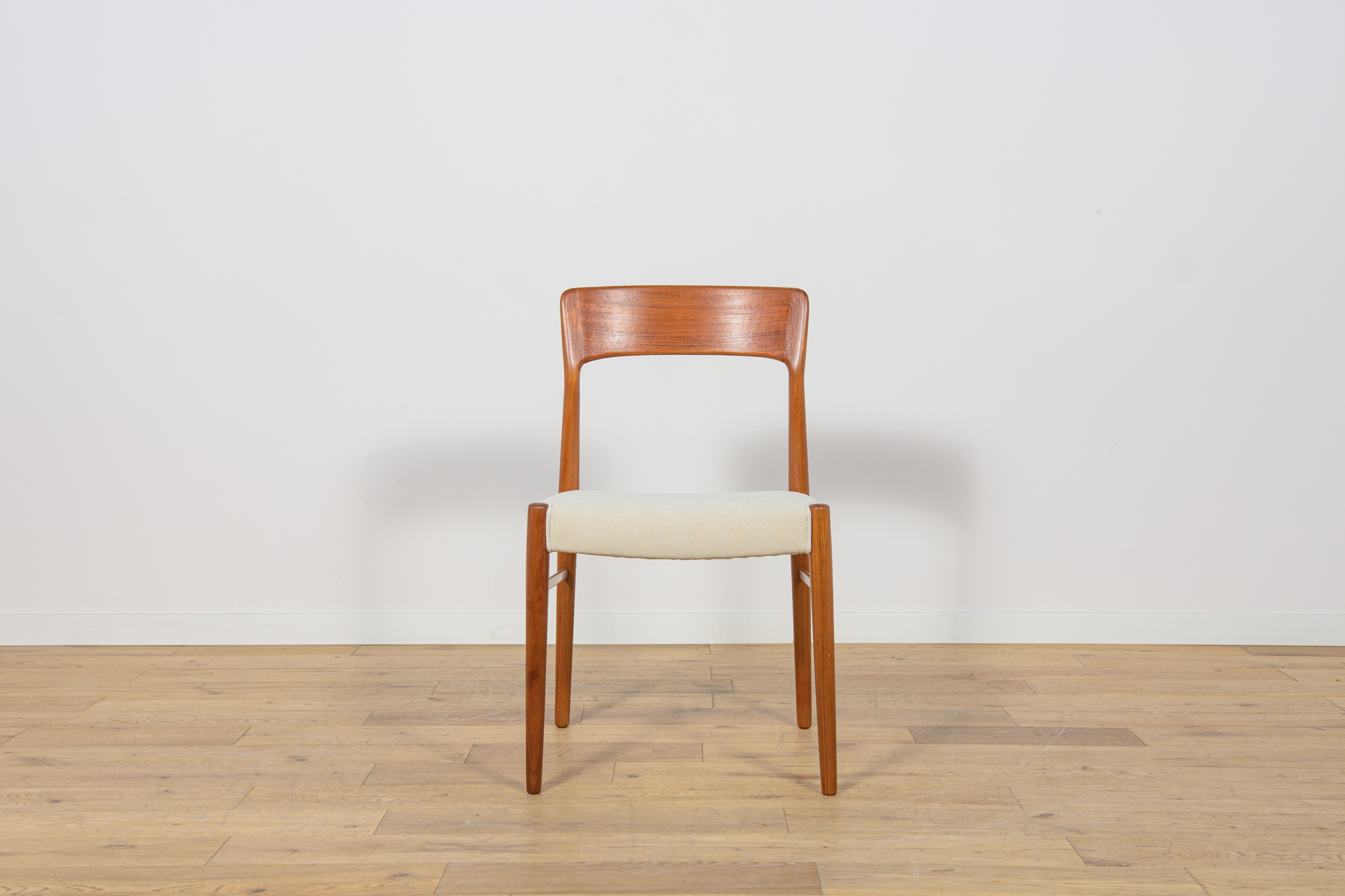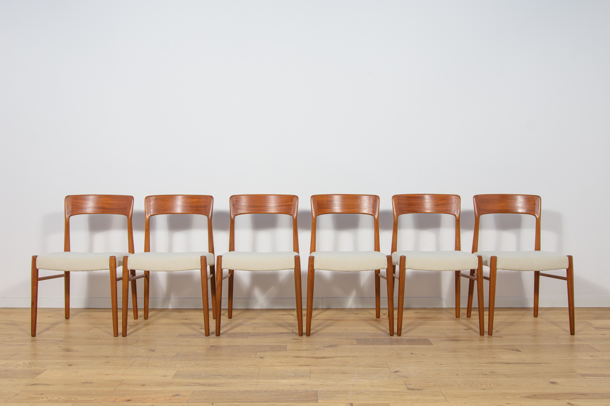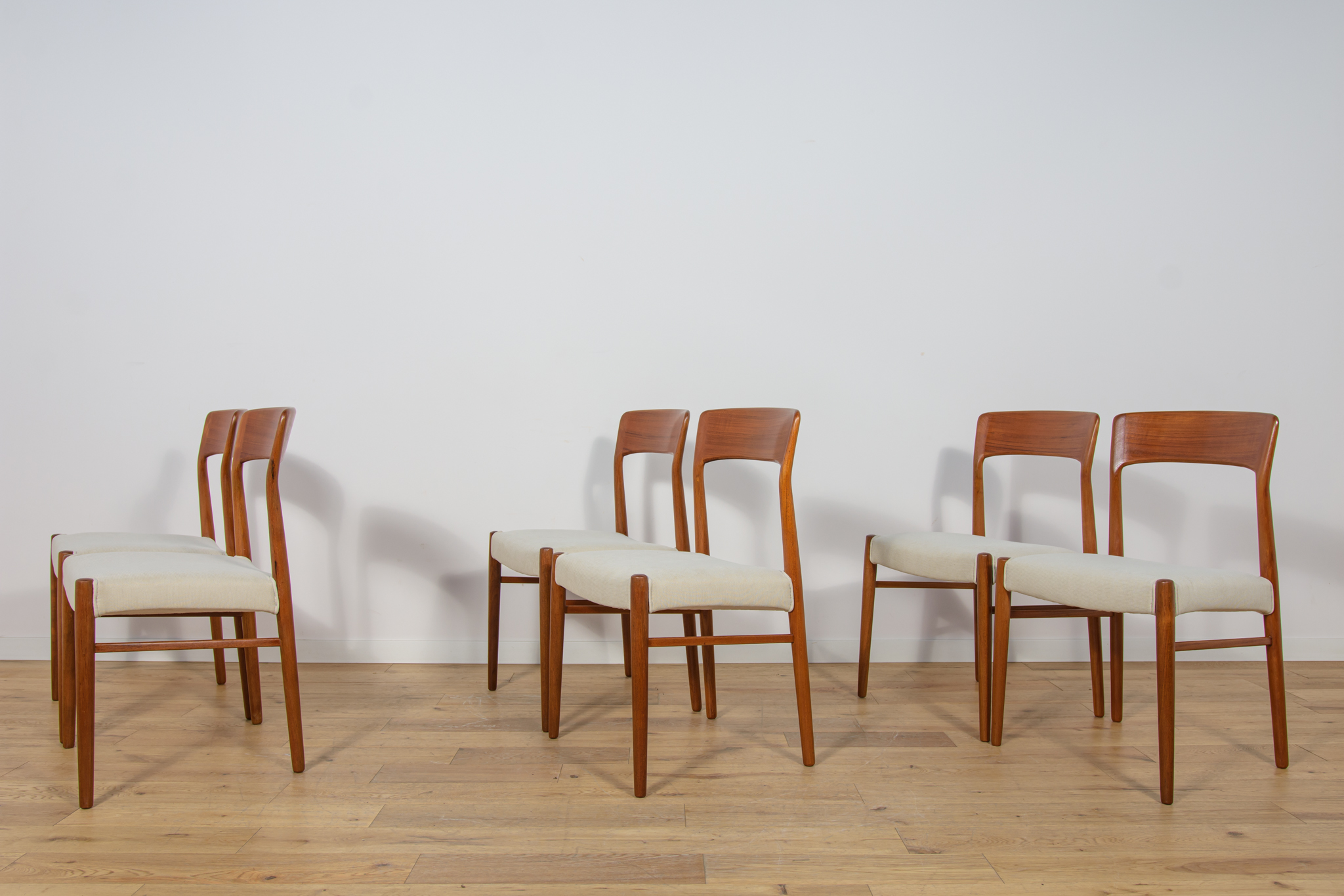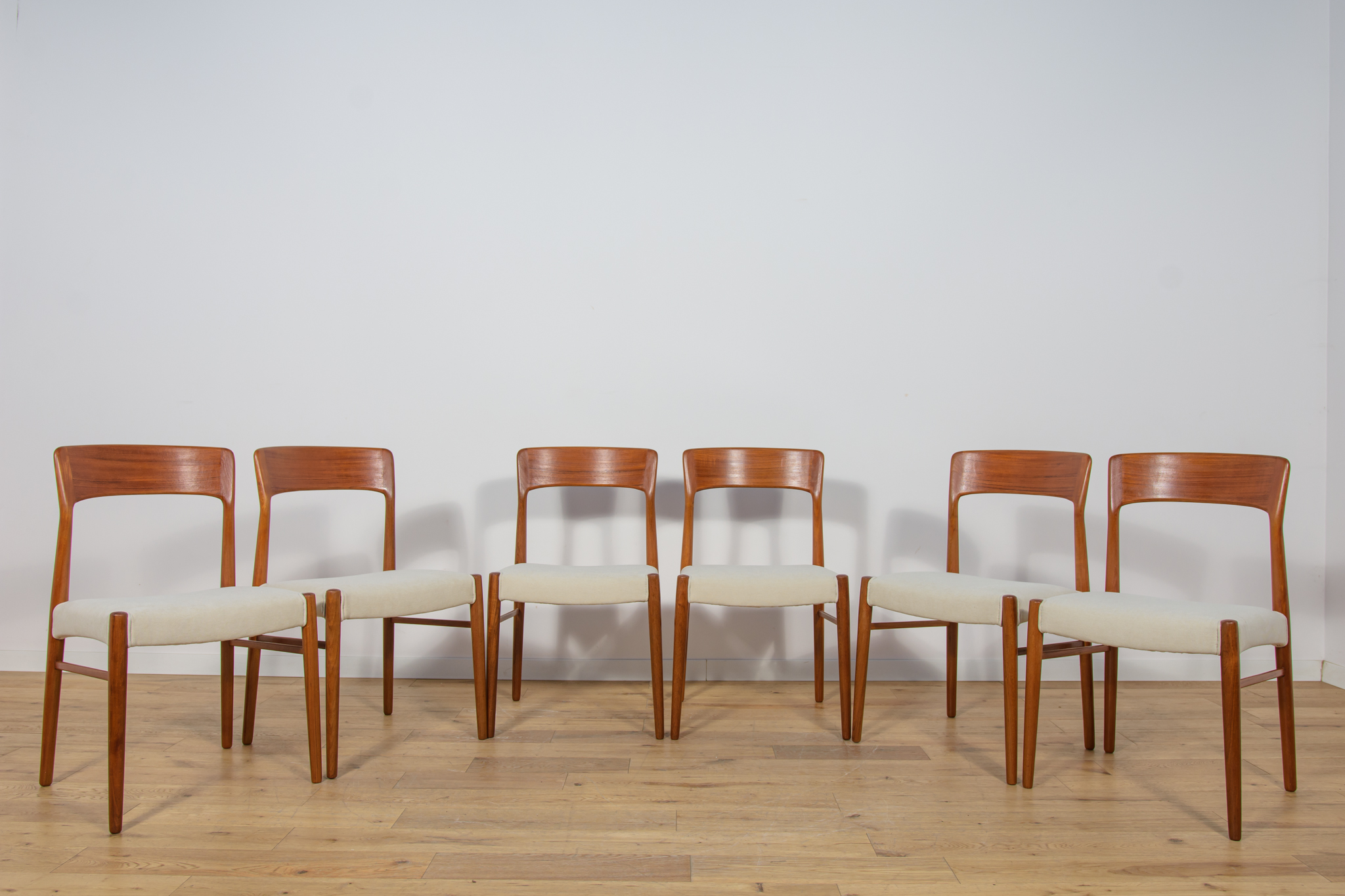 A set of six chairs designed by Henry Kjærnulf for the Danish manufacturer Korup Stolefabrik. The contoured frame combines Danish design with the highest craftsmanship. The frame is made of teak, cleaned from the old surface and finished with high-quality Danish oil. The interior upholstery has been replaced and upholstered in a high-quality cream fabric.