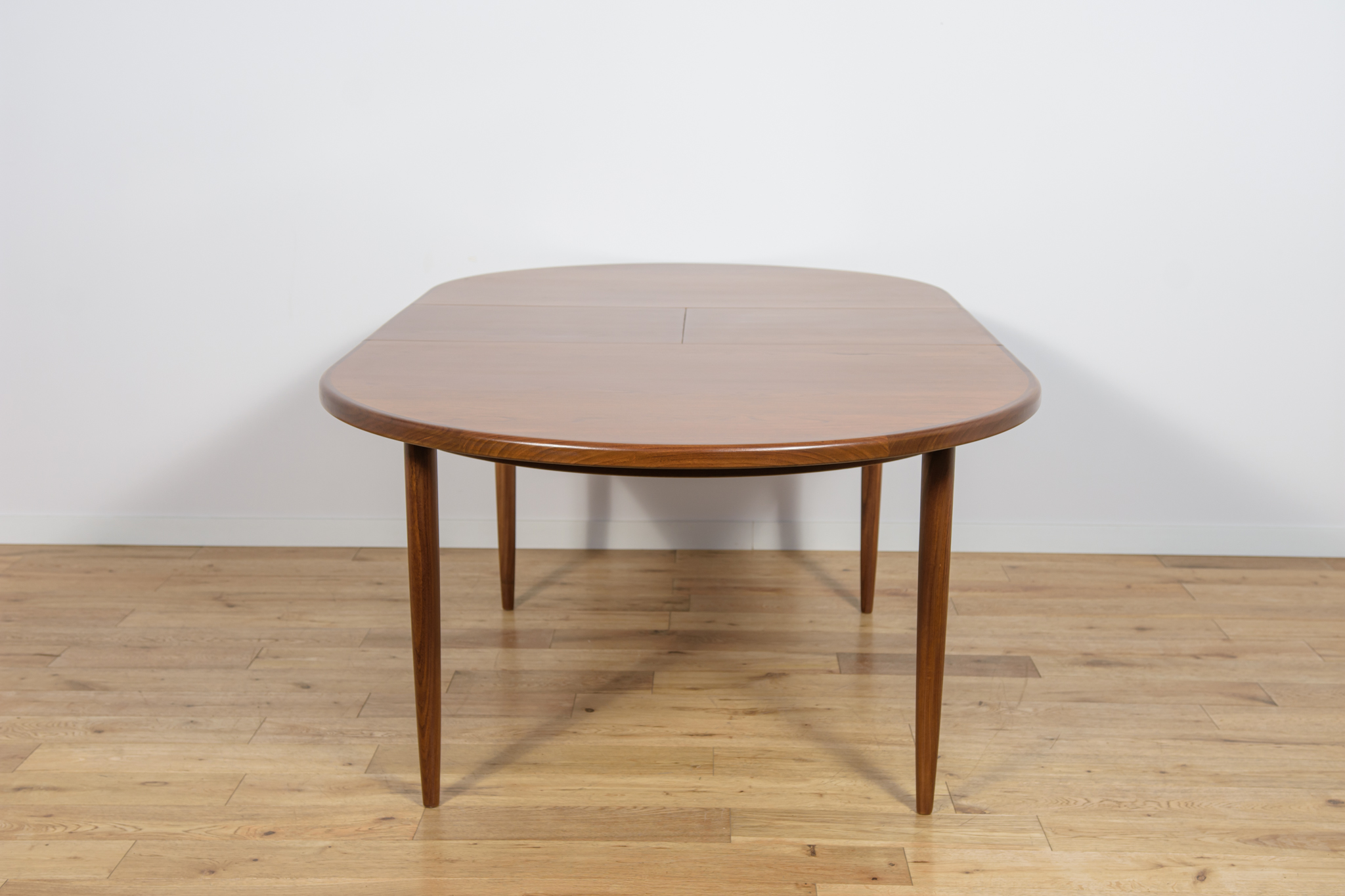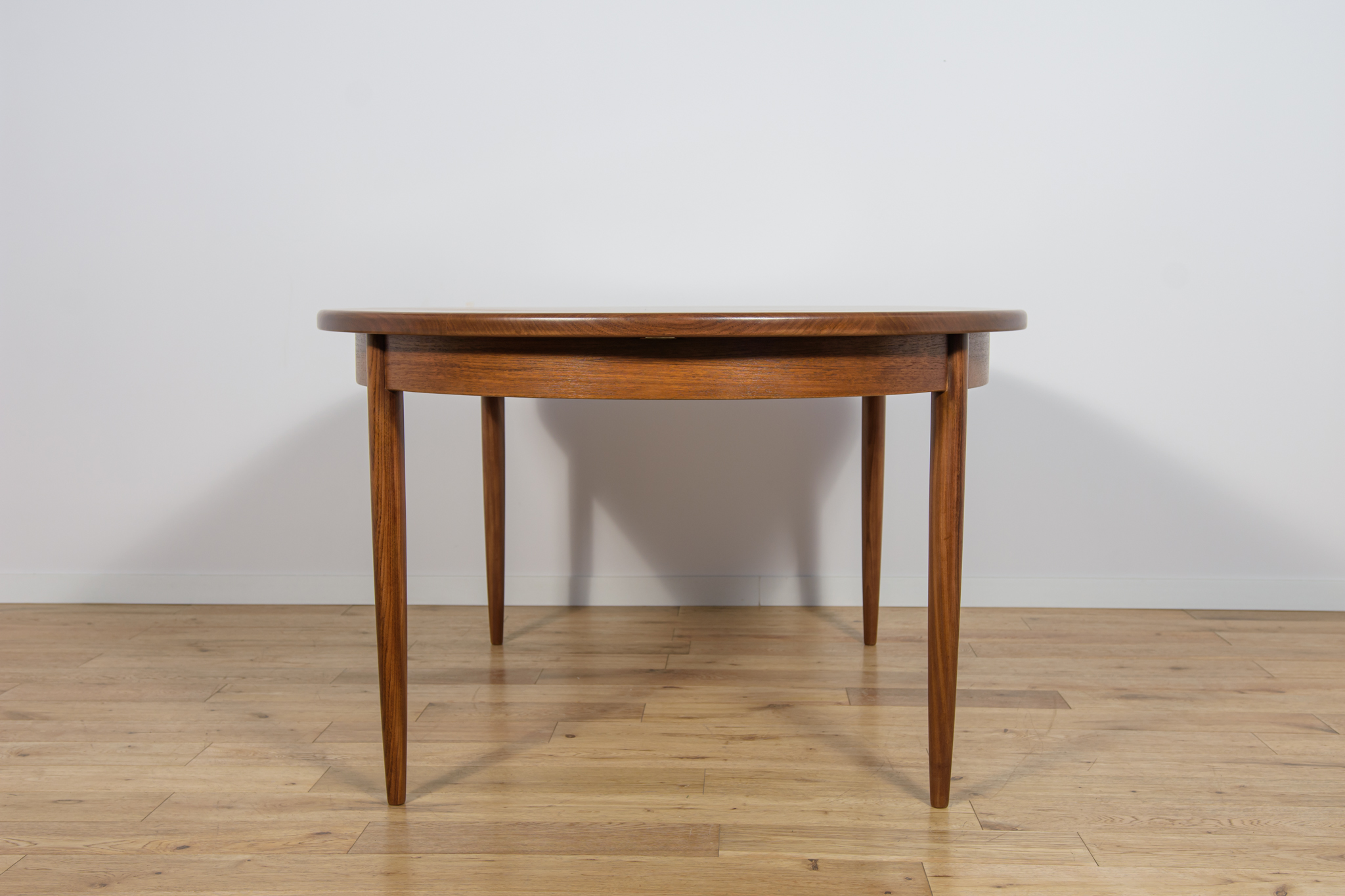 This is an oval-shaped teak dining table manufactured by G-Plan in the 1960s. The table has reinforced edges of the top. The teak elements have been cleaned old surface and painted oak stain and finished with a strong semi-matt varnish. The table has a mechanism to facilitate unfolding. The table measures 209 cm long when fully extended.