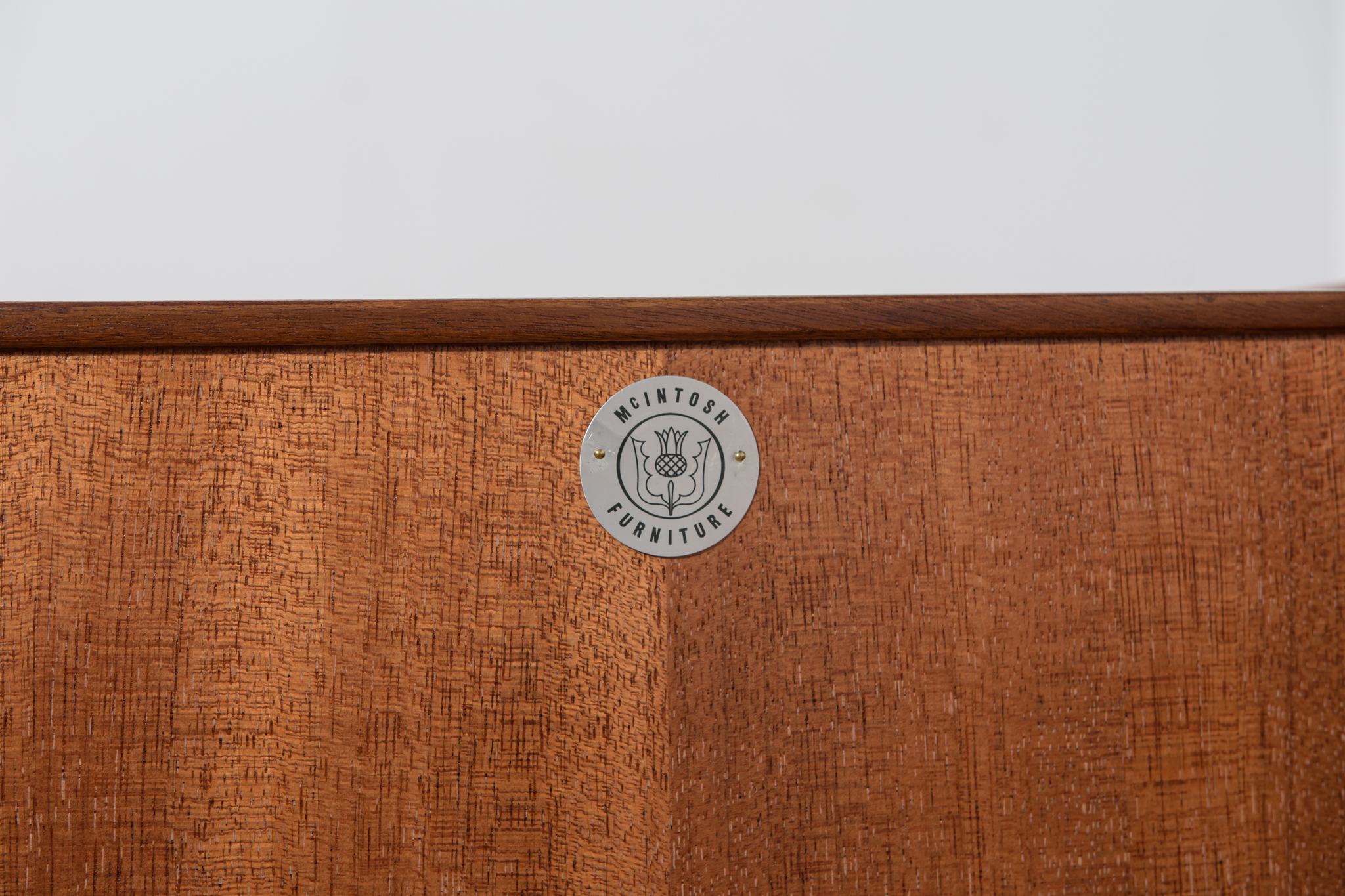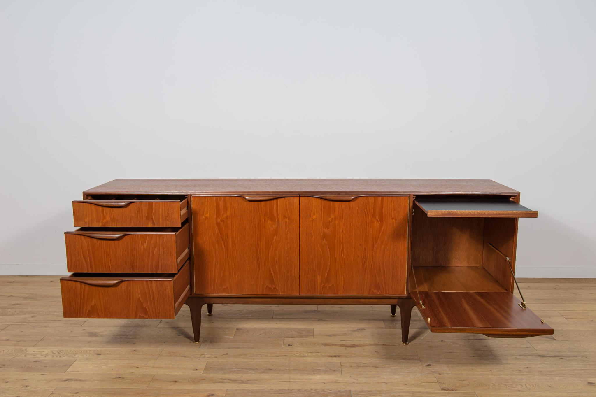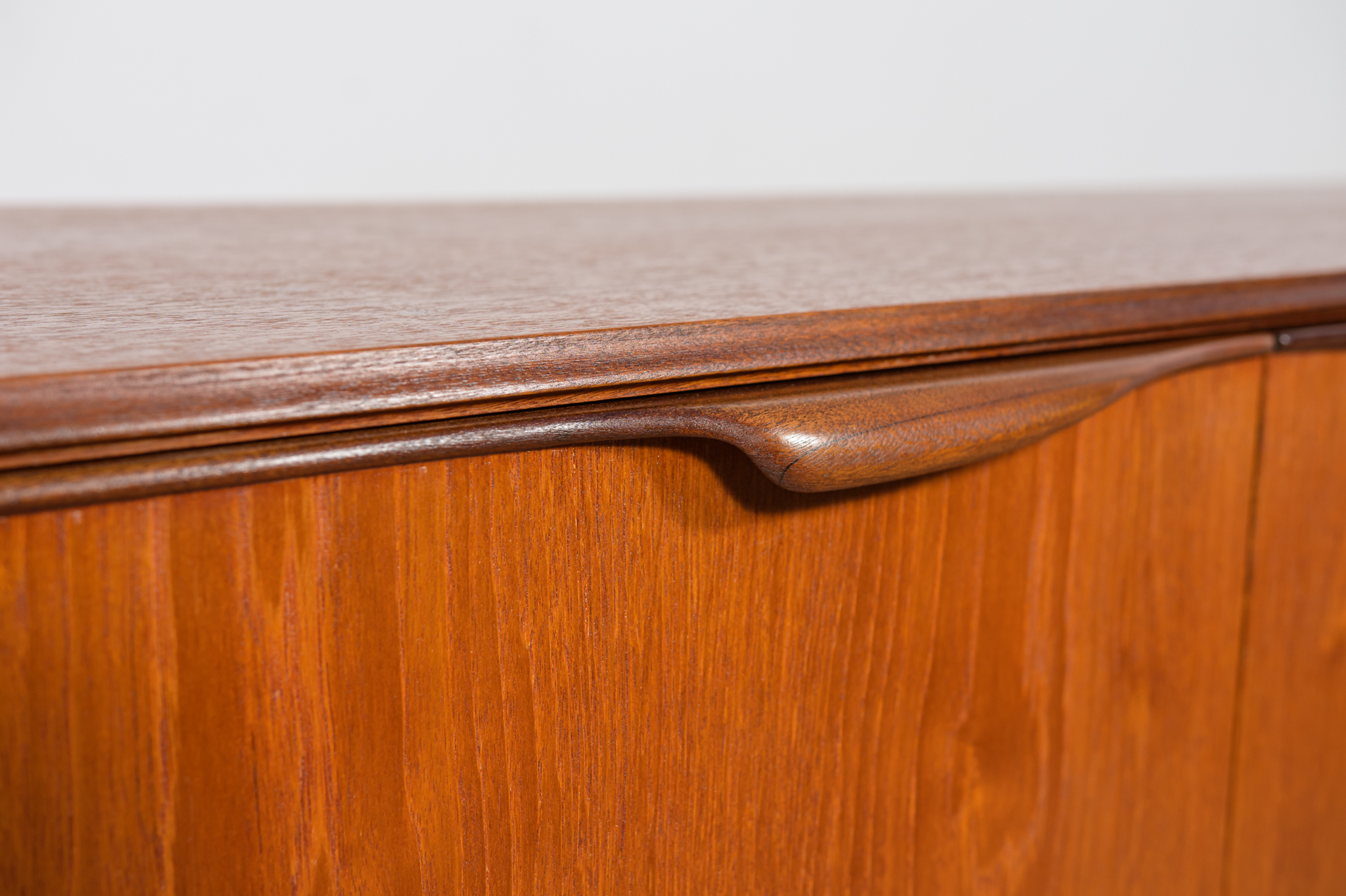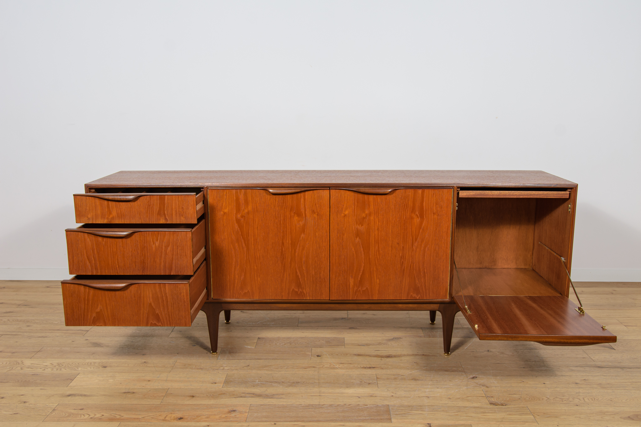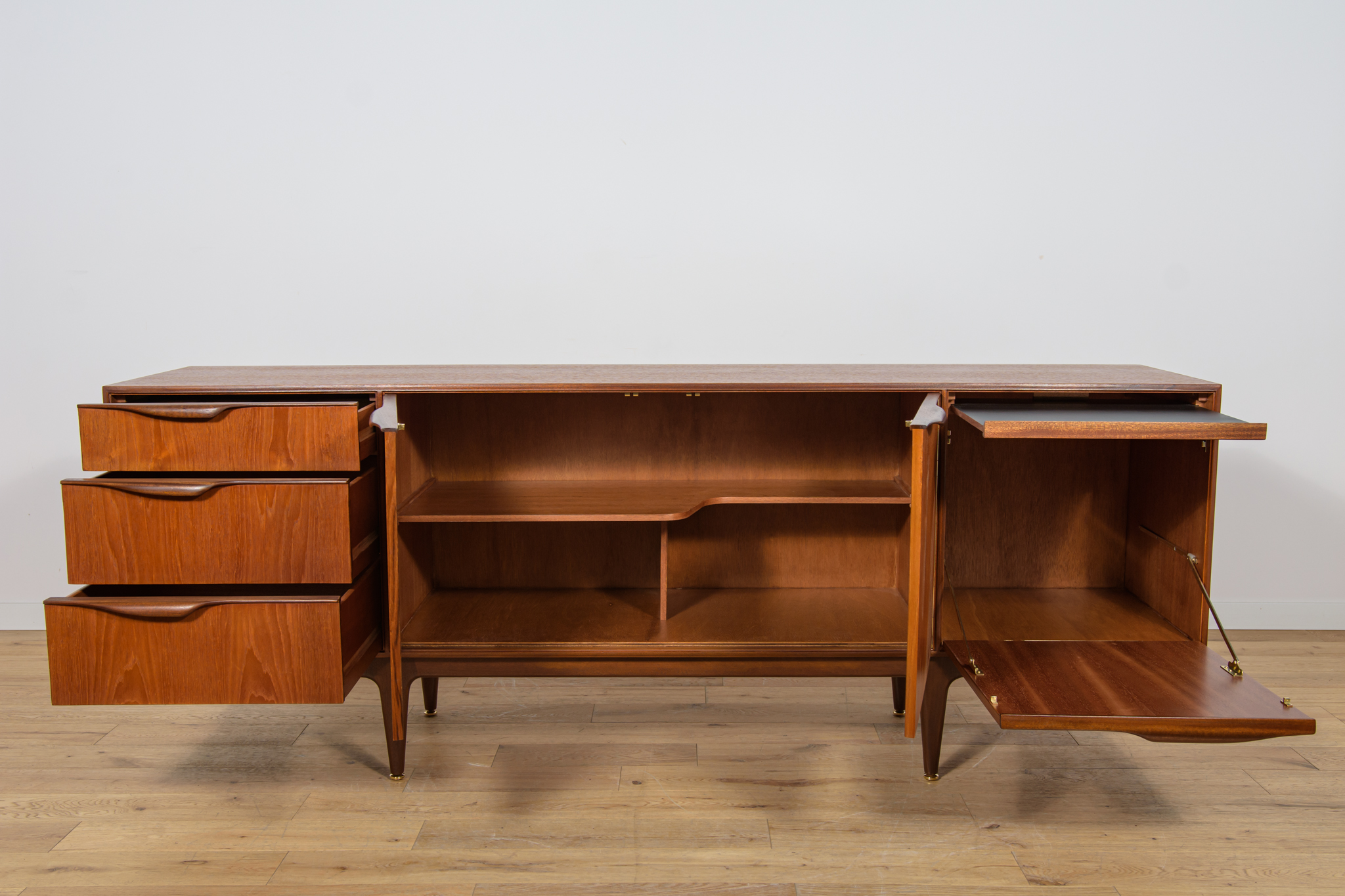This mid-century sideboard in teak was produced in Great Britain, designed Tom Robertson to Mcintosh in the 1960s. The sideboard has three drawers and a cabinet, on the right side there is a bar and a pull-out top. Sideboard made of teak wood with profiled handles. The teak elements have been cleaned from the old surface, painted oak stain and finished with semi matt varnish.
