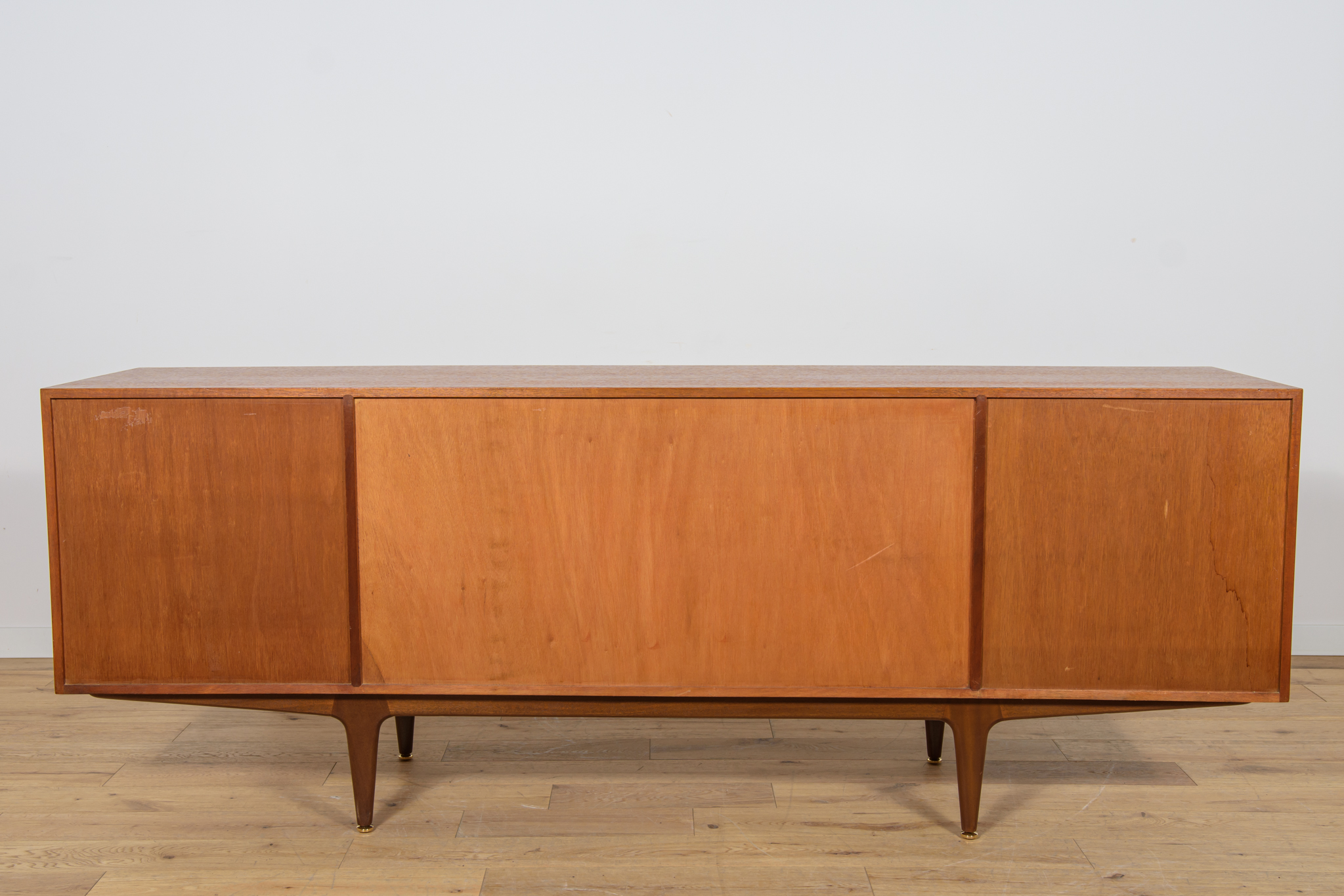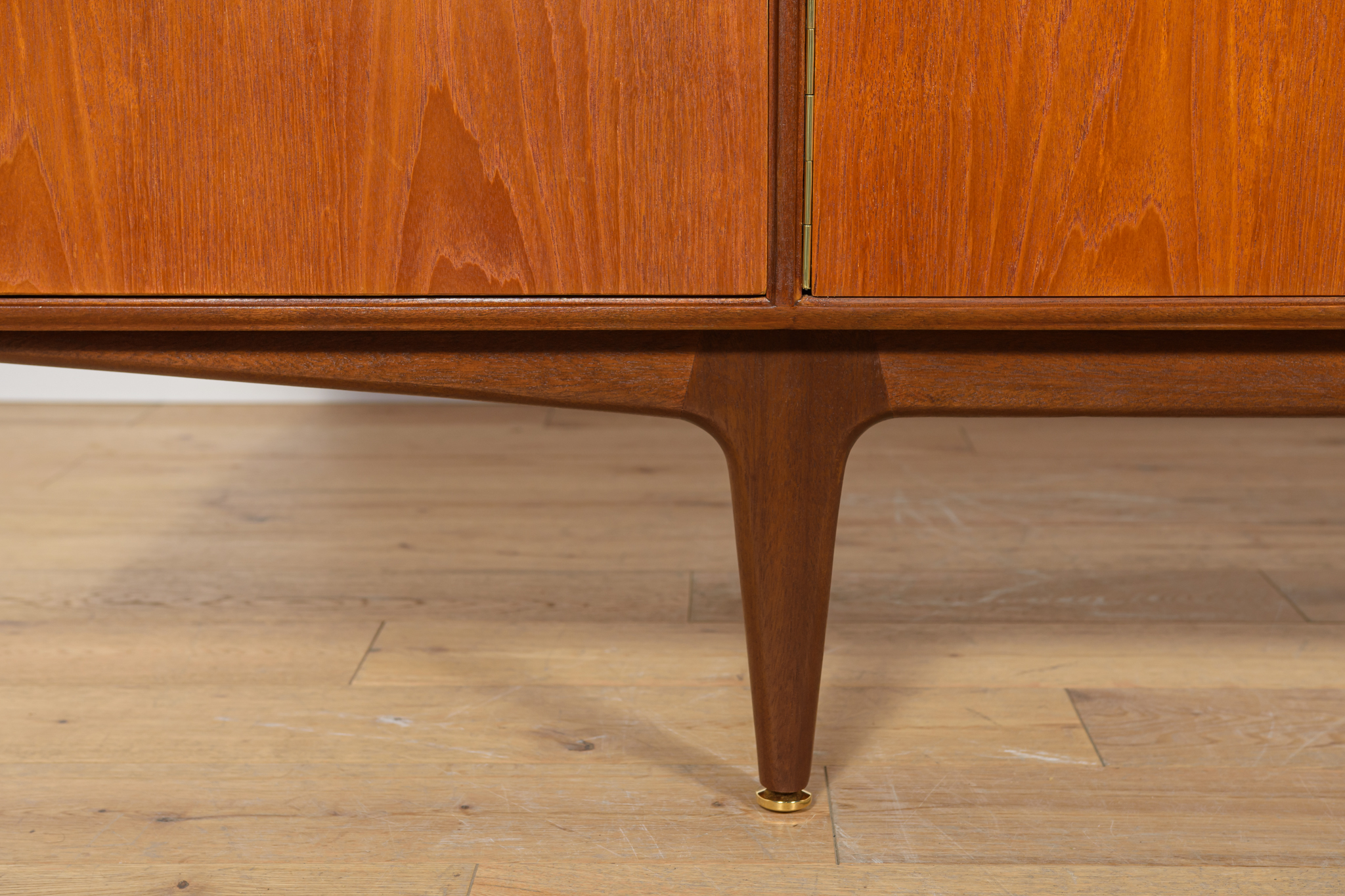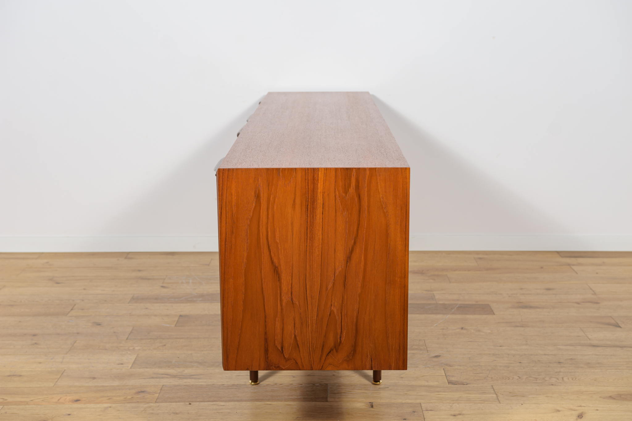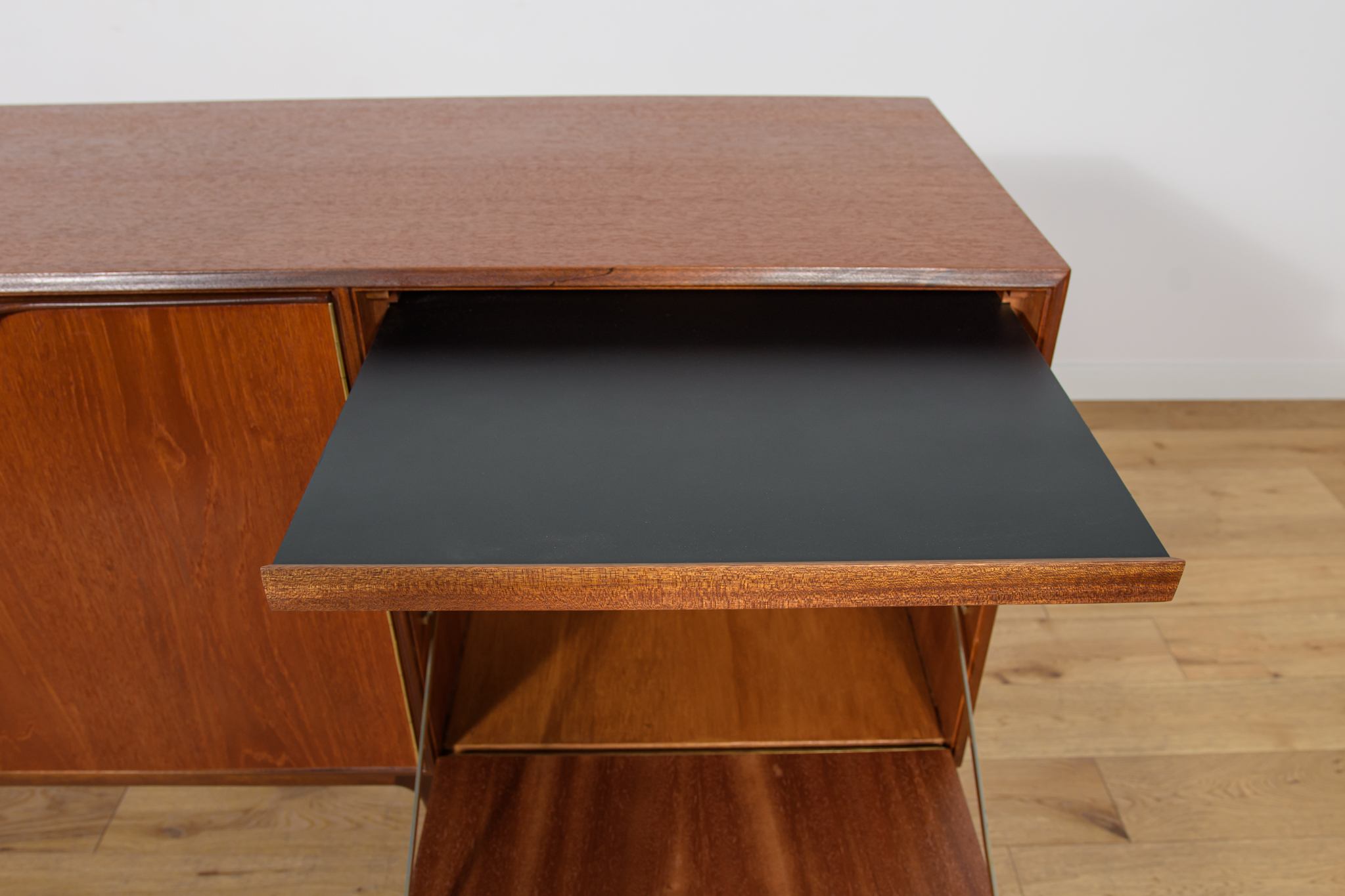 This mid-century sideboard in teak was produced in Great Britain, designed Tom Robertson to Mcintosh in the 1960s. The sideboard has three drawers and a cabinet, on the right side there is a bar and a pull-out top. Sideboard made of teak wood with profiled handles. The teak elements have been cleaned from the old surface, painted oak stain and finished with semi matt varnish.