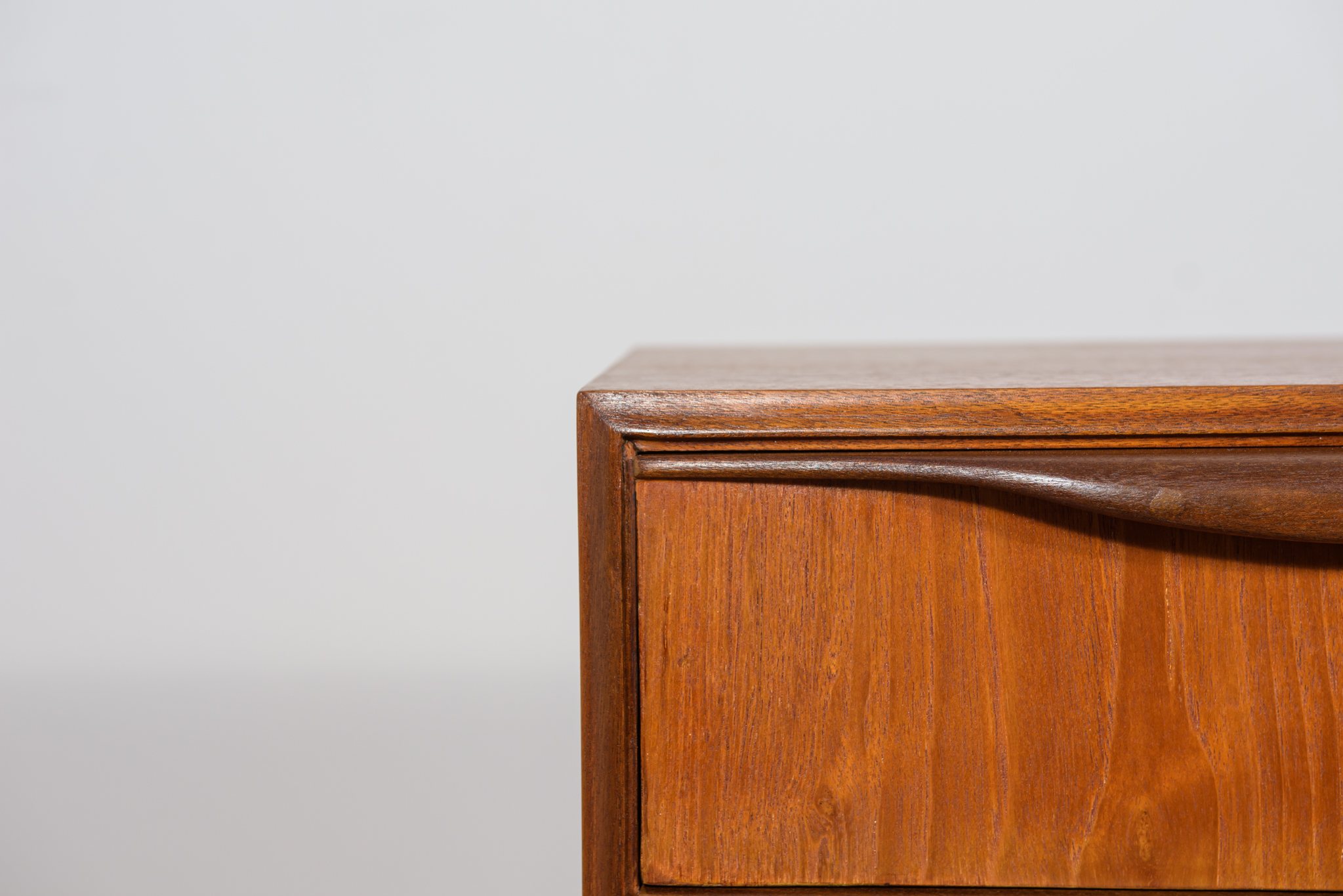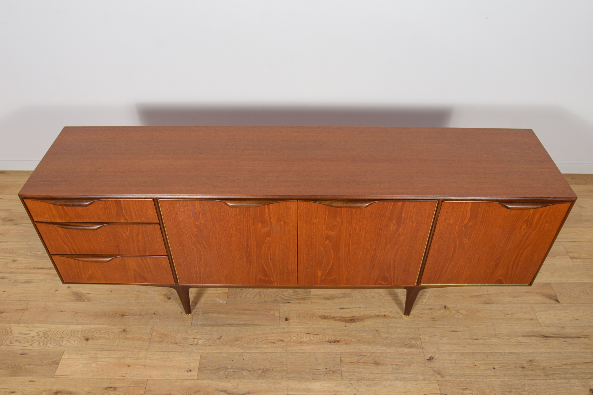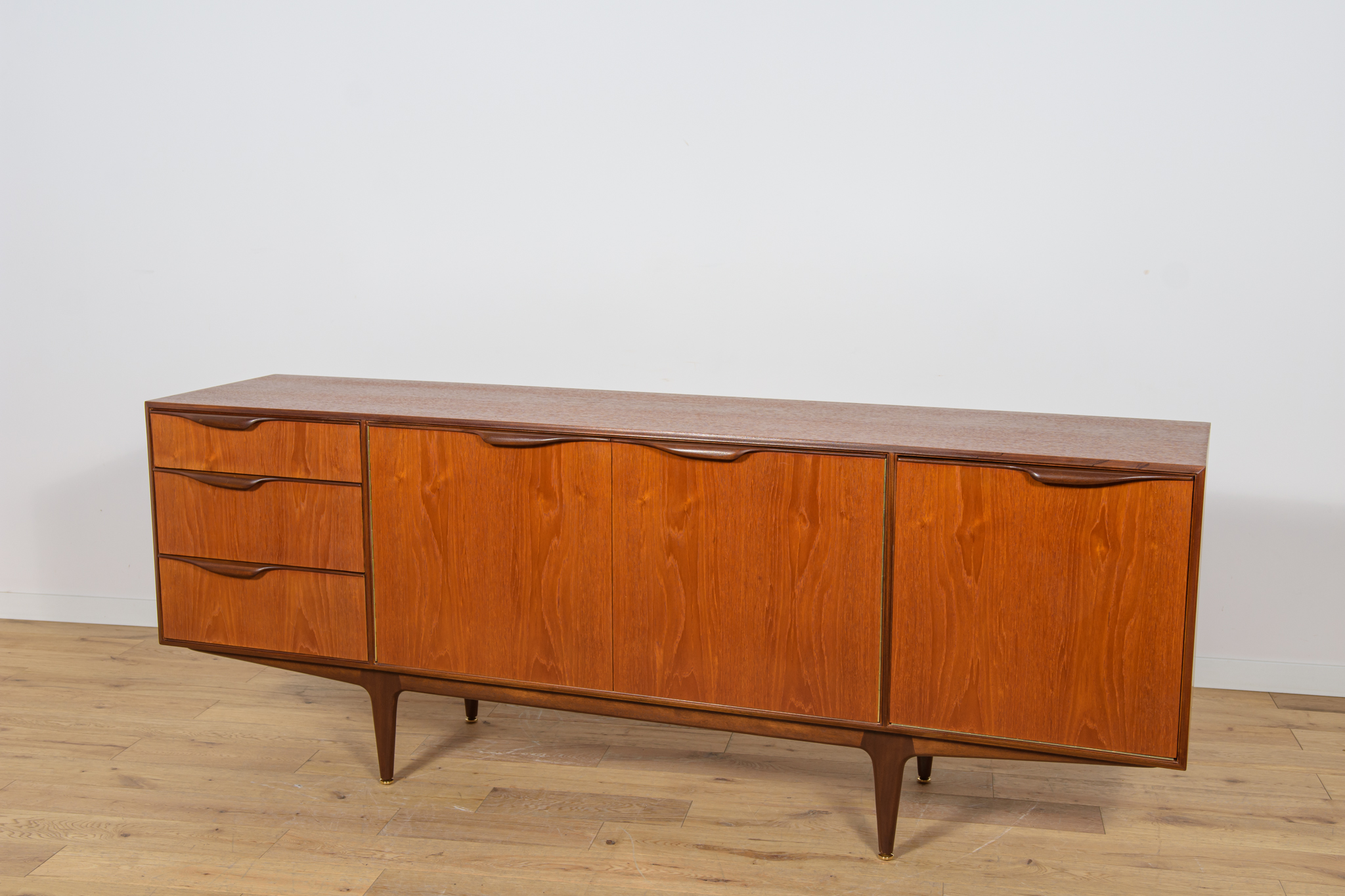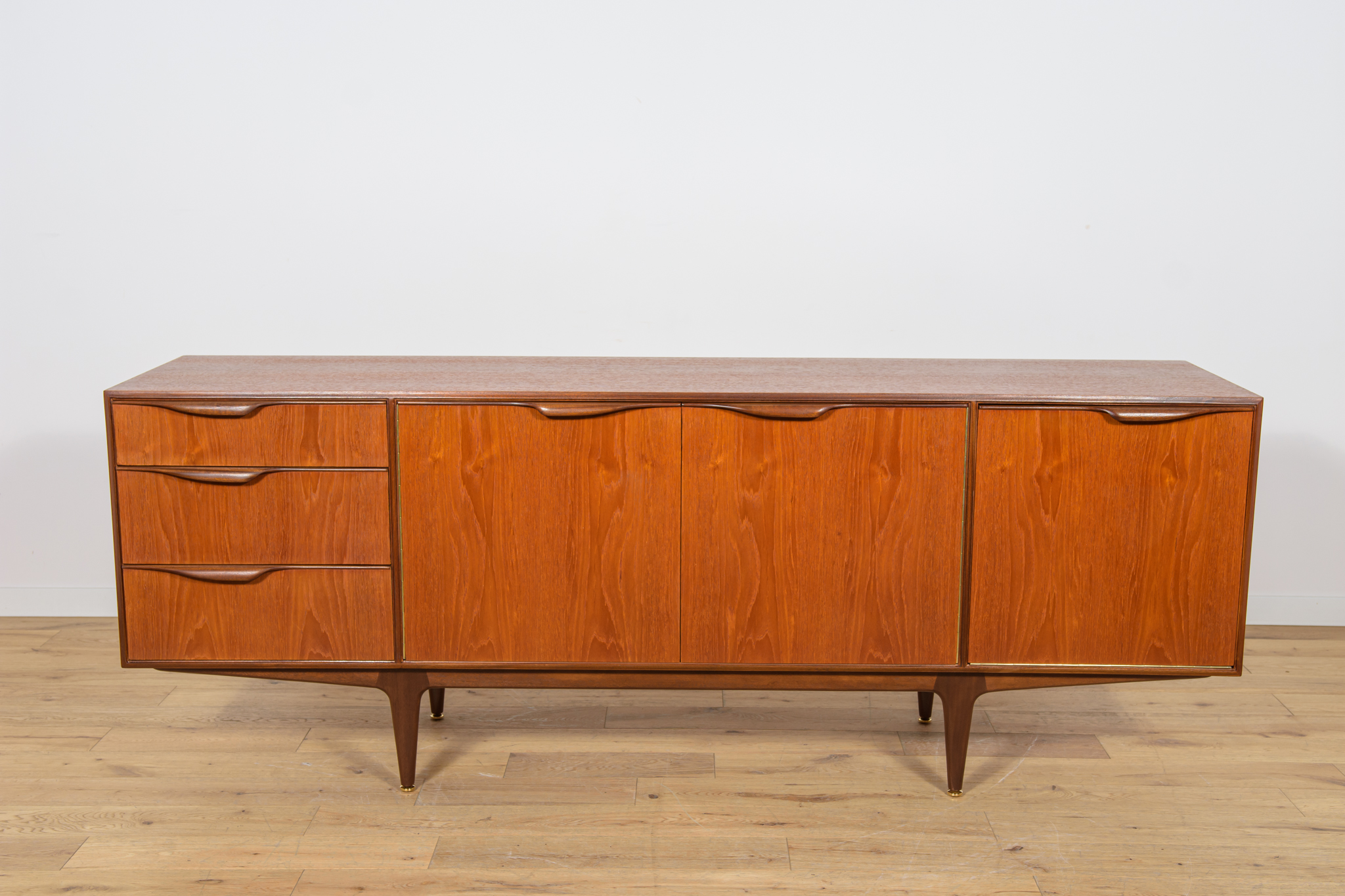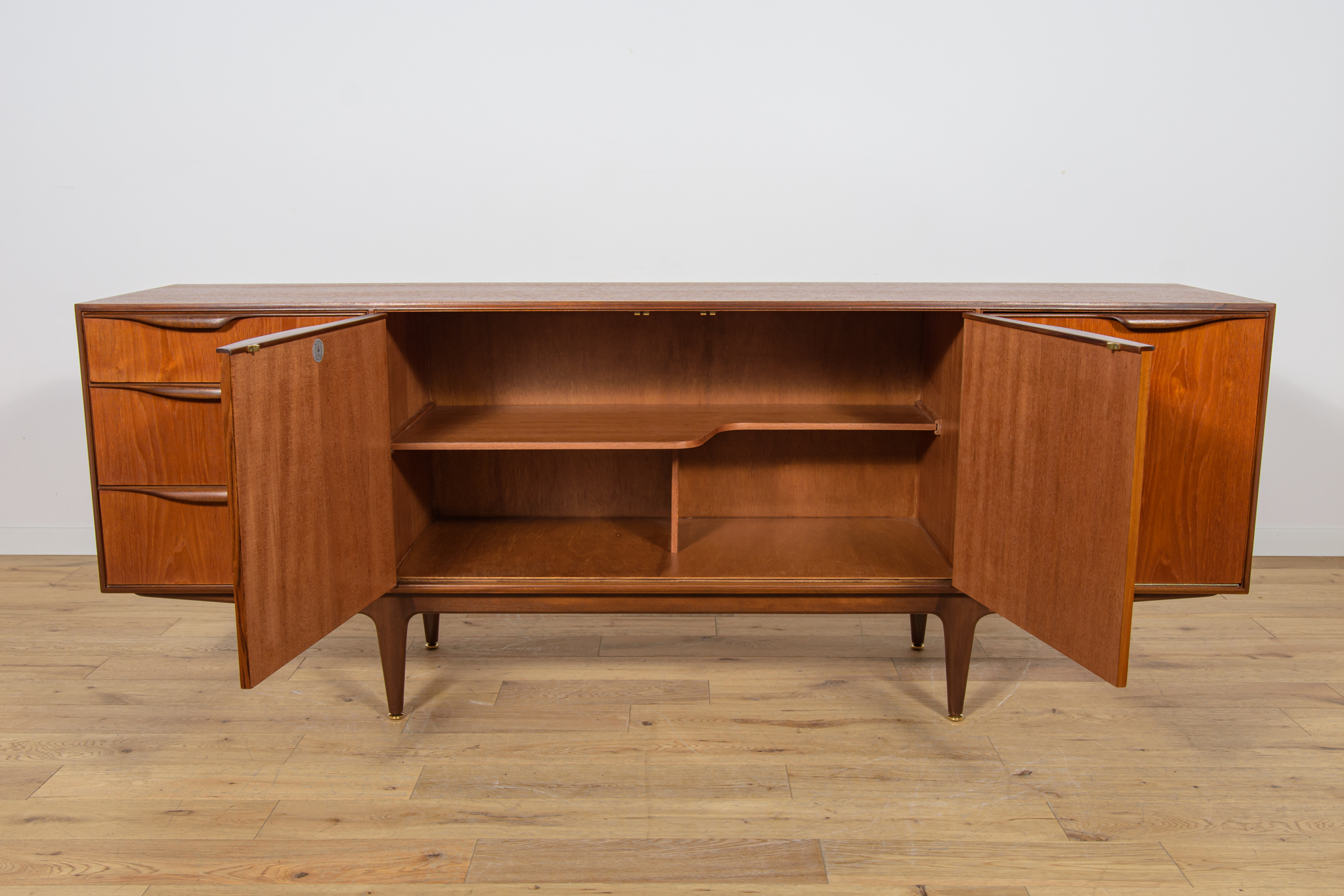 This mid-century sideboard in teak was produced in Great Britain, designed Tom Robertson to Mcintosh in the 1960s. The sideboard has three drawers and a cabinet, on the right side there is a bar and a pull-out top. Sideboard made of teak wood with profiled handles. The teak elements have been cleaned from the old surface, painted oak stain and finished with semi matt varnish.
