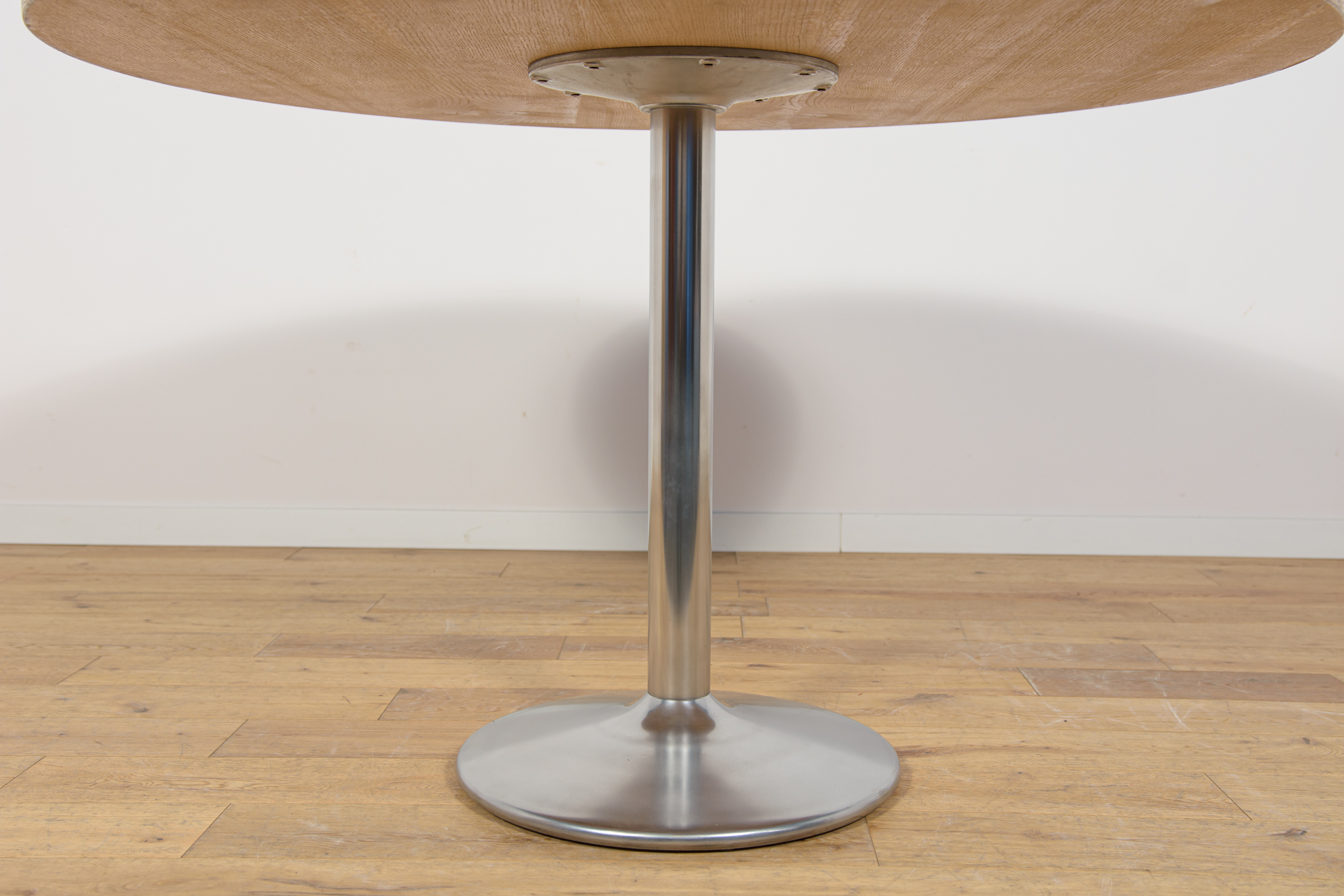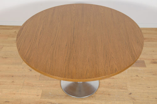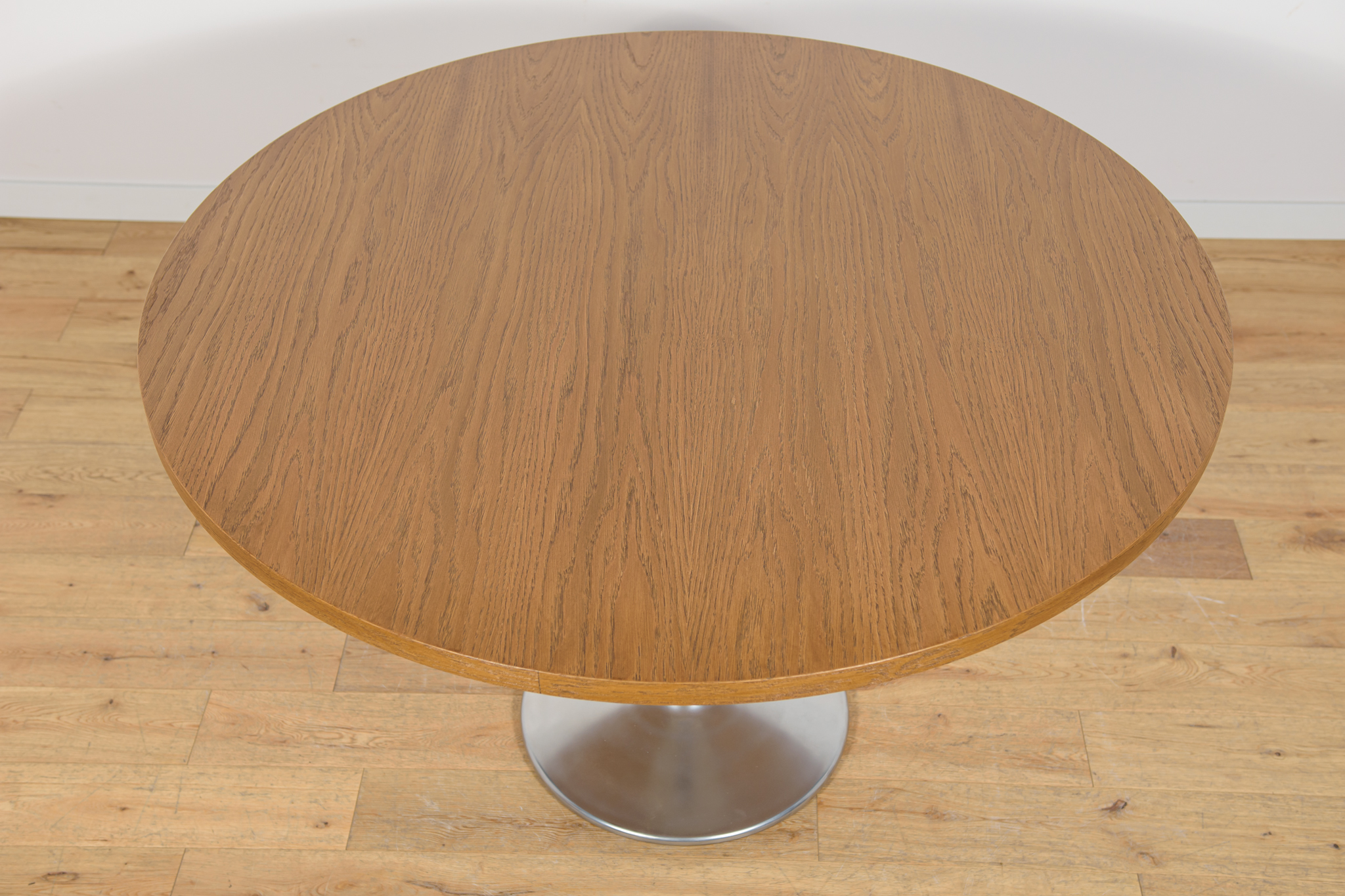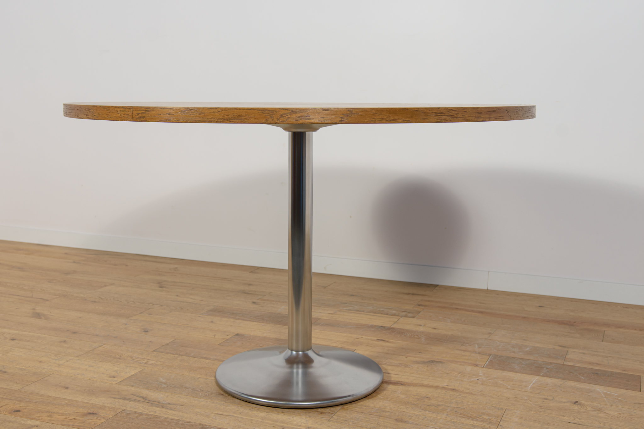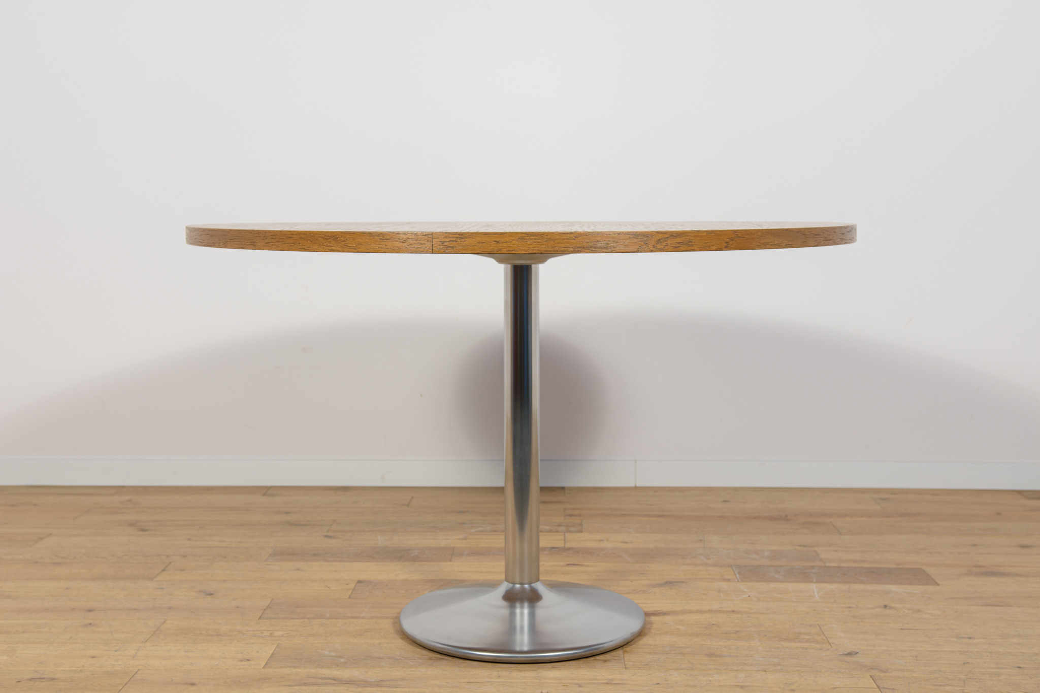 The table was produced in Denmark in the 1970s. Table top made of oak. The furniture is after a comprehensive carpentry renovation, cleaned of the old coating, painted oak stain, finished very quality danish oil. The table base is made of aluminum has been cleaned and polished.