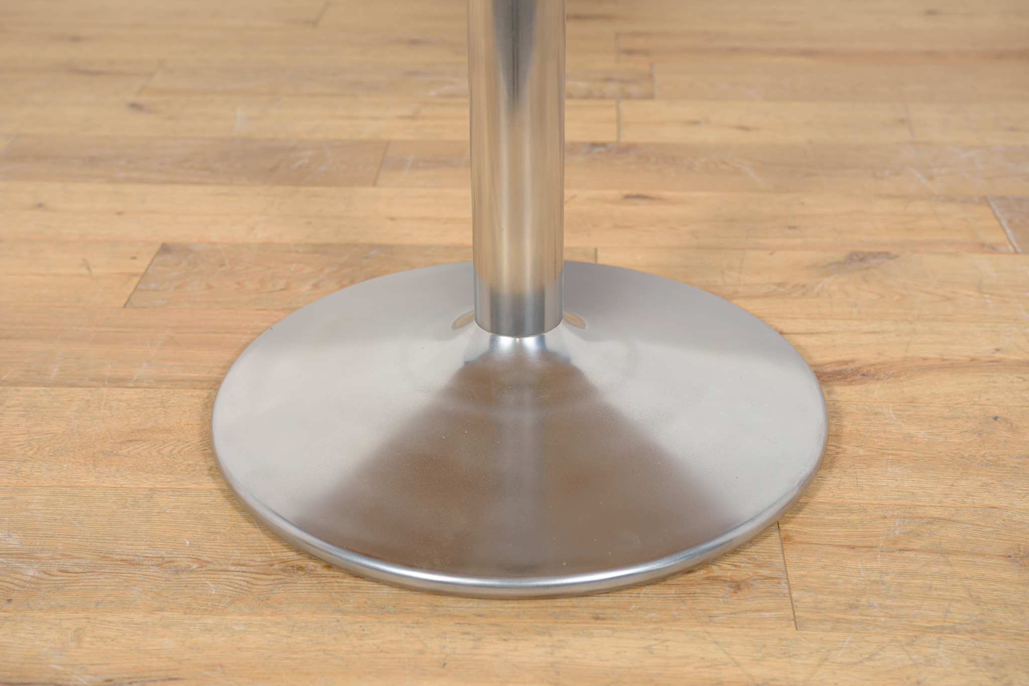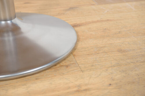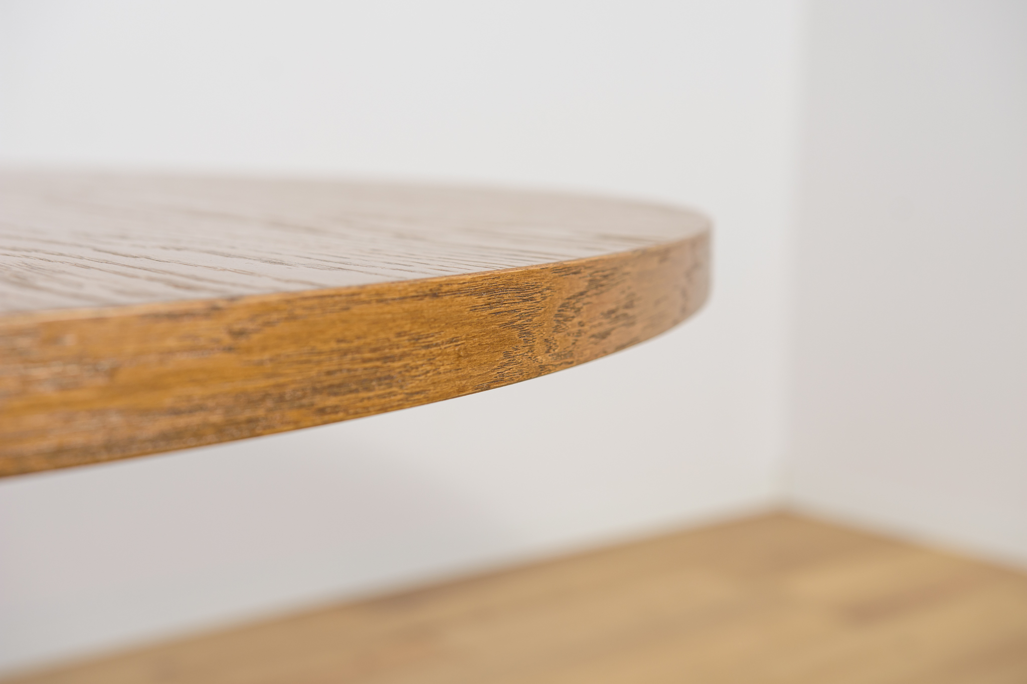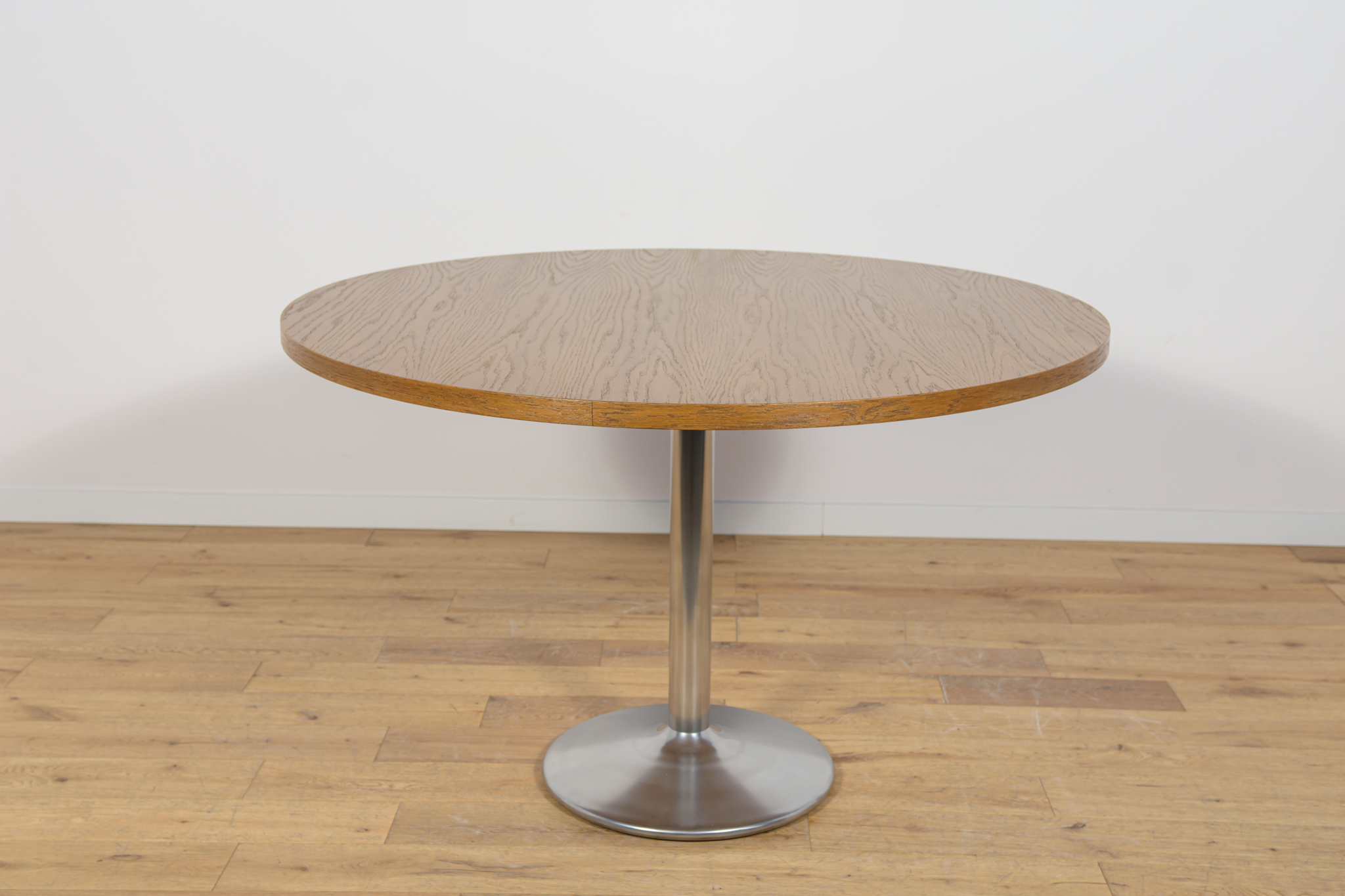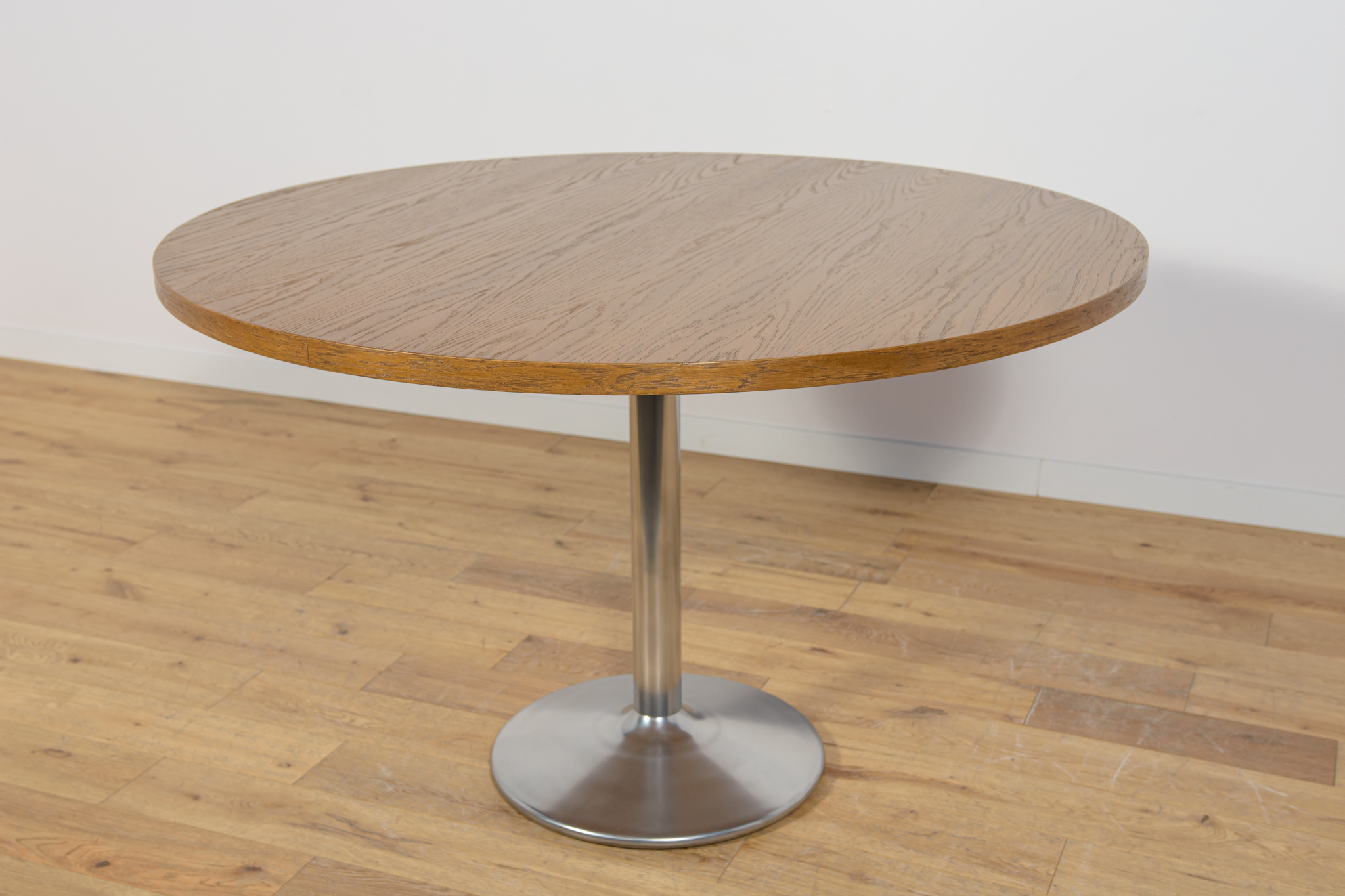 The table was produced in Denmark in the 1970s. Table top made of oak. The furniture is after a comprehensive carpentry renovation, cleaned of the old coating, painted oak stain, finished very quality danish oil. The table base is made of aluminum has been cleaned and polished.