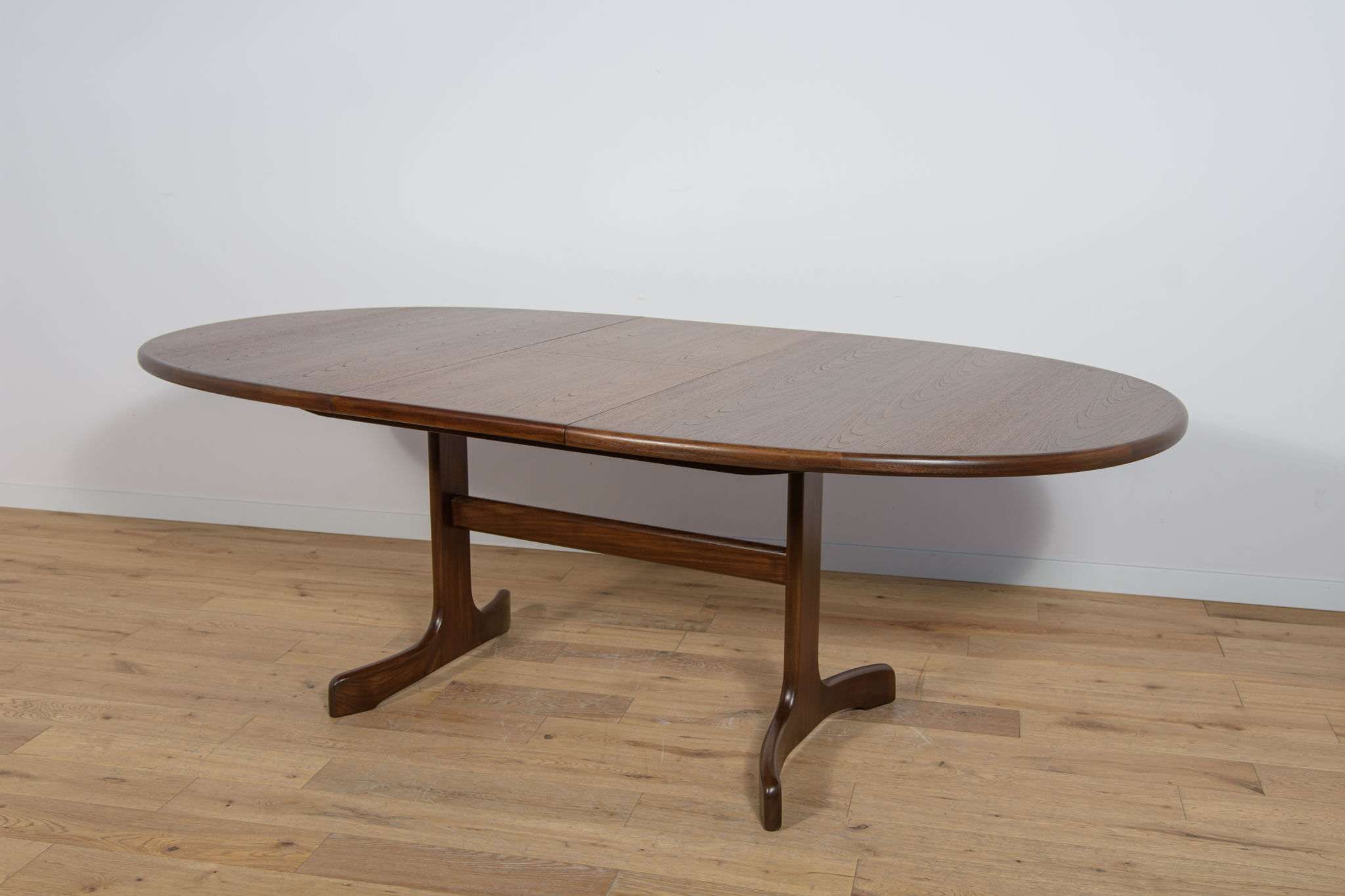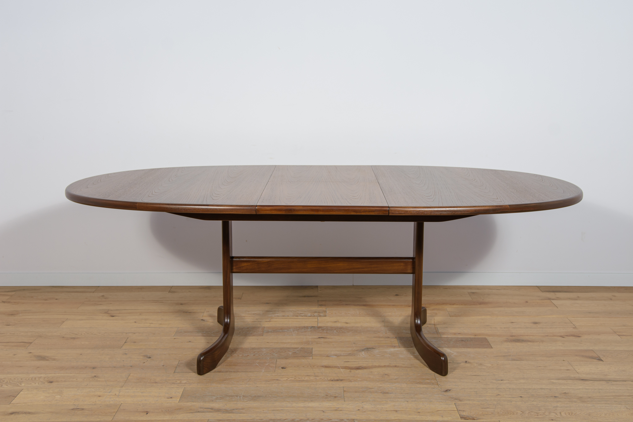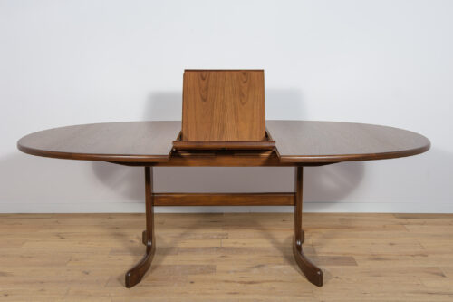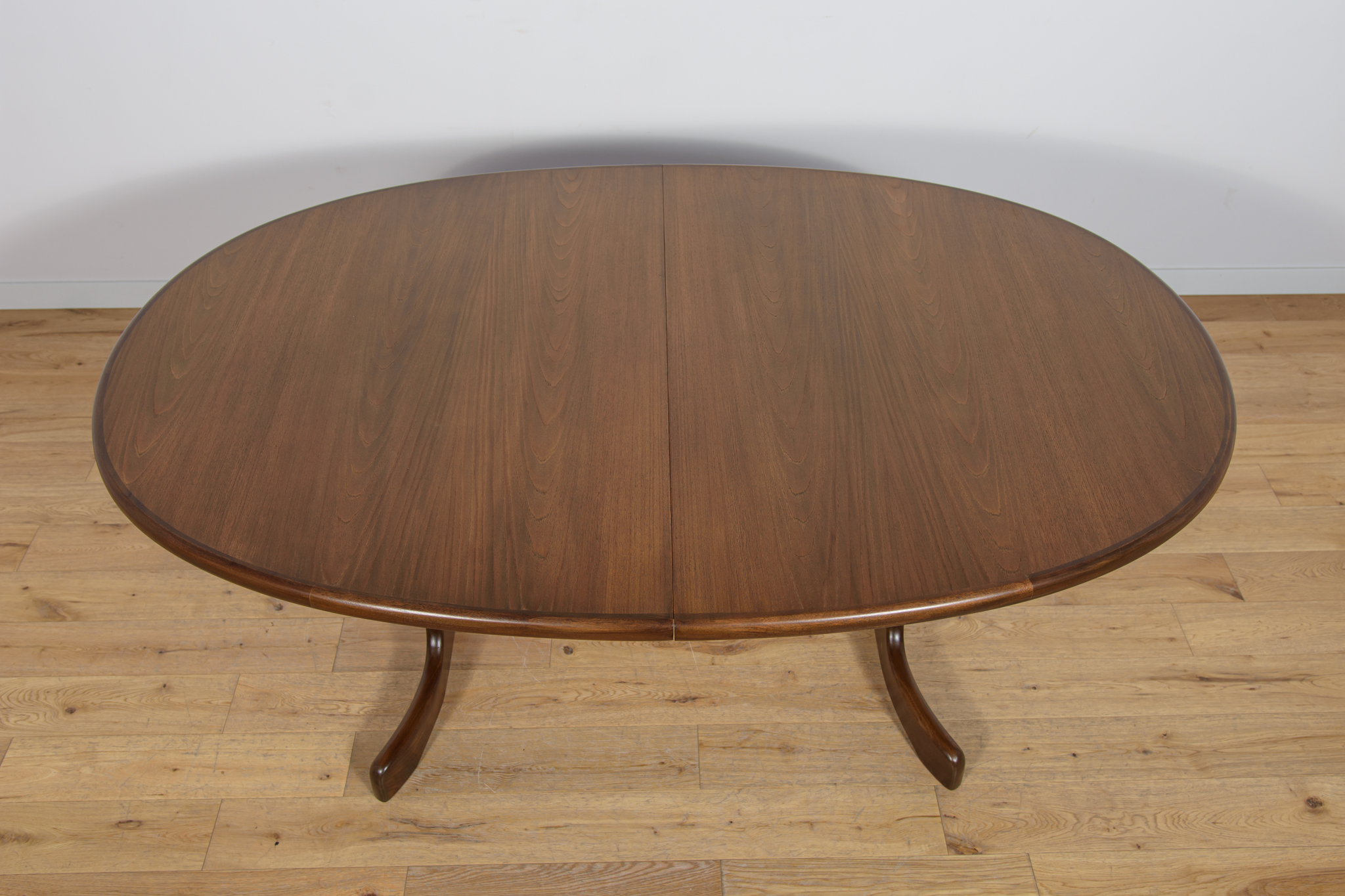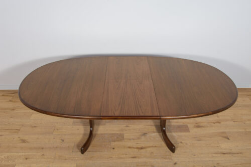 This is an oval-shaped teak dining table manufactured by G-Plan in the 1960s. The dining table after a comprehensive carpentry renovation. The teak elements have been cleaned of the old surface and painted with an rosewood stain and finished with a strong semi-matt varnish. The dining table has a mechanism that facilitates unfolding. The table measures 208 cm long when fully extended.