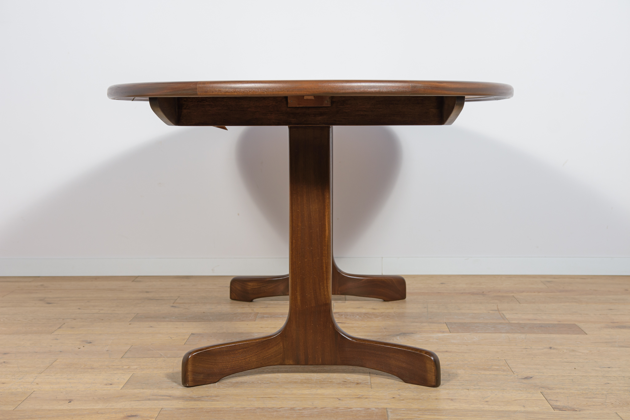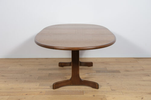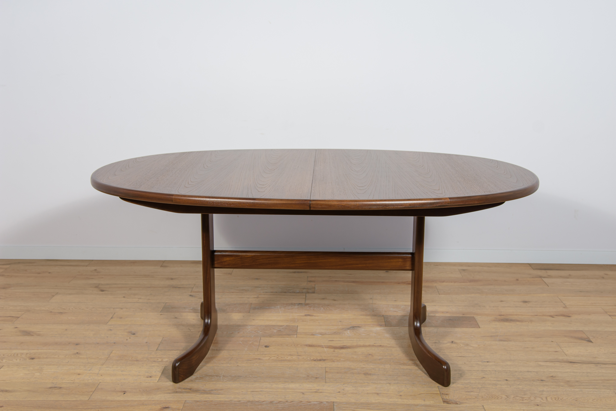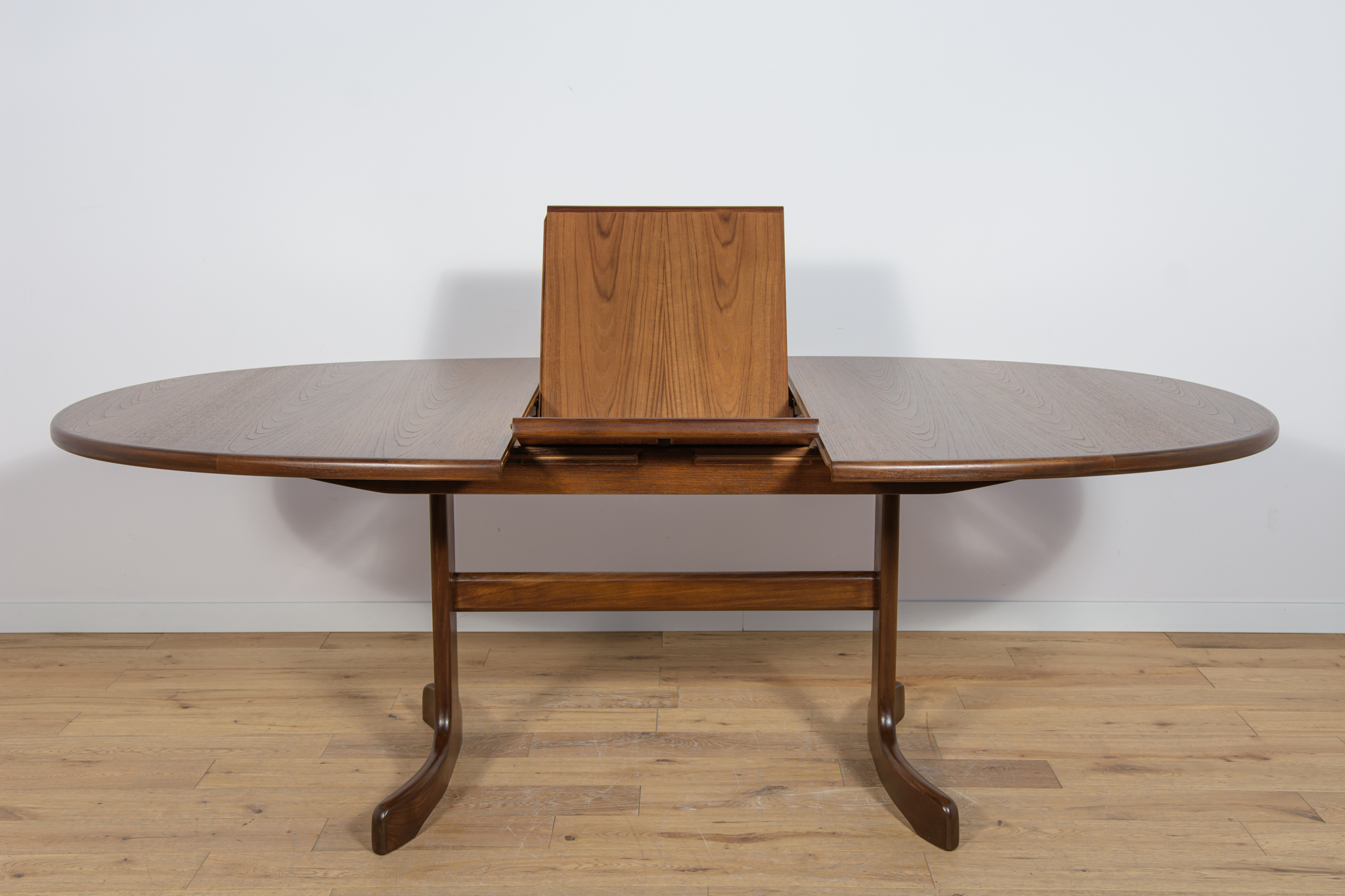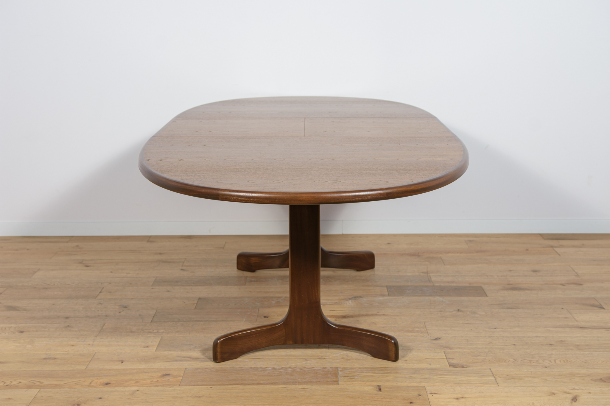 This is an oval-shaped teak dining table manufactured by G-Plan in the 1960s. The dining table after a comprehensive carpentry renovation. The teak elements have been cleaned of the old surface and painted with an rosewood stain and finished with a strong semi-matt varnish. The dining table has a mechanism that facilitates unfolding. The table measures 208 cm long when fully extended.