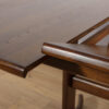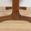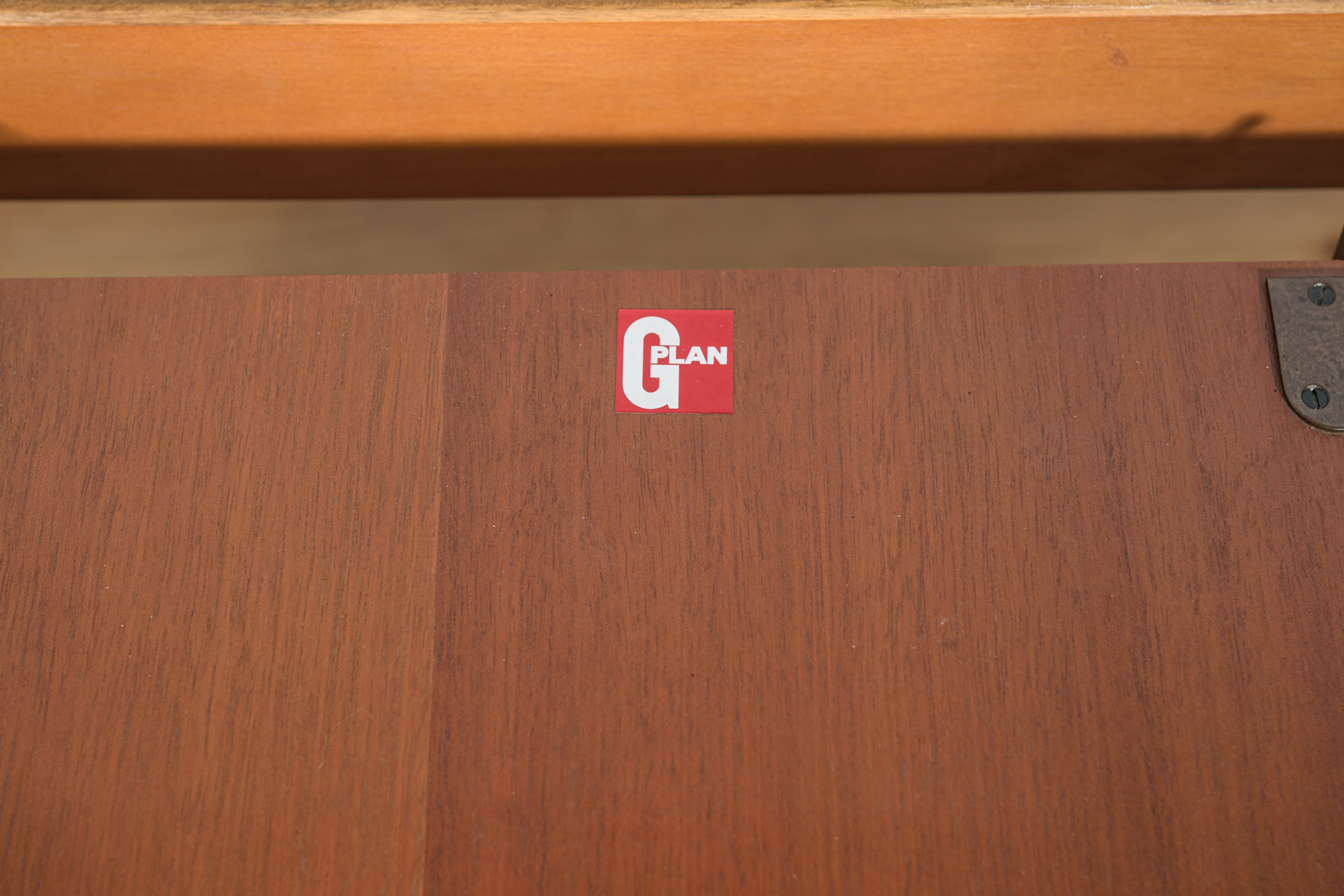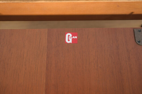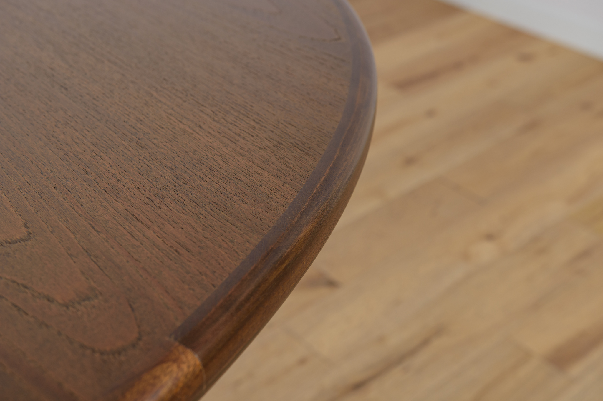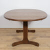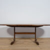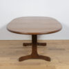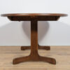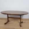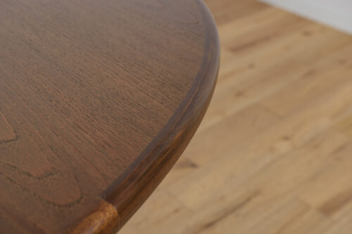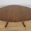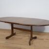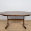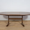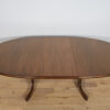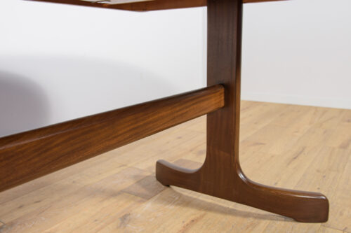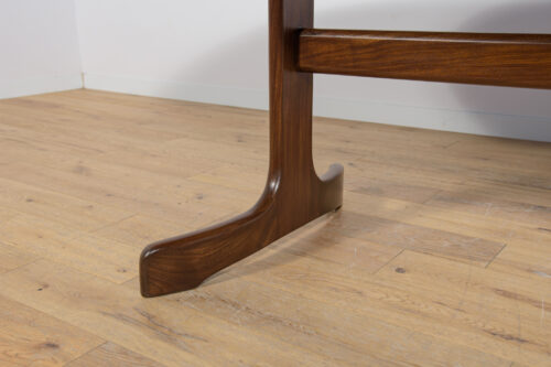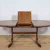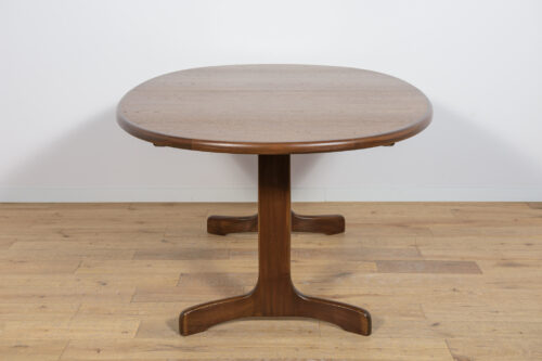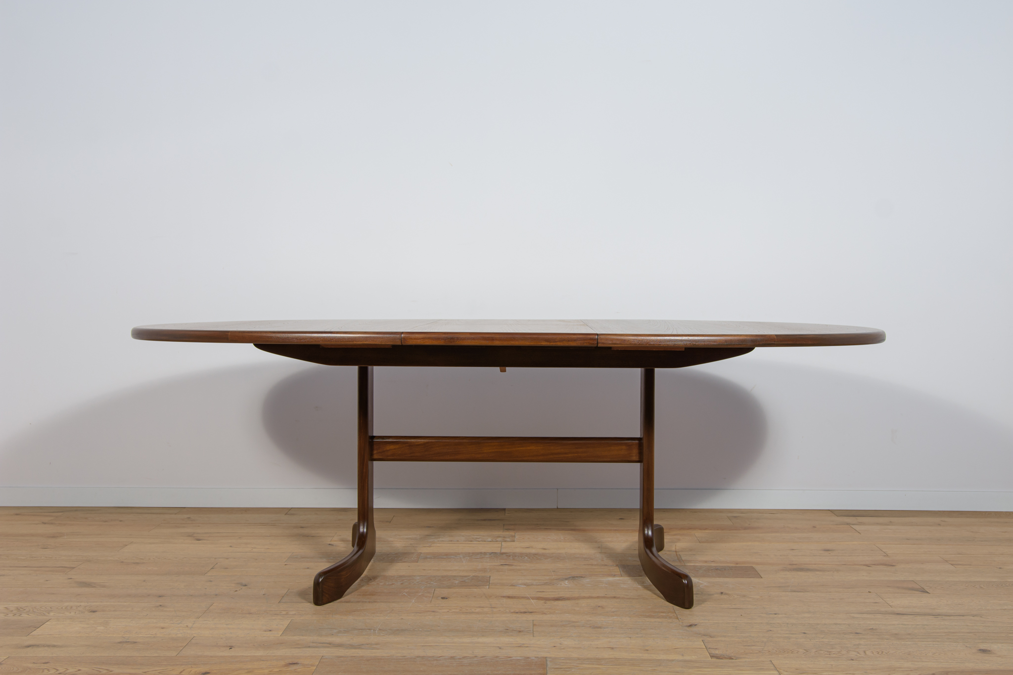 This is an oval-shaped teak dining table manufactured by G-Plan in the 1960s. The dining table after a comprehensive carpentry renovation. The teak elements have been cleaned of the old surface and painted with an rosewood stain and finished with a strong semi-matt varnish. The dining table has a mechanism that facilitates unfolding. The table measures 208 cm long when fully extended.