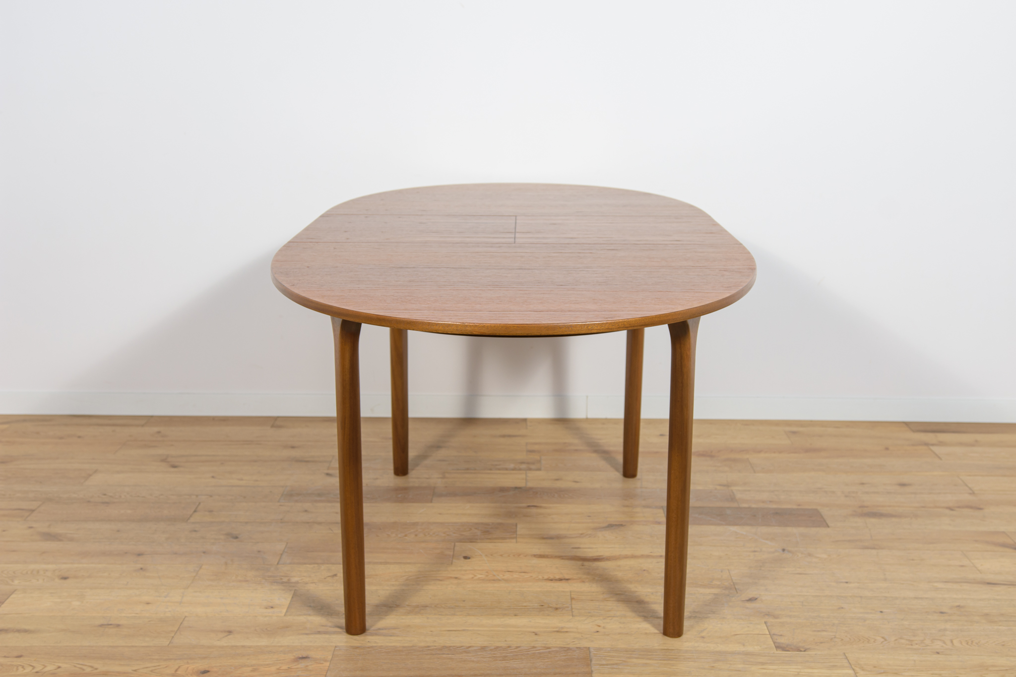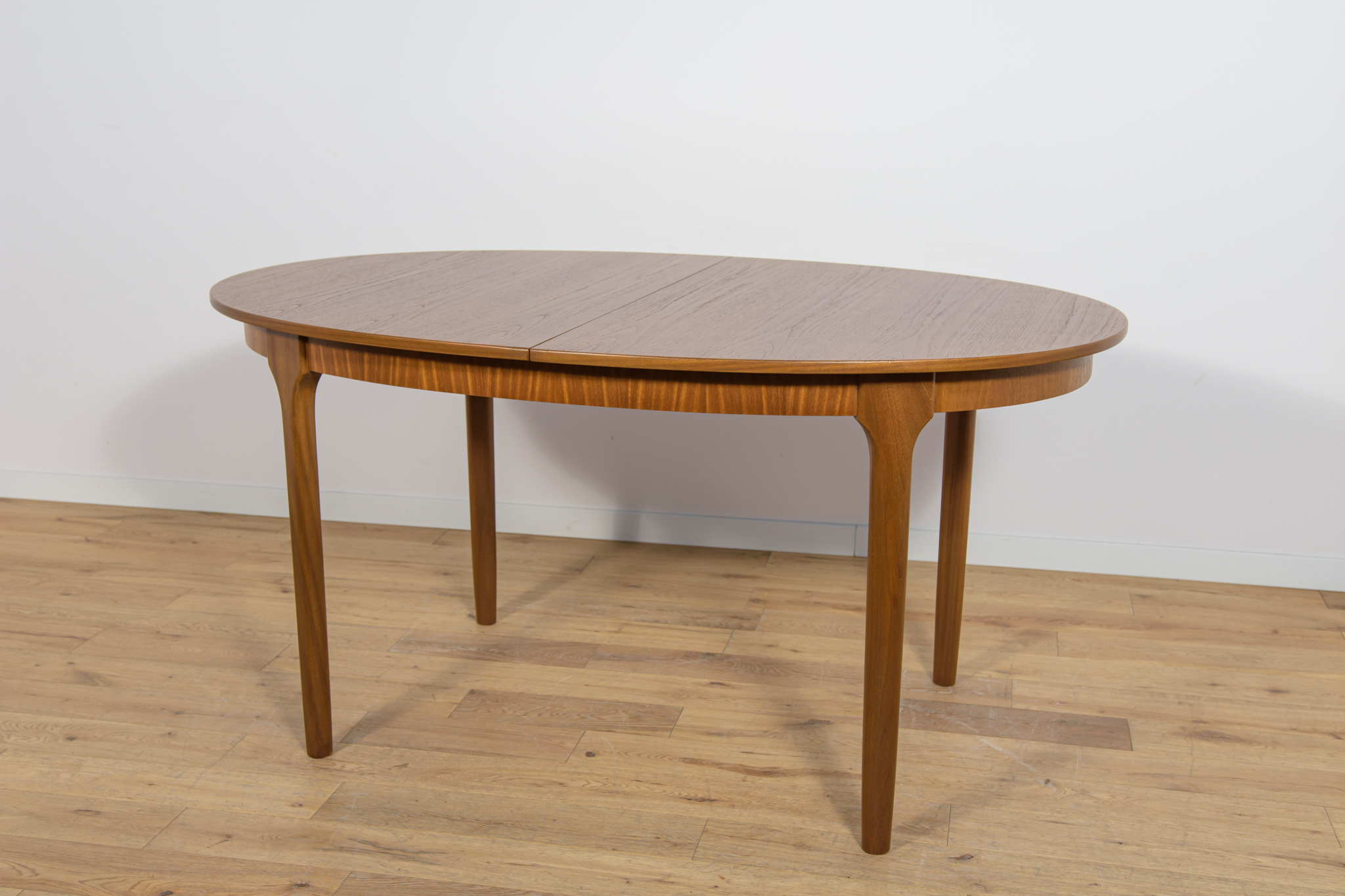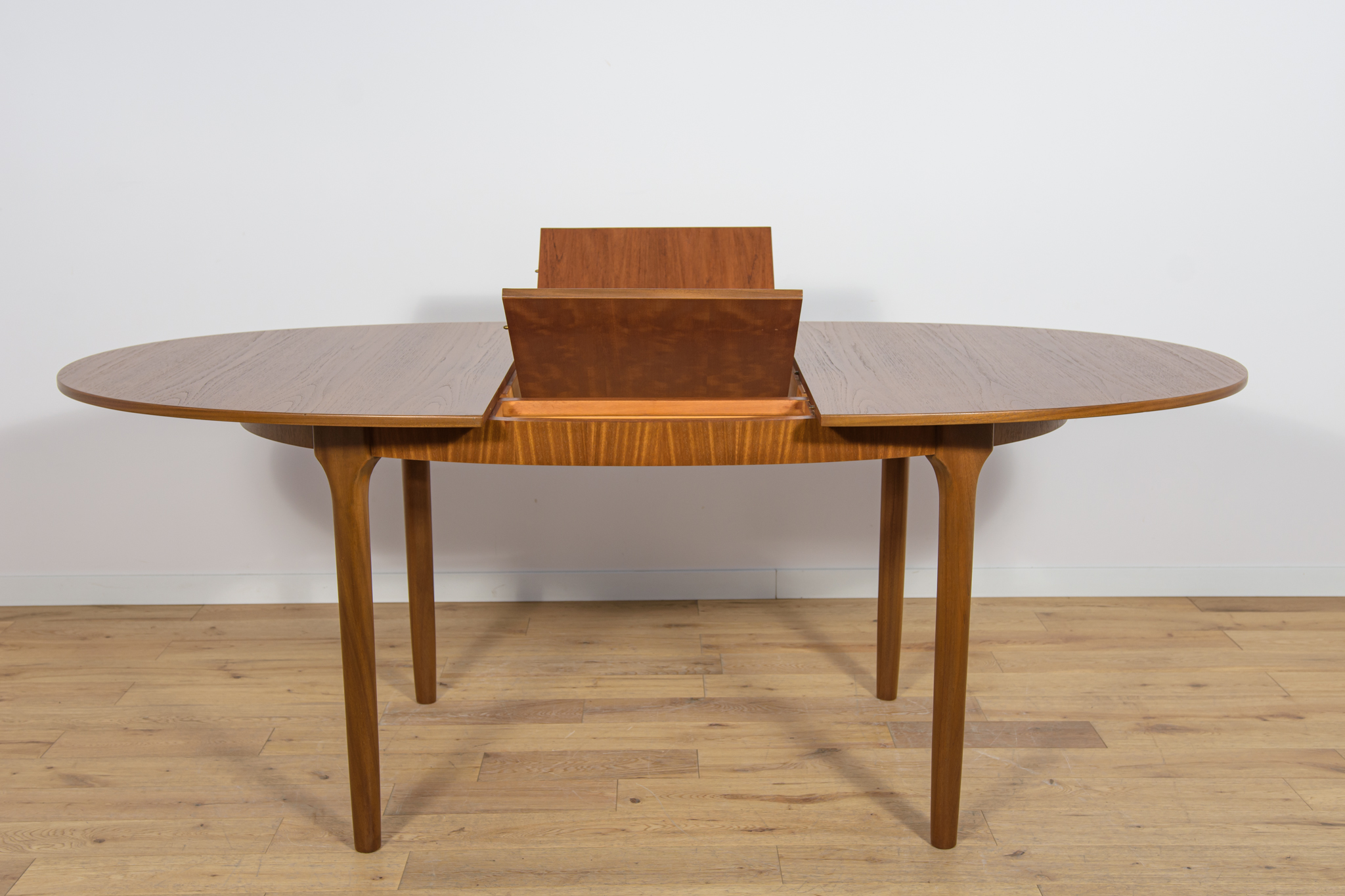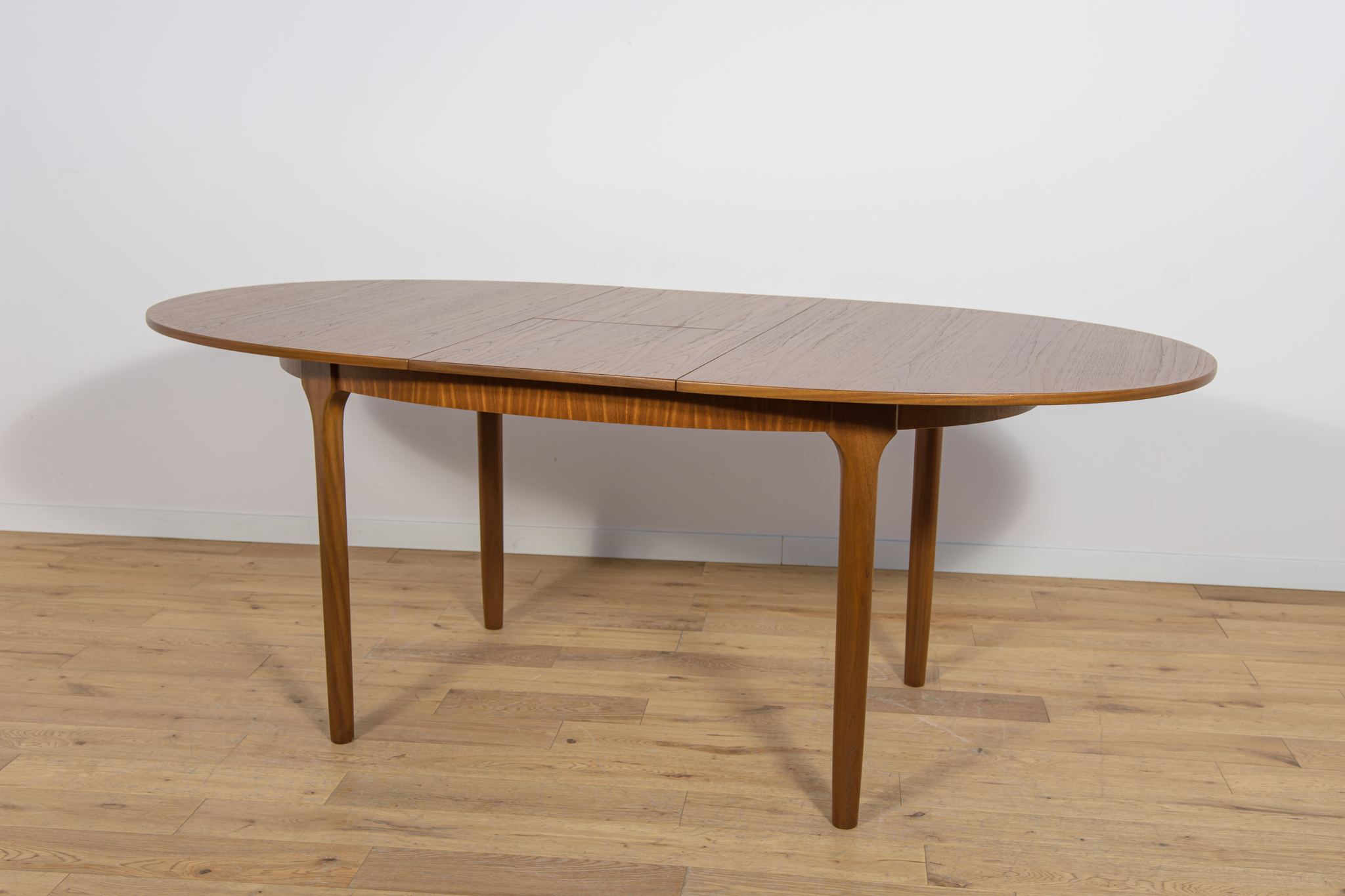 This oval extendable dining table was produced by McIntosh in the 1960s. Teak elements cleaned old surface and painted in an oak stain and finished with strong semi matt lacquer. The table has a mechanism that makes it easier to unfold. The table measures 196 cm long when fully extended.