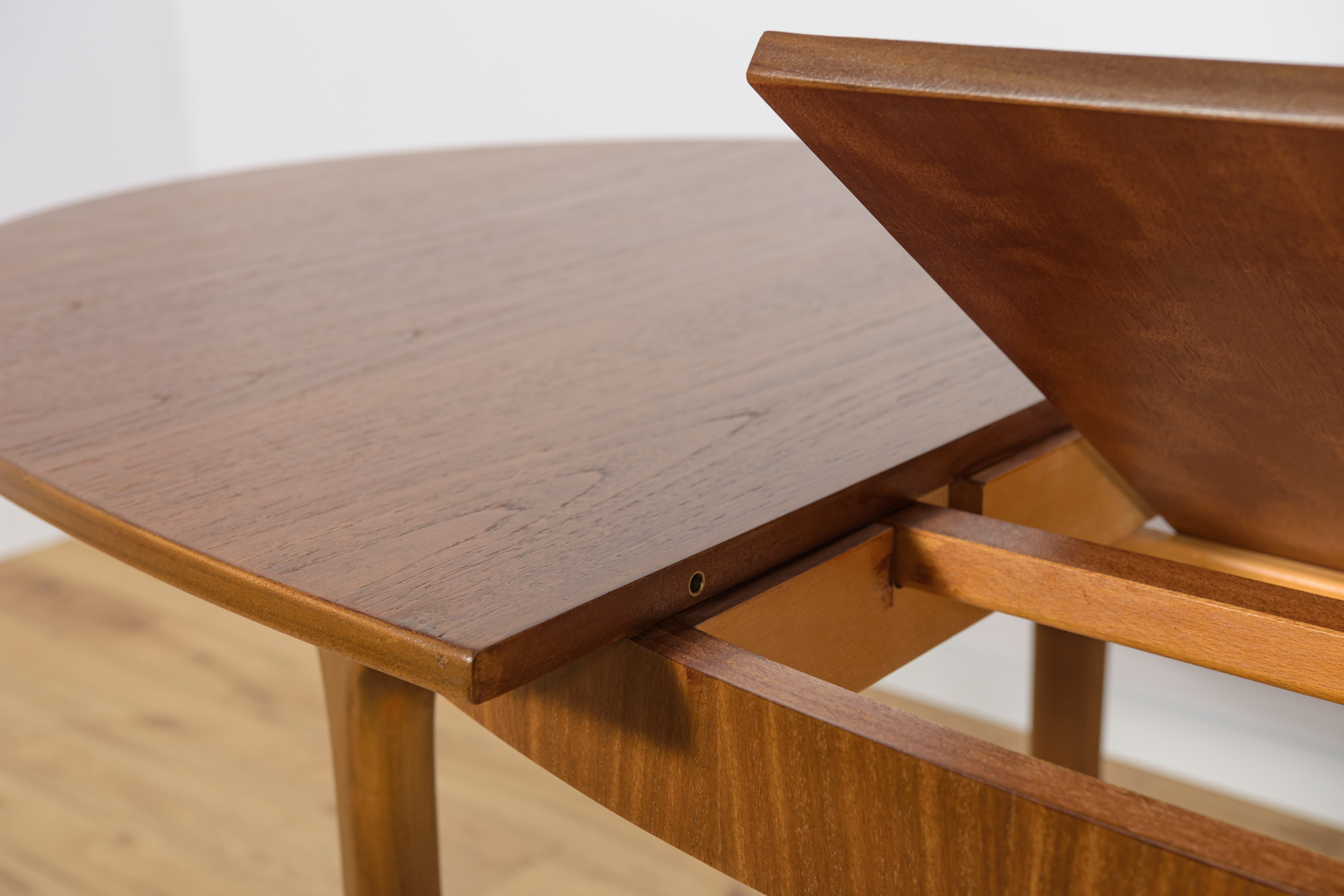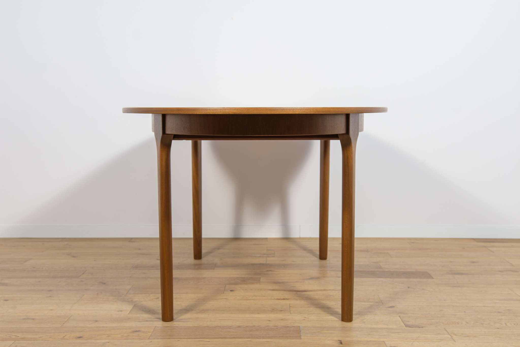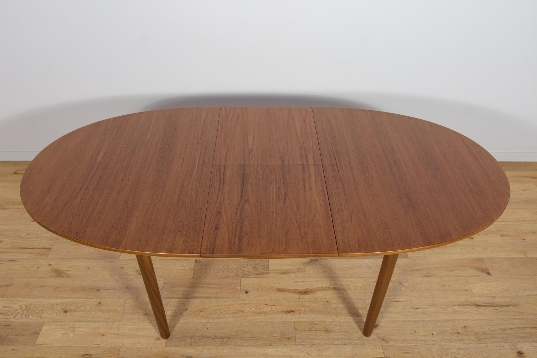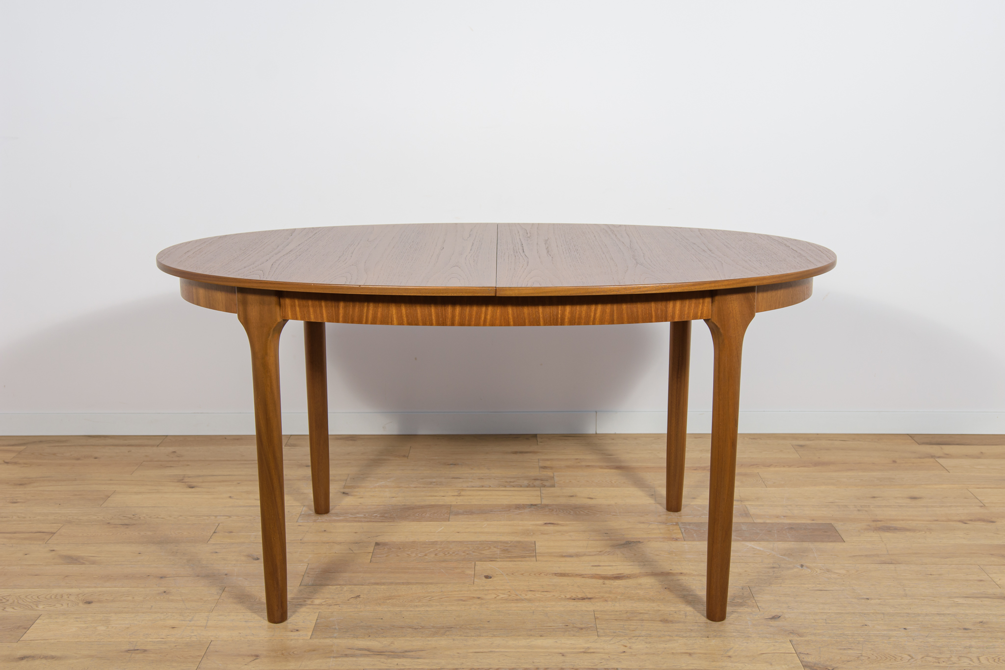 This oval extendable dining table was produced by McIntosh in the 1960s. Teak elements cleaned old surface and painted in an oak stain and finished with strong semi matt lacquer. The table has a mechanism that makes it easier to unfold. The table measures 196 cm long when fully extended.