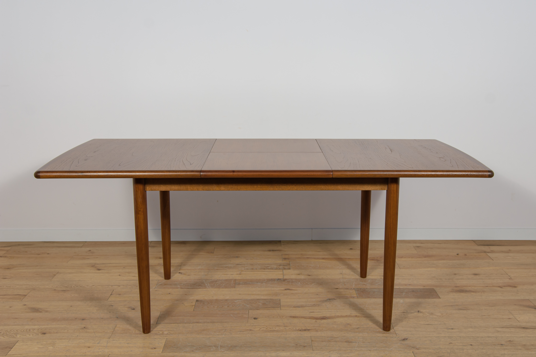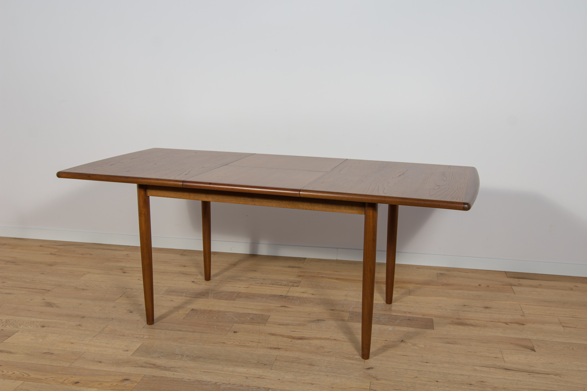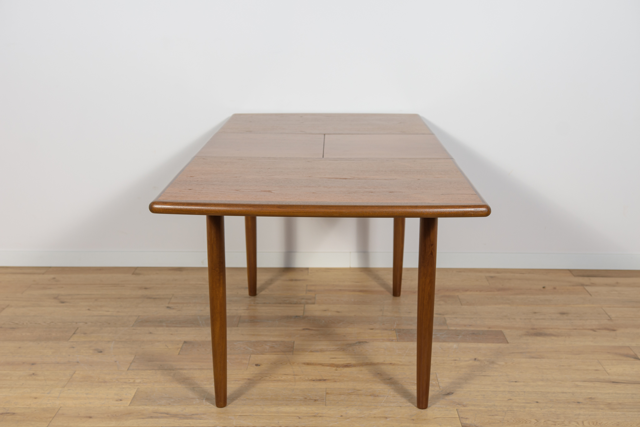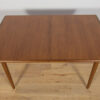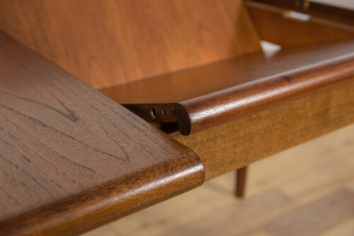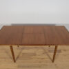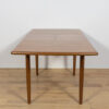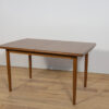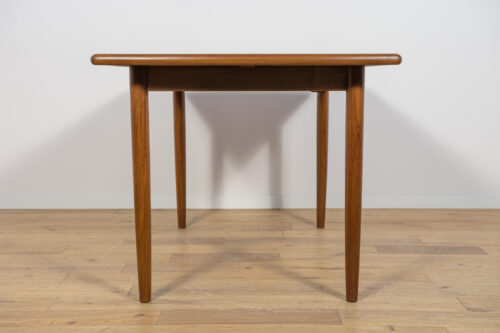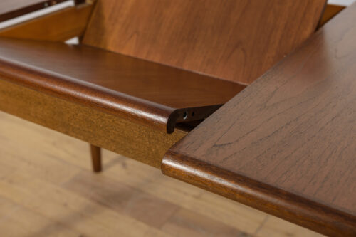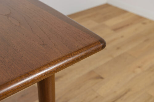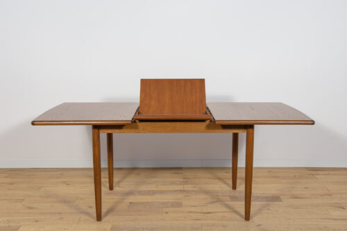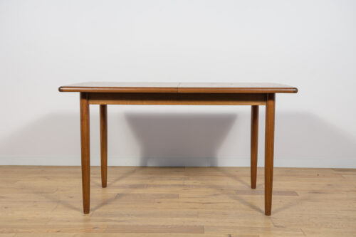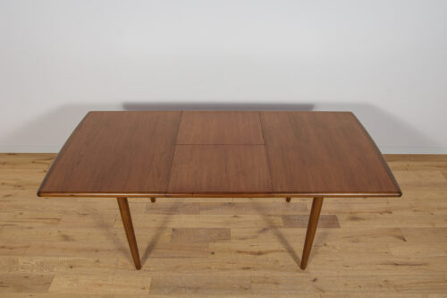 The extendable table was produced in the 1970s, in the British Meredew factory. The table has solid, profiled edges, which give it uniqueness and elegance. The rectangular teak table has undergone professional carpentry renovation. It has been cleaned of the old surface, stained with oak stain and finished with a strong semi-matt varnish.