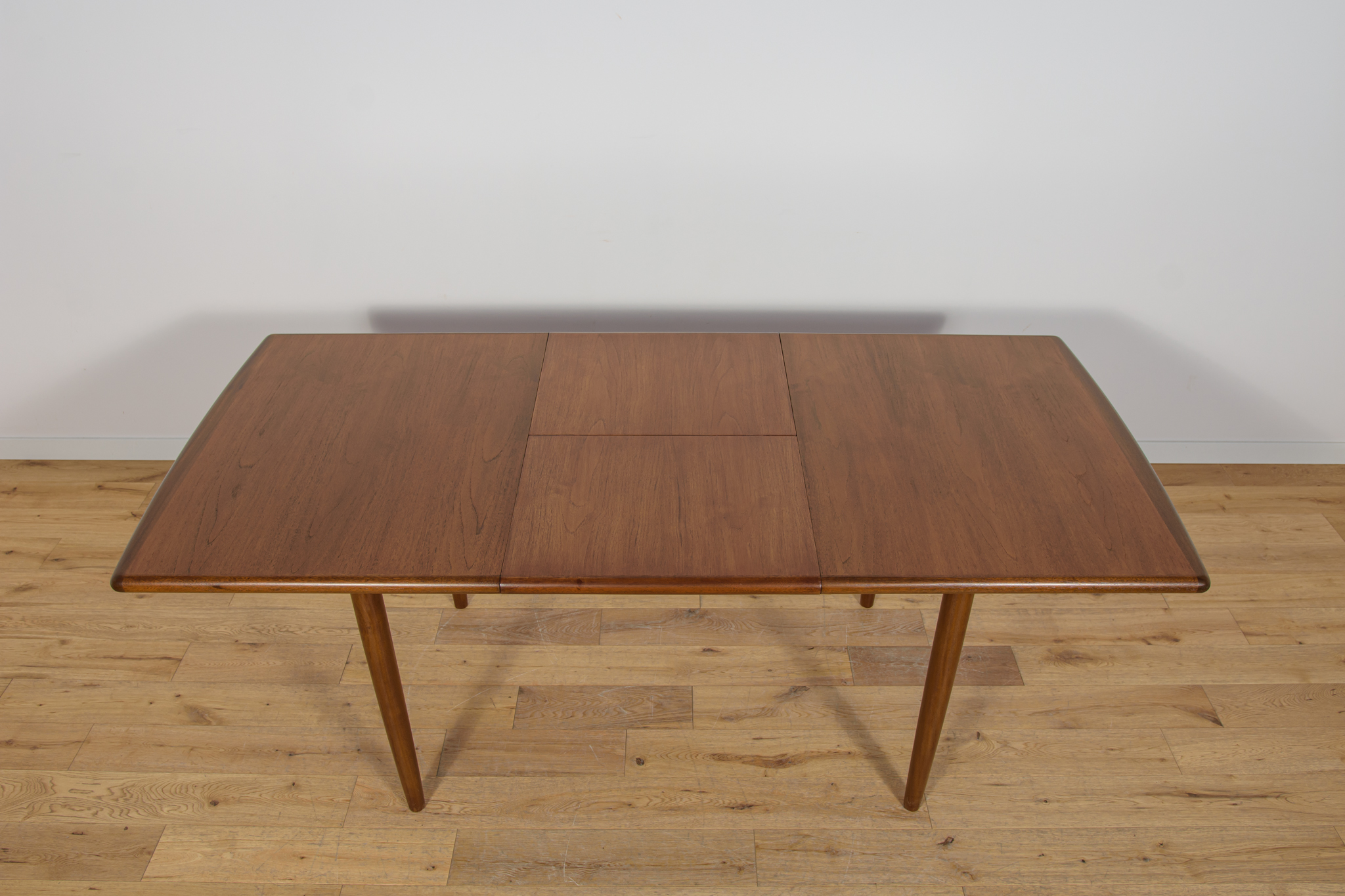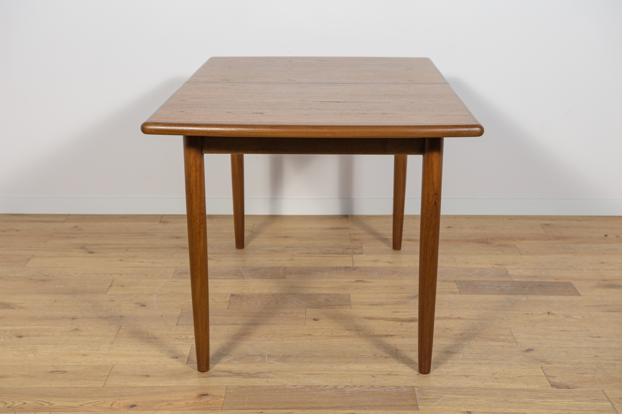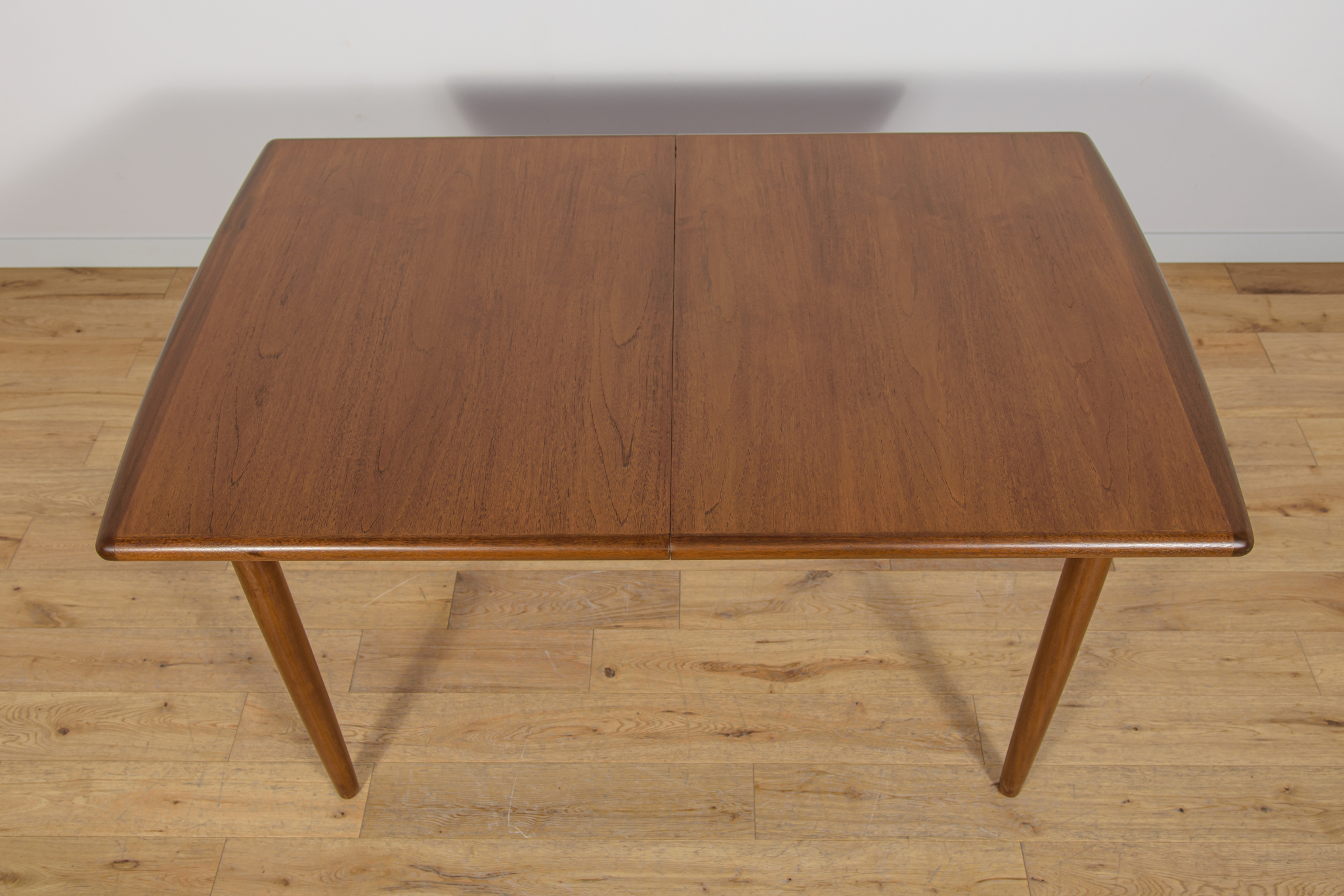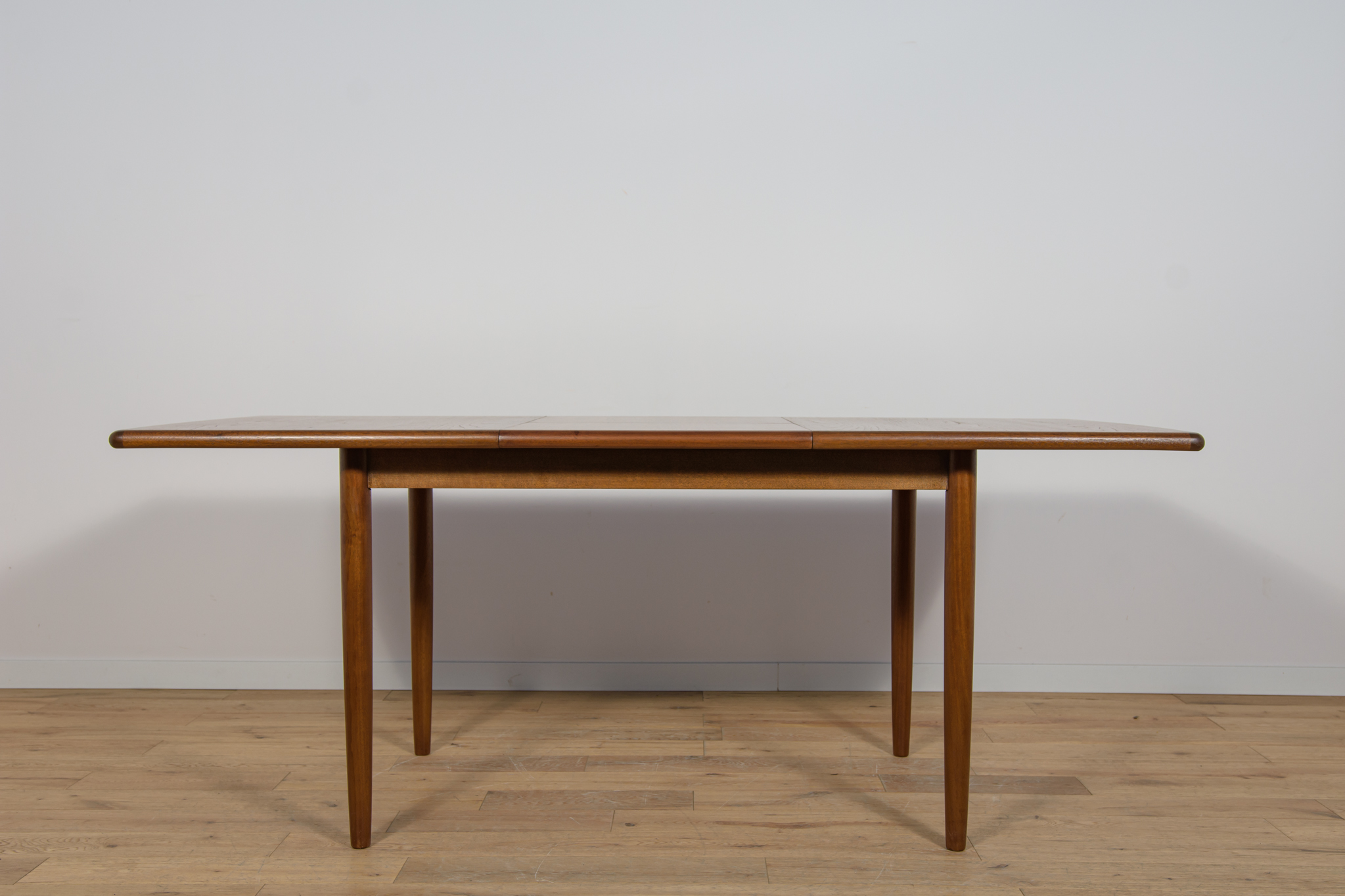 The extendable table was produced in the 1970s, in the British Meredew factory. The table has solid, profiled edges, which give it uniqueness and elegance. The rectangular teak table has undergone professional carpentry renovation. It has been cleaned of the old surface, stained with oak stain and finished with a strong semi-matt varnish.