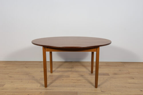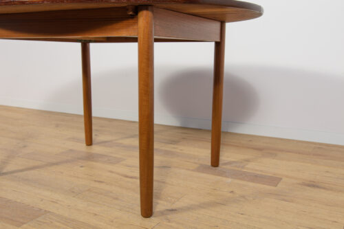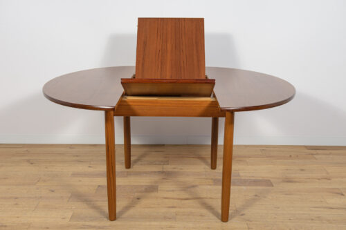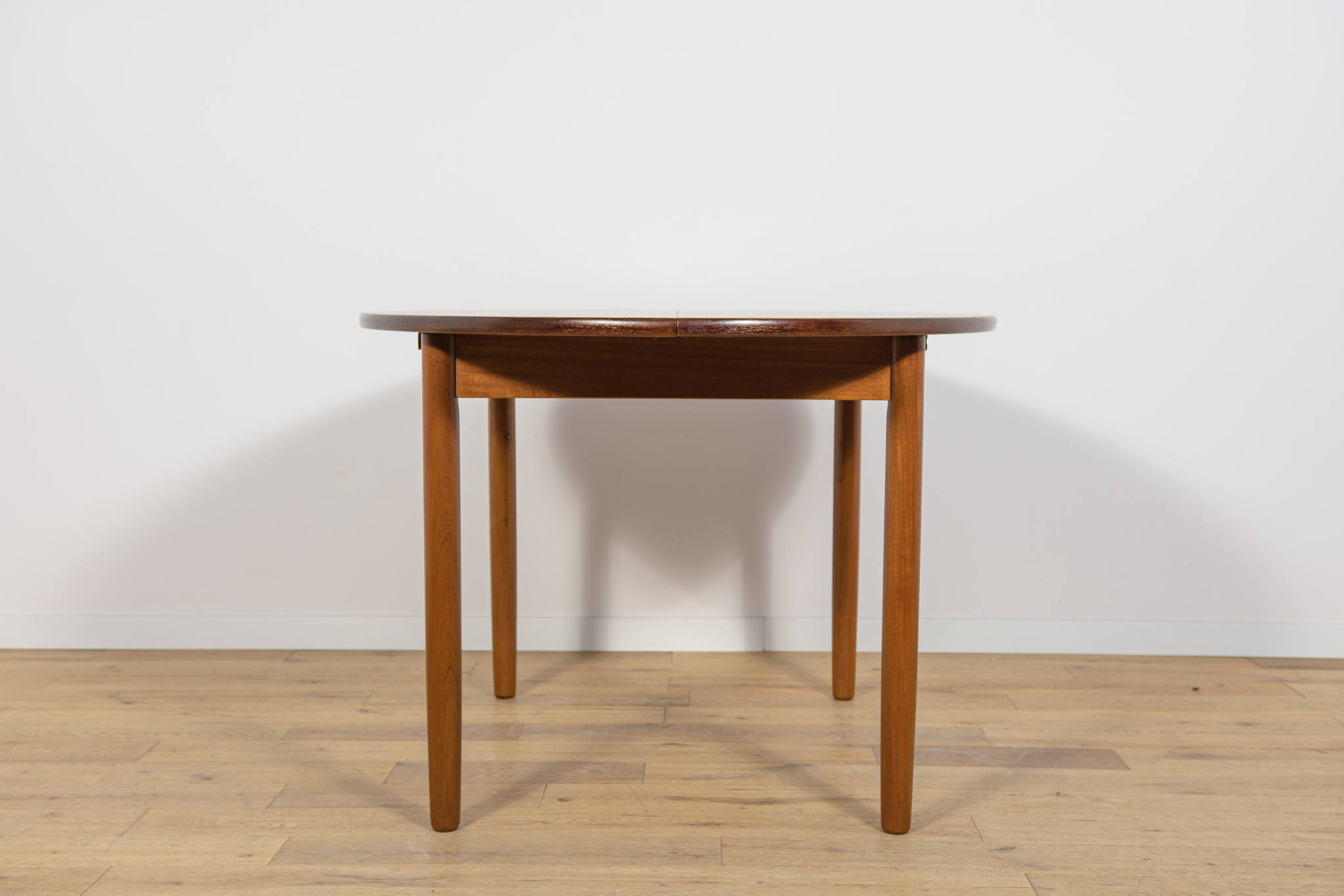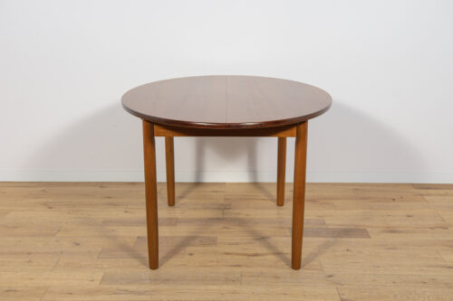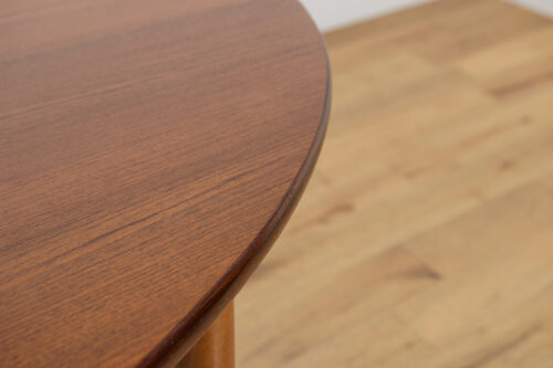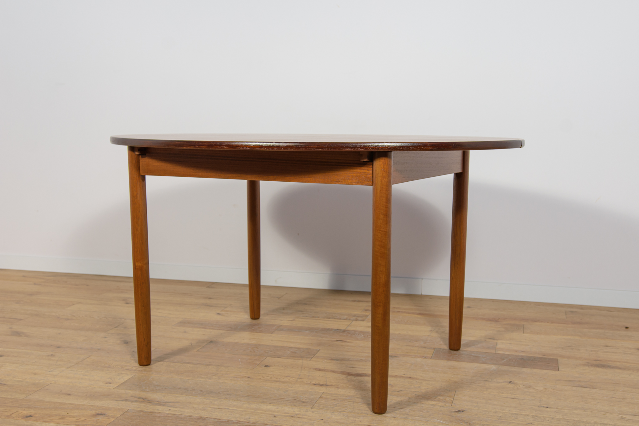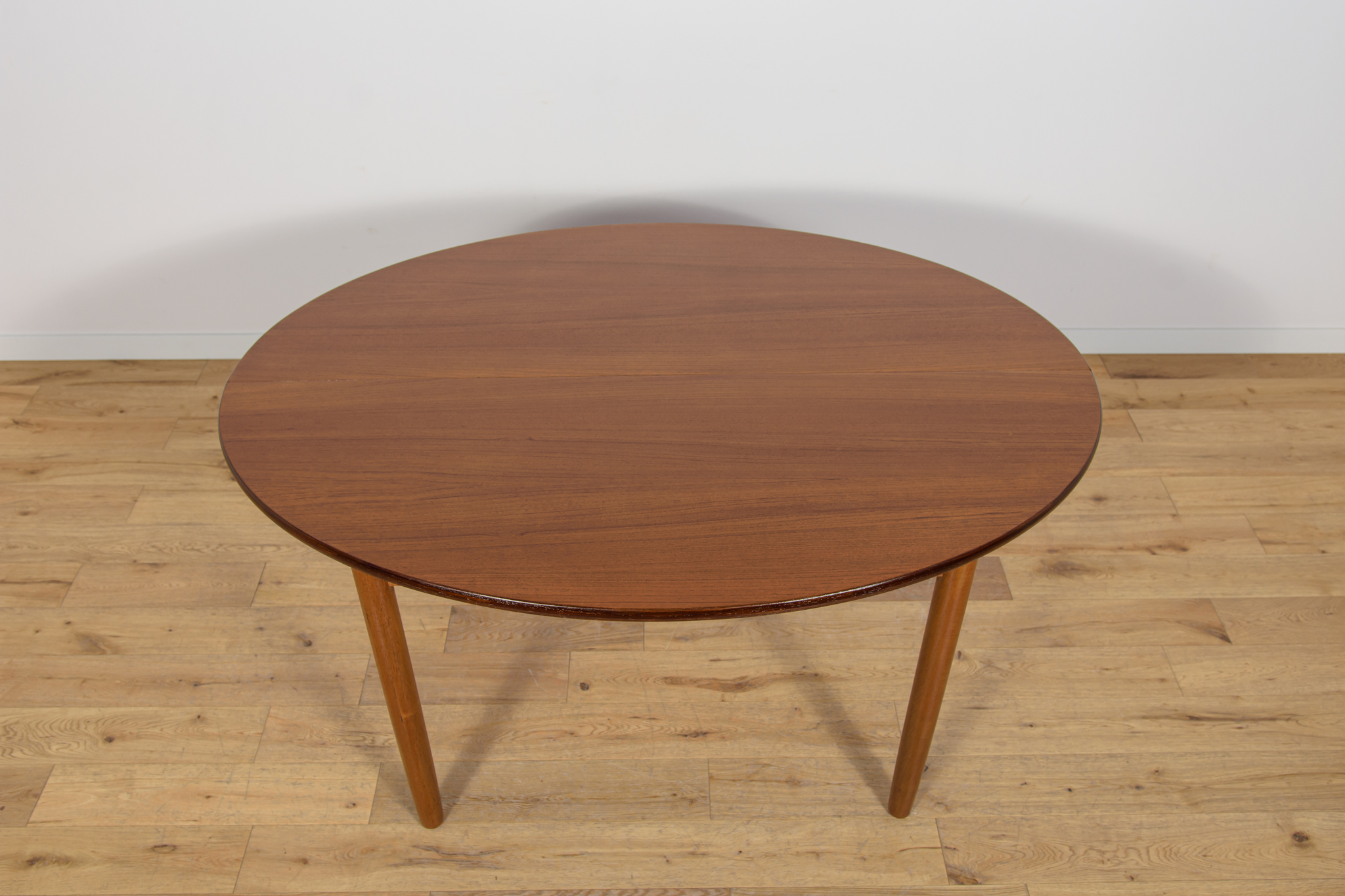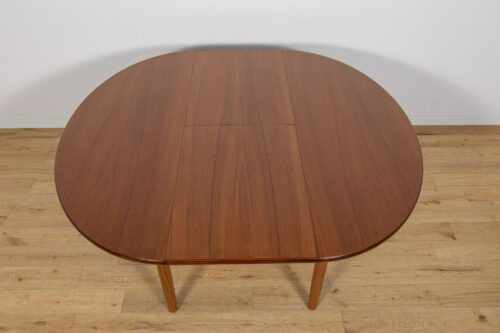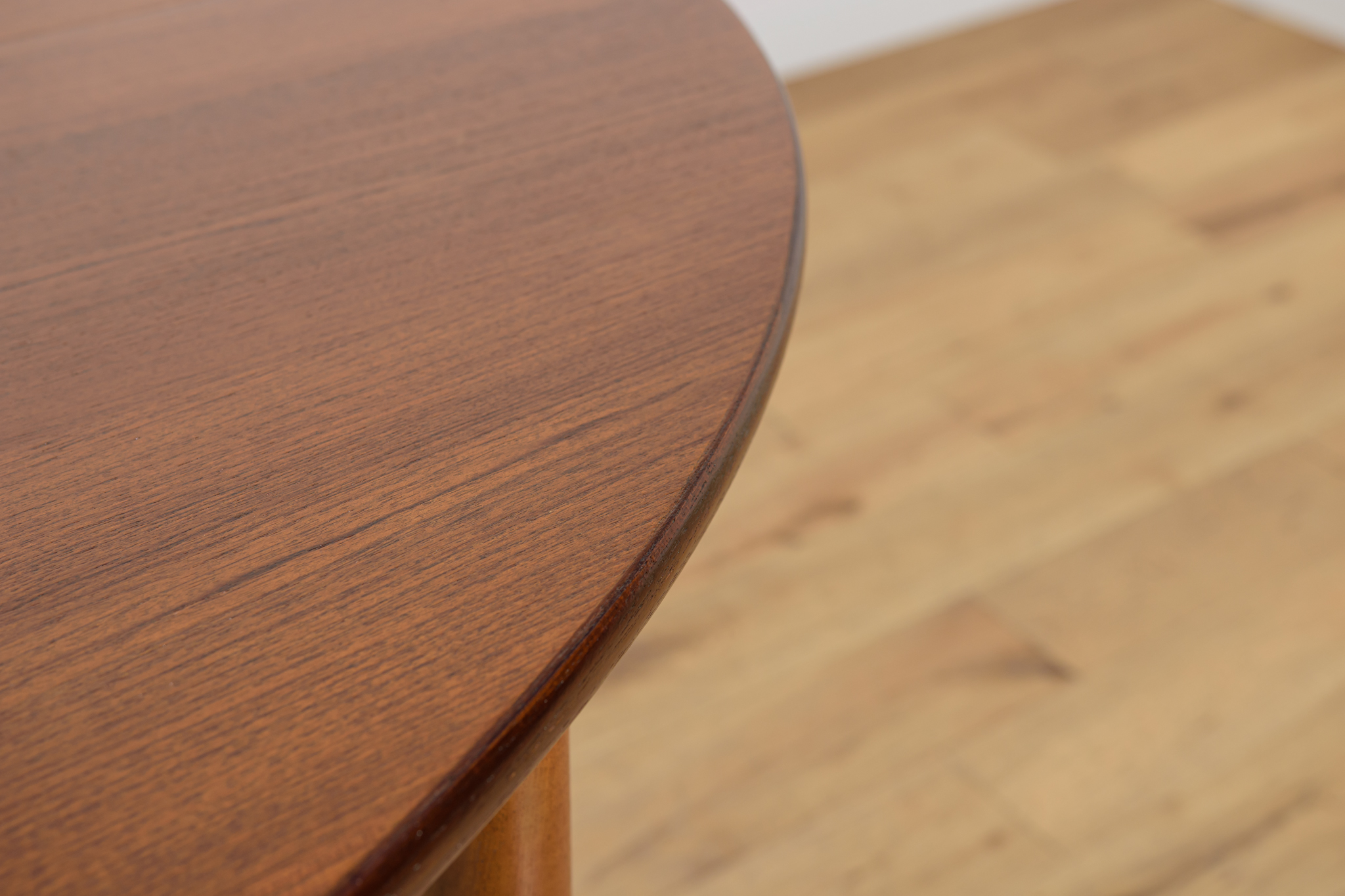 Round teak wood table produced in the UK in the 1960s. The table features an interesting grain. The furniture has undergone comprehensive carpentry renovation. It has been stripped of the old surface, stained with oak stain, and finished with a strong semi-matt lacquer.The table has a mechanism that facilitates extending it from 100 to 146 cm.