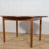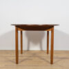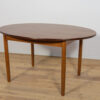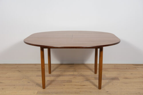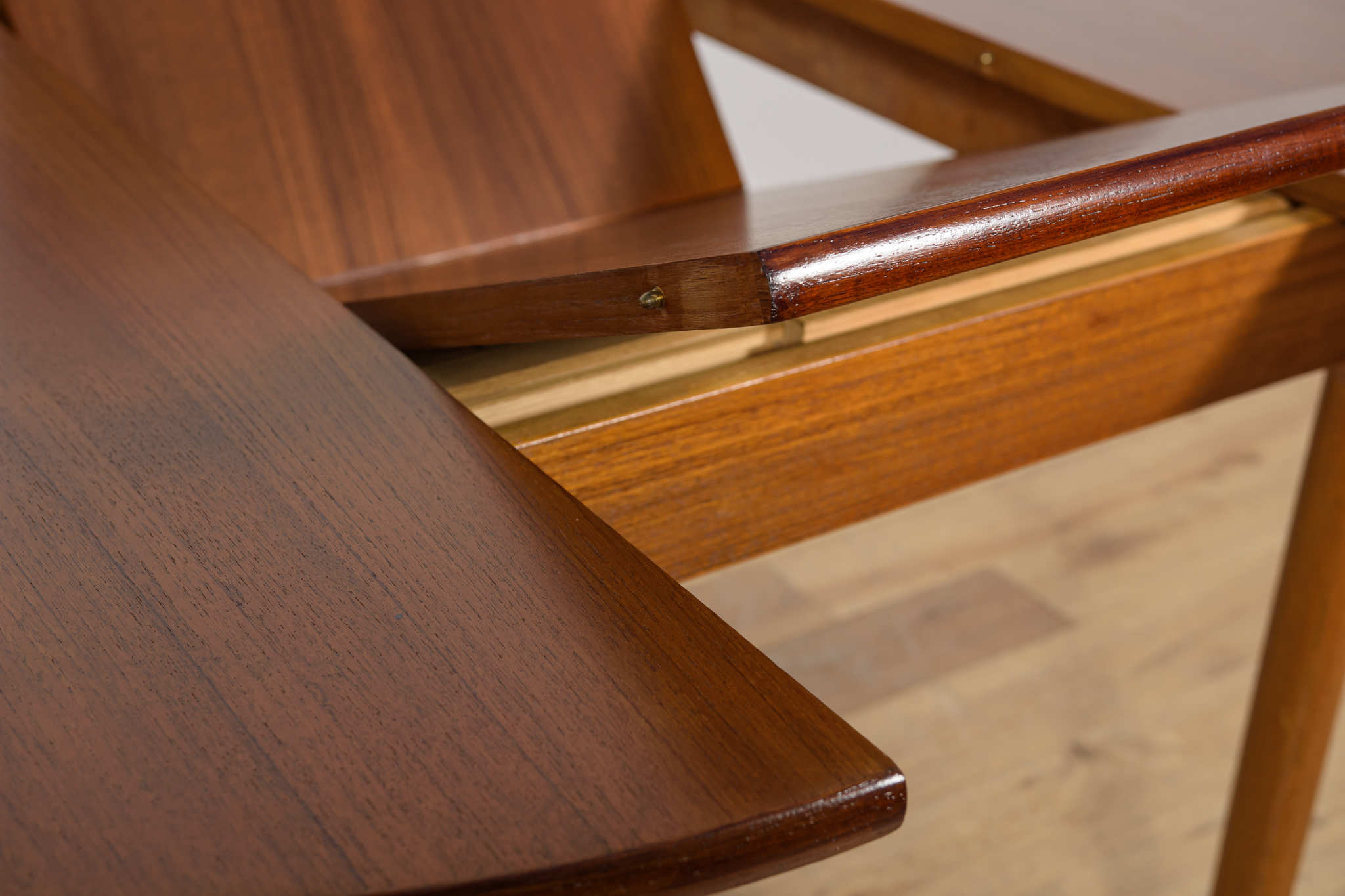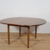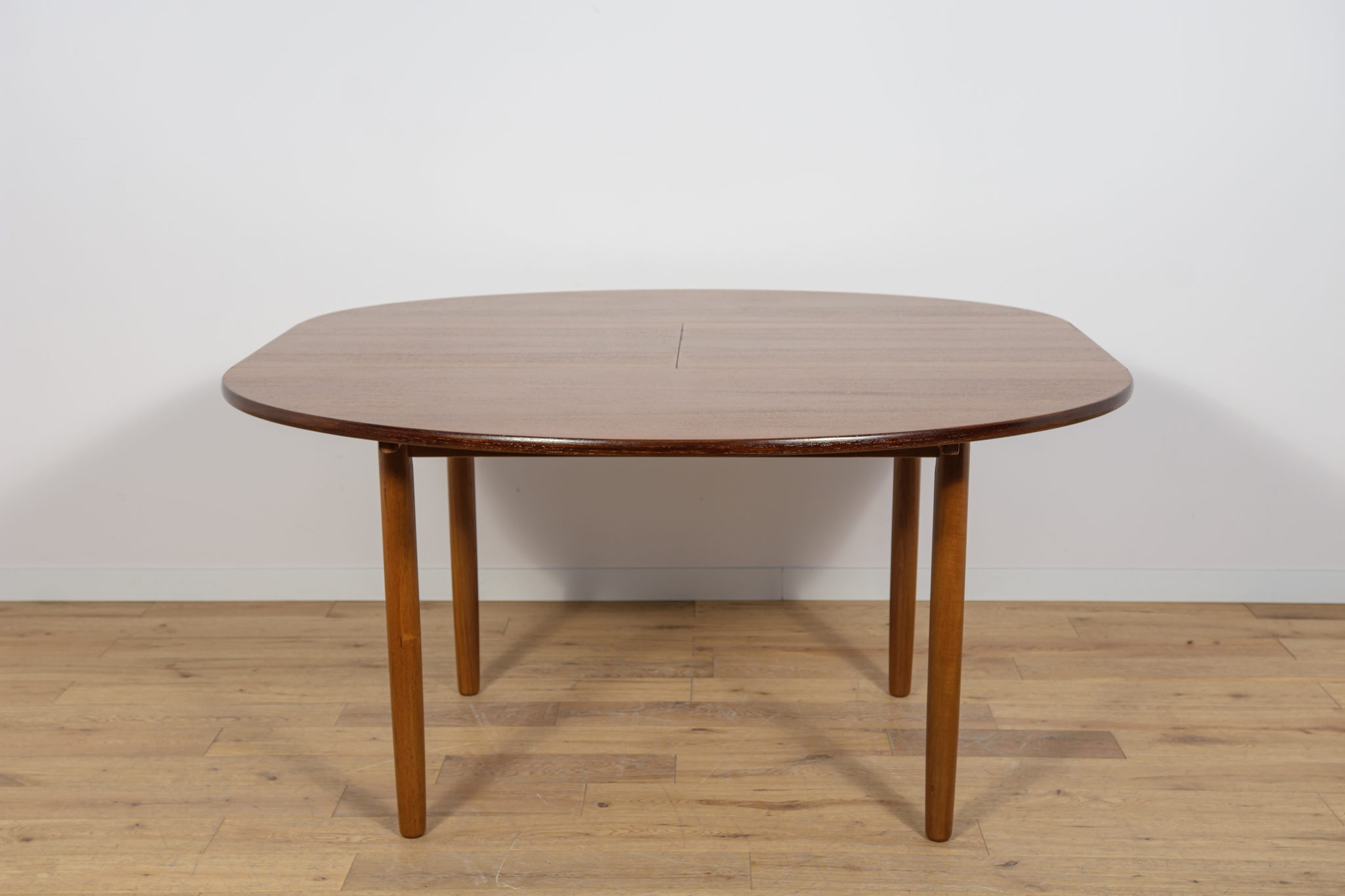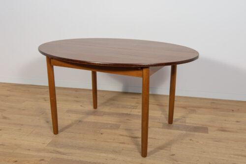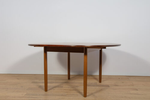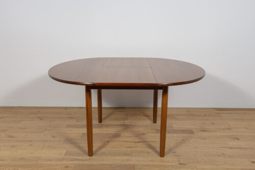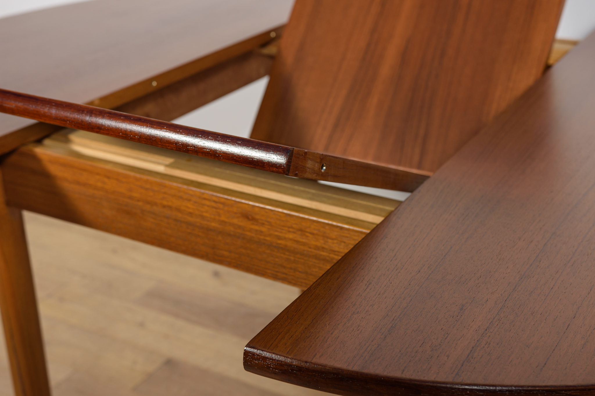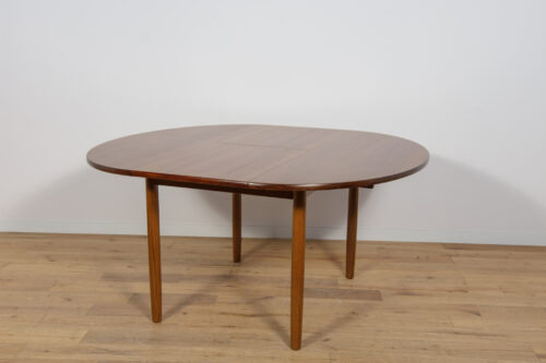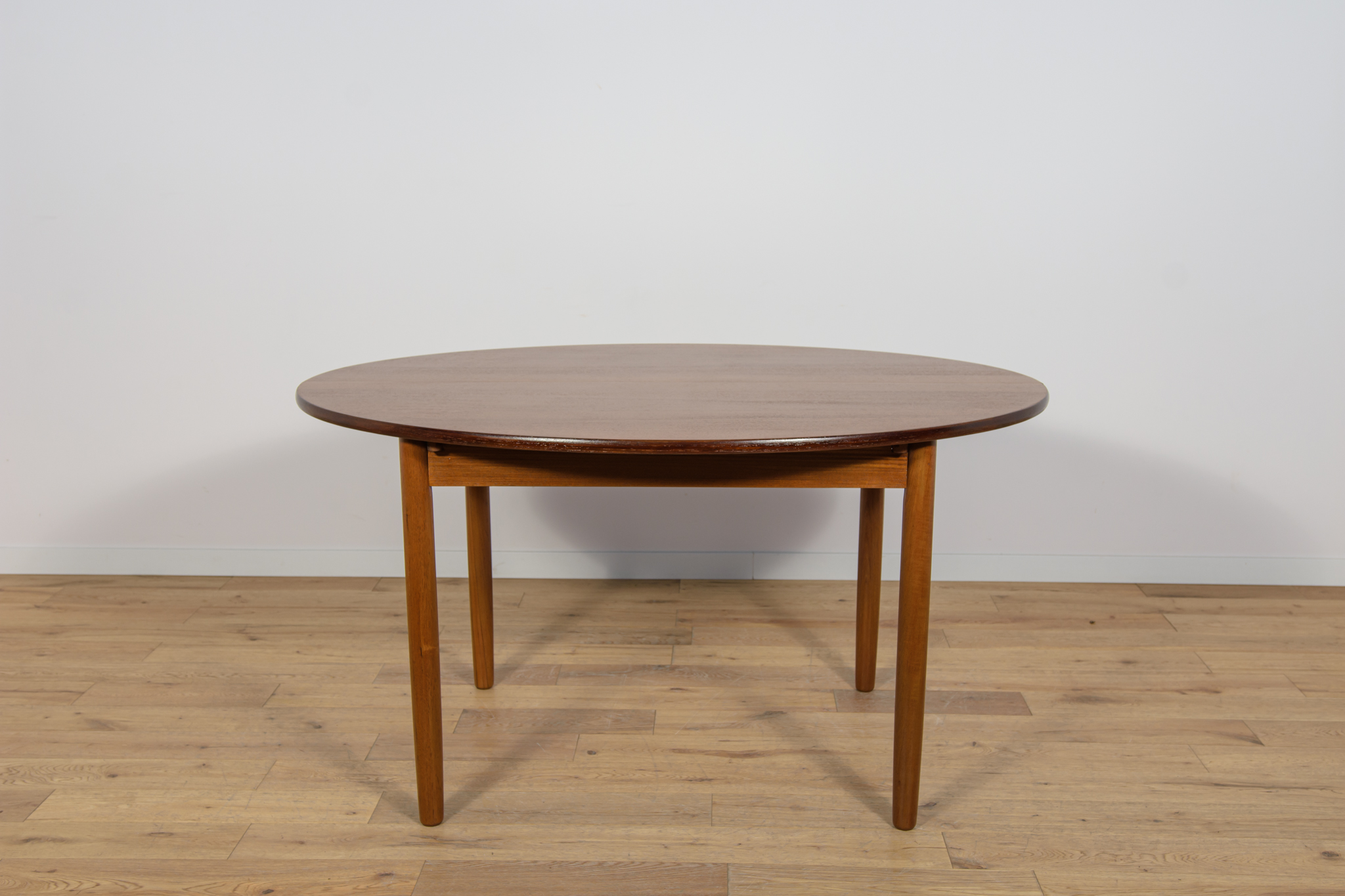 Round teak wood table produced in the UK in the 1960s. The table features an interesting grain. The furniture has undergone comprehensive carpentry renovation. It has been stripped of the old surface, stained with oak stain, and finished with a strong semi-matt lacquer.The table has a mechanism that facilitates extending it from 100 to 146 cm.