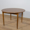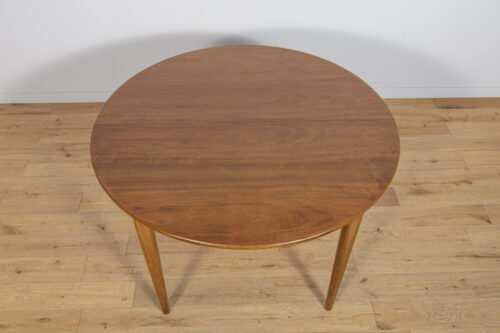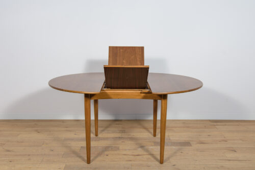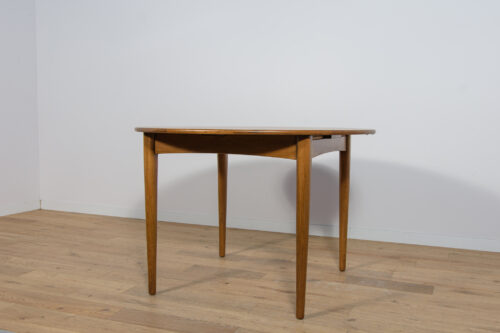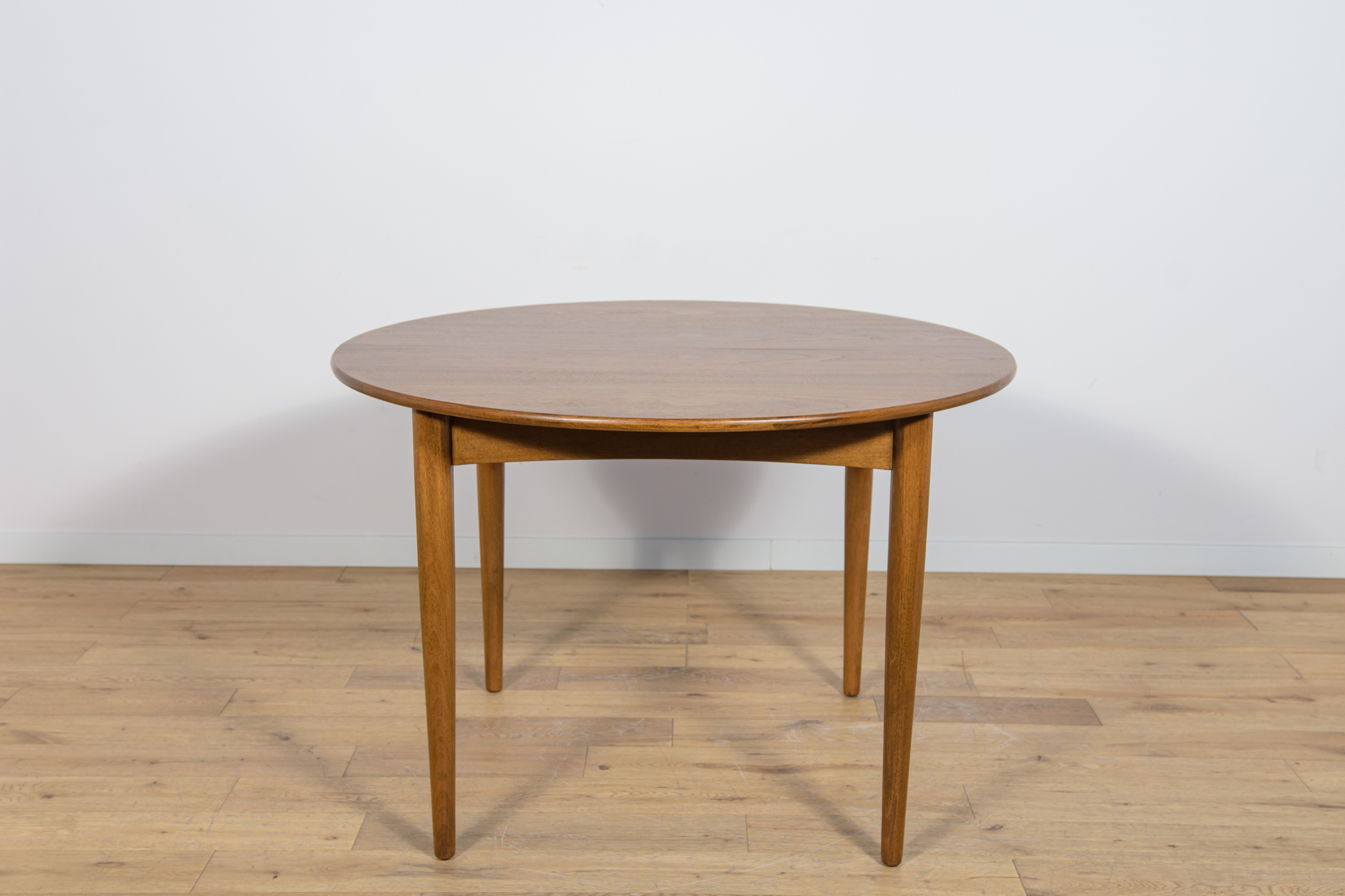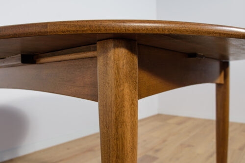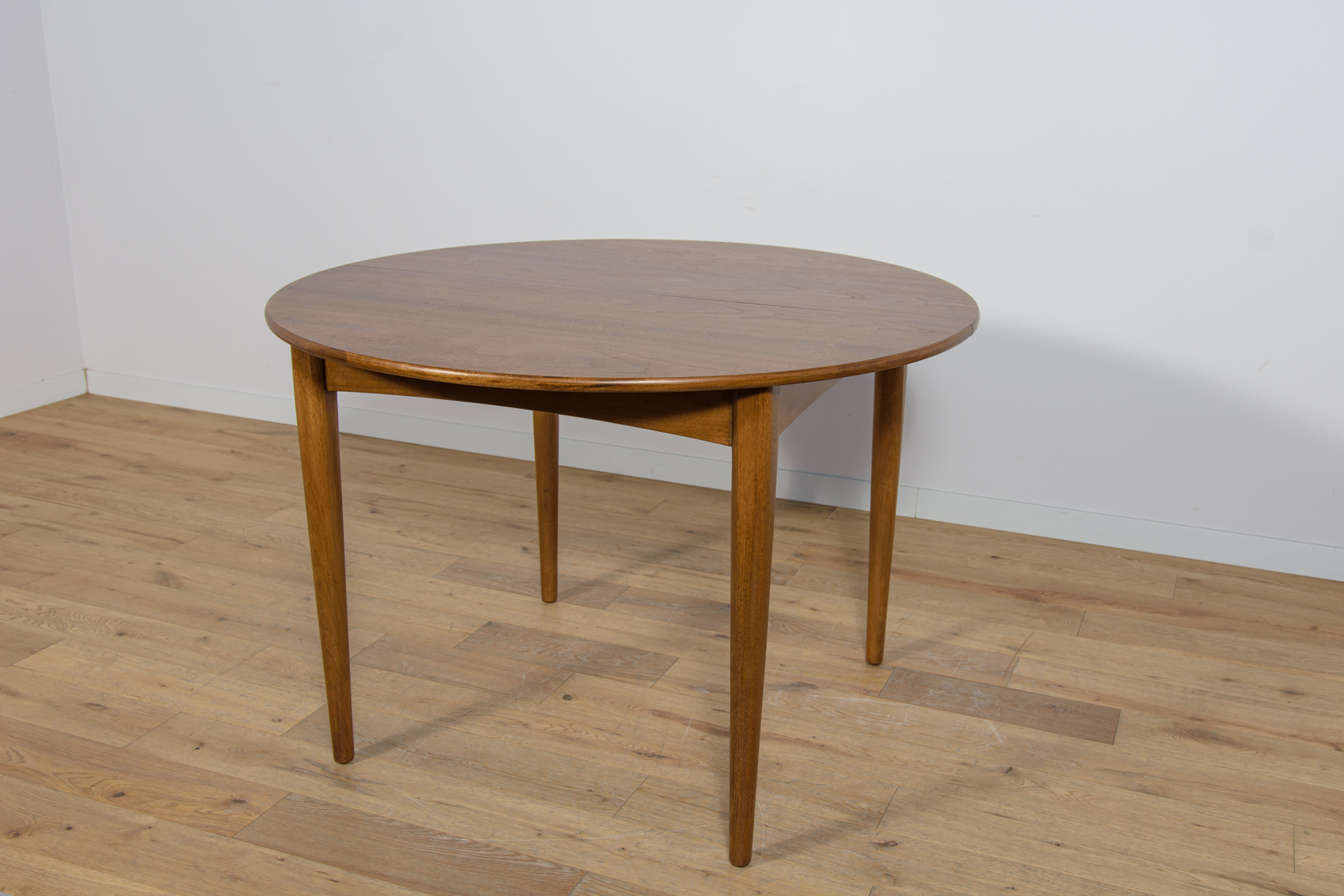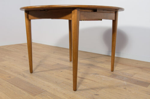 This round extendable dining table was produced by G-Plan in the 1960s. Teak elements cleaned from the old surface and painted in a oak stain and finished with strong lacquer. The table has a mechanism that makes it easy to unfold.