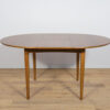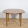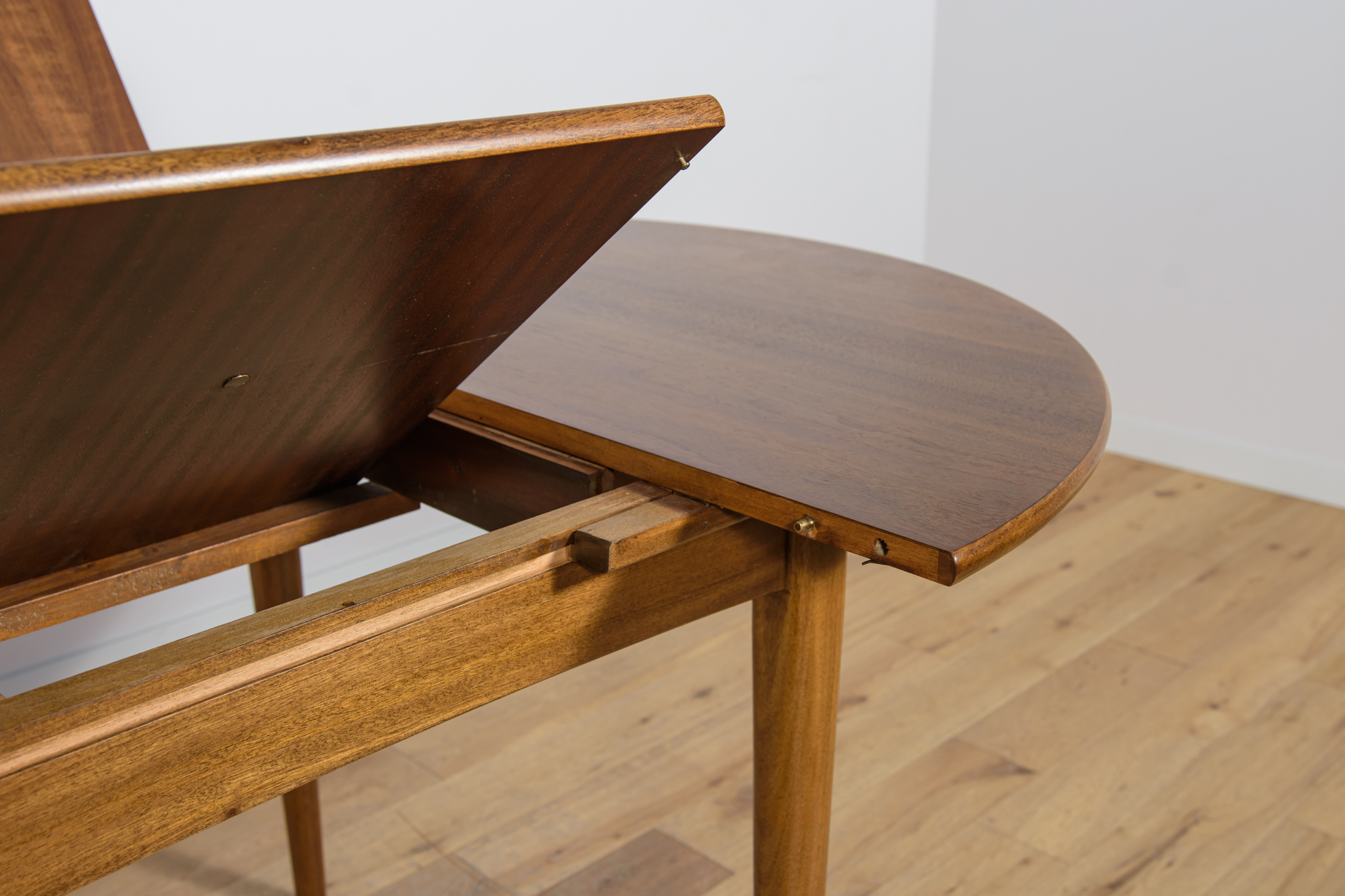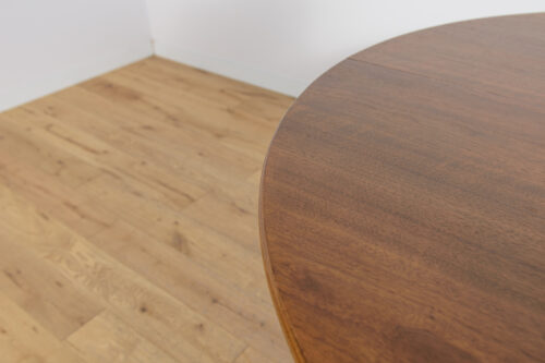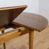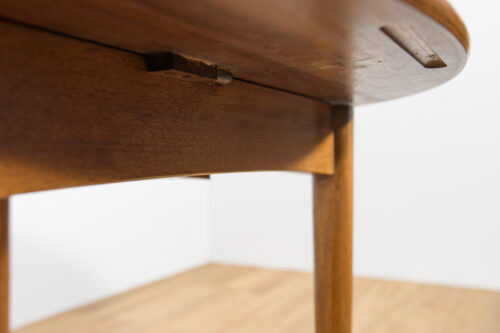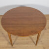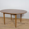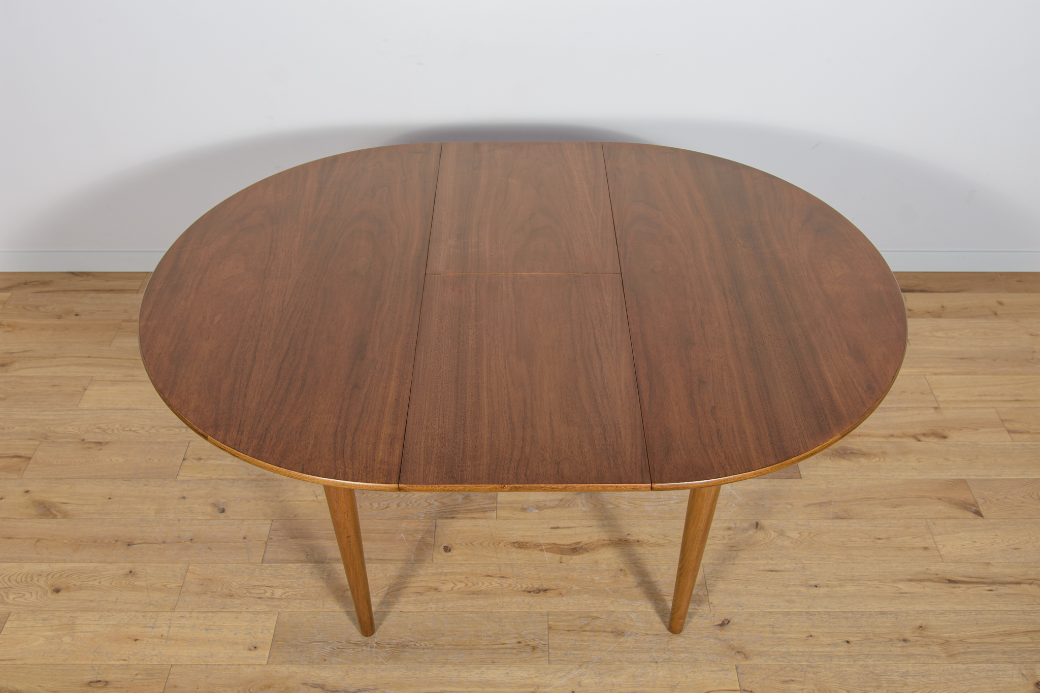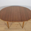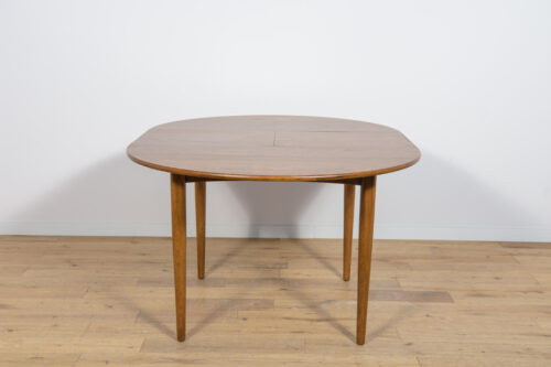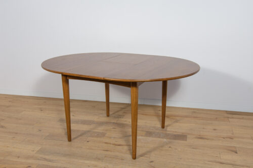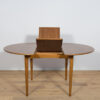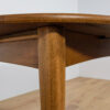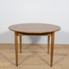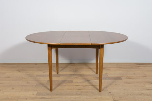 This round extendable dining table was produced by G-Plan in the 1960s. Teak elements cleaned from the old surface and painted in a oak stain and finished with strong lacquer. The table has a mechanism that makes it easy to unfold.