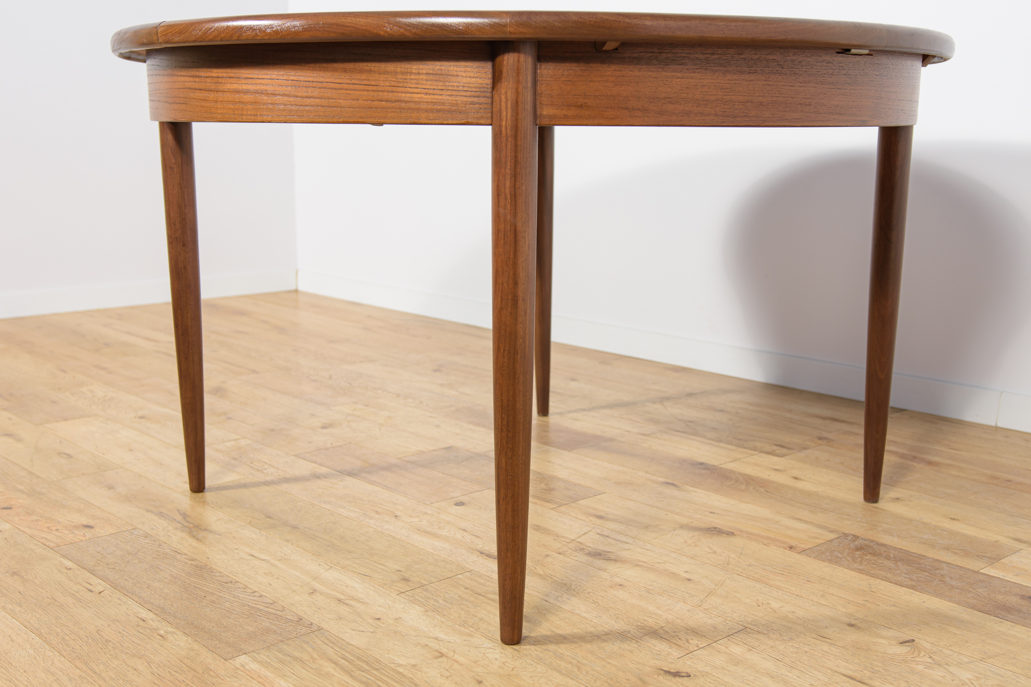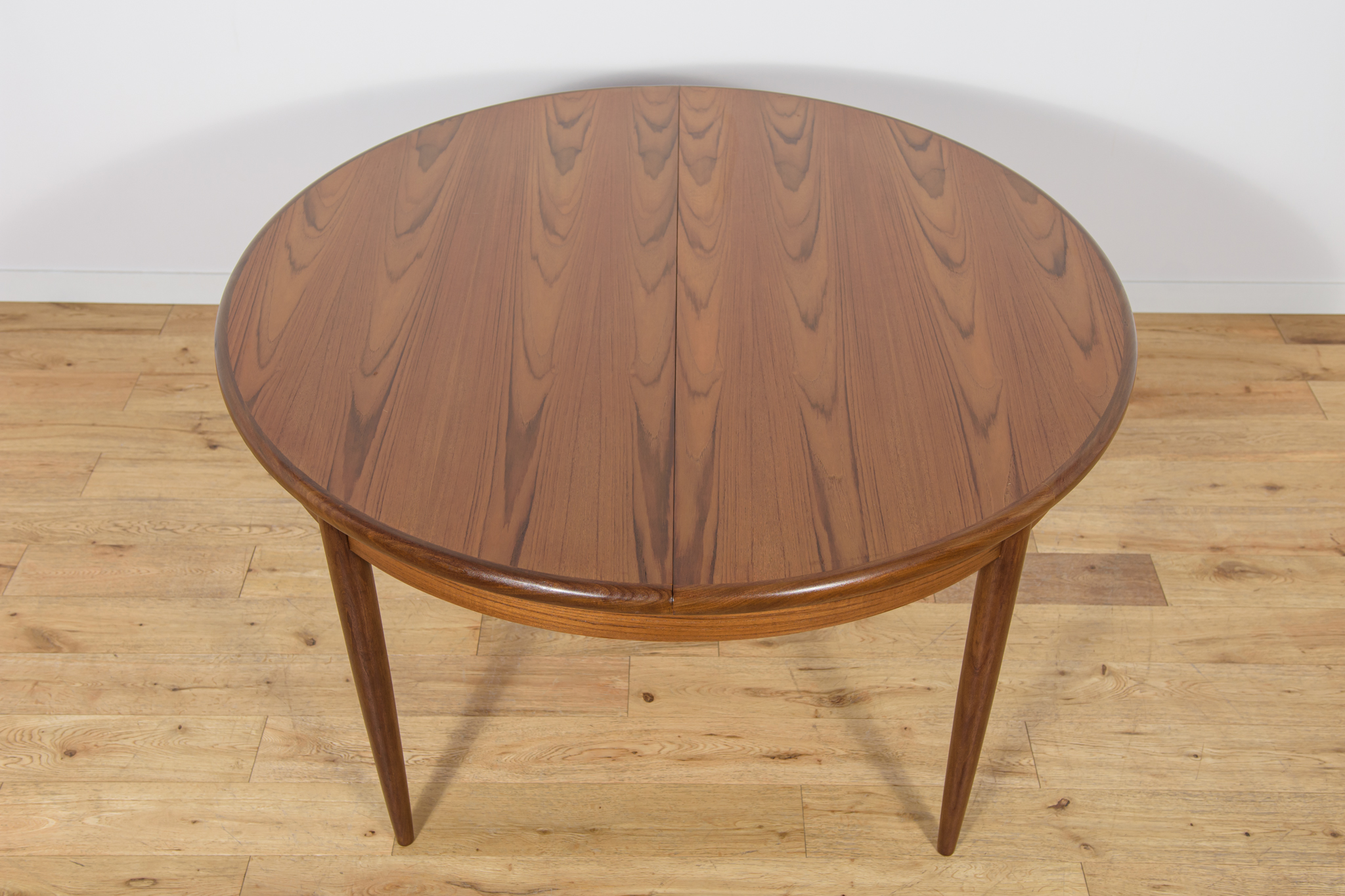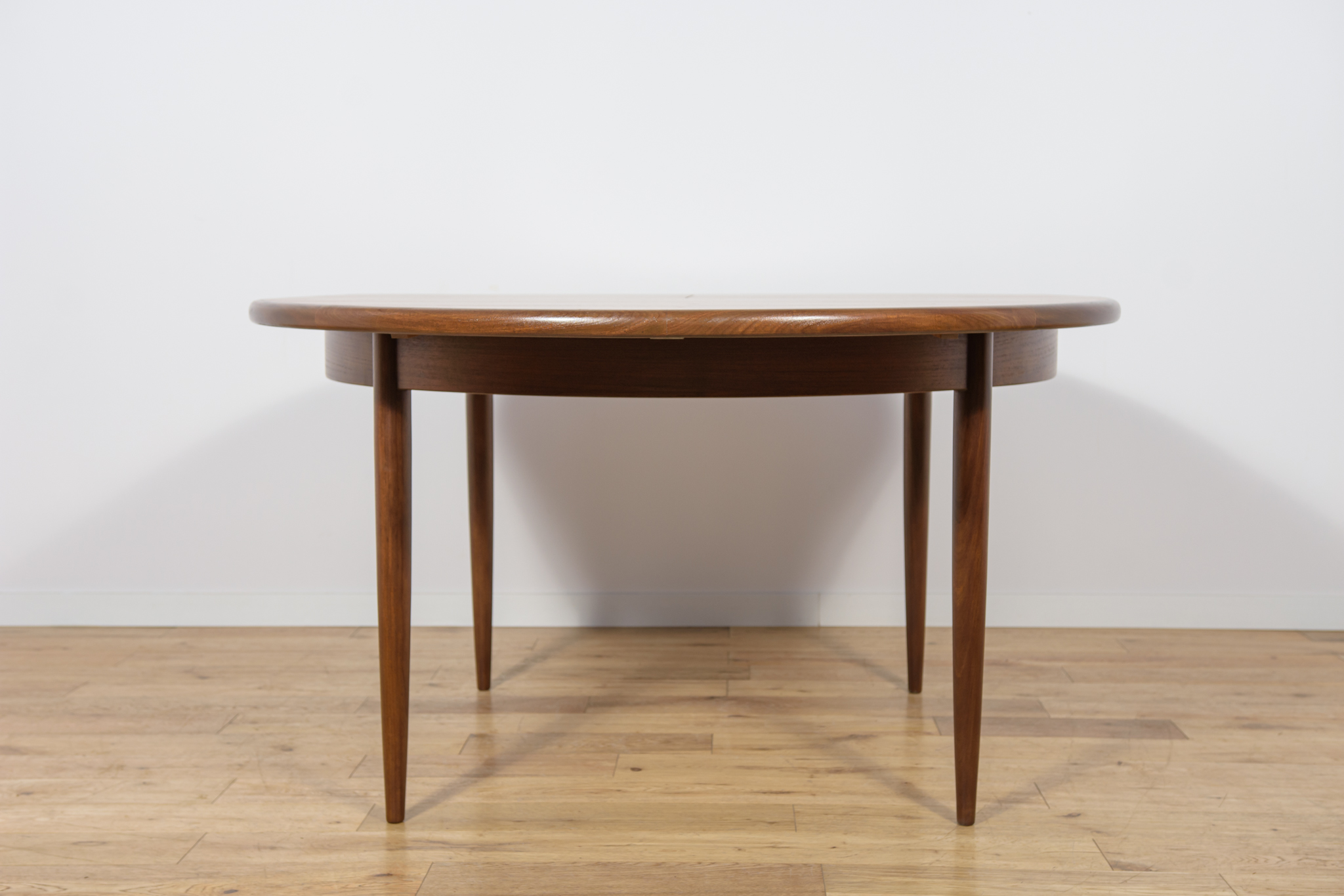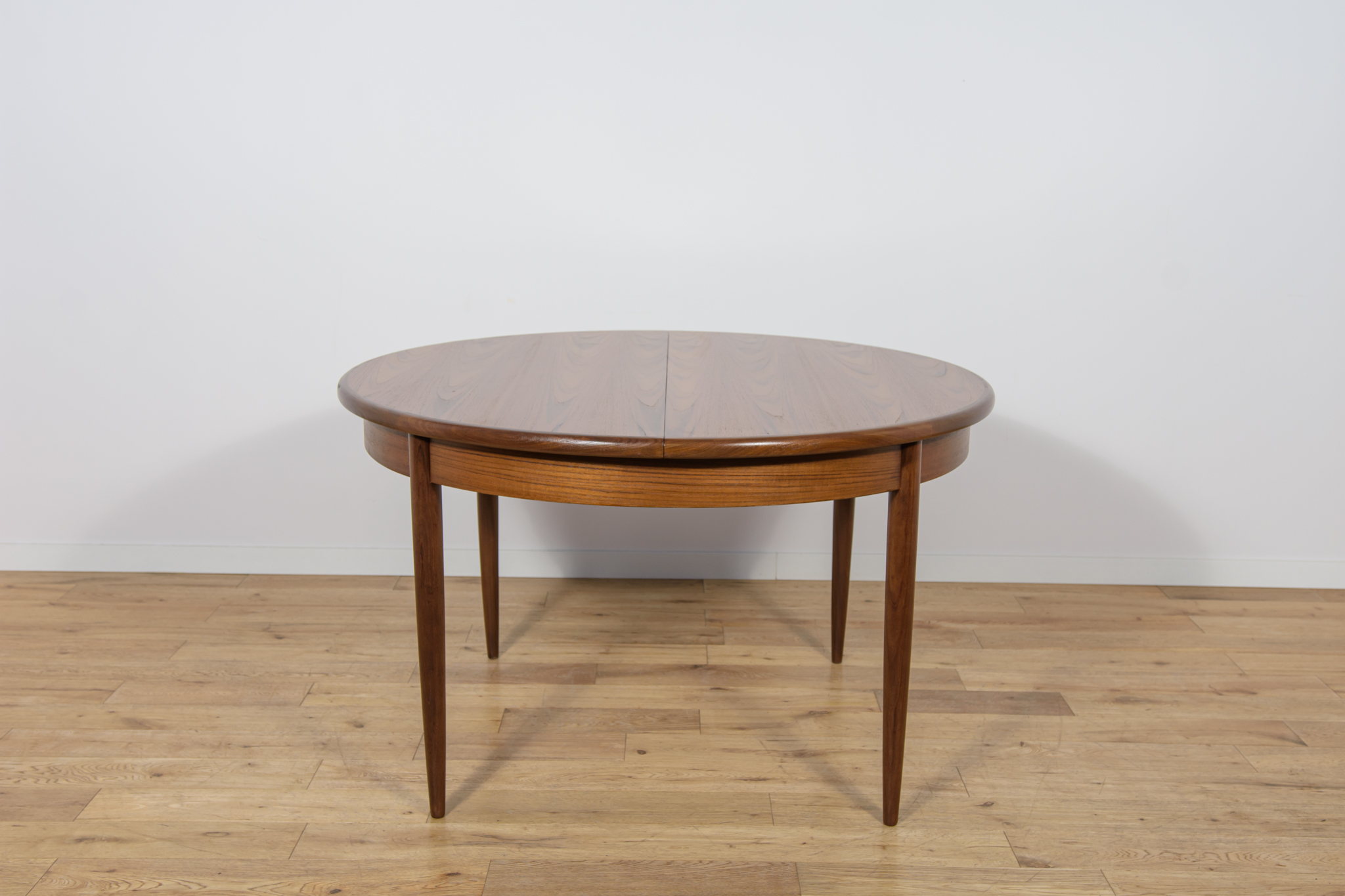 This round extendable dining table was produced by G-Plan in the 1960s. The table has profiled reinforced edges of the top. Teak elements cleaned old coating and painted in an oak stain and finished with strong semi-matt lacquer. The table has a mechanism that facilitates unfolding. The table extends from 122 cm to 168 cm.