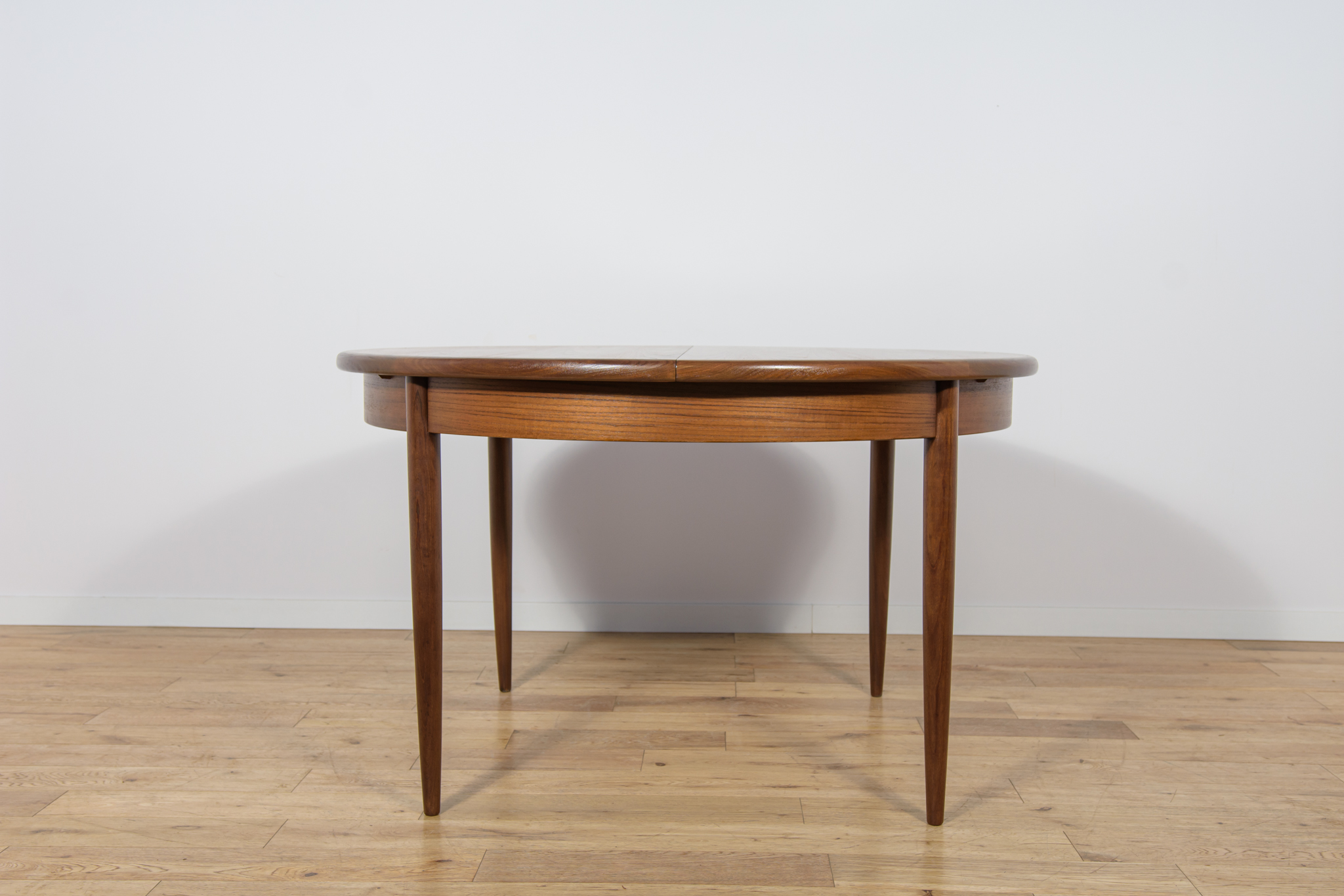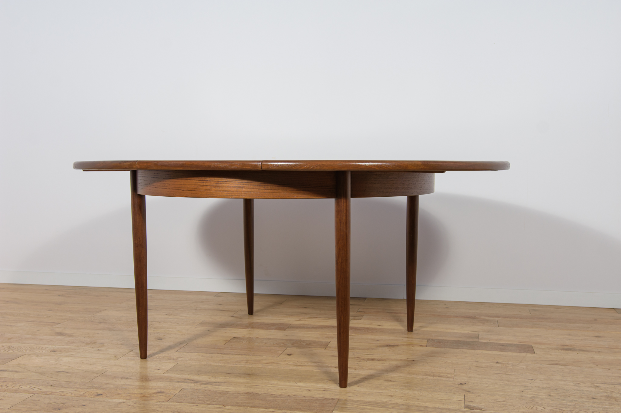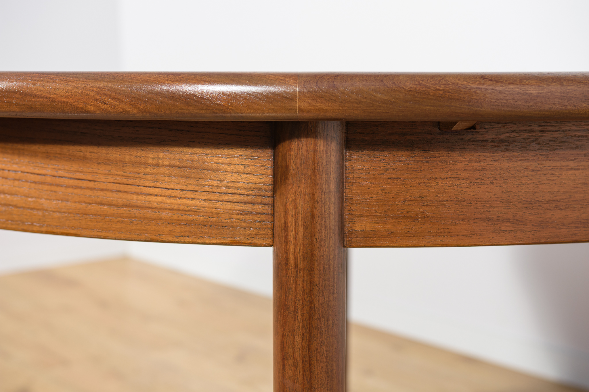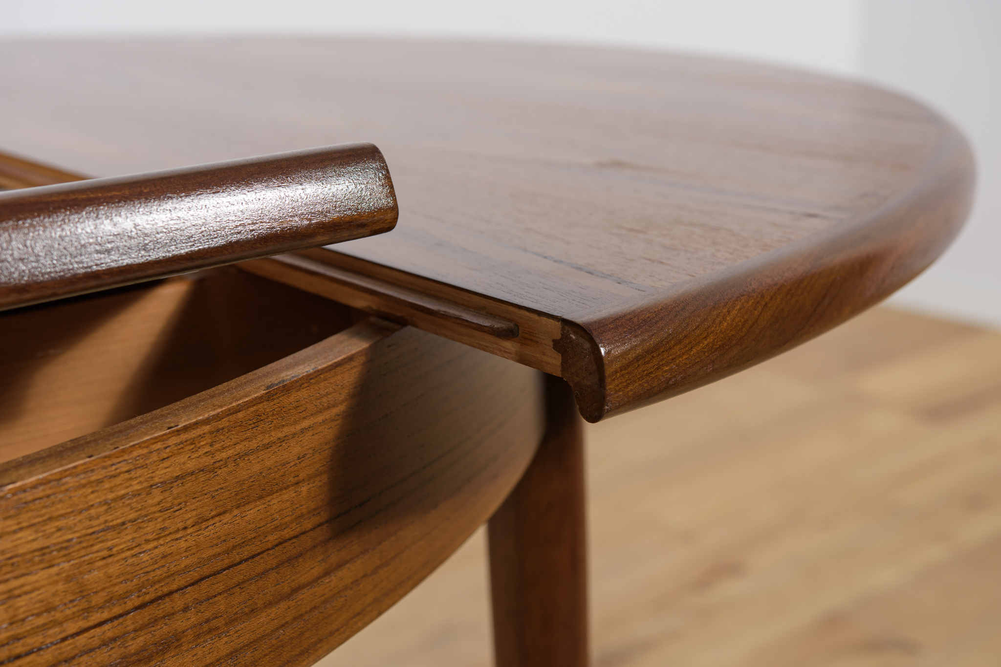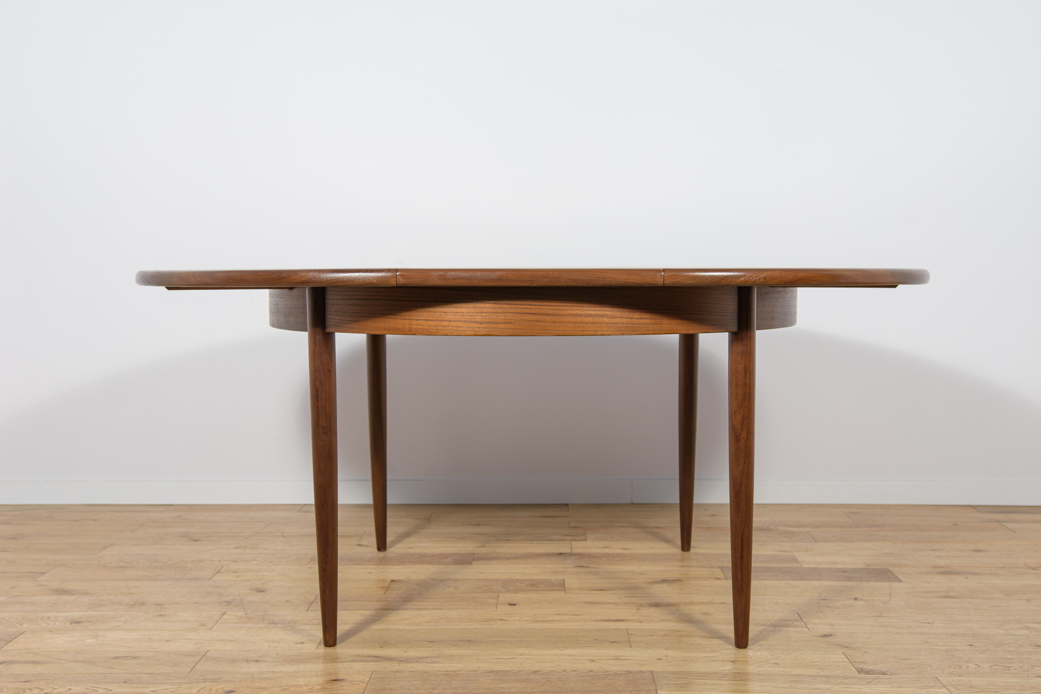 This round extendable dining table was produced by G-Plan in the 1960s. The table has profiled reinforced edges of the top. Teak elements cleaned old coating and painted in an oak stain and finished with strong semi-matt lacquer. The table has a mechanism that facilitates unfolding. The table extends from 122 cm to 168 cm.
