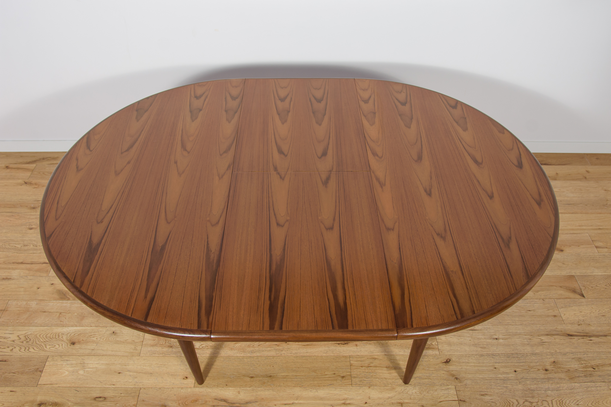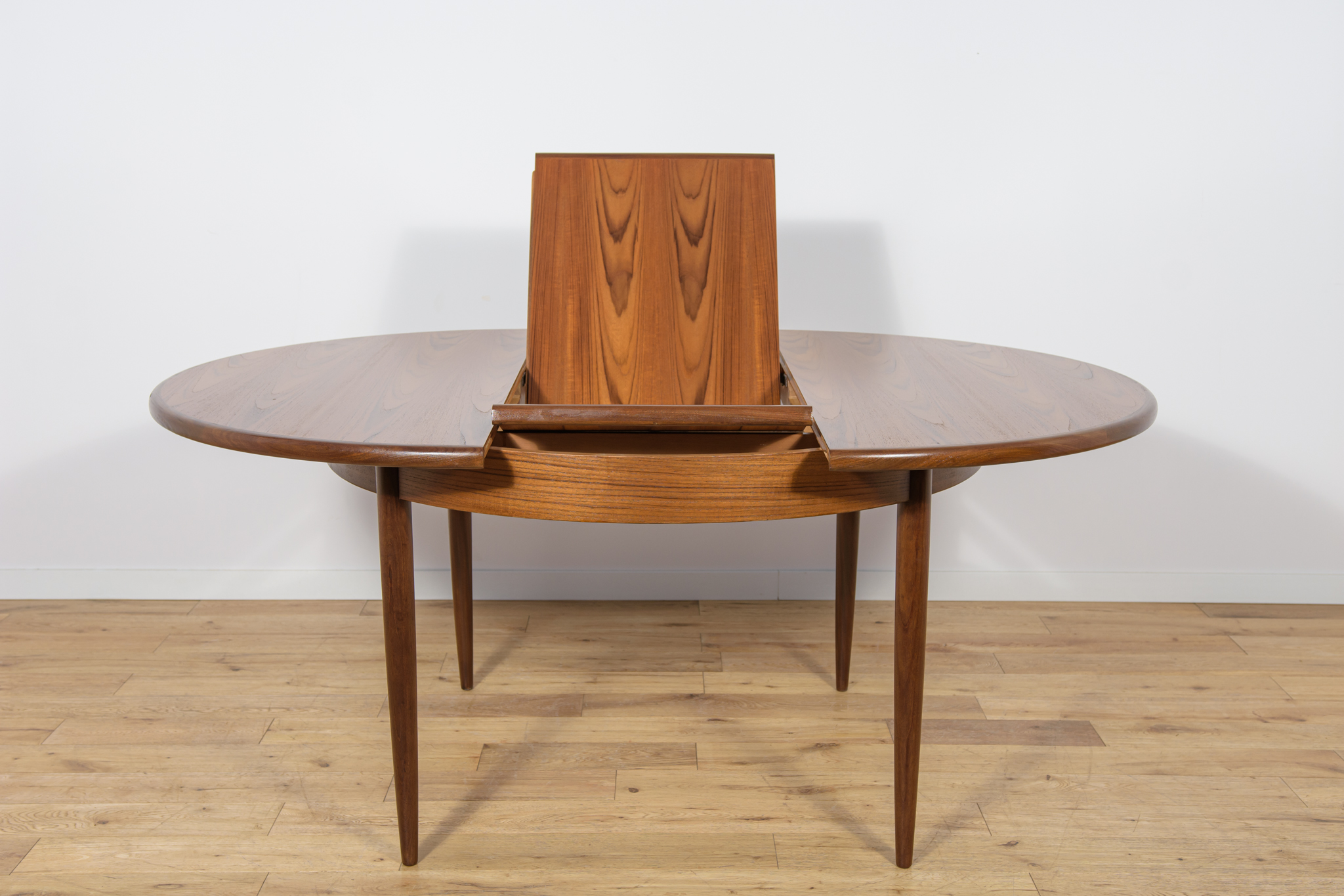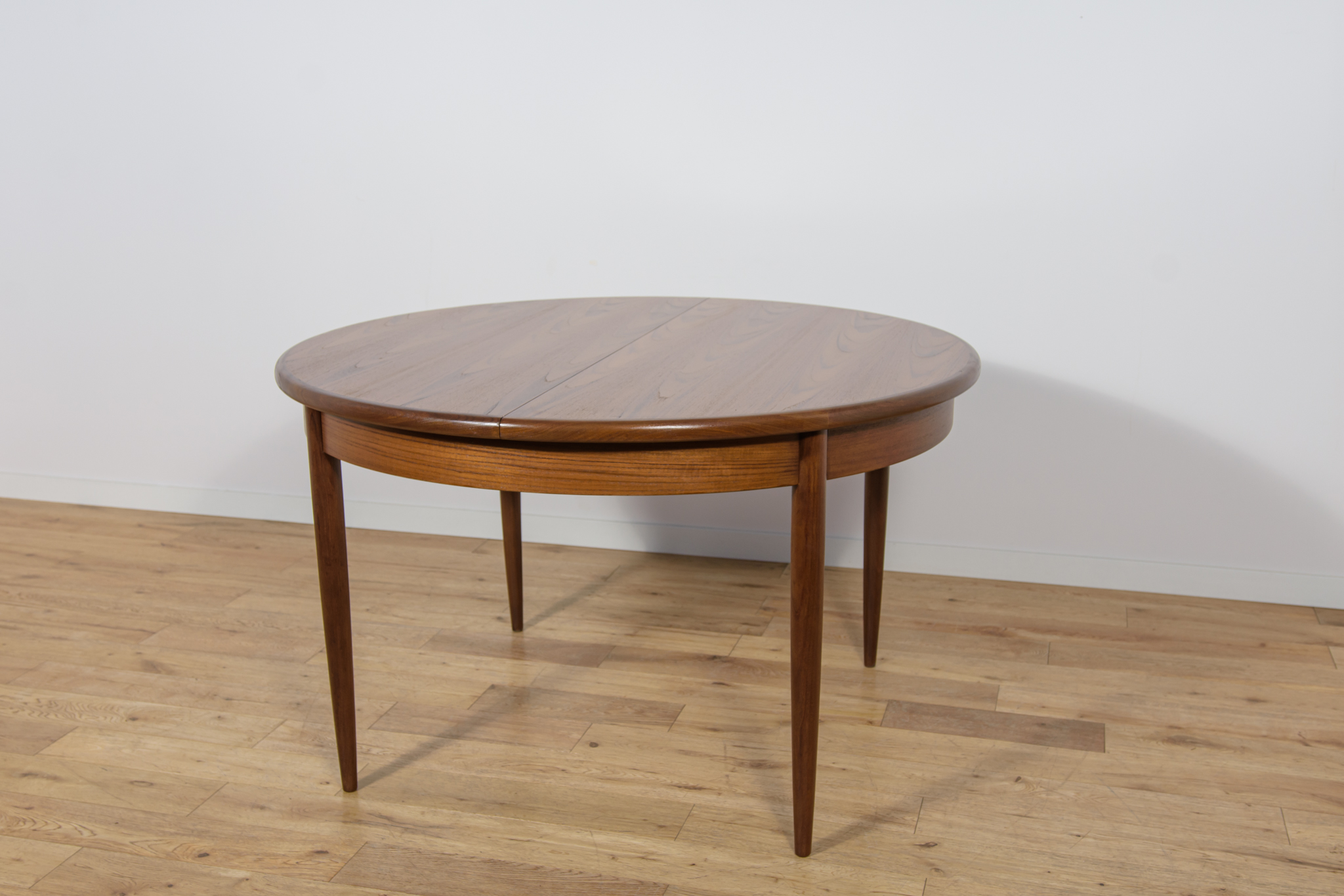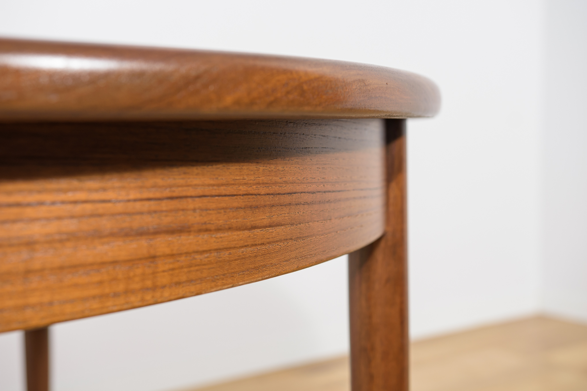 This round extendable dining table was produced by G-Plan in the 1960s. The table has profiled reinforced edges of the top. Teak elements cleaned old coating and painted in an oak stain and finished with strong semi-matt lacquer. The table has a mechanism that facilitates unfolding. The table extends from 122 cm to 168 cm.