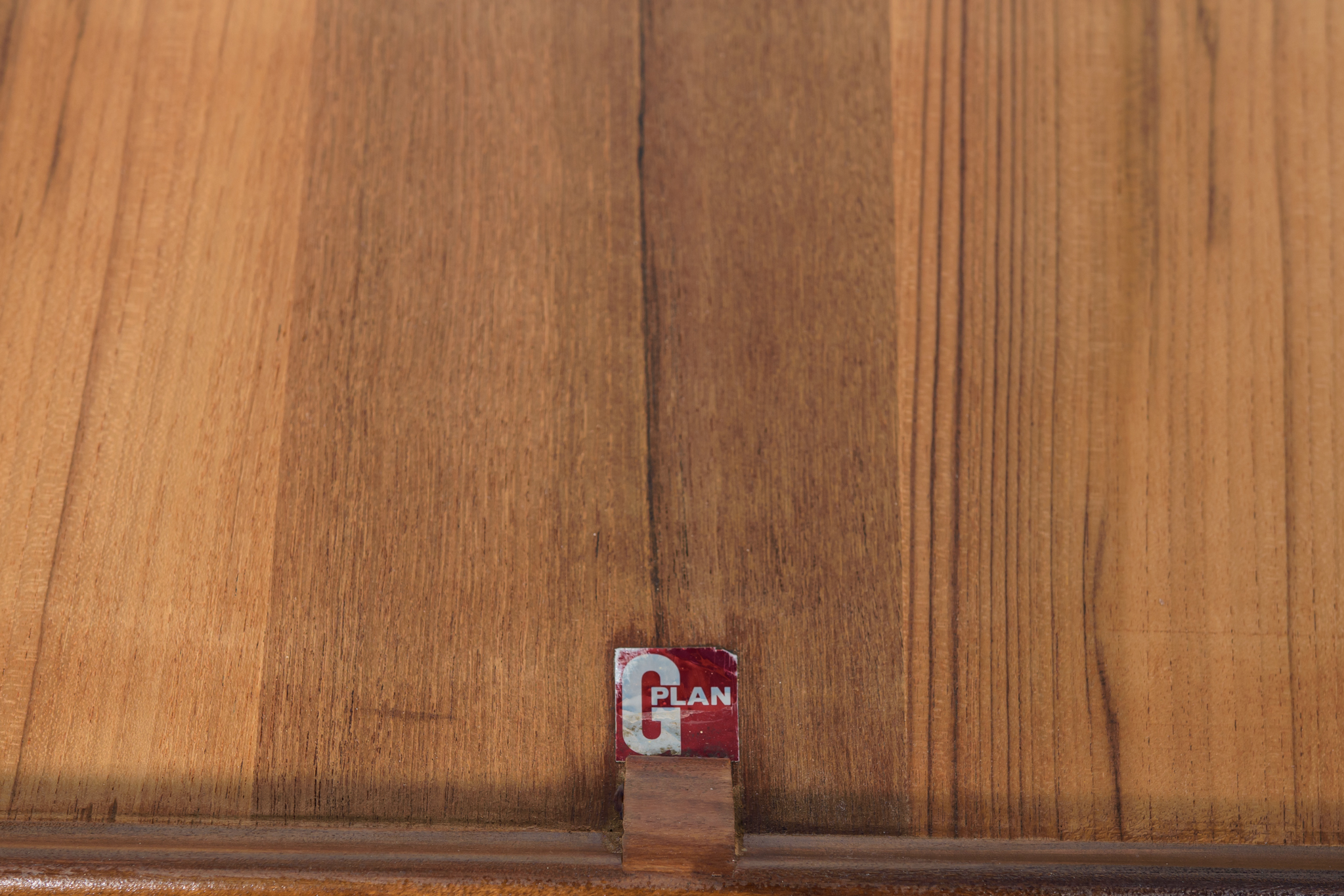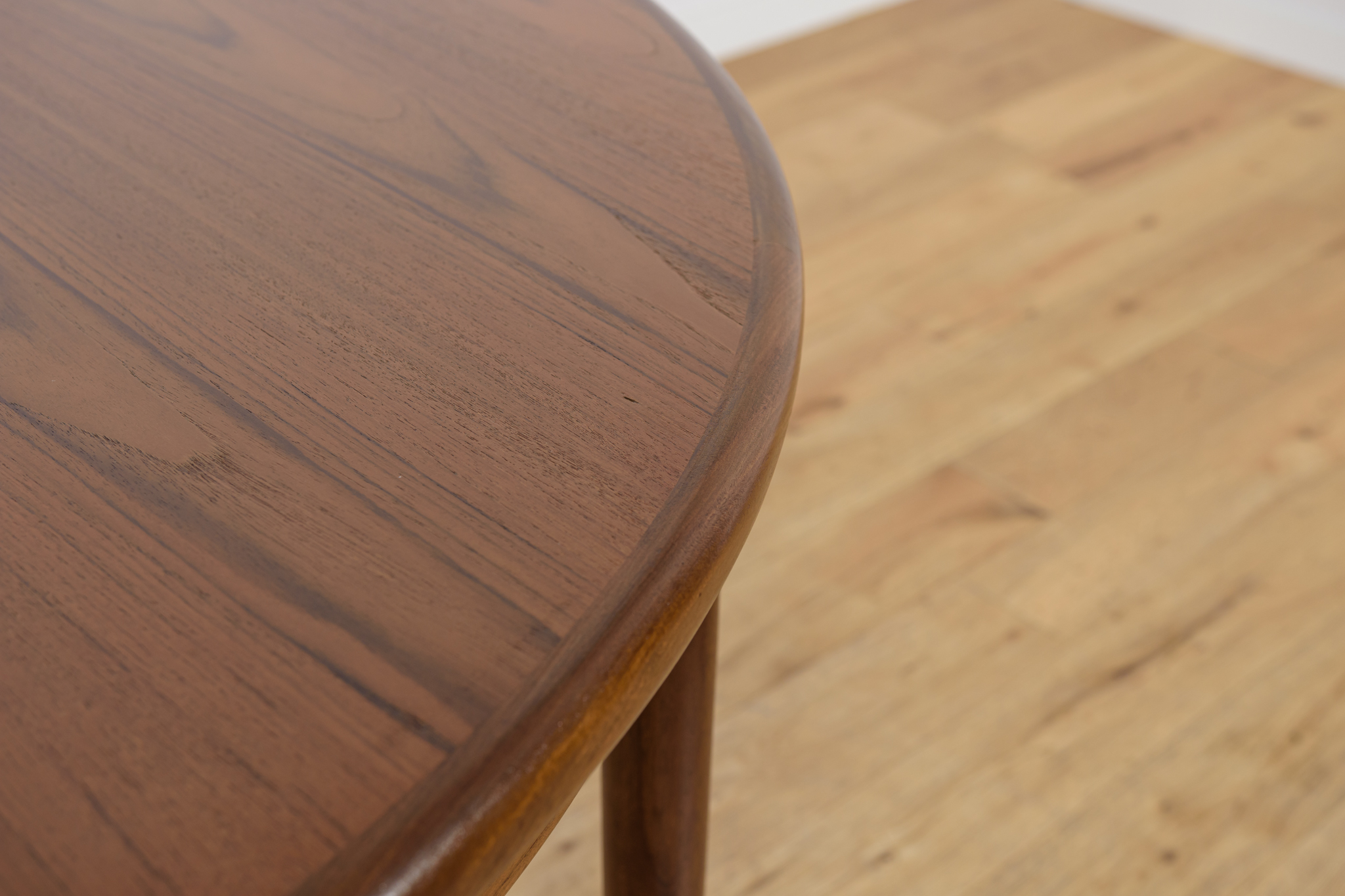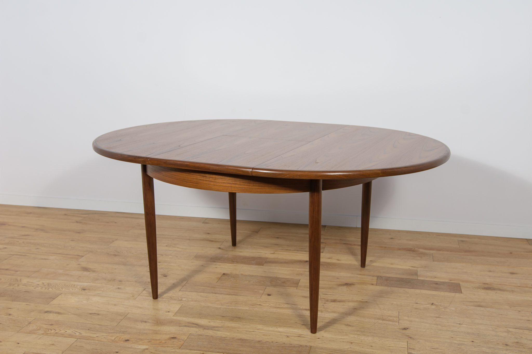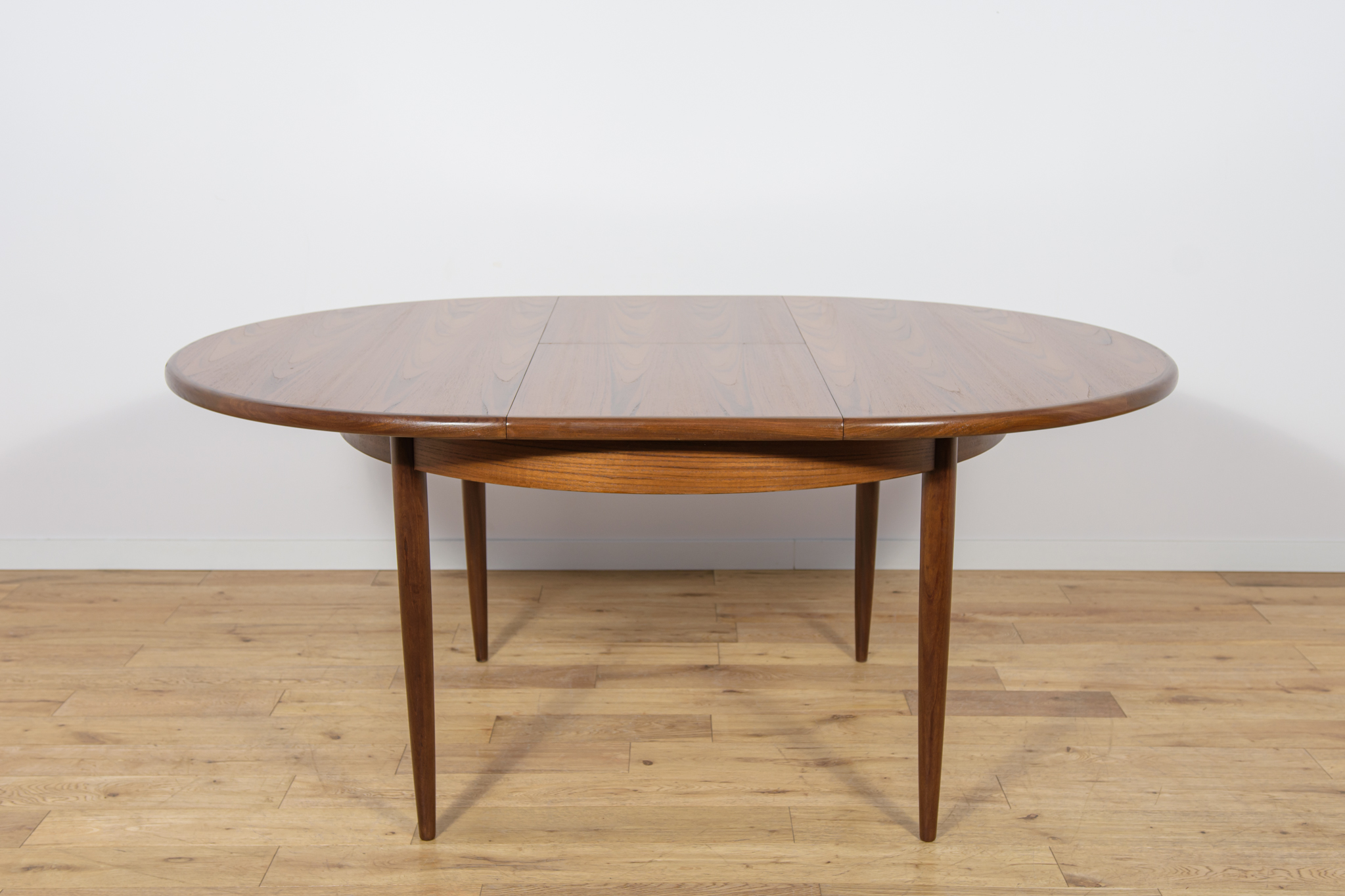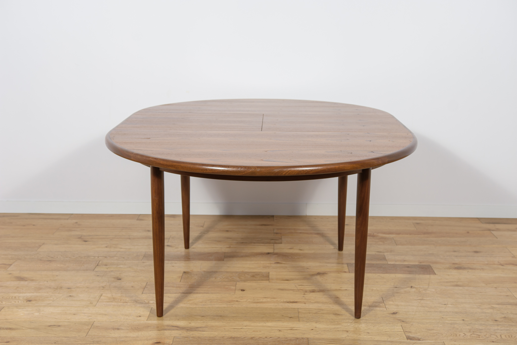 This round extendable dining table was produced by G-Plan in the 1960s. The table has profiled reinforced edges of the top. Teak elements cleaned old coating and painted in an oak stain and finished with strong semi-matt lacquer. The table has a mechanism that facilitates unfolding. The table extends from 122 cm to 168 cm.