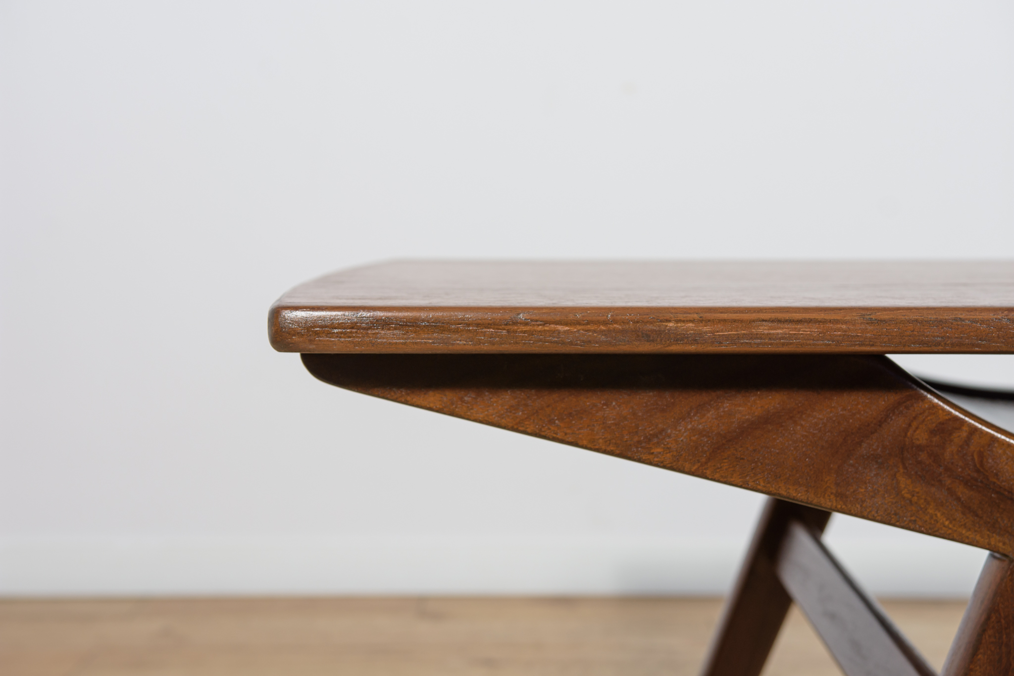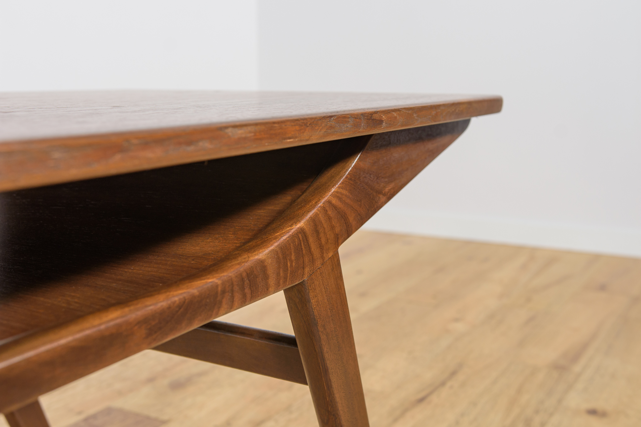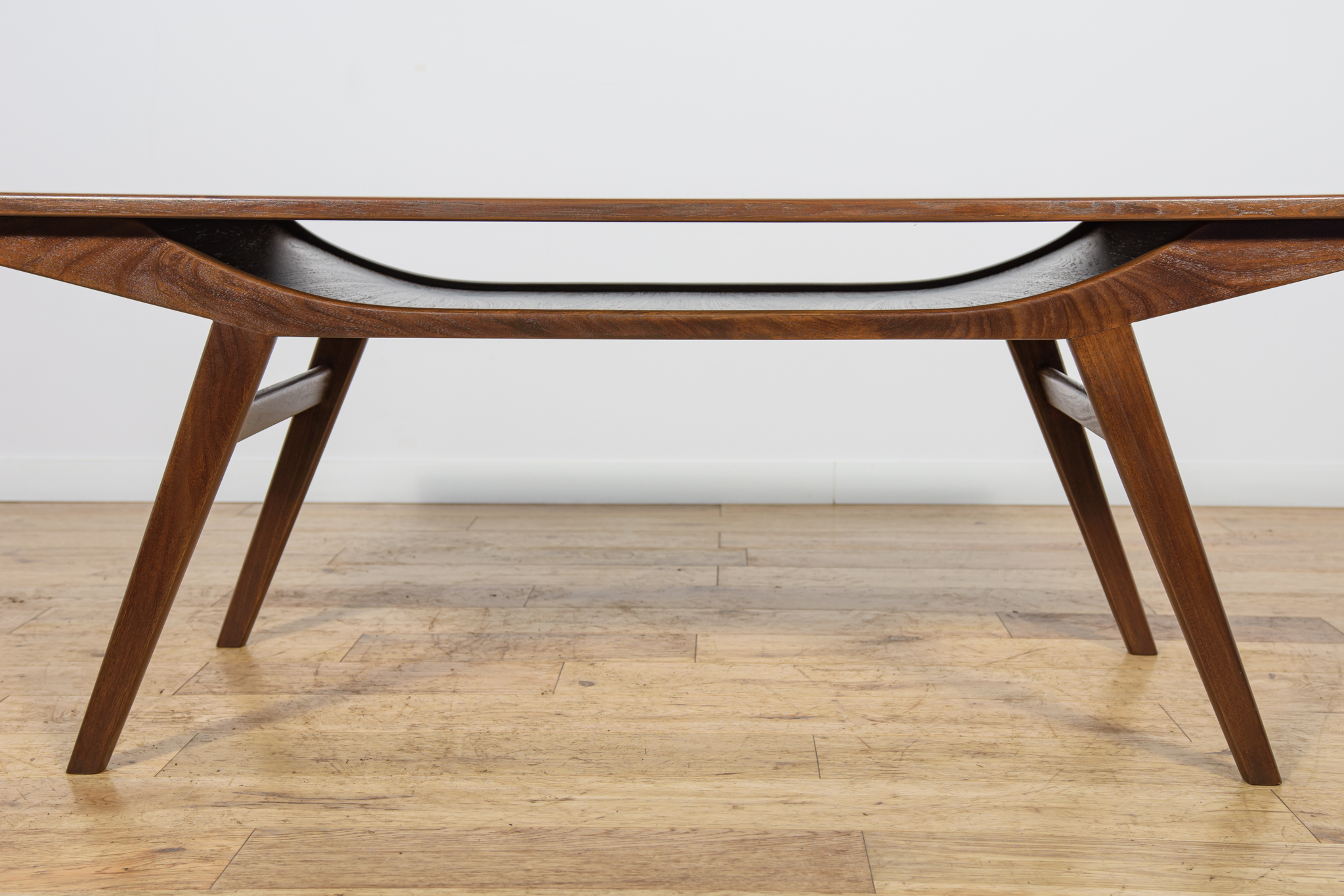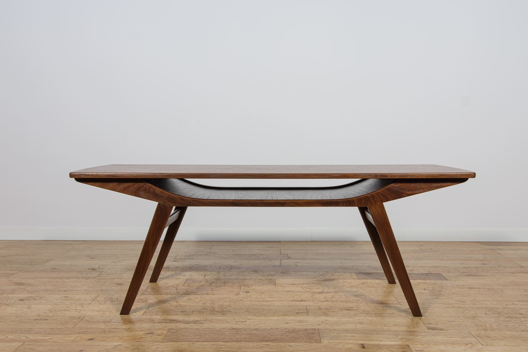 This coffee table, with its light, refined form and exquisite craftsmanship, was made of teak wood in the 1960s in Denmark. The table has undergone a comprehensive carpentry renovation, stripped of its old coating, painted with oak stain, and finished with a stronq semi-matte varnish.