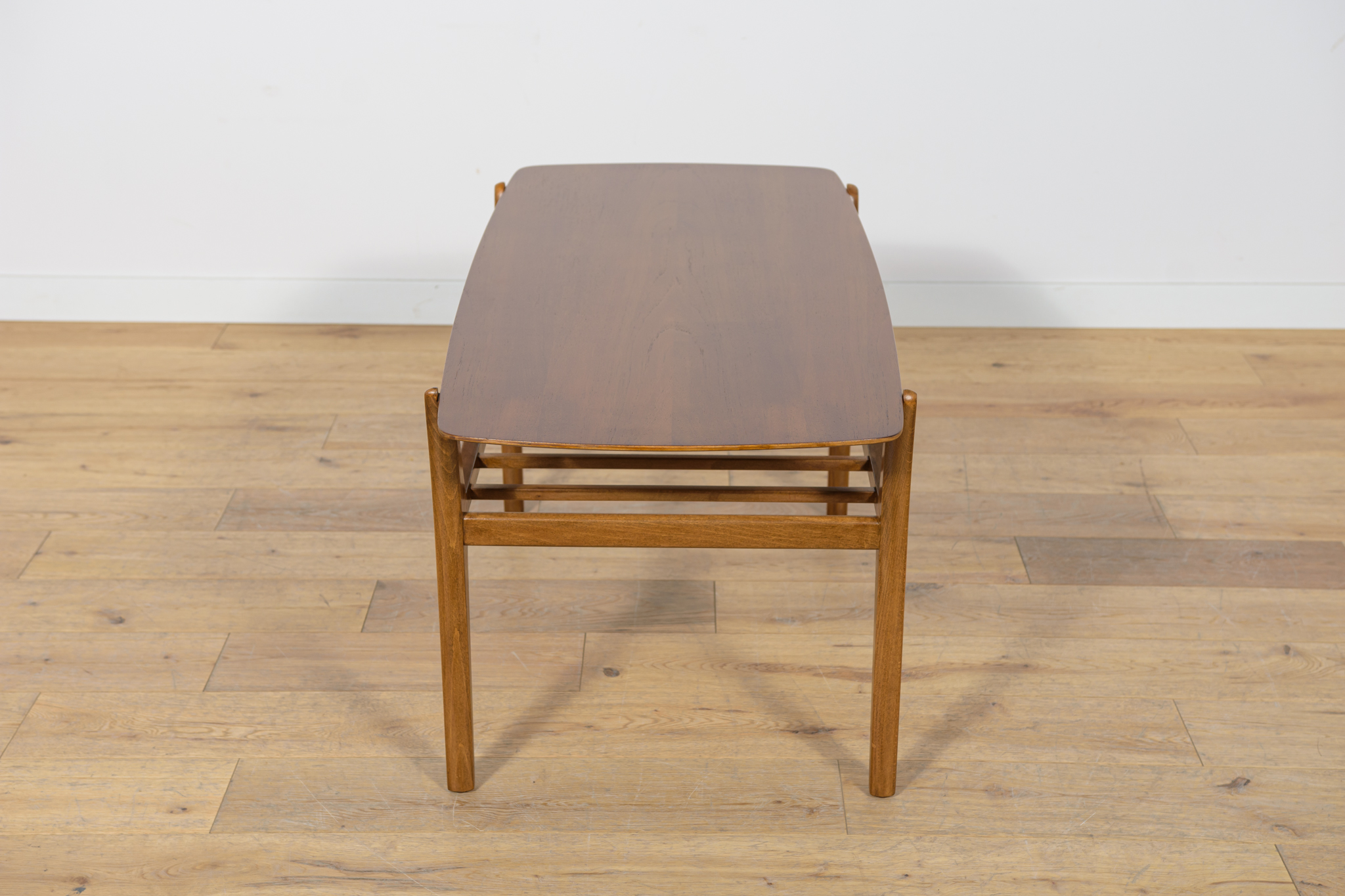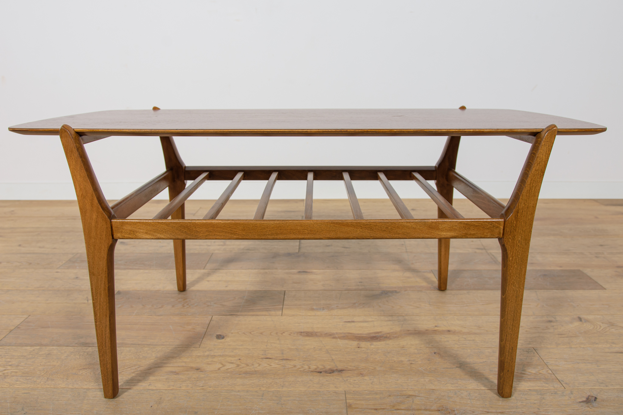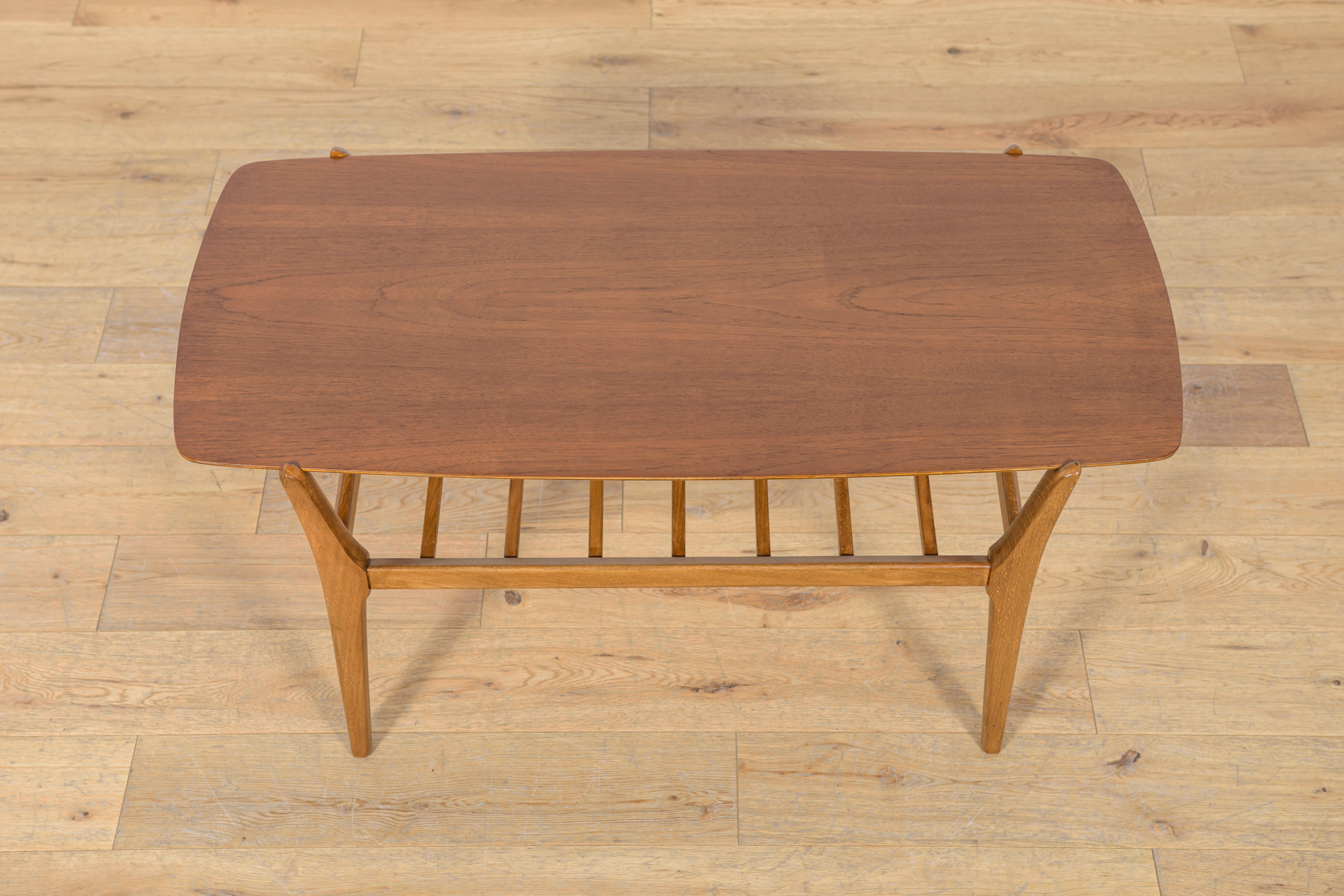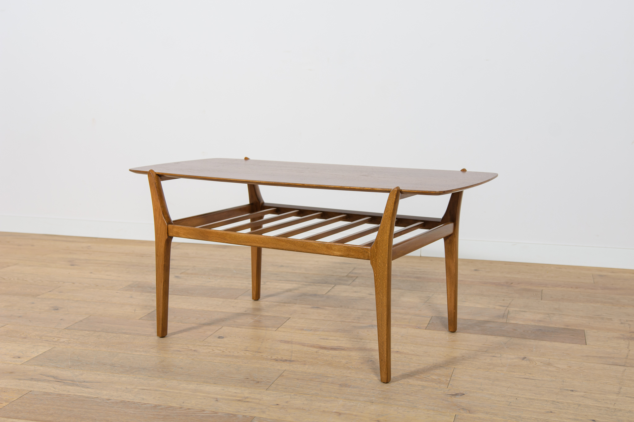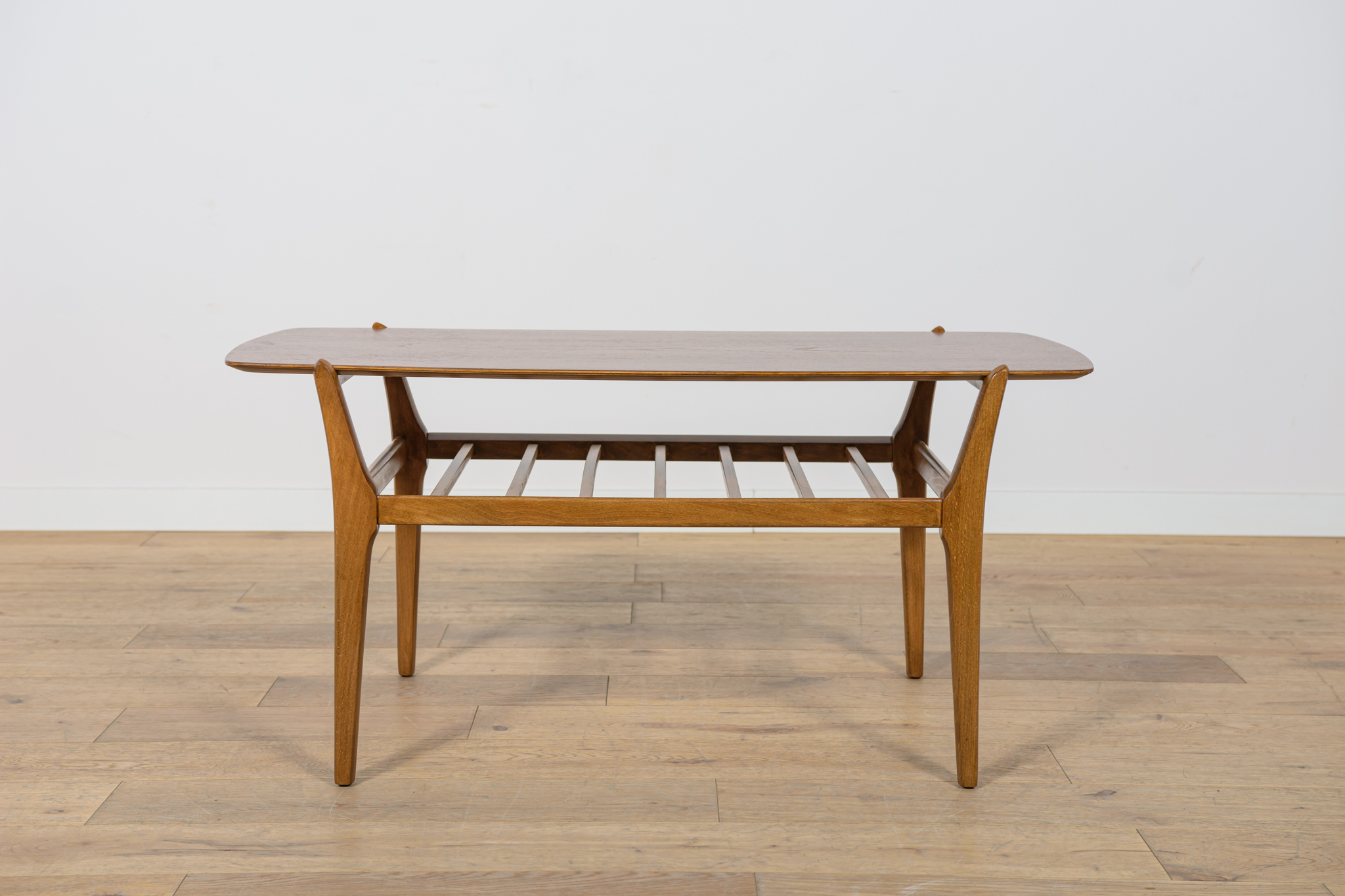 This coffee table was produced by the British Nathan factory in the 1960s. It boasts a delicate, light, and refined form. The tabletop is made of teak veneer and the legs are made of beechwood. The entire piece has undergone a comprehensive carpentry renovation. The wood has been cleaned of the old surface, painted with an oak stain, and finished with a stronq semi-matte varnish.