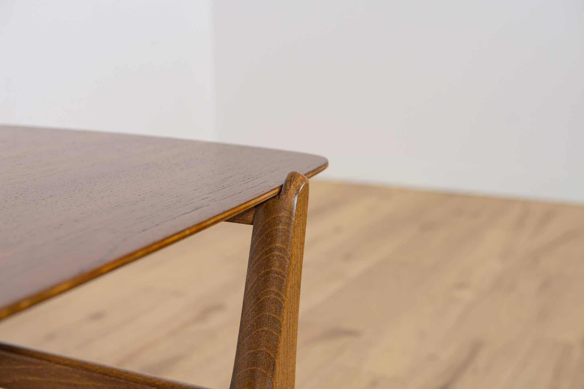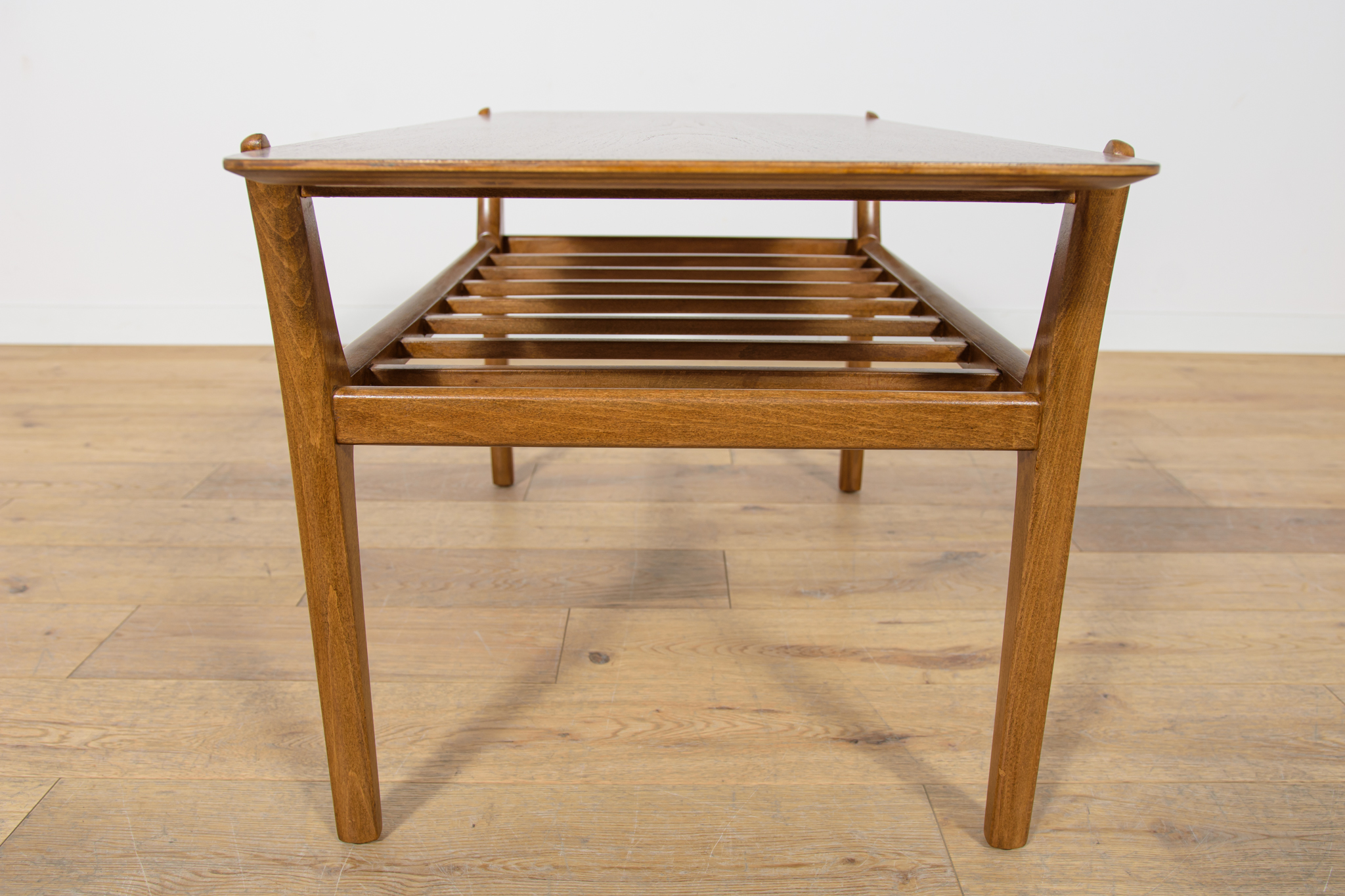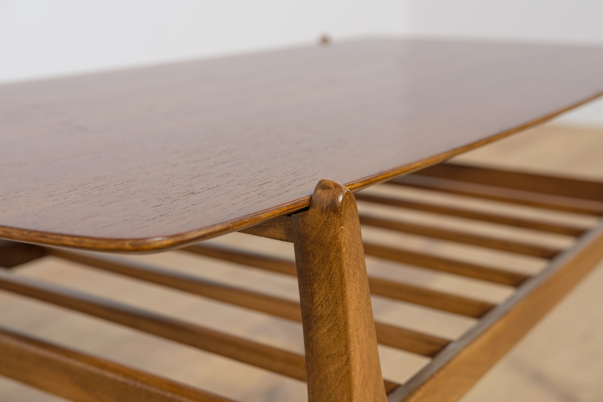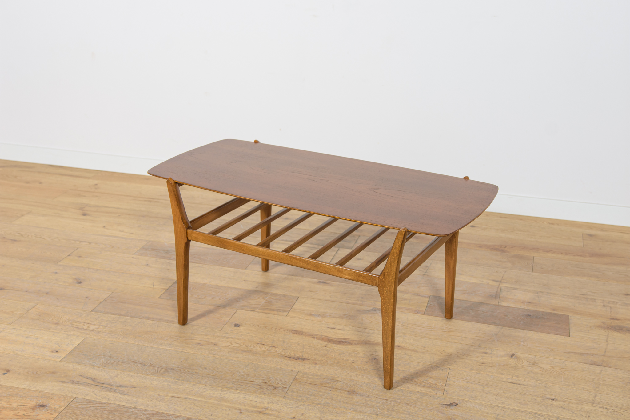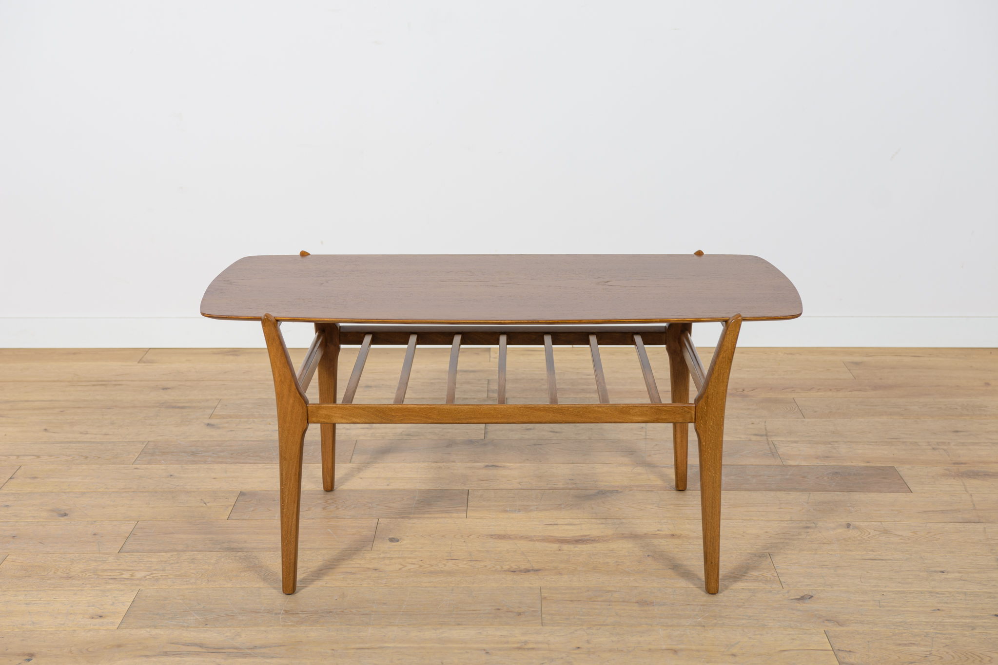 This coffee table was produced by the British Nathan factory in the 1960s. It boasts a delicate, light, and refined form. The tabletop is made of teak veneer and the legs are made of beechwood. The entire piece has undergone a comprehensive carpentry renovation. The wood has been cleaned of the old surface, painted with an oak stain, and finished with a stronq semi-matte varnish.