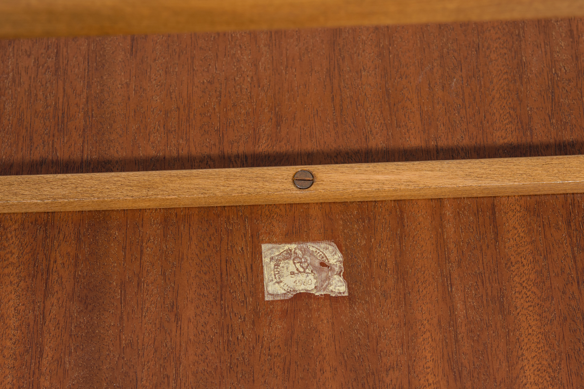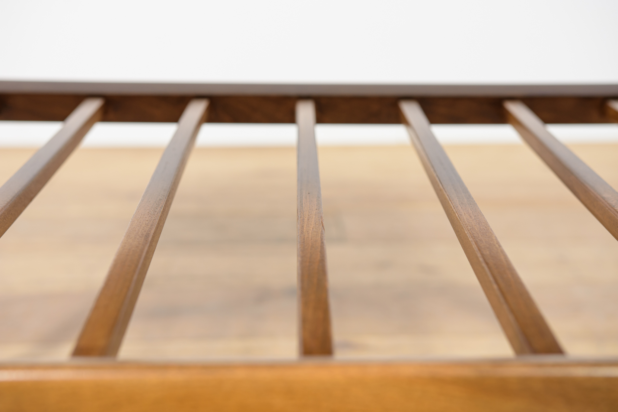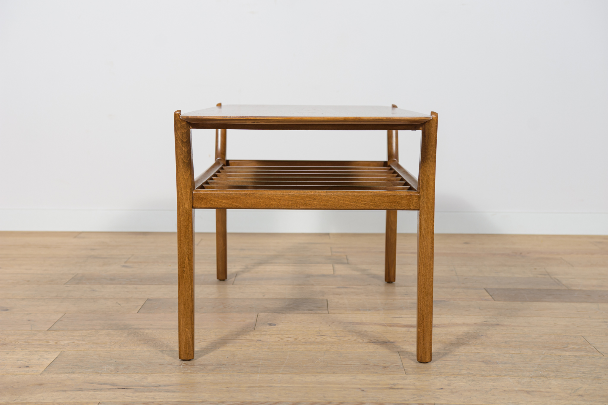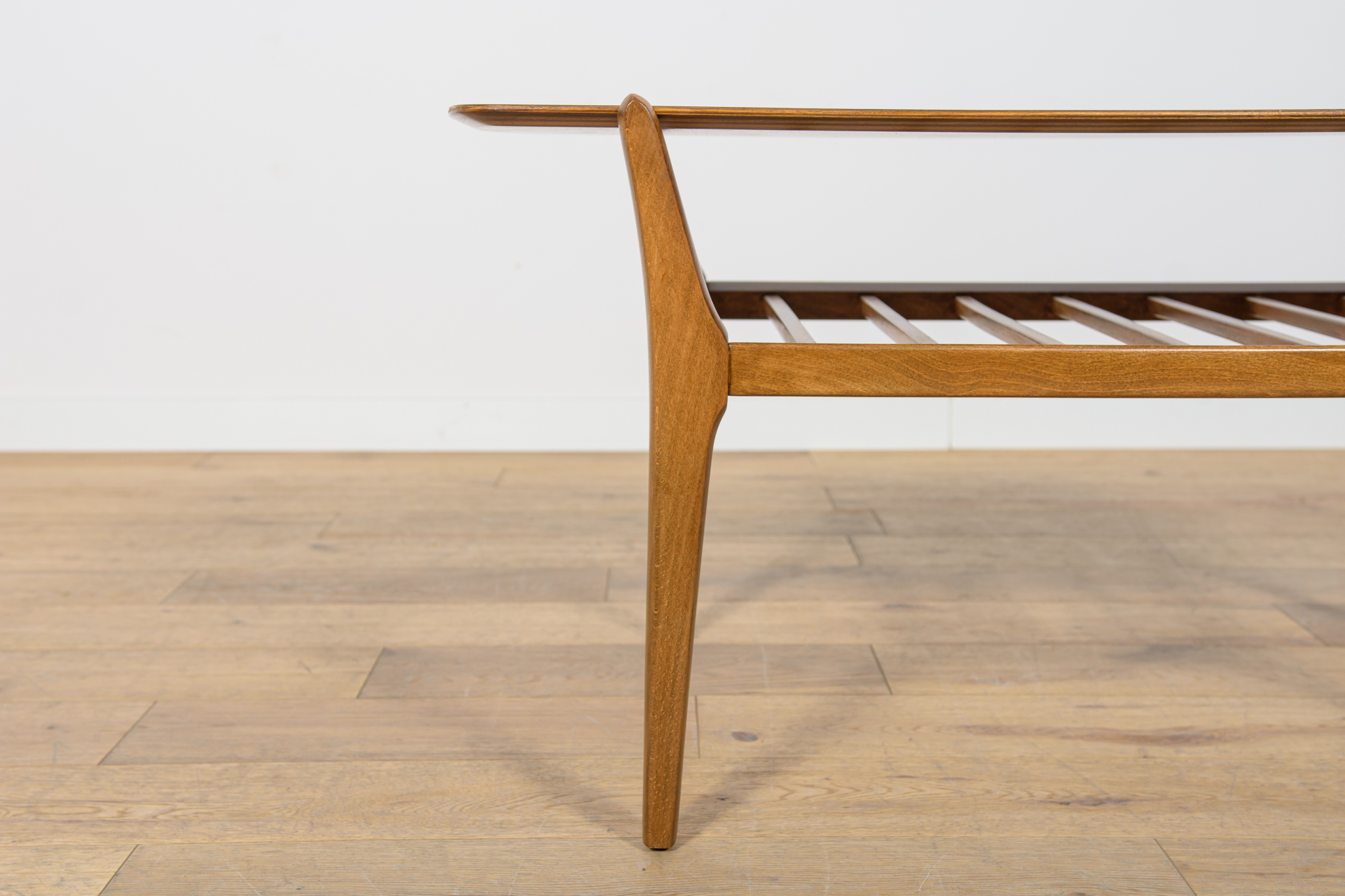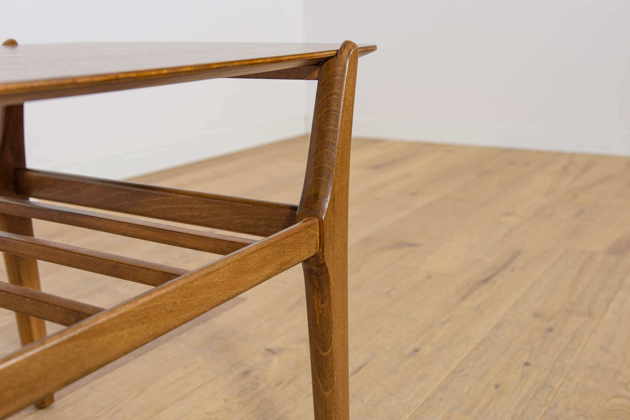 This coffee table was produced by the British Nathan factory in the 1960s. It boasts a delicate, light, and refined form. The tabletop is made of teak veneer and the legs are made of beechwood. The entire piece has undergone a comprehensive carpentry renovation. The wood has been cleaned of the old surface, painted with an oak stain, and finished with a stronq semi-matte varnish.