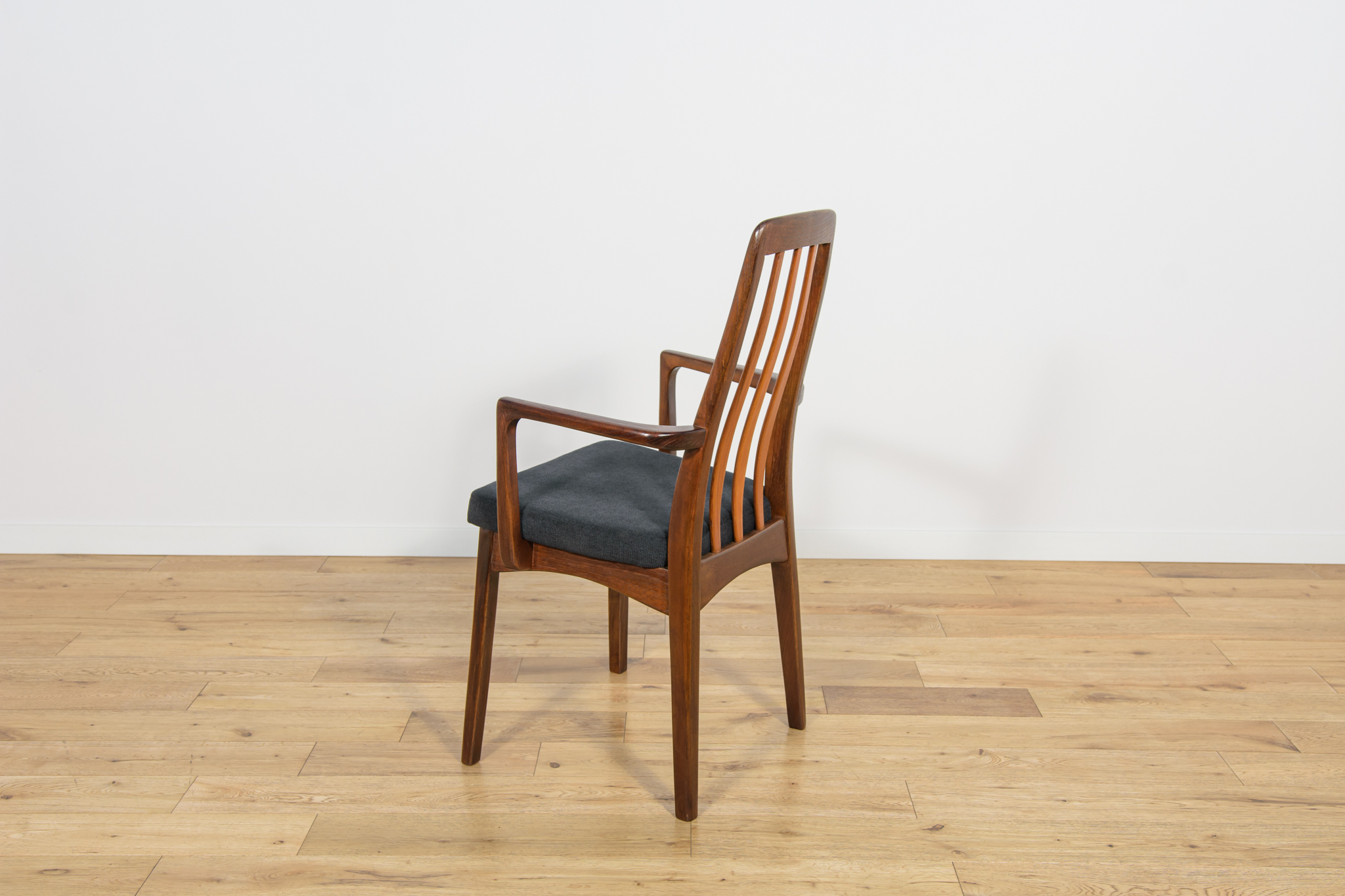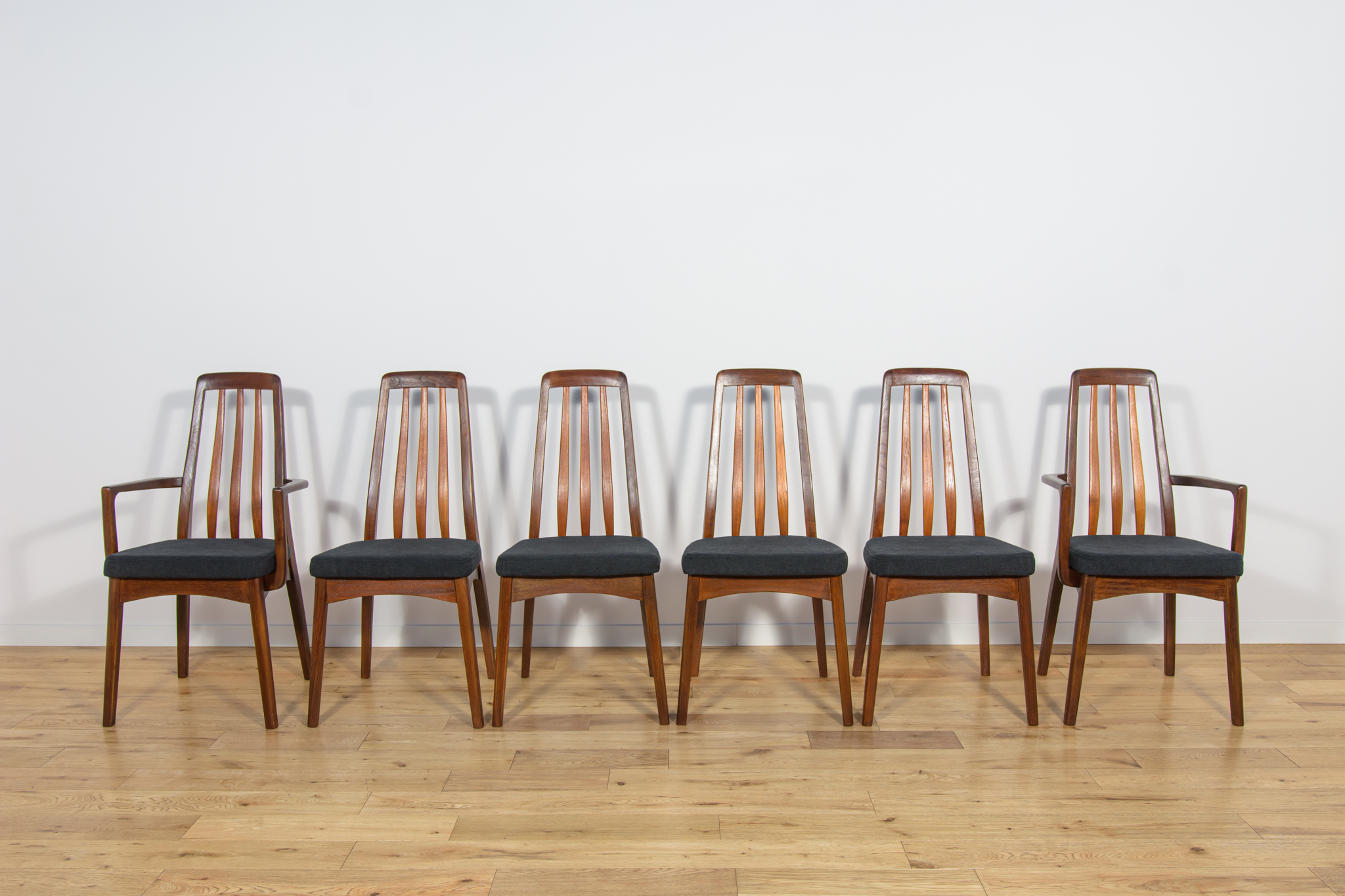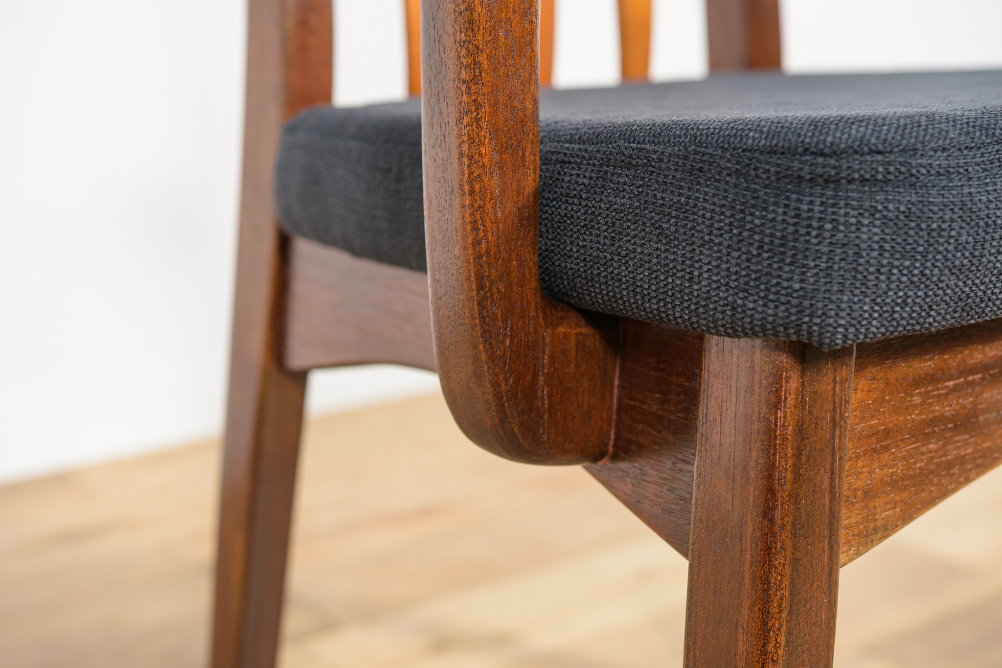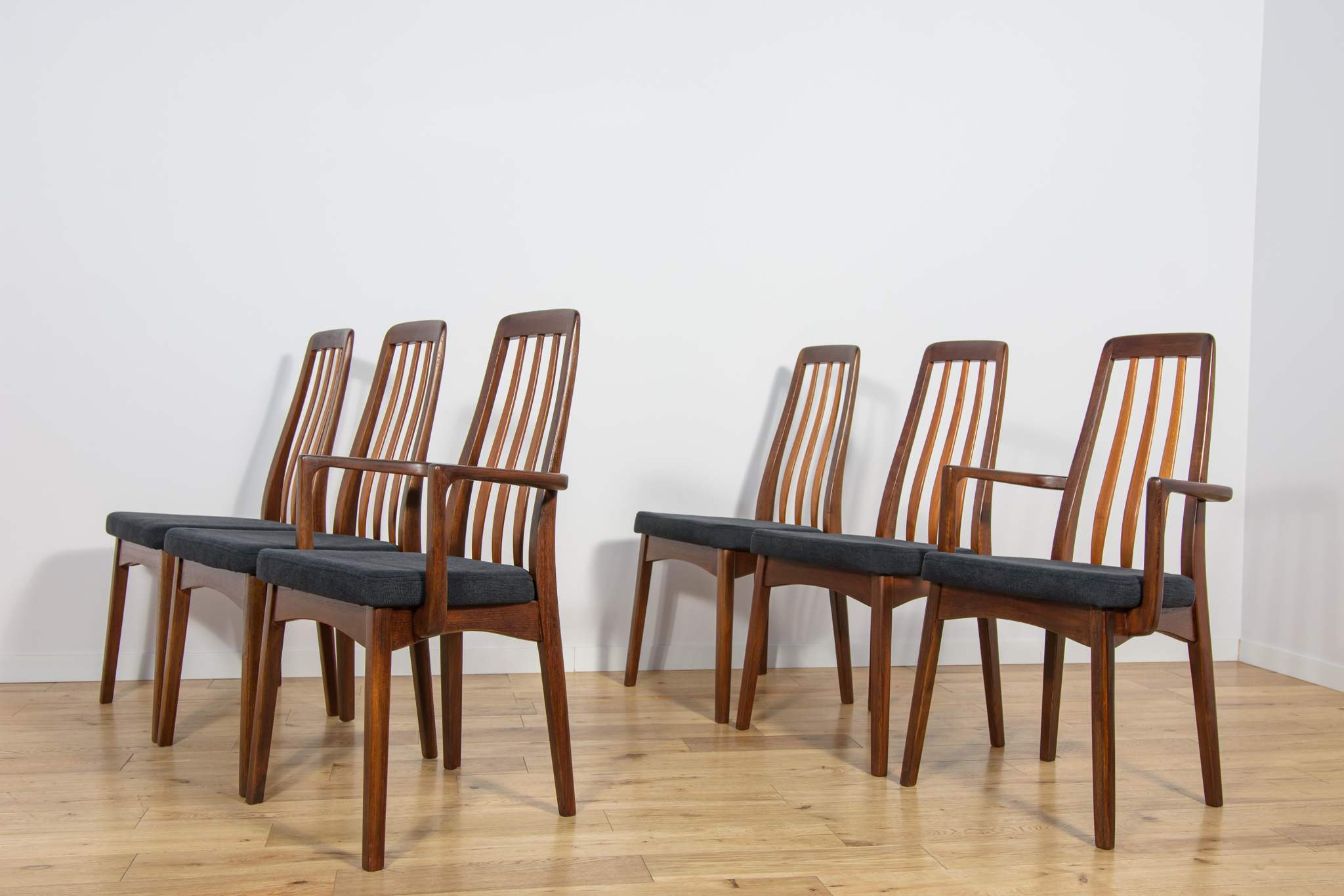 Dining chairs made in United Knigdom the 1960s. . Made from solid teak. Wood elements have been cleaned from the old surface and finished with very quality Danish Oil. The foams have been replaced and covered in black fabric. The set consists of 4 chairs and two armchairs.