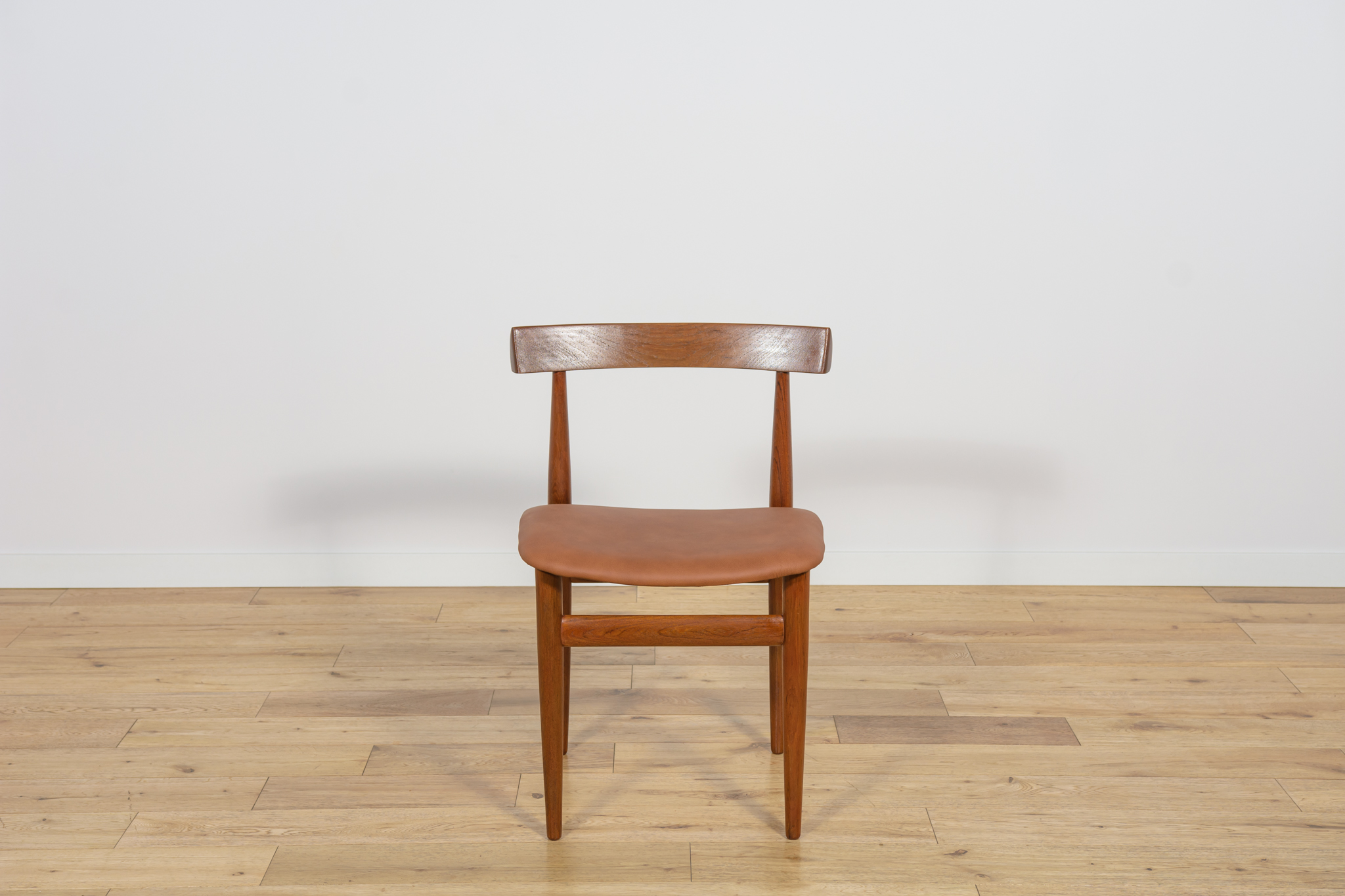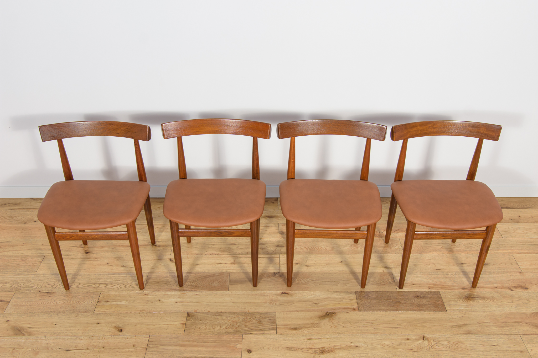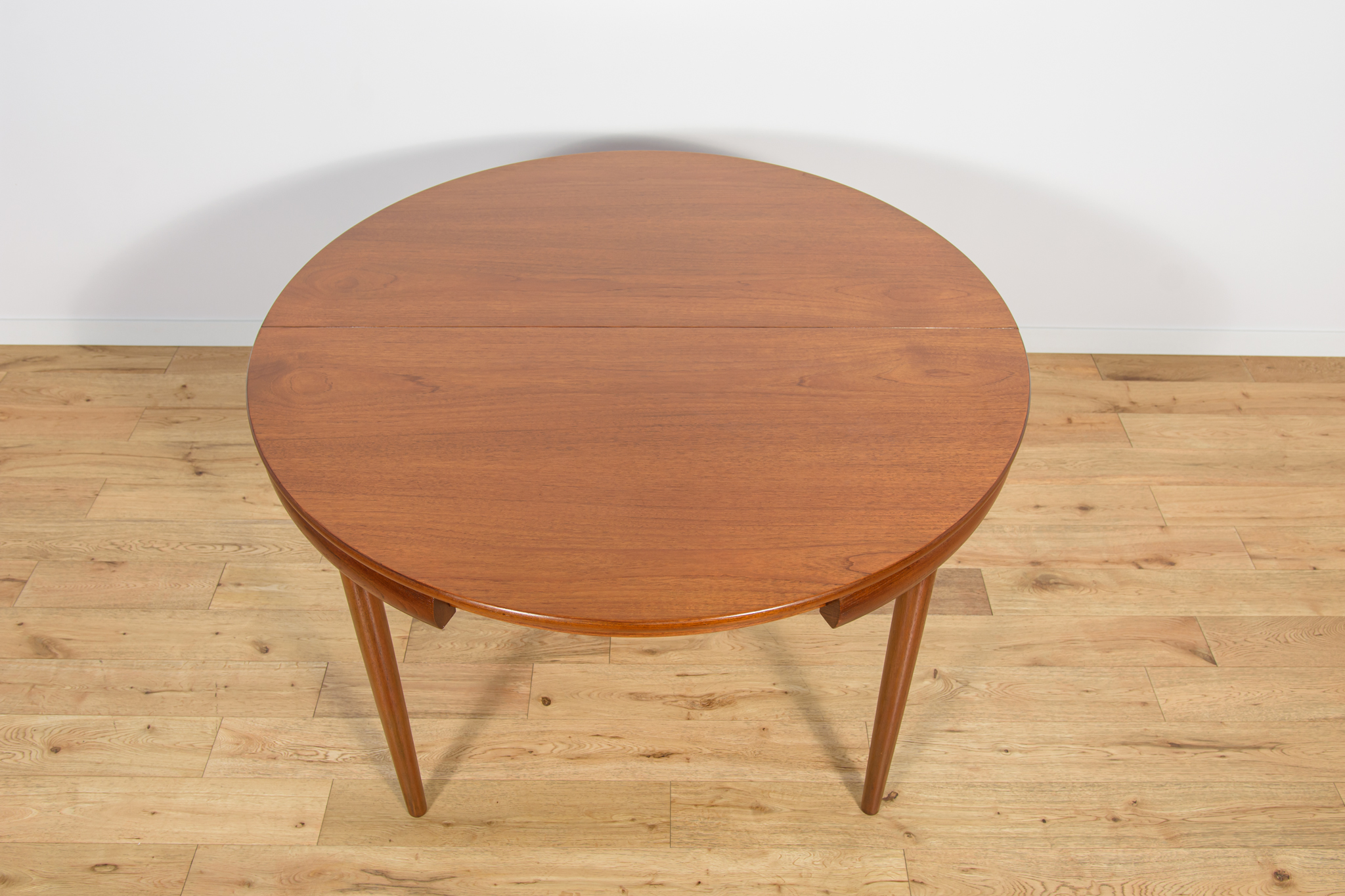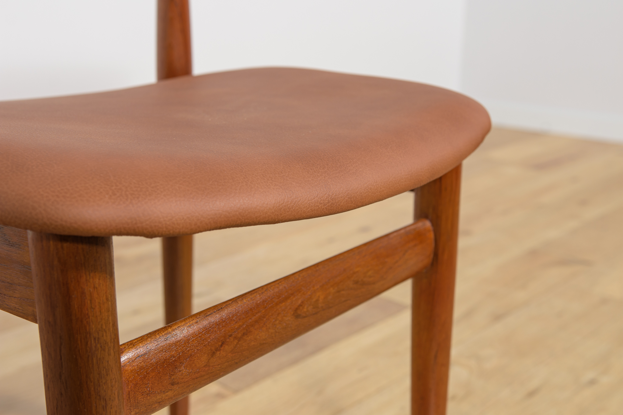 The set was designed by the Danish designer Hans Olsen for the Frem Røjle manufactory in 1962. The set consists of a table and four chairs. Hans Olsen used an innovative solution in his project by placing the backrests of the chairs in the edge of the table. The whole is after a comprehensive carpentry and upholstery renovation. The teak wood has been cleaned of the old coating, finished with very guality danish oil. Upholstery interiors have been replaced, upholstered with new, high-quality, natural leather in brown. The chairs and the table are signed. The table has a mechanism that facilitates unfolding. The table extends to 171 cm.