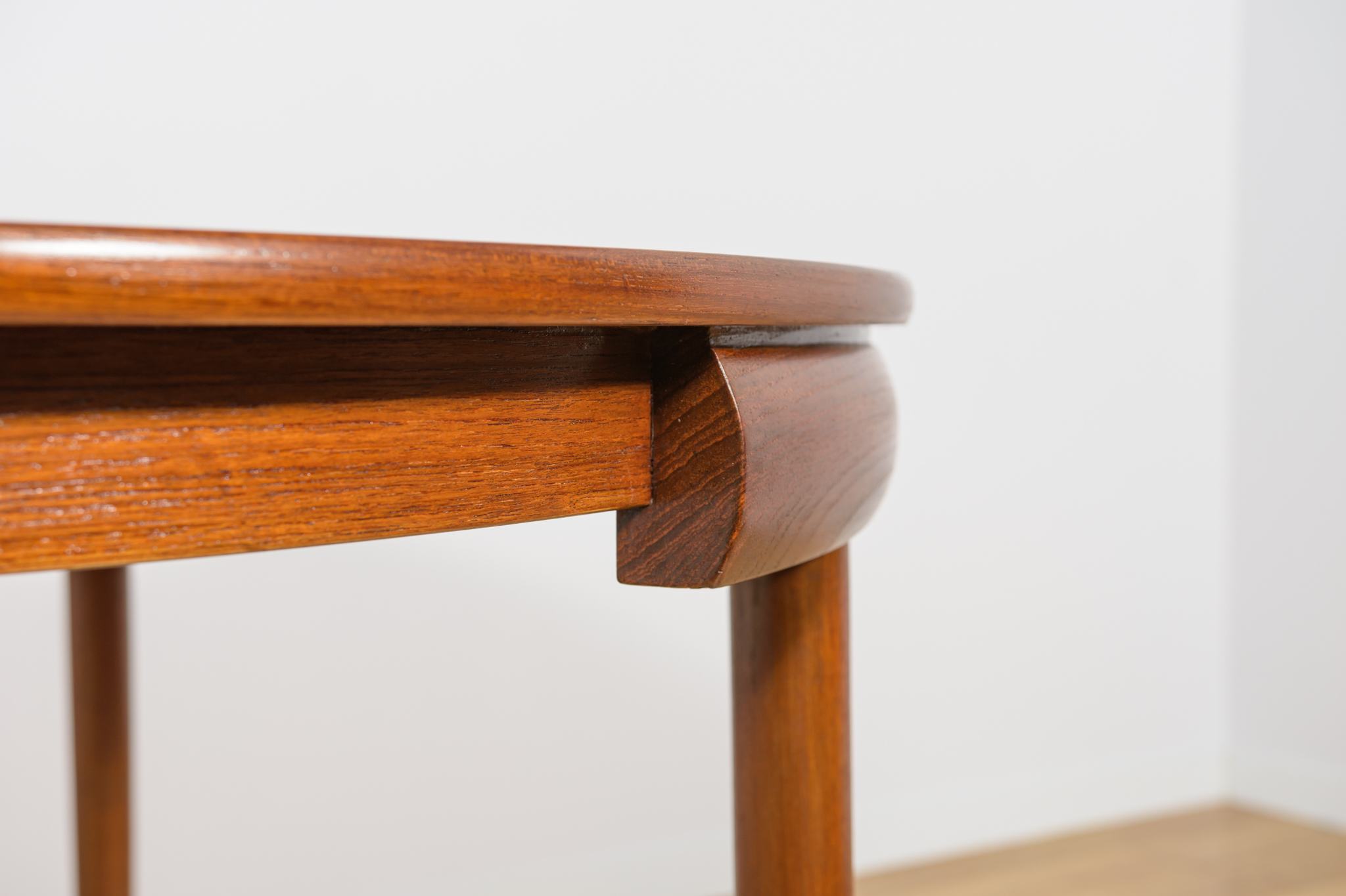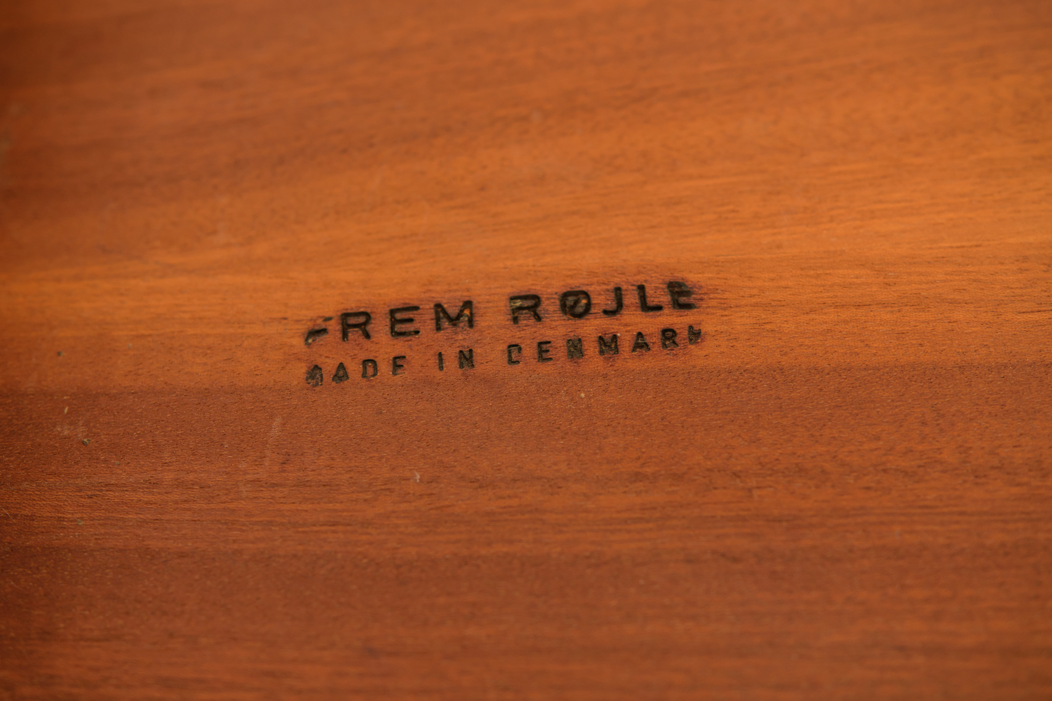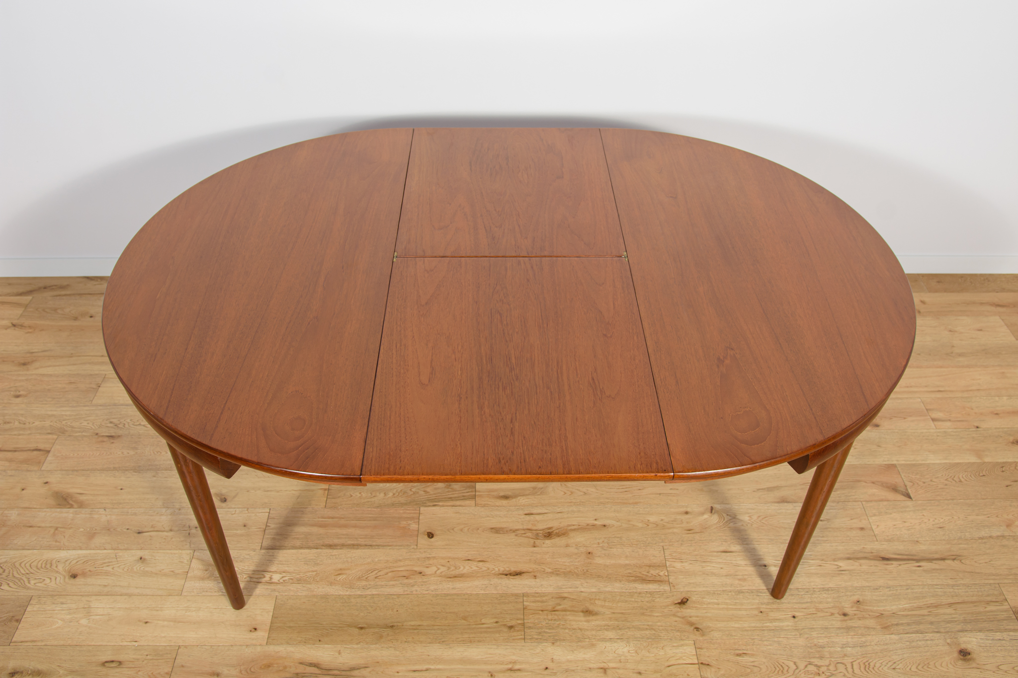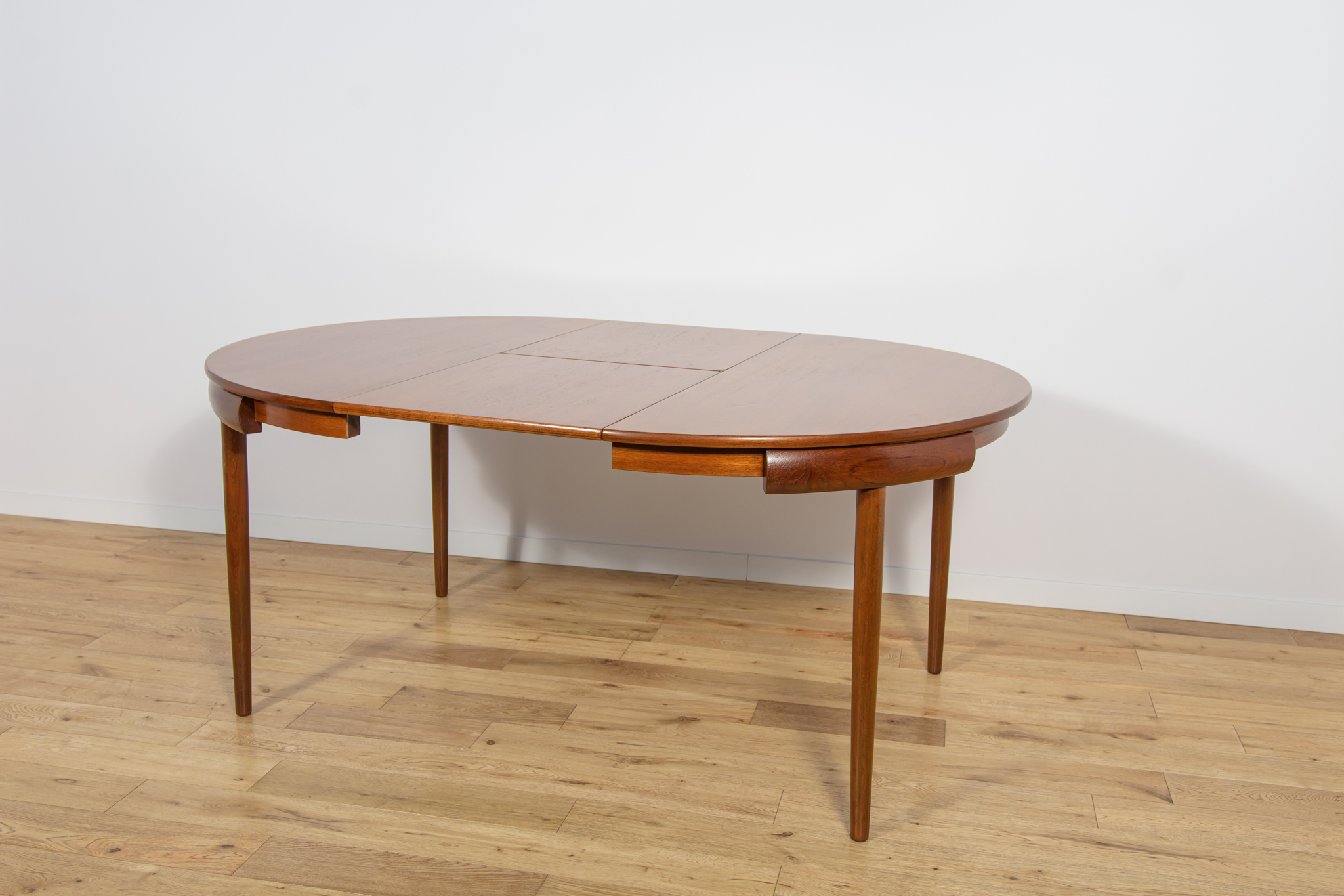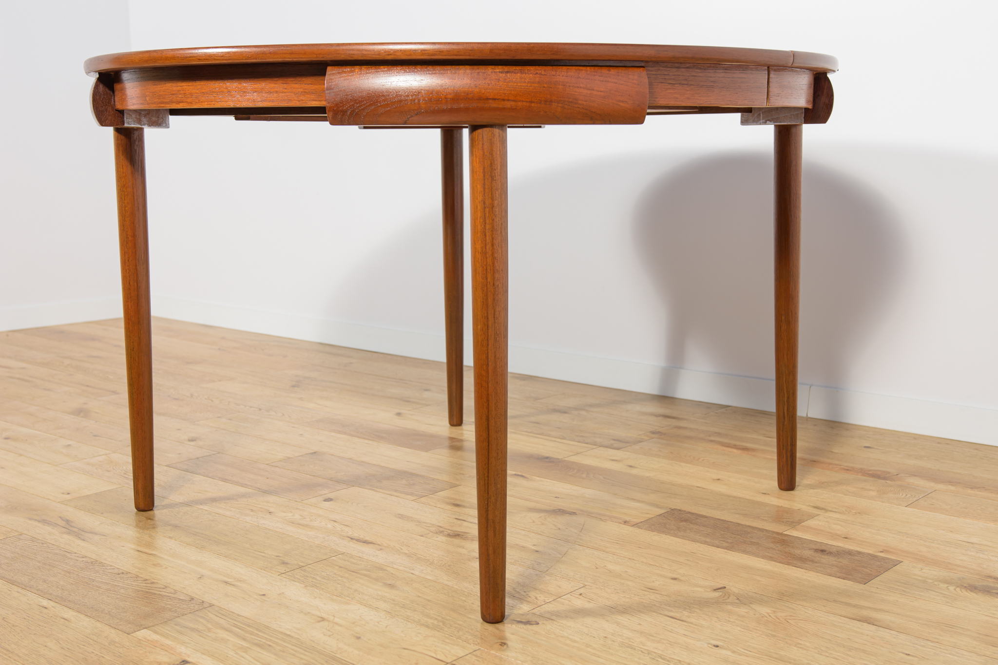 The set was designed by the Danish designer Hans Olsen for the Frem Røjle manufactory in 1962. The set consists of a table and four chairs. Hans Olsen used an innovative solution in his project by placing the backrests of the chairs in the edge of the table. The whole is after a comprehensive carpentry and upholstery renovation. The teak wood has been cleaned of the old coating, finished with very guality danish oil. Upholstery interiors have been replaced, upholstered with new, high-quality, natural leather in brown. The chairs and the table are signed. The table has a mechanism that facilitates unfolding. The table extends to 171 cm.
