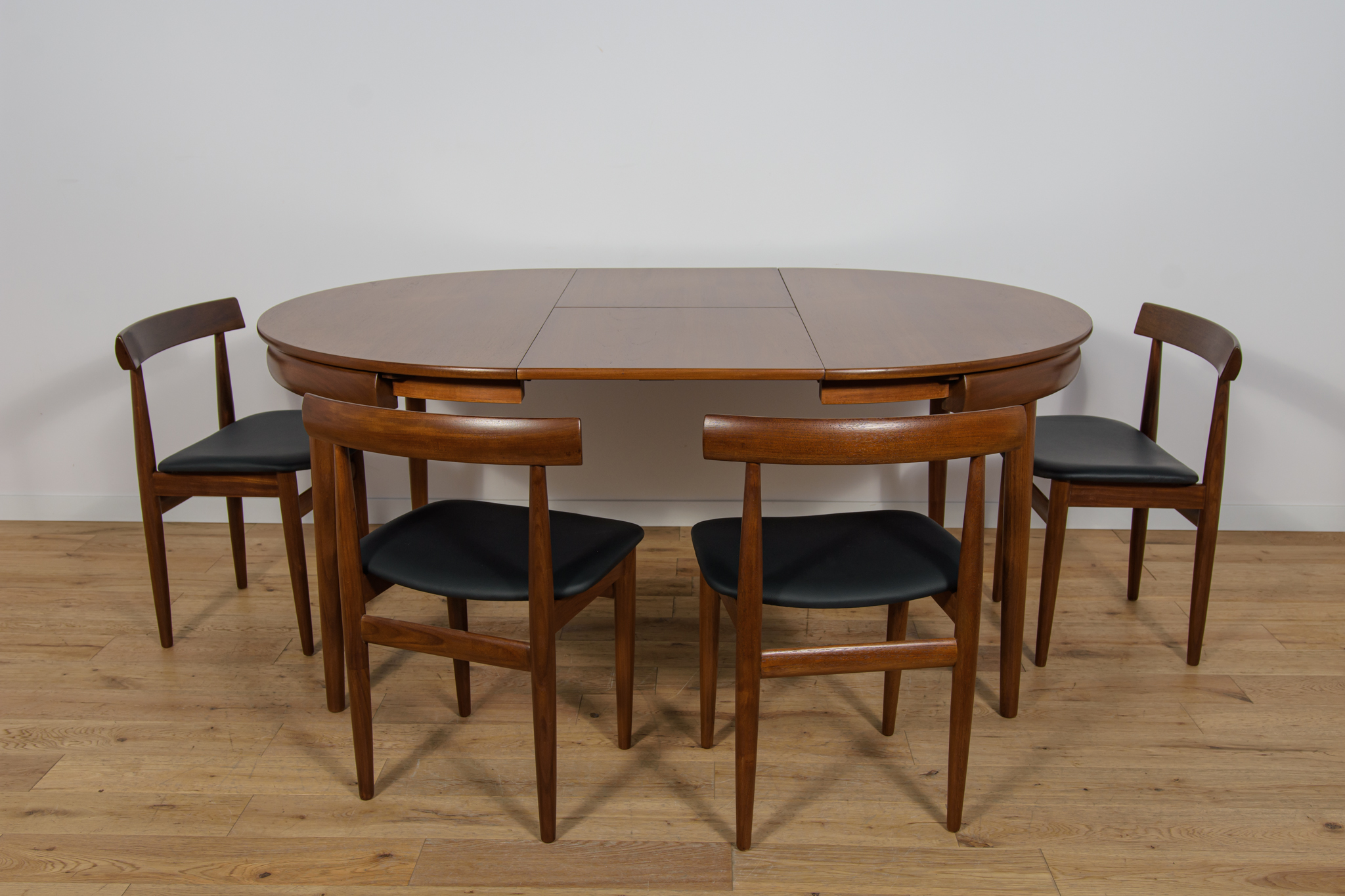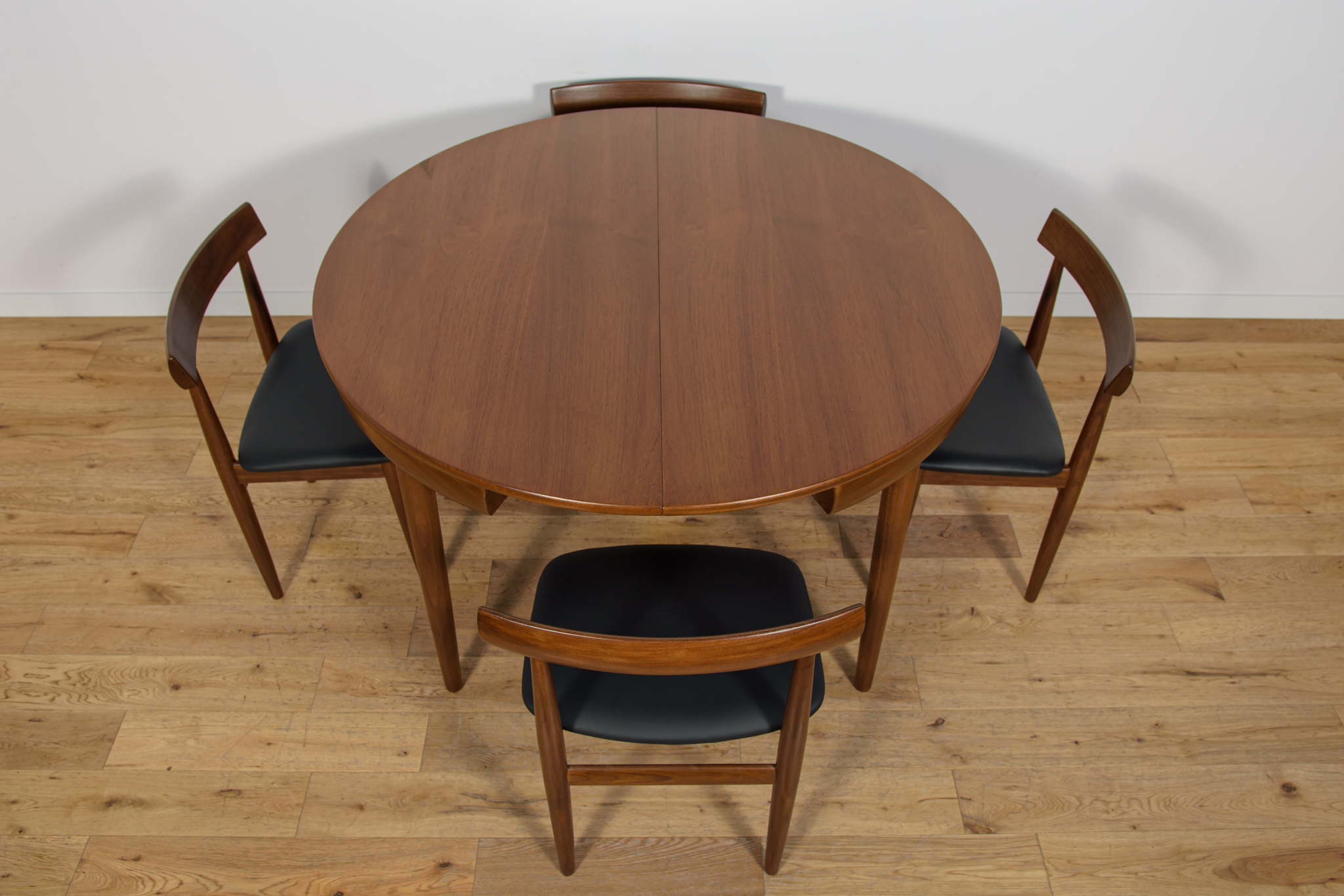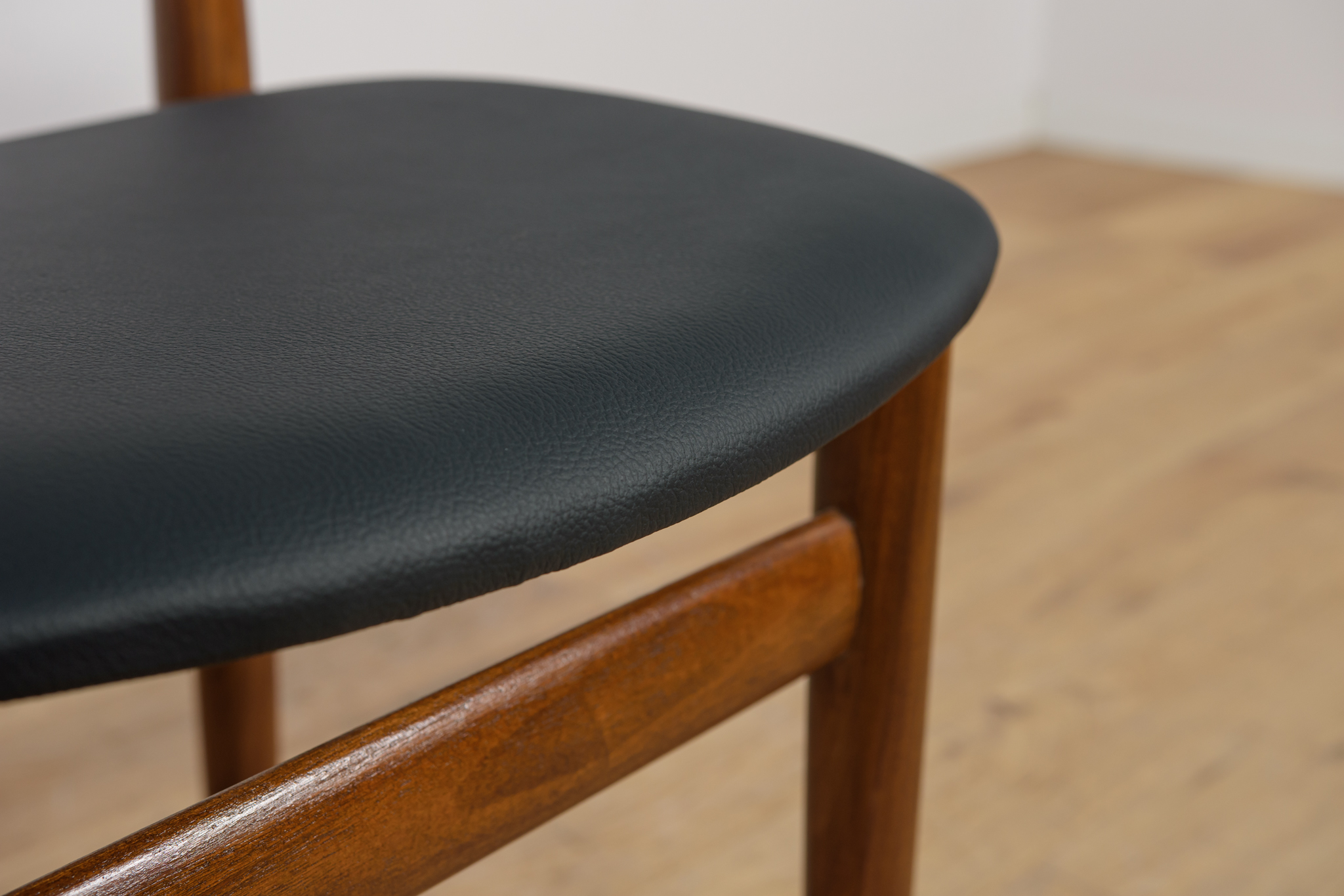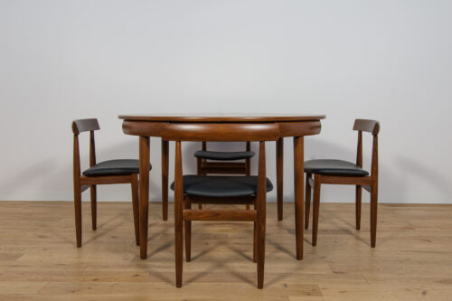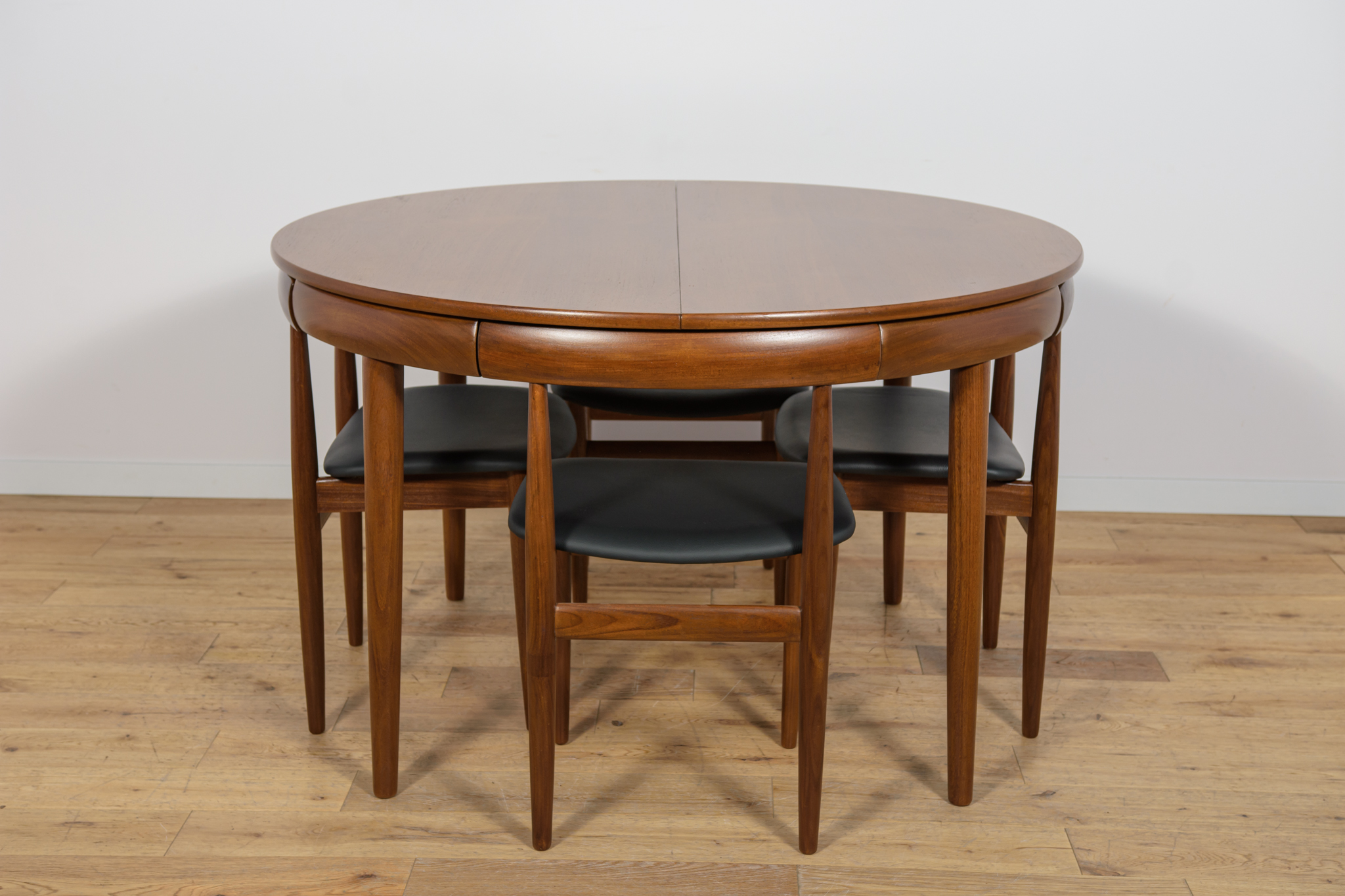 The set was designed by the Danish designer Hans Olsen for the Frem Røjle manufactory in 1962. The set consists of a table and four chairs. Hans Olsen used an innovative solution in his project by placing the backrests of the chairs in the edge of the table. The whole is after a comprehensive carpentry and upholstery renovation. The teak wood has been cleaned of the old coating, painted oak stain, finished with a strong semi-matt varnish. Upholstery interiors have been replaced, upholstered with new, high-quality, natural leather in black. The chairs and the table are signed. The table has a mechanism that facilitates unfolding. The table extends to 172 cm.