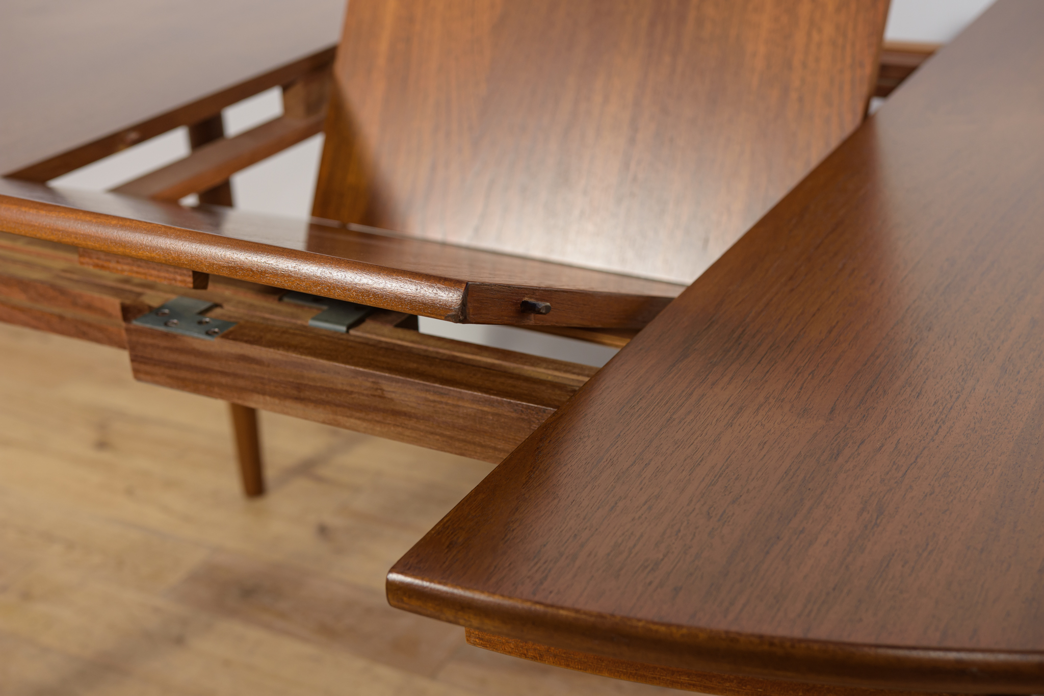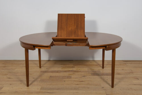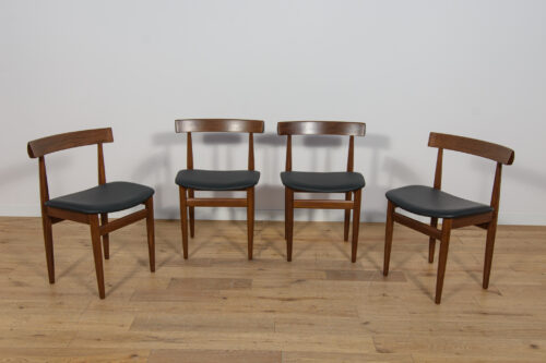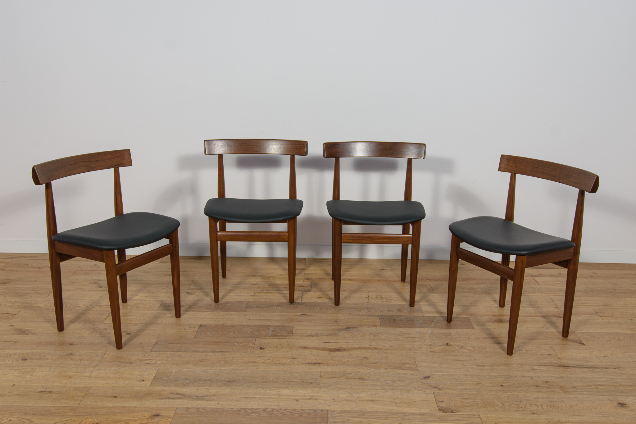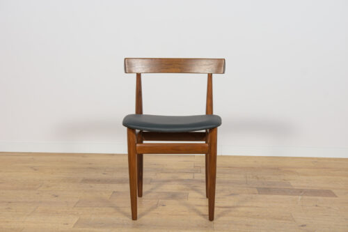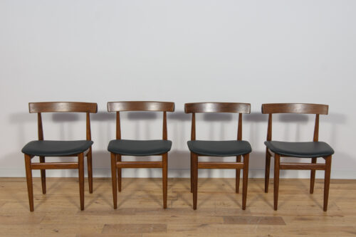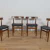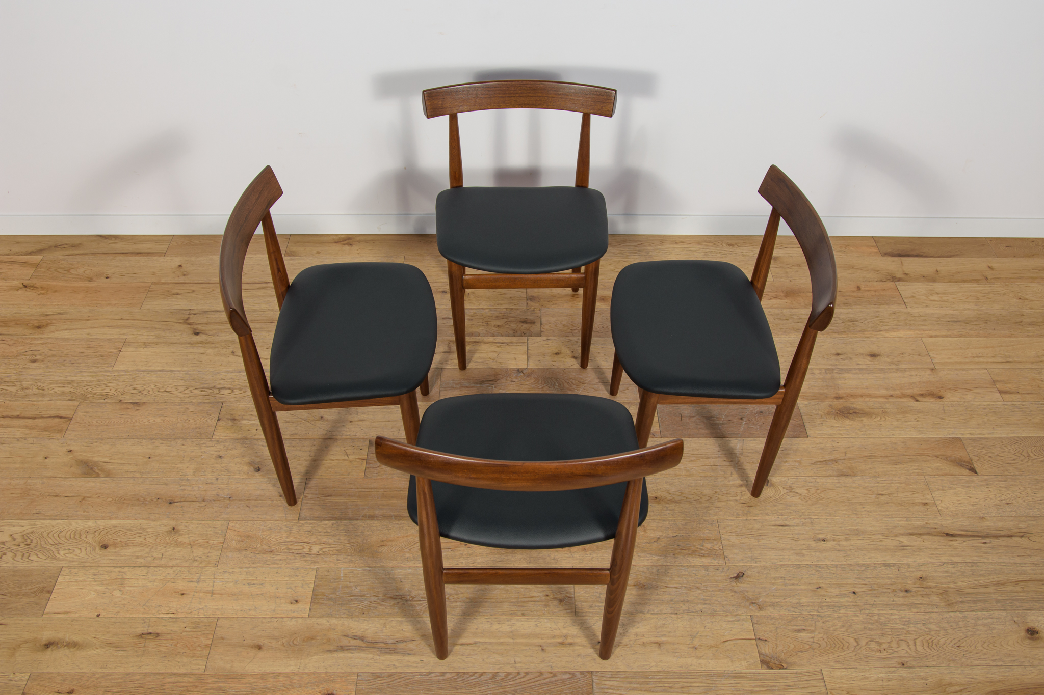 The set was designed by the Danish designer Hans Olsen for the Frem Røjle manufactory in 1962. The set consists of a table and four chairs. Hans Olsen used an innovative solution in his project by placing the backrests of the chairs in the edge of the table. The whole is after a comprehensive carpentry and upholstery renovation. The teak wood has been cleaned of the old coating, painted oak stain, finished with a strong semi-matt varnish. Upholstery interiors have been replaced, upholstered with new, high-quality, natural leather in black. The chairs and the table are signed. The table has a mechanism that facilitates unfolding. The table extends to 172 cm.