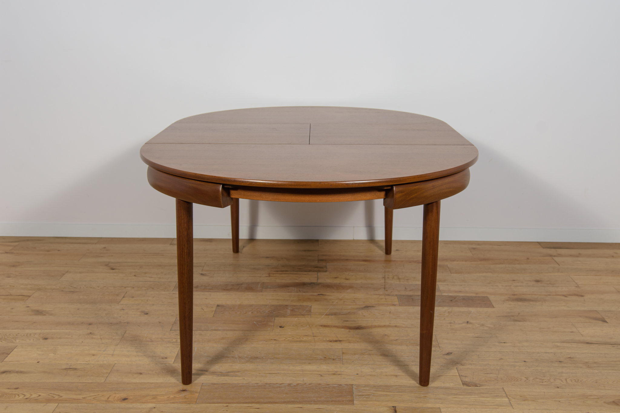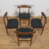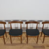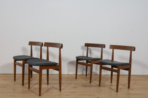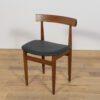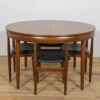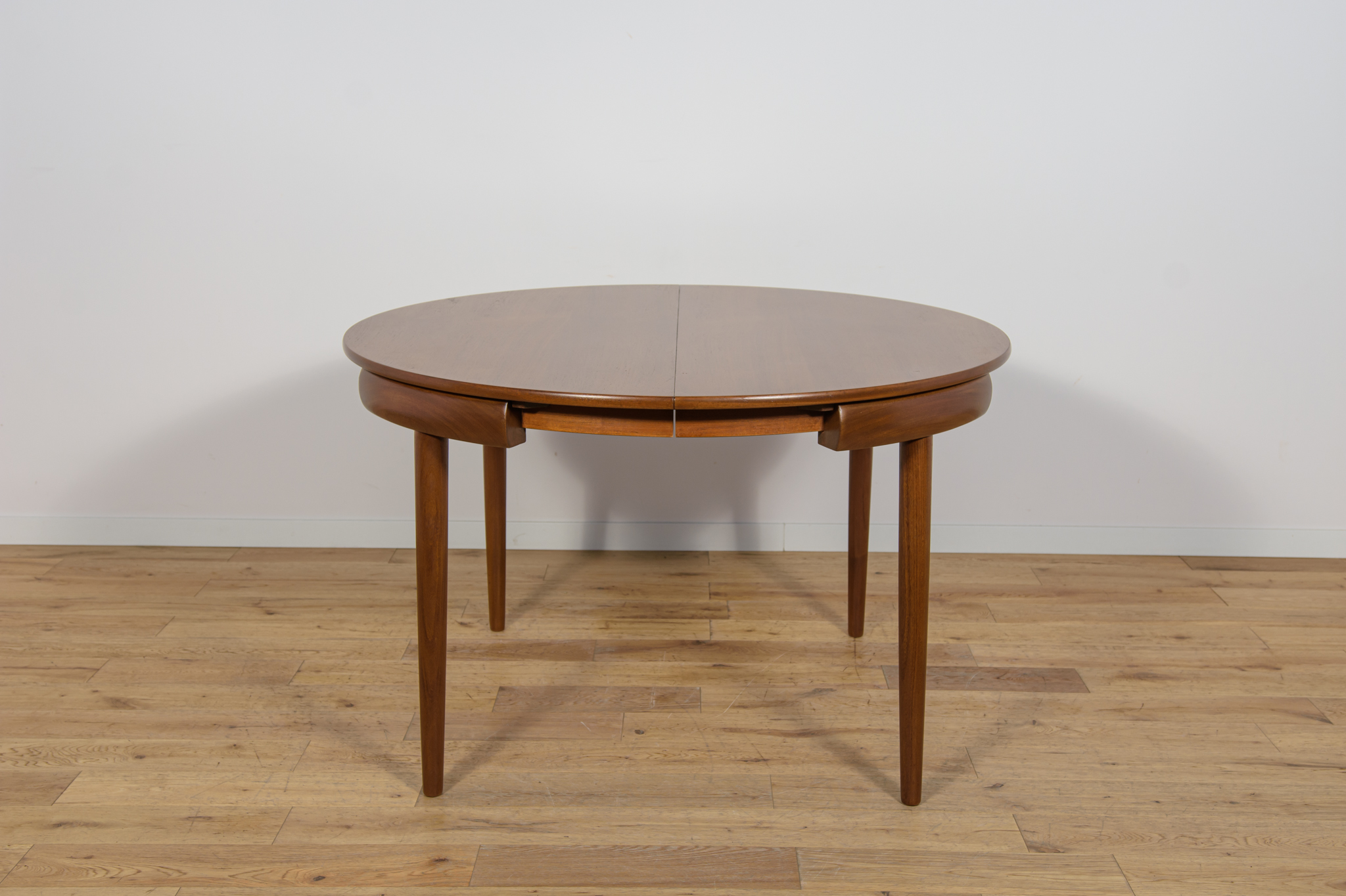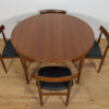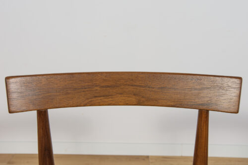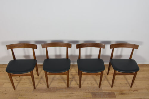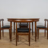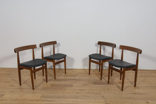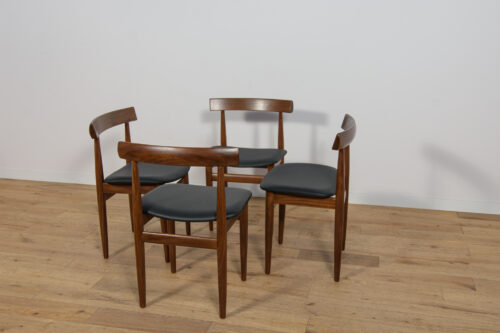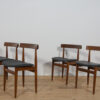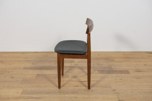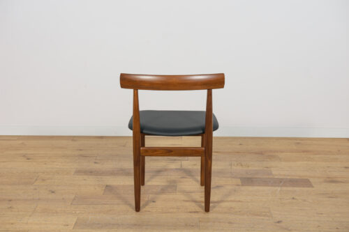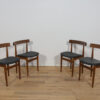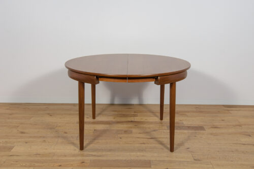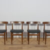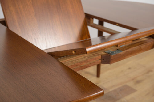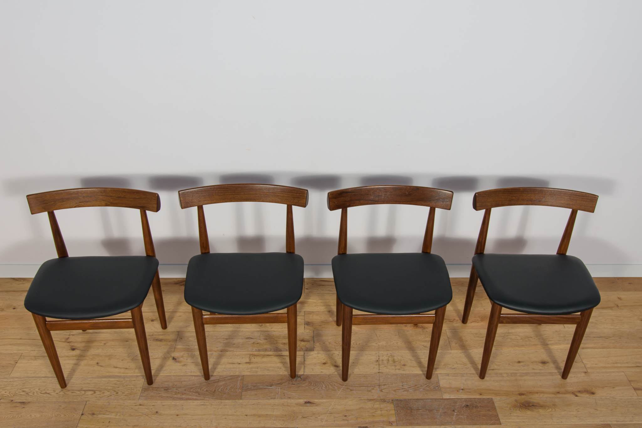 The set was designed by the Danish designer Hans Olsen for the Frem Røjle manufactory in 1962. The set consists of a table and four chairs. Hans Olsen used an innovative solution in his project by placing the backrests of the chairs in the edge of the table. The whole is after a comprehensive carpentry and upholstery renovation. The teak wood has been cleaned of the old coating, painted oak stain, finished with a strong semi-matt varnish. Upholstery interiors have been replaced, upholstered with new, high-quality, natural leather in black. The chairs and the table are signed. The table has a mechanism that facilitates unfolding. The table extends to 172 cm.