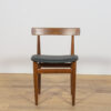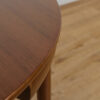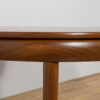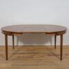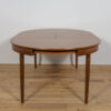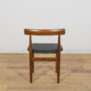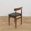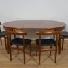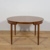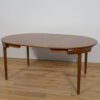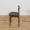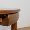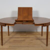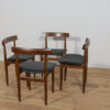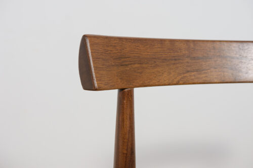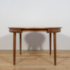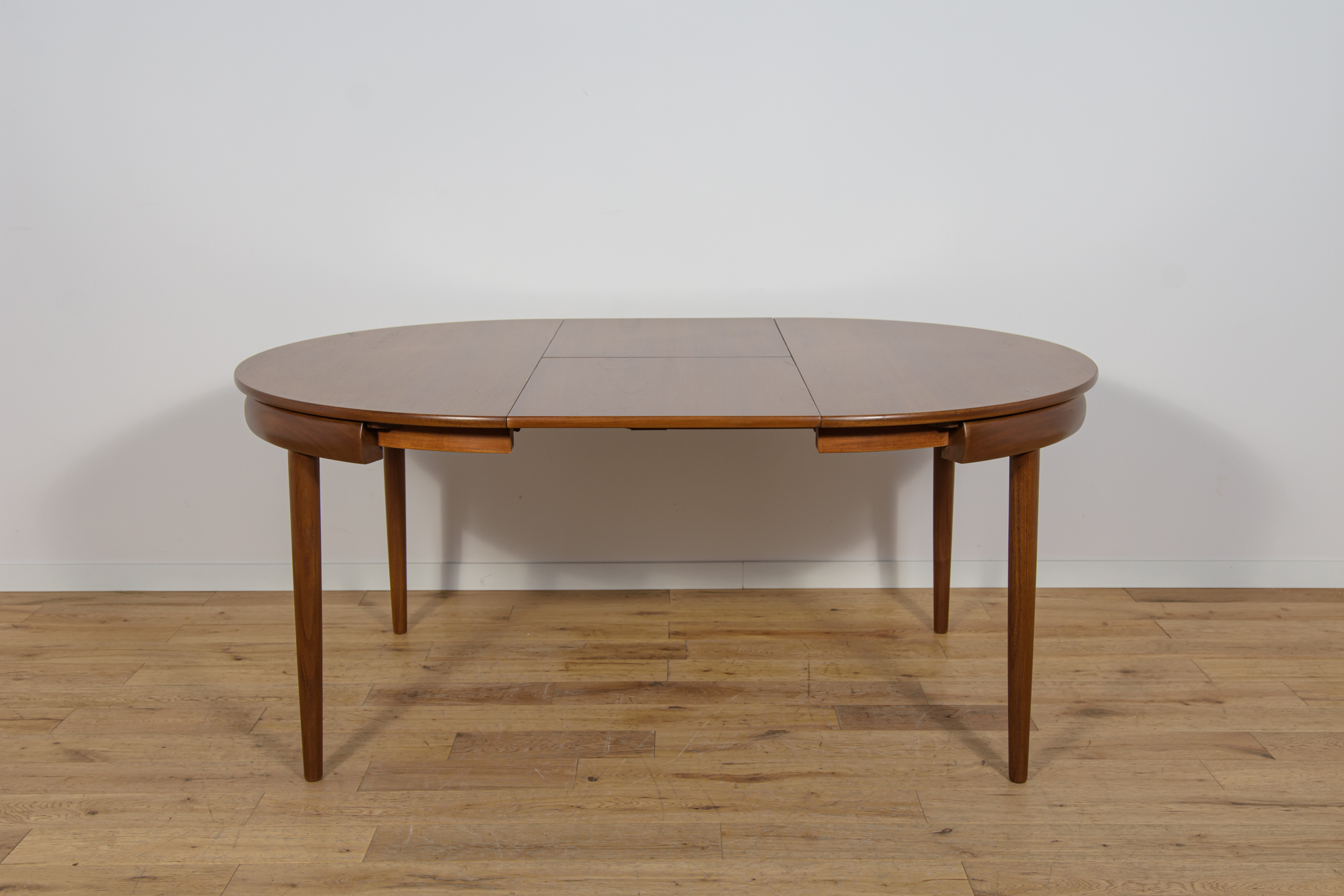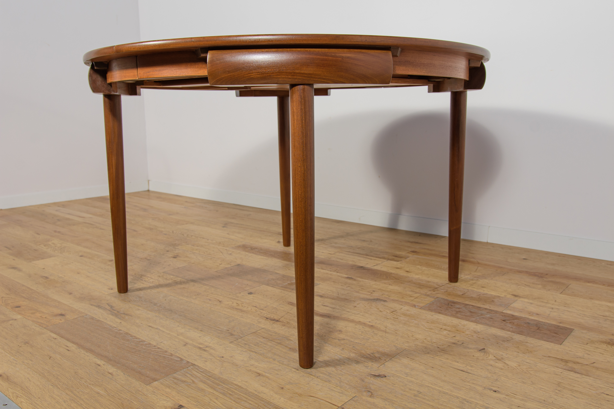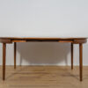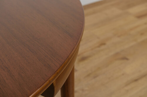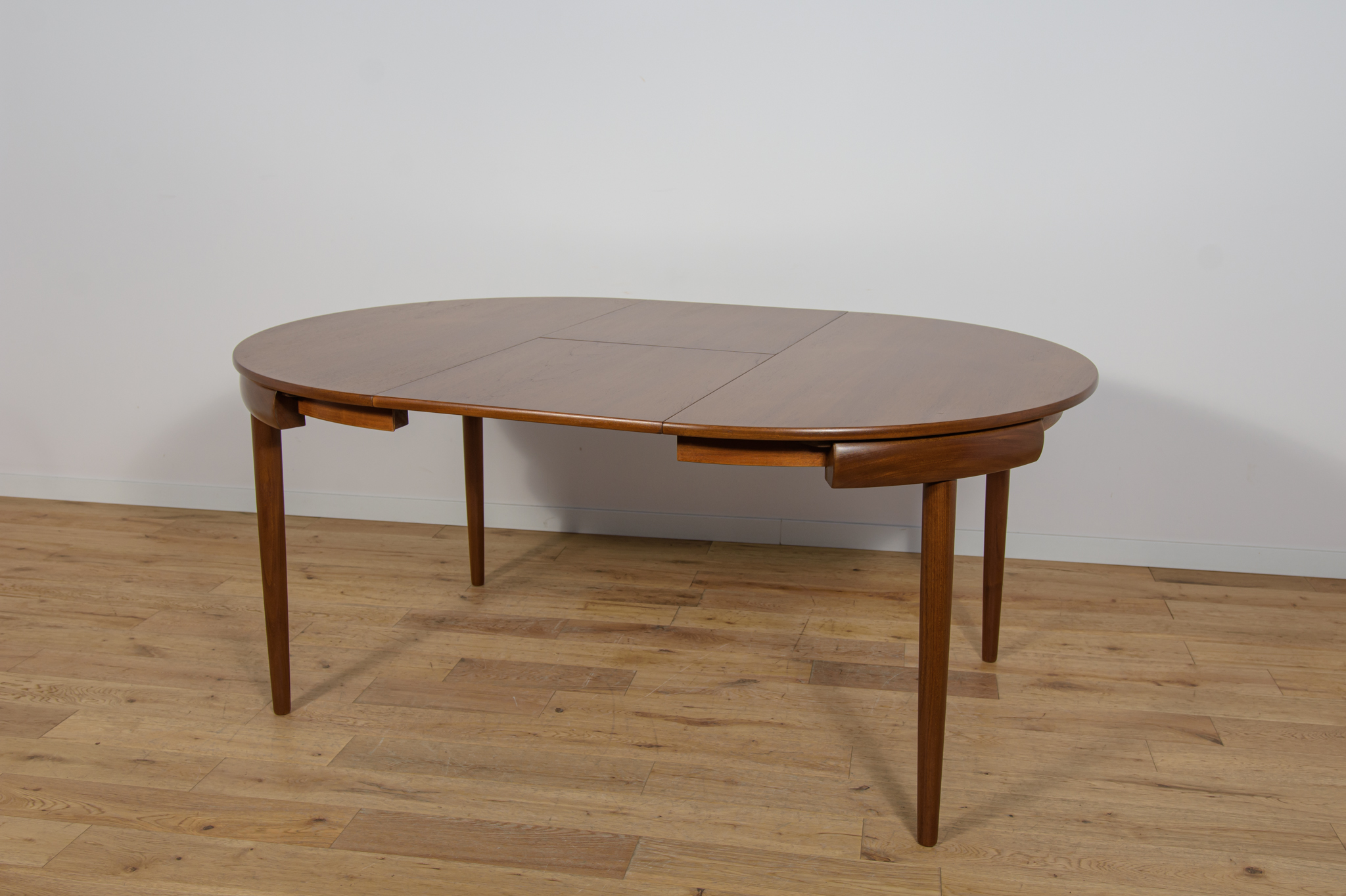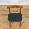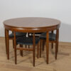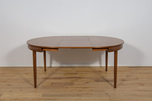 The set was designed by the Danish designer Hans Olsen for the Frem Røjle manufactory in 1962. The set consists of a table and four chairs. Hans Olsen used an innovative solution in his project by placing the backrests of the chairs in the edge of the table. The whole is after a comprehensive carpentry and upholstery renovation. The teak wood has been cleaned of the old coating, painted oak stain, finished with a strong semi-matt varnish. Upholstery interiors have been replaced, upholstered with new, high-quality, natural leather in black. The chairs and the table are signed. The table has a mechanism that facilitates unfolding. The table extends to 172 cm.