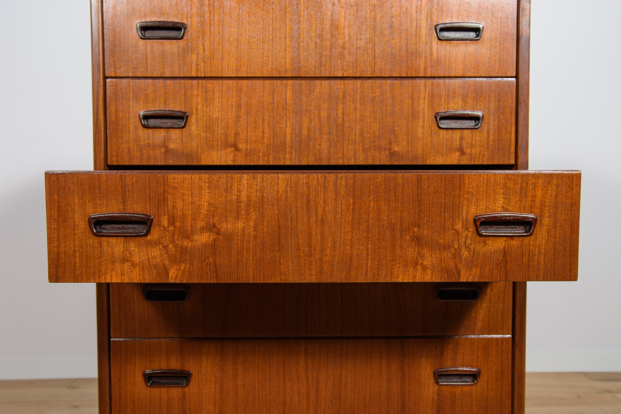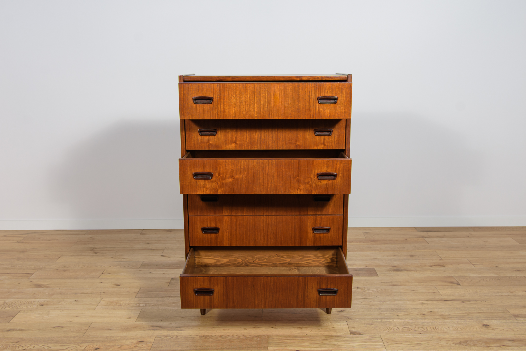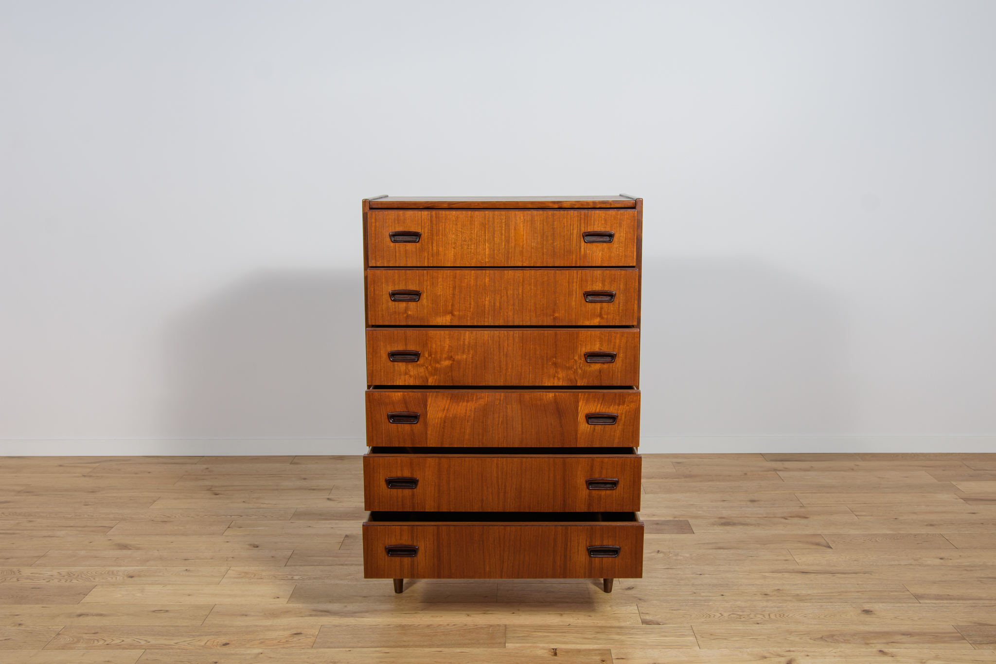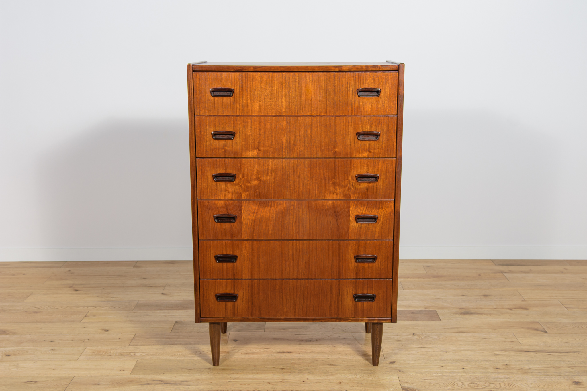 Teak dresser with six drawers made in the 1960s in Denmark. The dresser has contoured handles. The dresser has undergone a comprehensive carpentry renovation. The dresser has been cleaned of the old coating, finished with very quality Danish Oil.