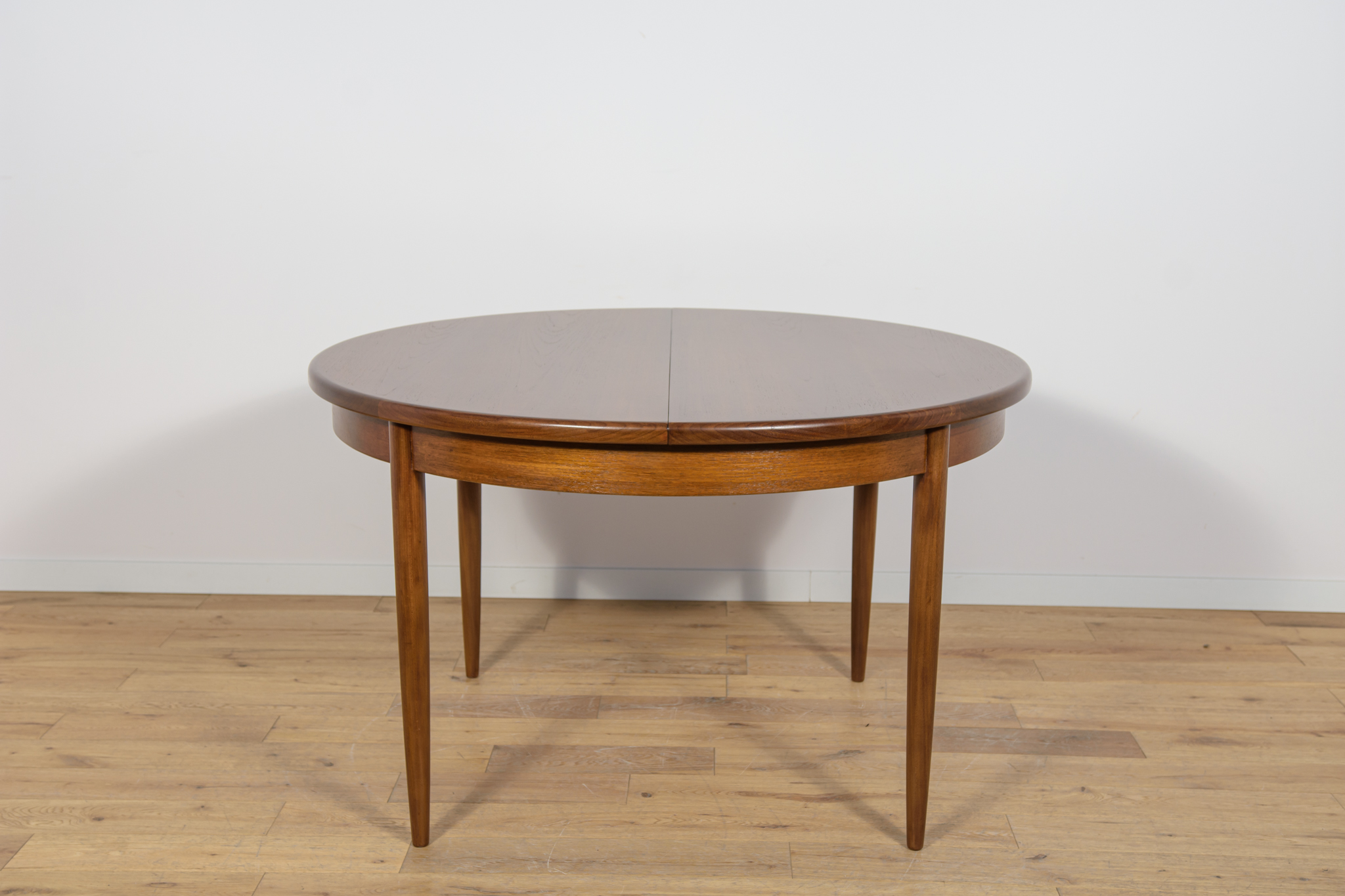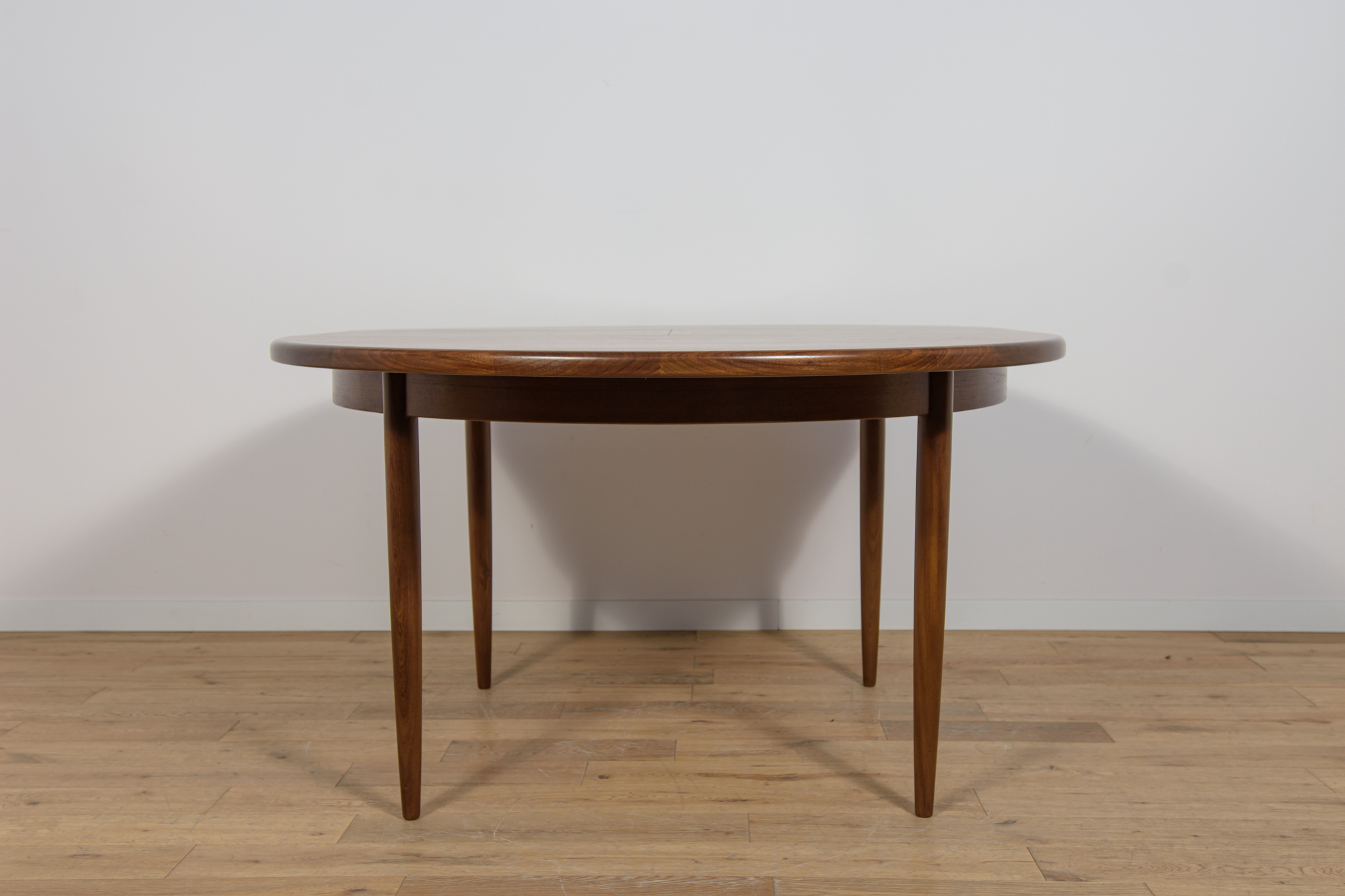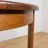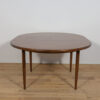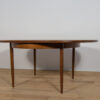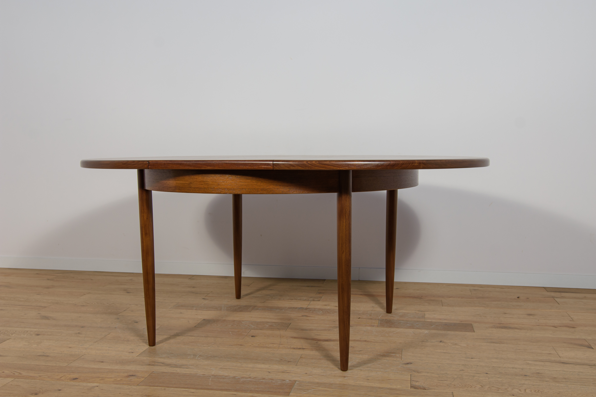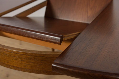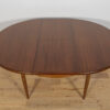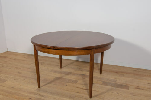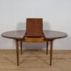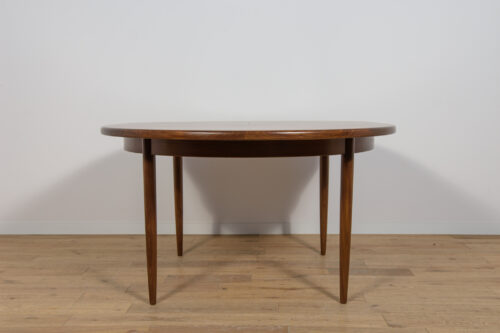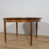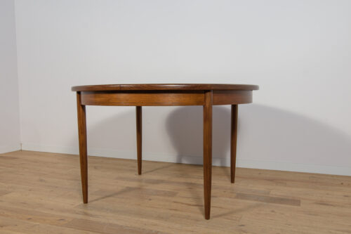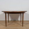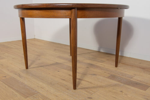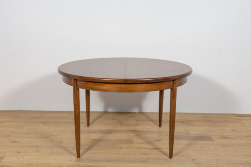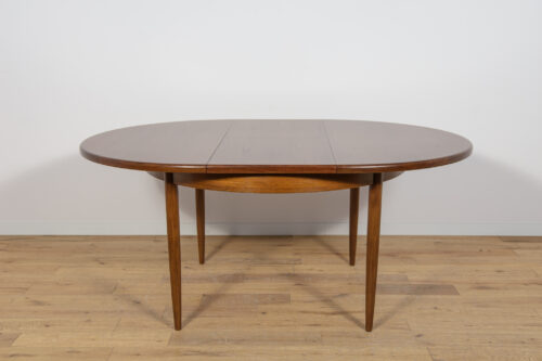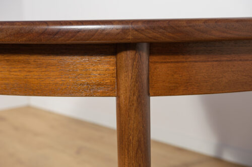 This round extendable dining table was produced by G-Plan in the 1960s. The table has profiled reinforced edges of the top. Teak elements cleaned old coating and painted in a oak stain and finished with strong semi matt lacquer. The table has a mechanism that facilitates unfolding. The table measures 168 cm long when fully extended.
