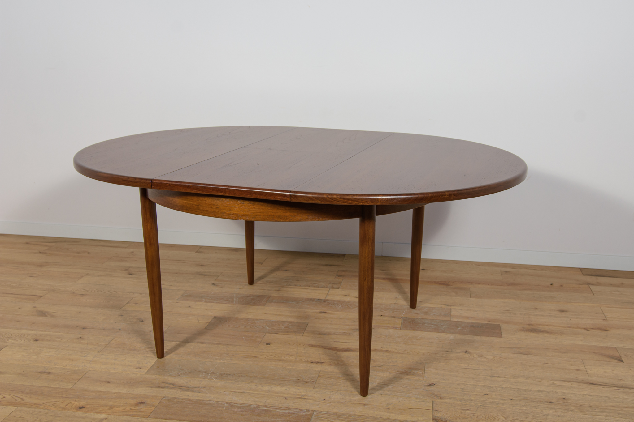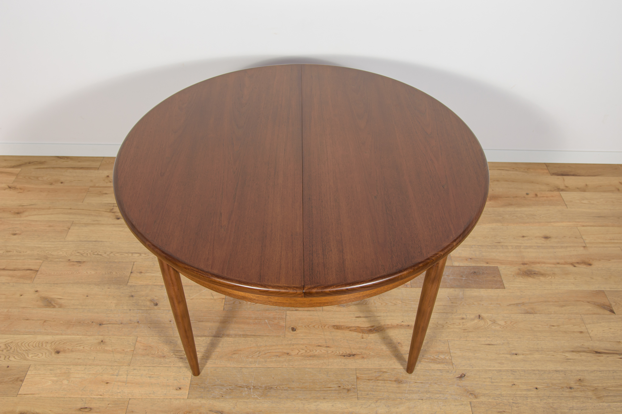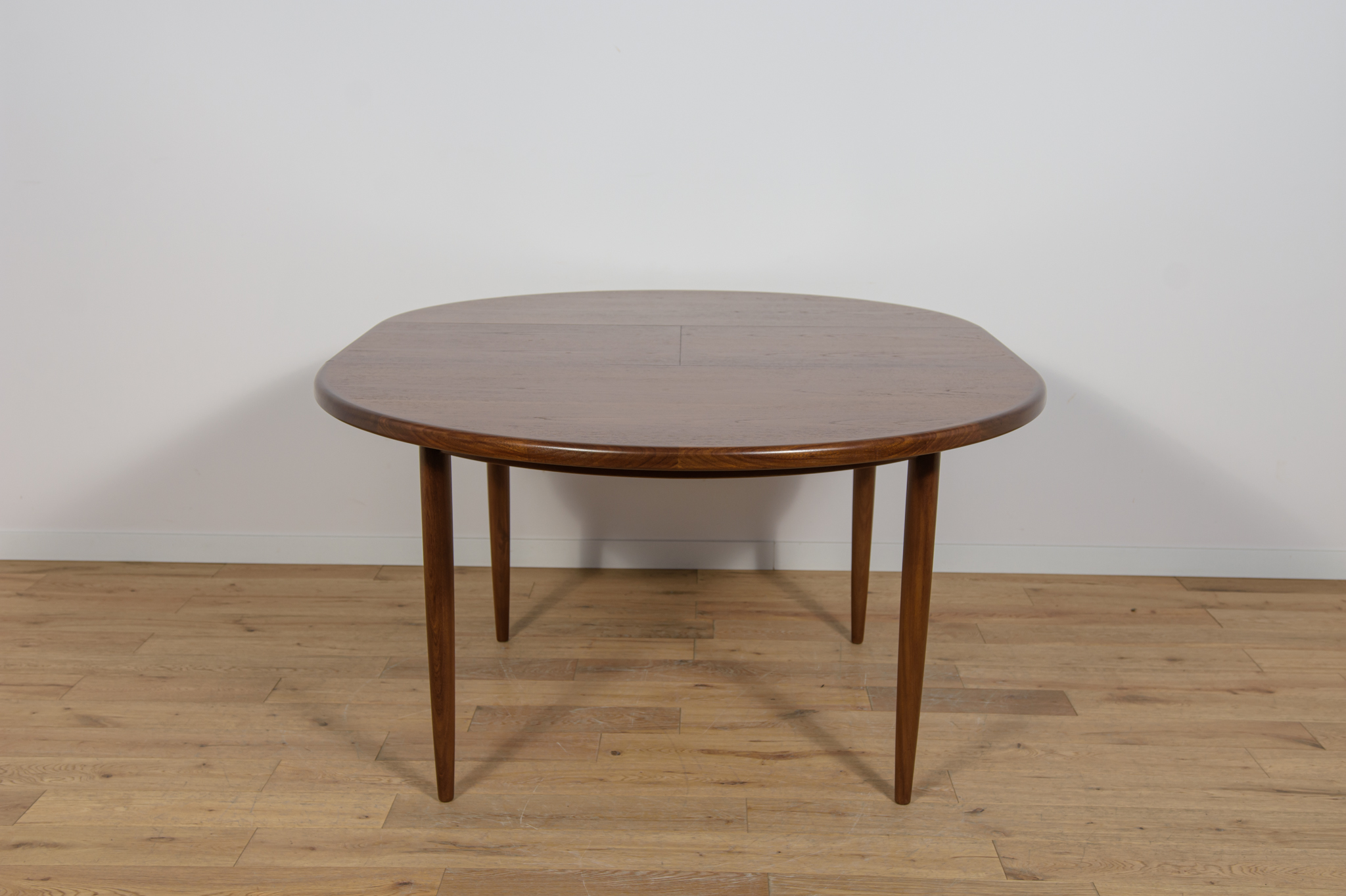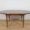 This round extendable dining table was produced by G-Plan in the 1960s. The table has profiled reinforced edges of the top. Teak elements cleaned old coating and painted in a oak stain and finished with strong semi matt lacquer. The table has a mechanism that facilitates unfolding. The table measures 168 cm long when fully extended.