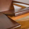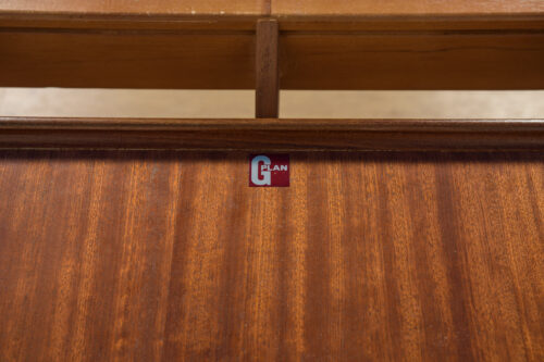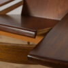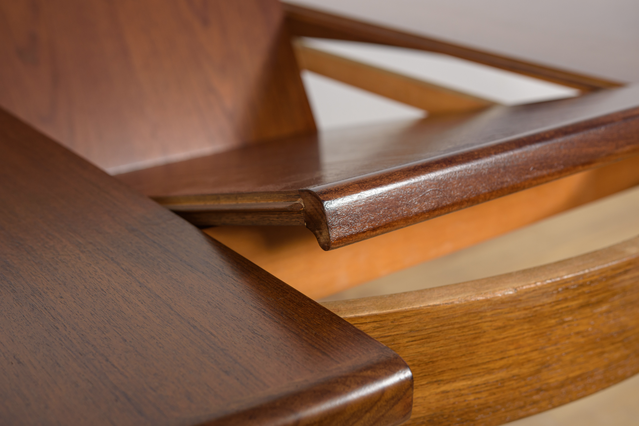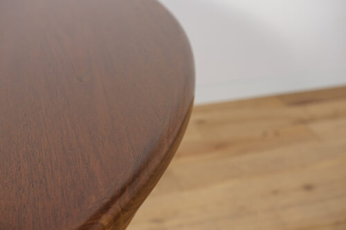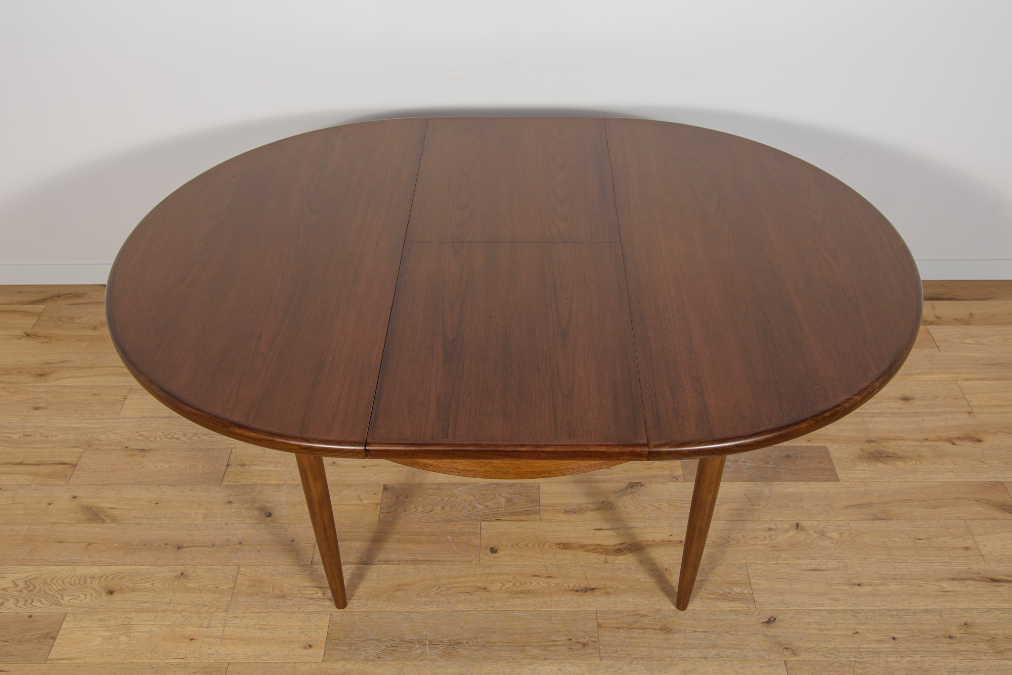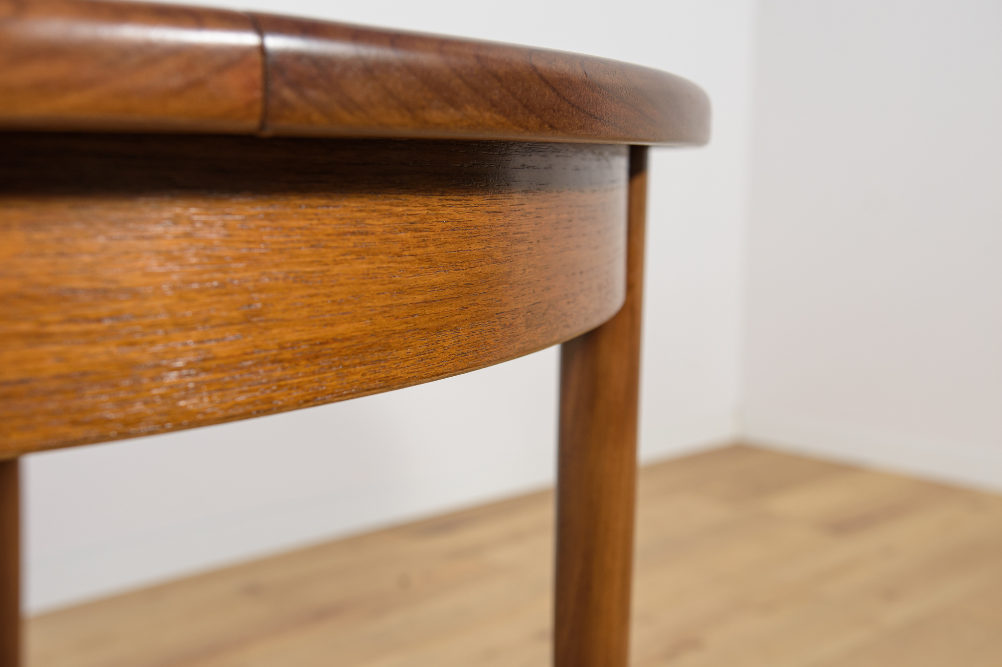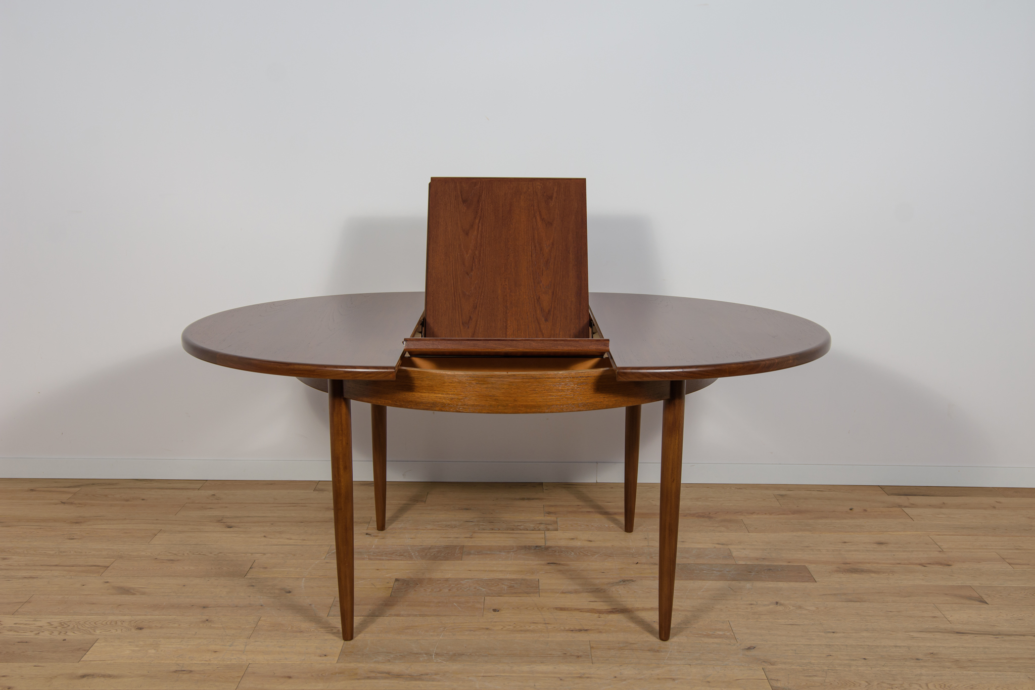 This round extendable dining table was produced by G-Plan in the 1960s. The table has profiled reinforced edges of the top. Teak elements cleaned old coating and painted in a oak stain and finished with strong semi matt lacquer. The table has a mechanism that facilitates unfolding. The table measures 168 cm long when fully extended.