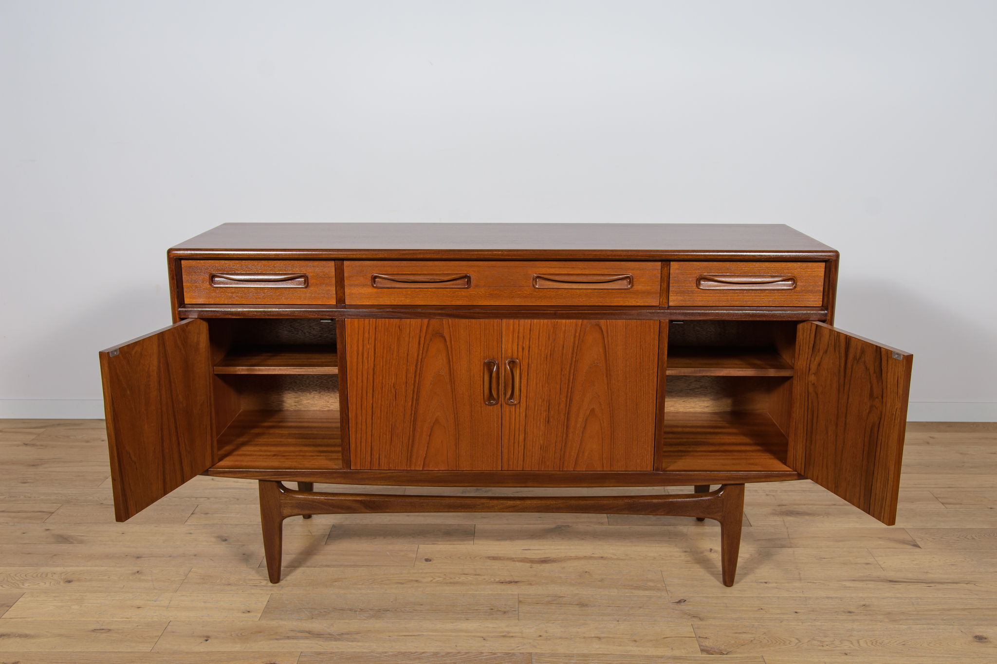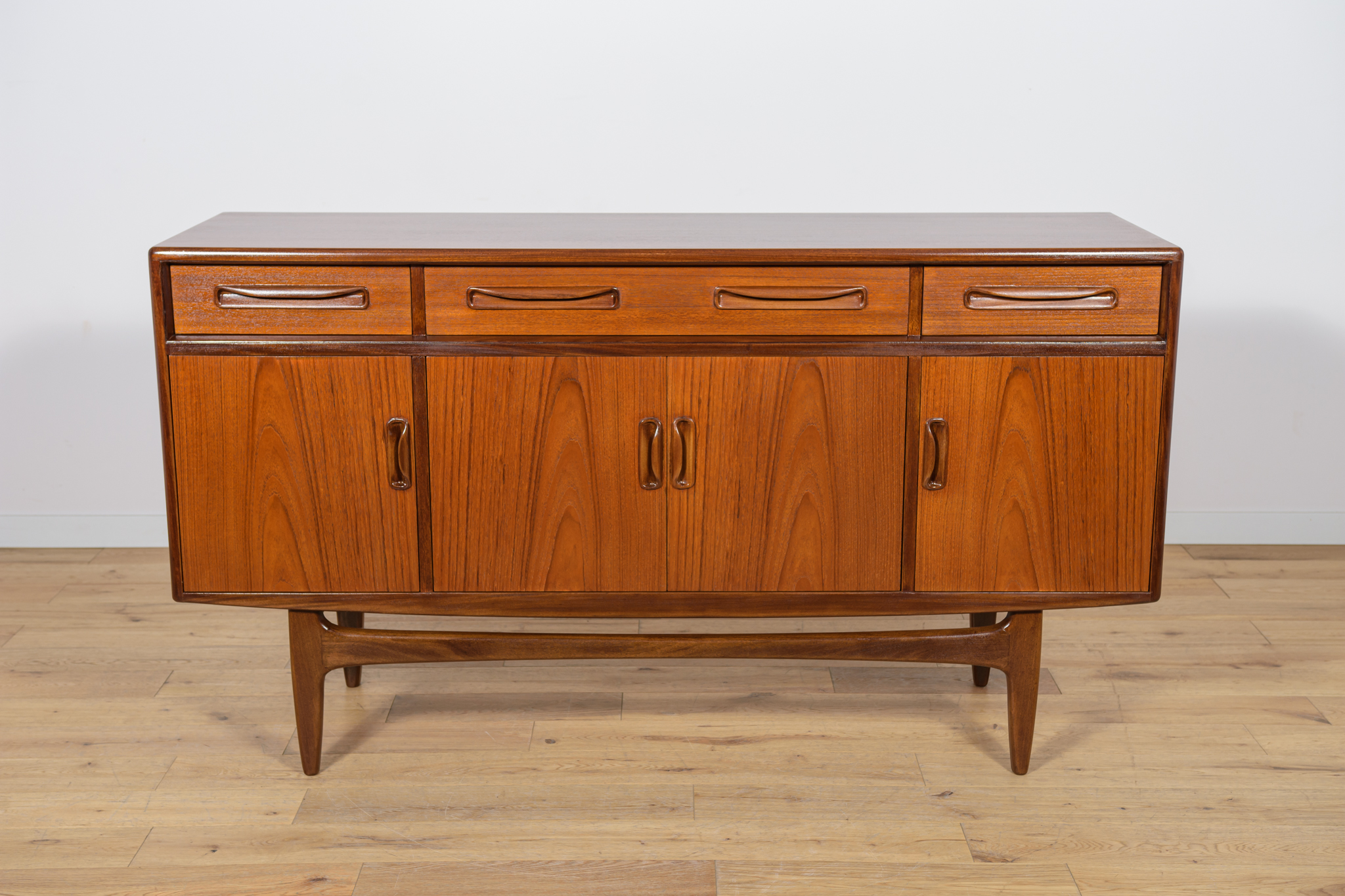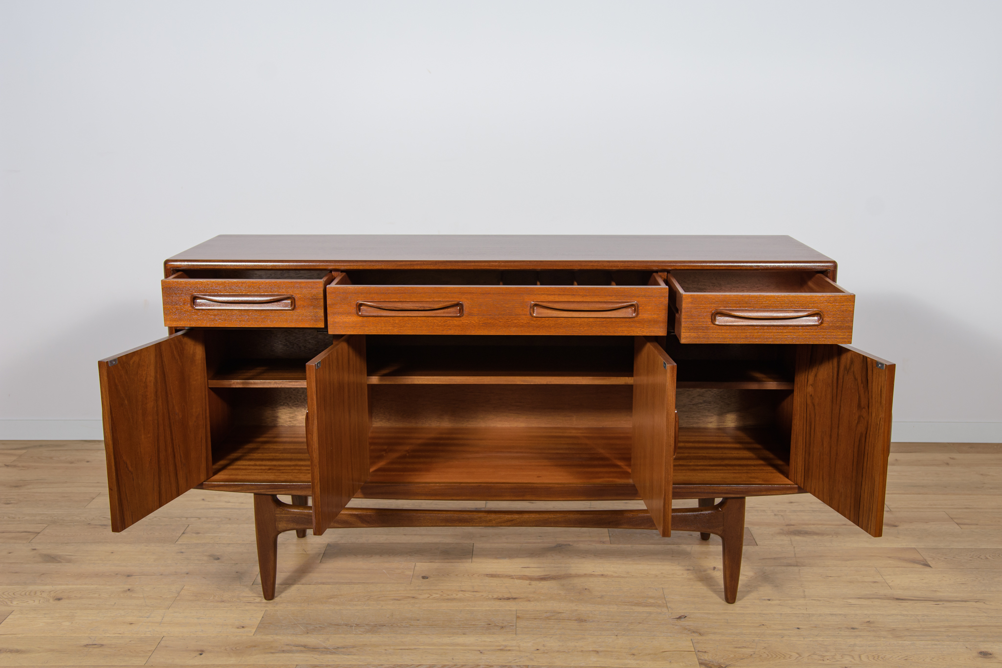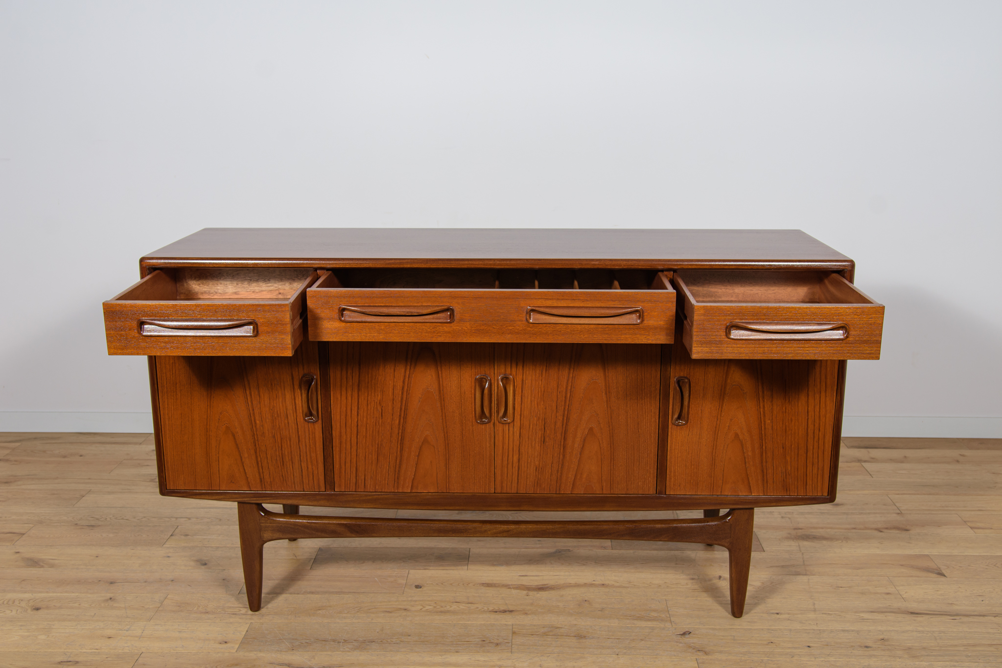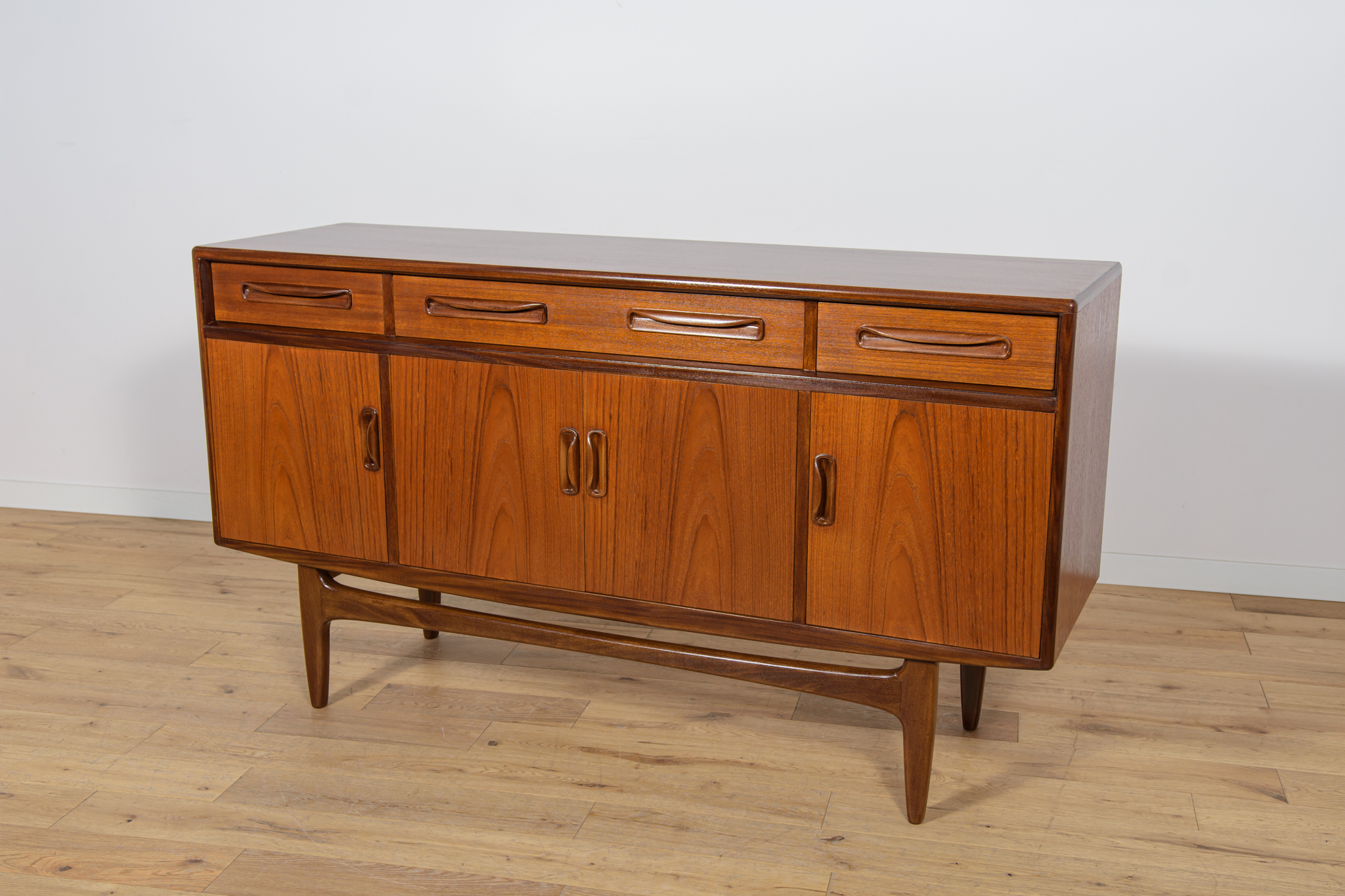 This elegant Scandinavian influenced credenza designed by Victor Wilkins became an instant Classic for G-Plan, it is an exceptionally well-balanced design with dark Afromosia sculpted handles and trim contrasting against the teak veneer. It sits upon an elegantly curved stretcher and tapered legs. Completely restored. Sideboard cleaned from the old surface and painted oak stain and finished with quality Danish oil.