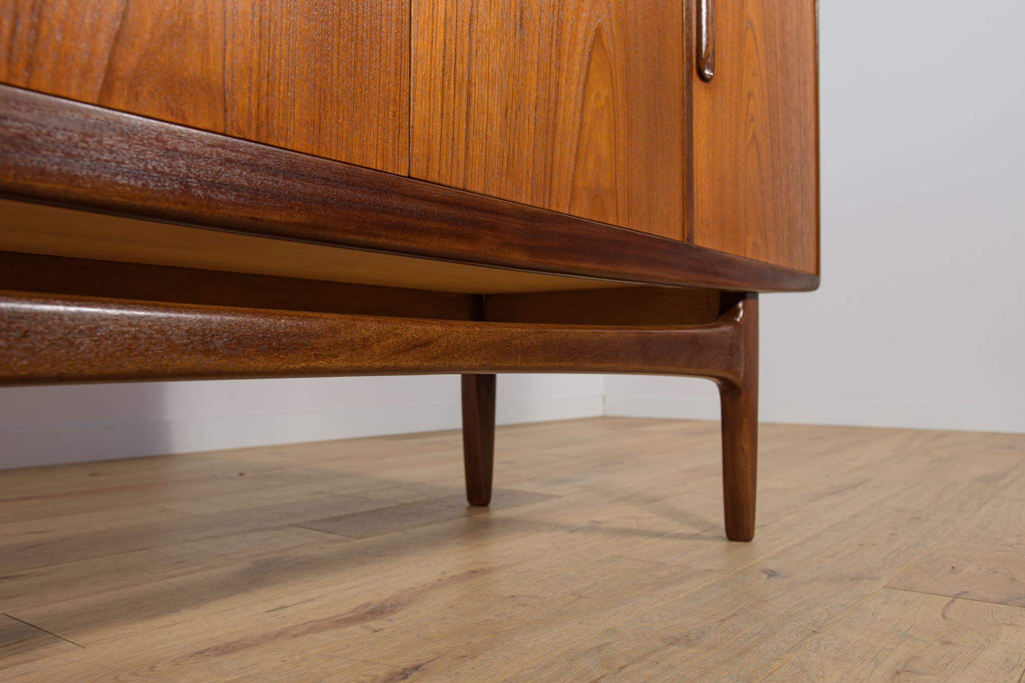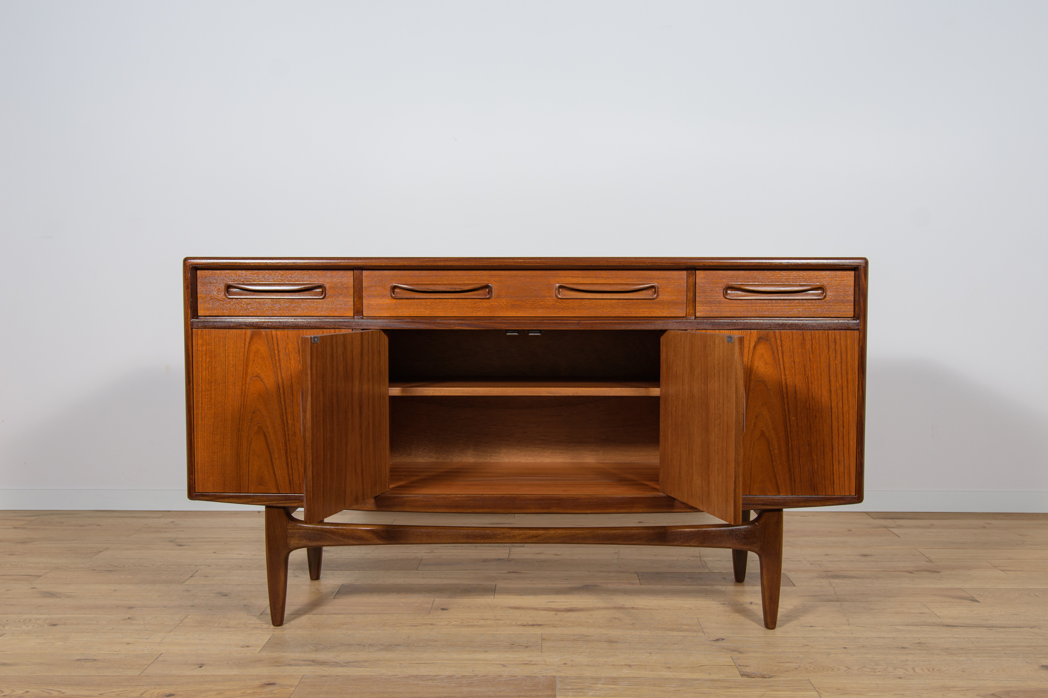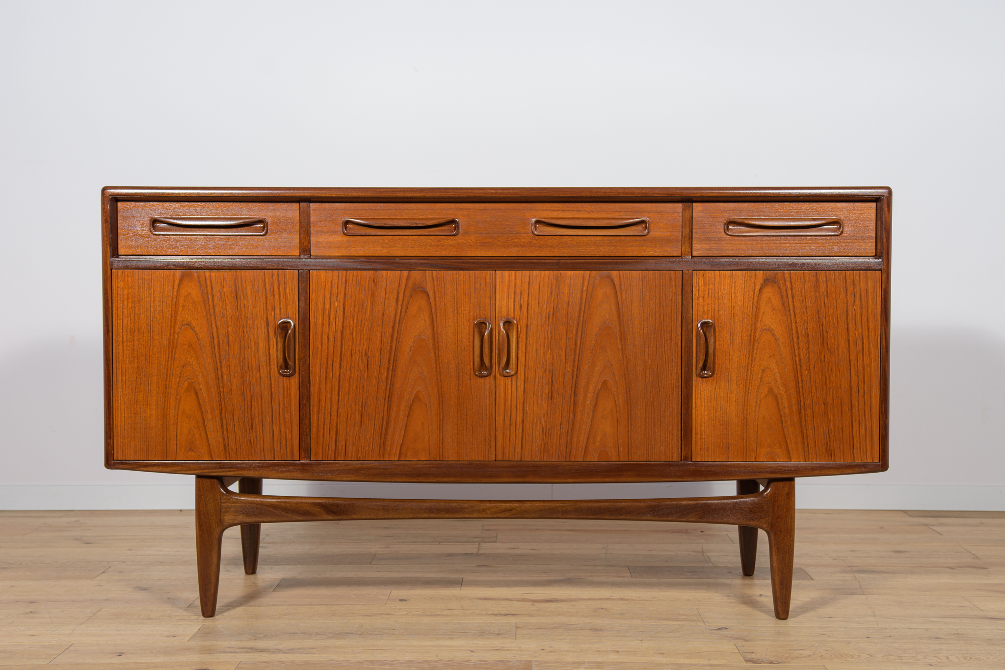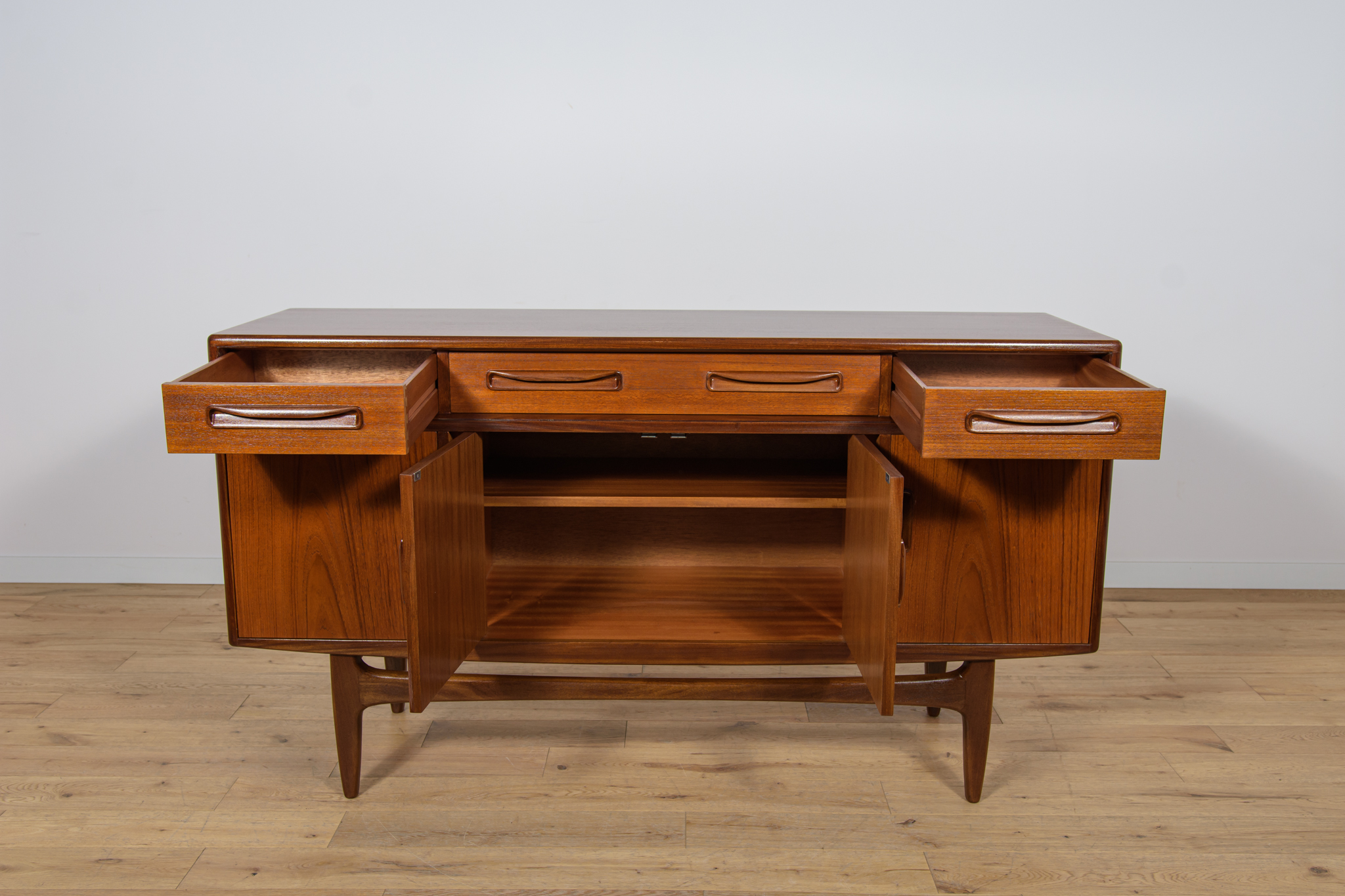 This elegant Scandinavian influenced credenza designed by Victor Wilkins became an instant Classic for G-Plan, it is an exceptionally well-balanced design with dark Afromosia sculpted handles and trim contrasting against the teak veneer. It sits upon an elegantly curved stretcher and tapered legs. Completely restored. Sideboard cleaned from the old surface and painted oak stain and finished with quality Danish oil.